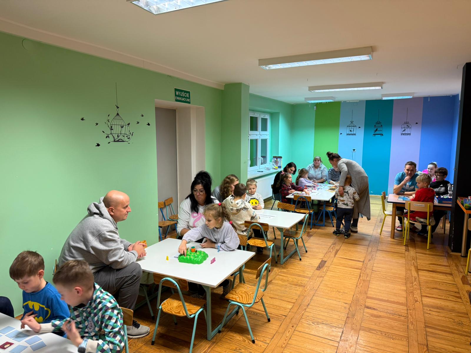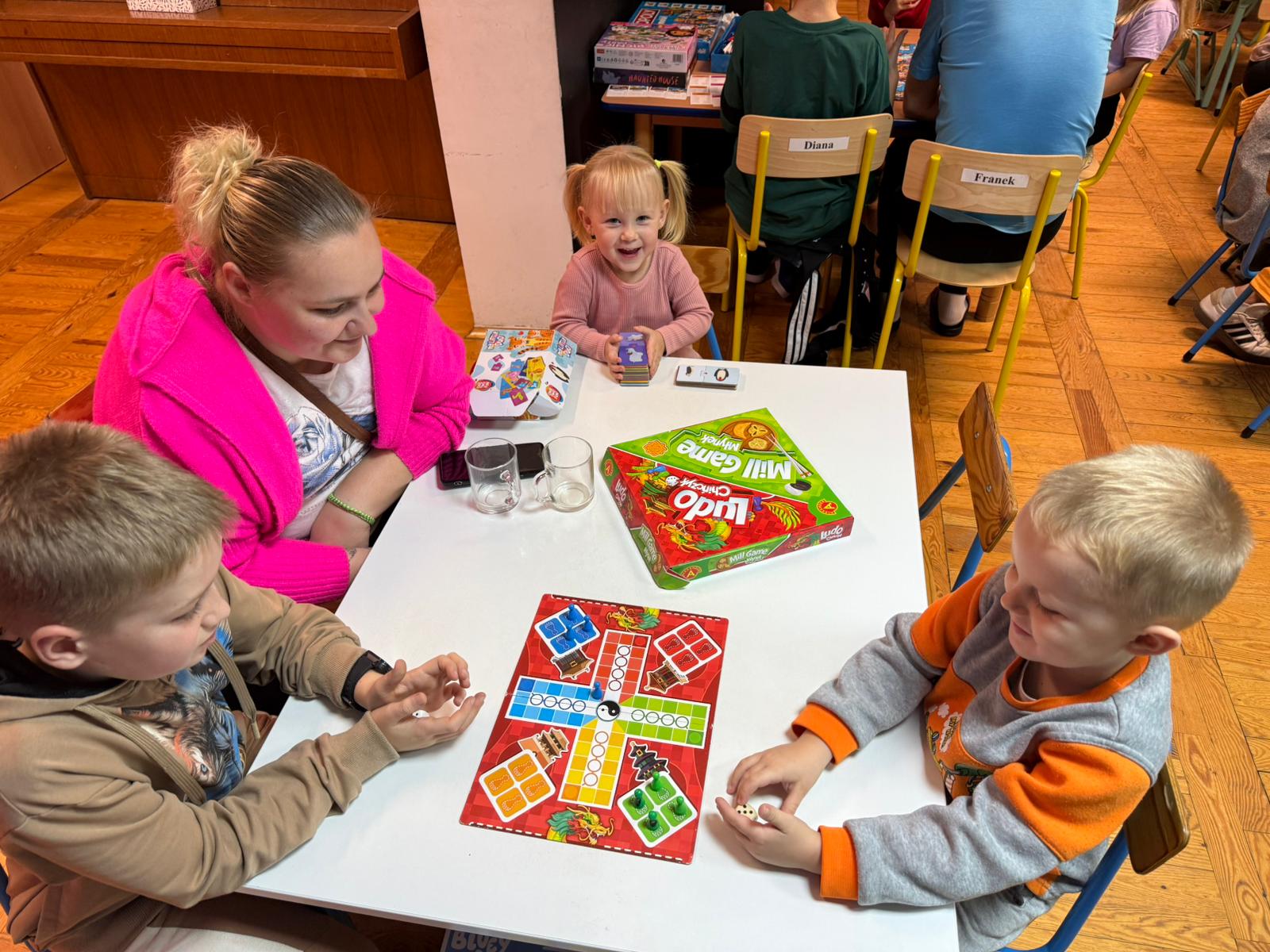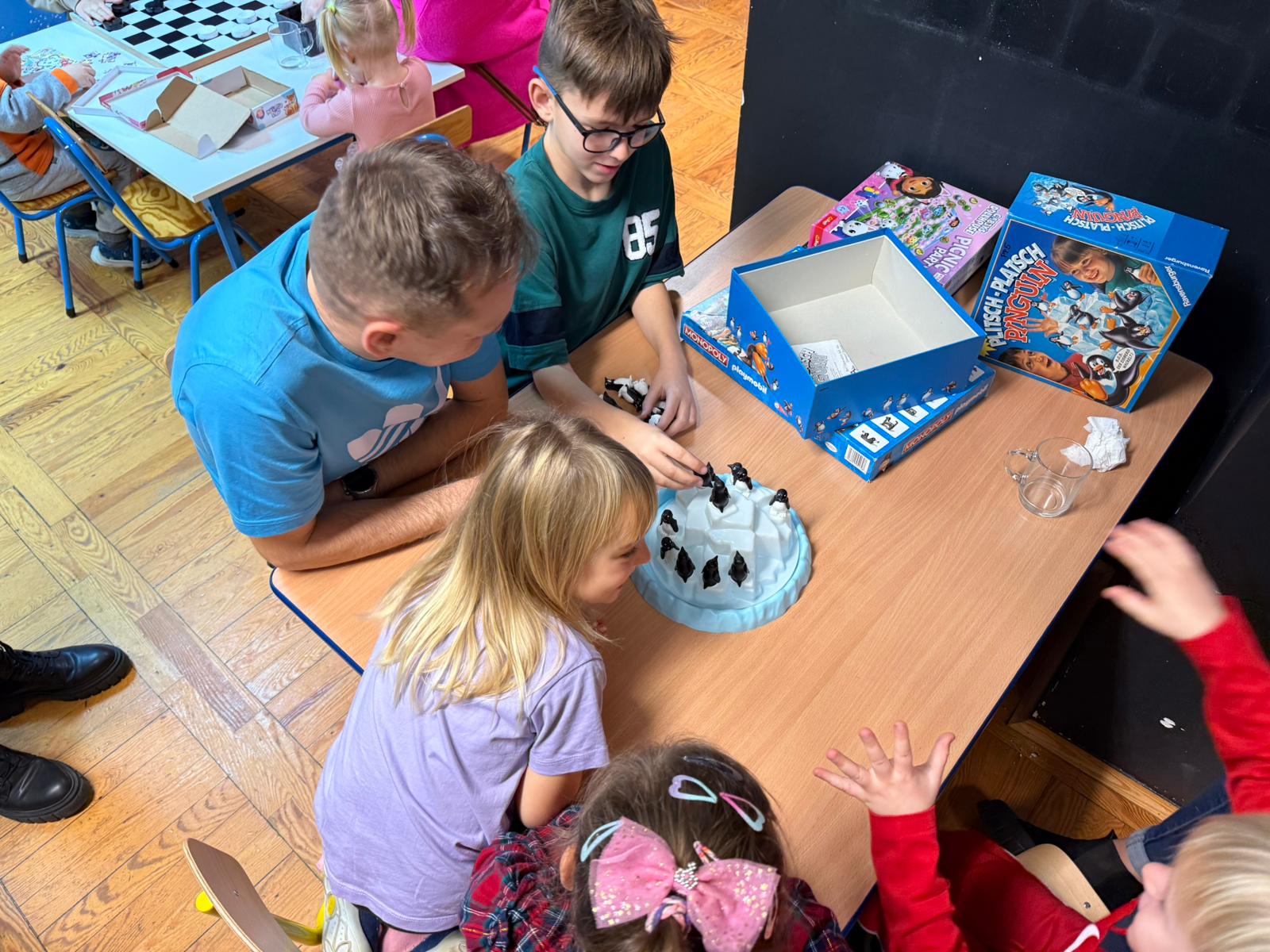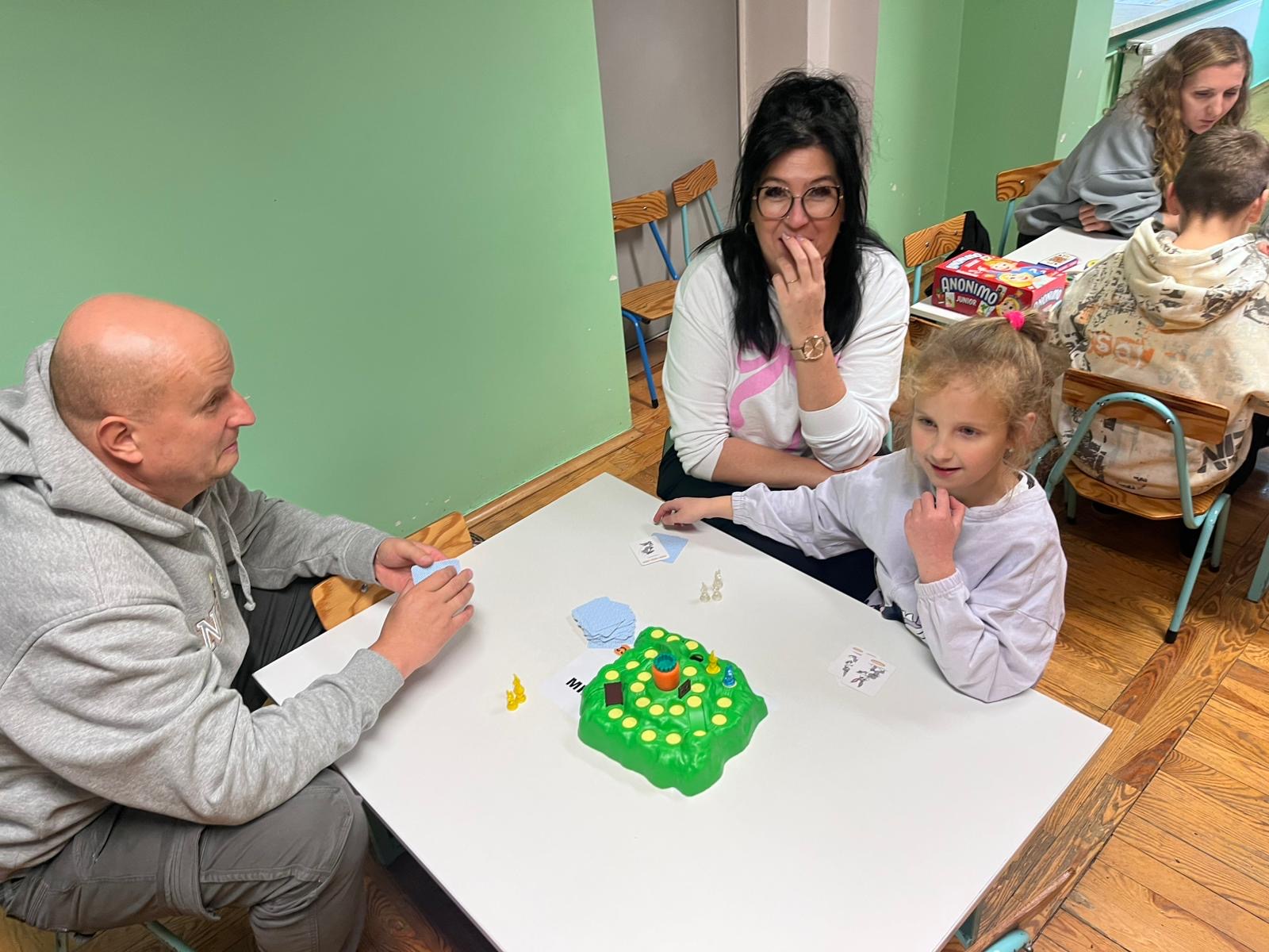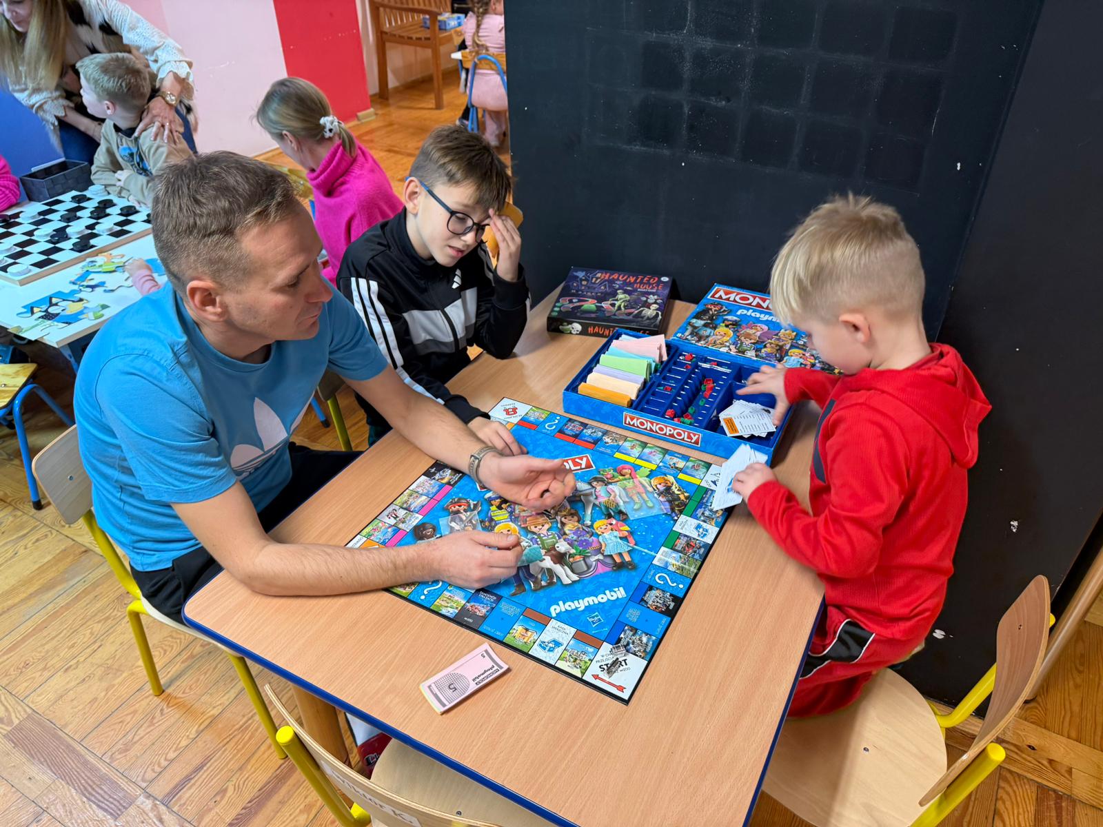13 listopada w naszej Piąteczce odbył się Wieczór Gier Planszowych, który na długo pozostanie w naszej pamięci. Spotkanie zostało zorganizowane w ramach III zagadnienia Przedszkola Promującego Zdrowie, dotyczącego wspierania rozwoju emocjonalnego. Wydarzenie zgromadziło dzieci, rodziców oraz rodzeństwo tworząc atmosferę pełną radości, współpracy i rodzinnego ciepła. Uczestnicy przynieśli swoje ulubione gry z domu, a także korzystali z bogatego zestawu gier dostępnych w przedszkolu. Na stołach pojawiły się gry znane od lat, jak i takie, które rozwijają logiczne myślenie, spostrzegawczość oraz kreatywność. Gry planszowe to nie tylko świetny sposób na wspólne spędzanie czasu, lecz także ważny element wspierający rozwój emocjonalny dzieci. Podczas rozgrywek najmłodsi uczyli się radzenia sobie z emocjami – zarówno tymi trudniejszymi, pojawiającymi się przy porażce, jak i radosnymi, towarzyszącymi zwycięstwu. Ćwiczyli cierpliwość, czekanie na swoją kolej, przestrzeganie zasad, dzielenie się własnością, komunikację, współpracę oraz zdrową rywalizację. Wieczór był również okazją do integracji całej społeczności Piąteczki. Rodzice mieli chwilę na rozmowy i wymianę doświadczeń, a dzieci mogły cieszyć się obecnością kolegów i rodzeństwa w wyjątkowym, ciepłym klimacie. Dodatkowym umileniem były aromatyczna herbatka i orzeźwiająca lemoniada, które czekały na każdego uczestnika.