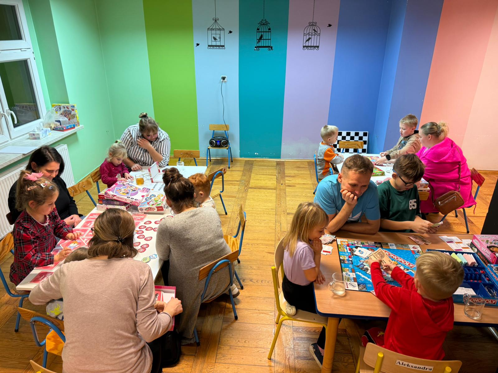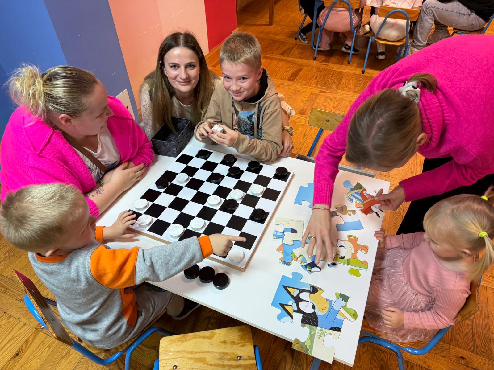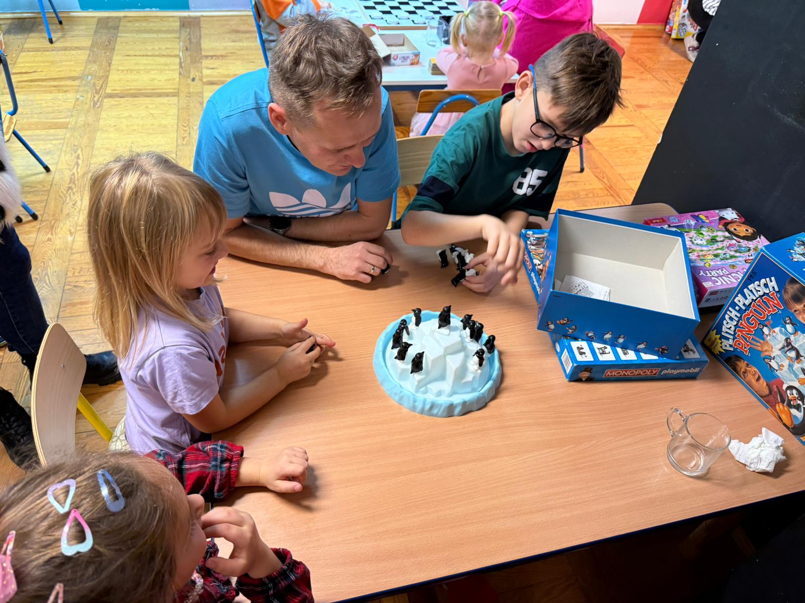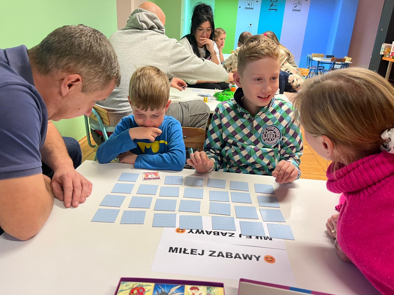 13 listopada w naszej Piąteczce odbył się Wieczór Gier Planszowych, który na długo pozostanie w naszej pamięci. Spotkanie zostało zorganizowane w ramach III zagadnienia Przedszkola Promującego Zdrowie, dotyczącego wspierania rozwoju emocjonalnego. Wydarzenie zgromadziło dzieci, rodziców oraz rodzeństwo tworząc atmosferę pełną radości, współpracy i rodzinnego ciepła. Uczestnicy przynieśli swoje ulubione gry z domu, a także korzystali z bogatego zestawu gier dostępnych w przedszkolu. Na stołach pojawiły się gry znane od lat, jak i takie, które rozwijają logiczne myślenie, spostrzegawczość oraz kreatywność. Gry planszowe to nie tylko świetny sposób na wspólne spędzanie czasu, lecz także ważny element wspierający rozwój emocjonalny dzieci. Podczas rozgrywek najmłodsi uczyli się radzenia sobie z emocjami – zarówno tymi trudniejszymi, pojawiającymi się przy porażce, jak i radosnymi, towarzyszącymi zwycięstwu. Ćwiczyli cierpliwość, czekanie na swoją kolej, przestrzeganie zasad, dzielenie się własnością, komunikację, współpracę oraz zdrową rywalizację. Wieczór był również okazją do integracji całej społeczności Piąteczki. Rodzice mieli chwilę na rozmowy i wymianę doświadczeń, a dzieci mogły cieszyć się obecnością kolegów i rodzeństwa w wyjątkowym, ciepłym klimacie. Dodatkowym umileniem były aromatyczna herbatka i orzeźwiająca lemoniada, które czekały na każdego uczestnika.