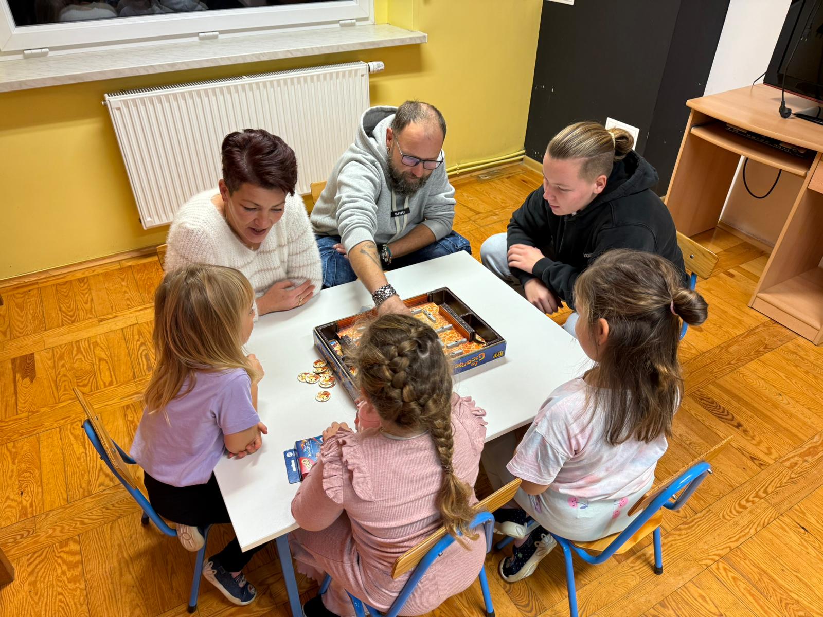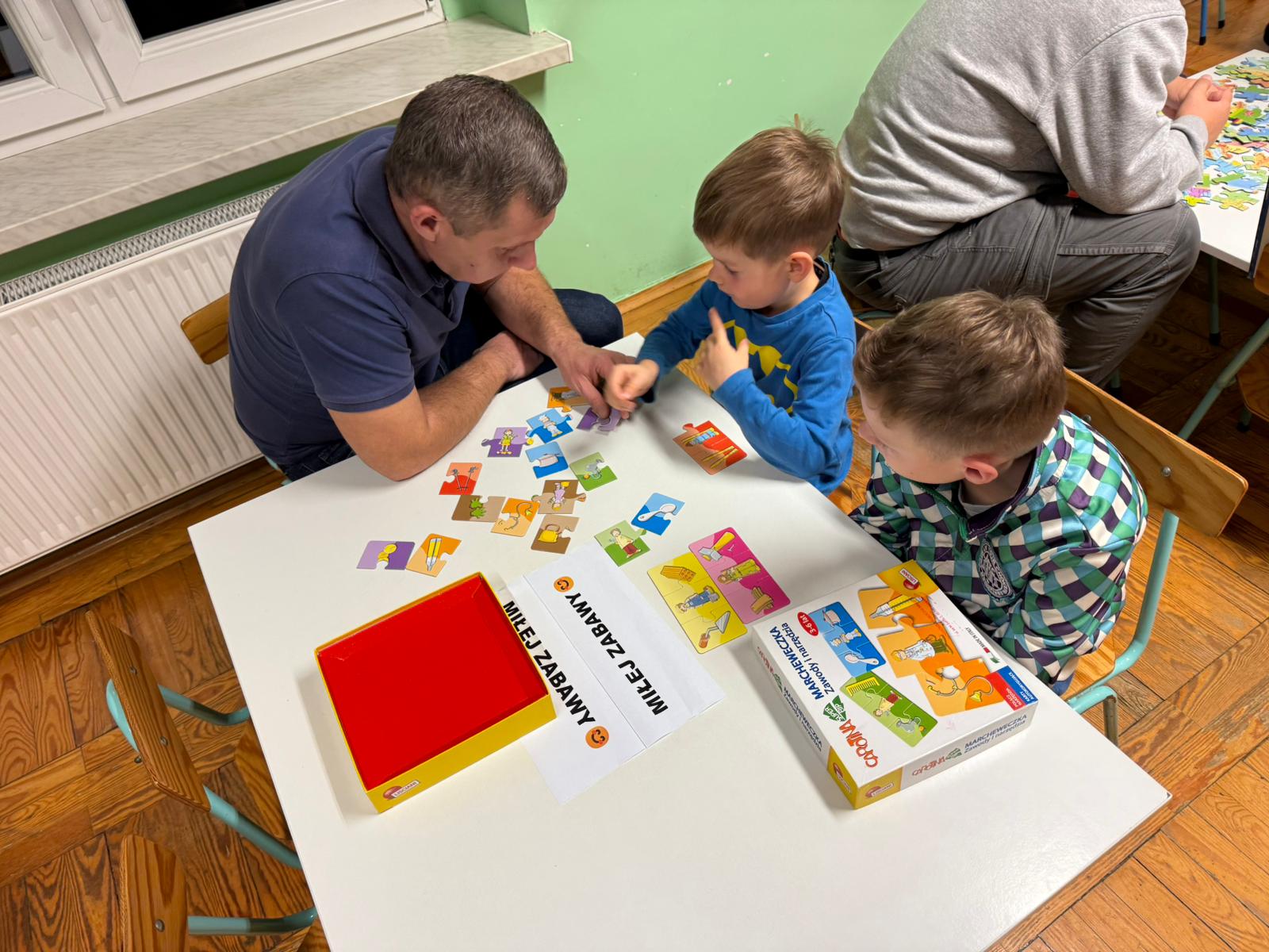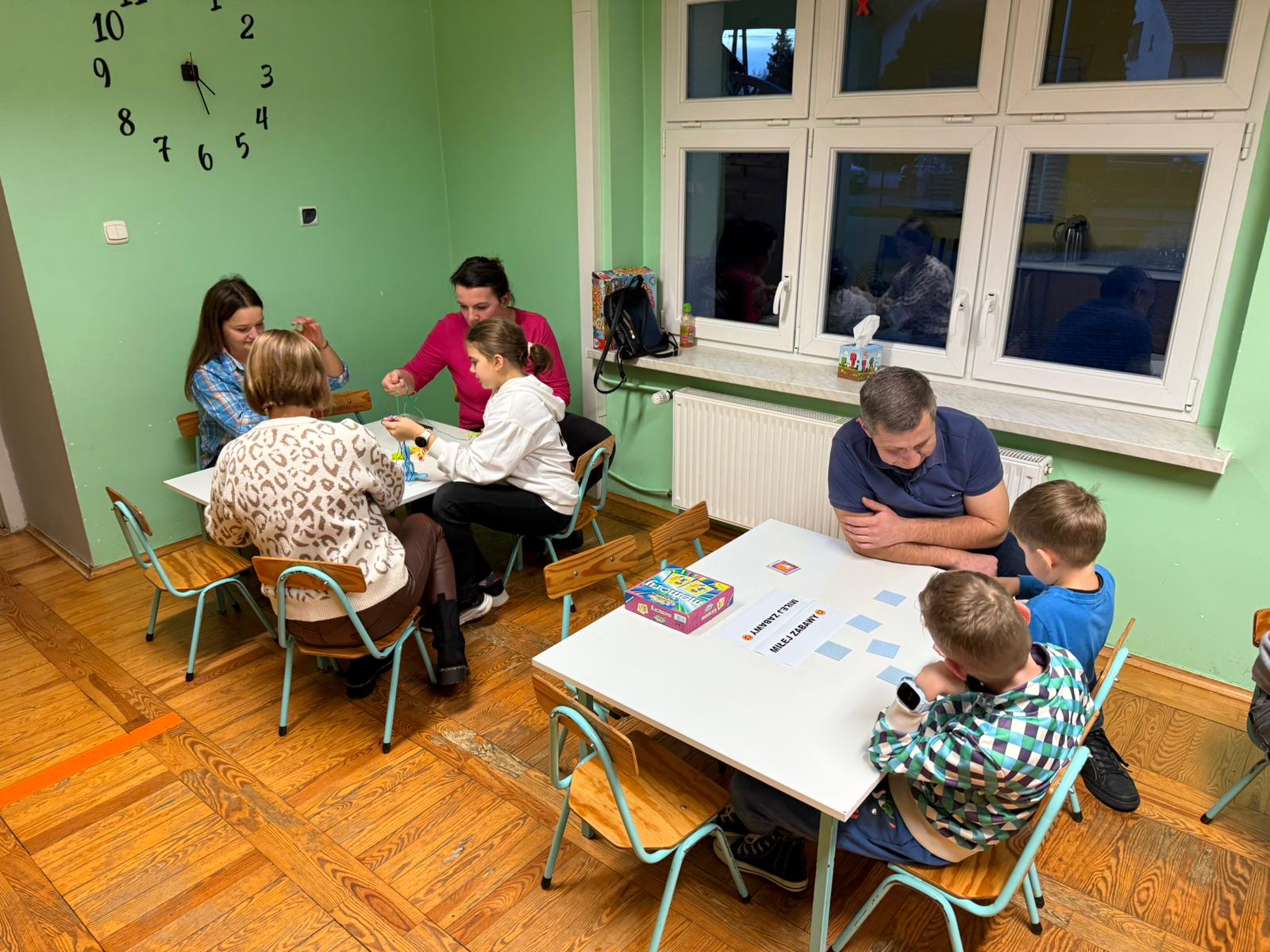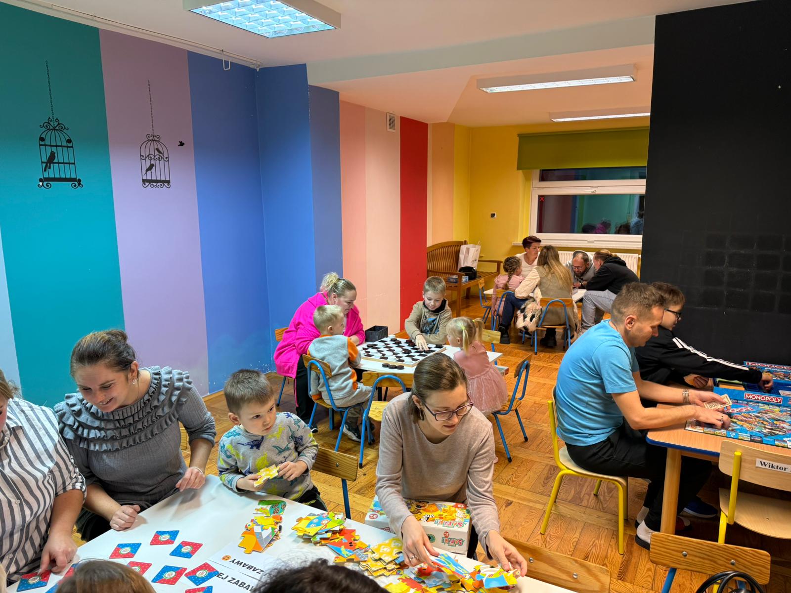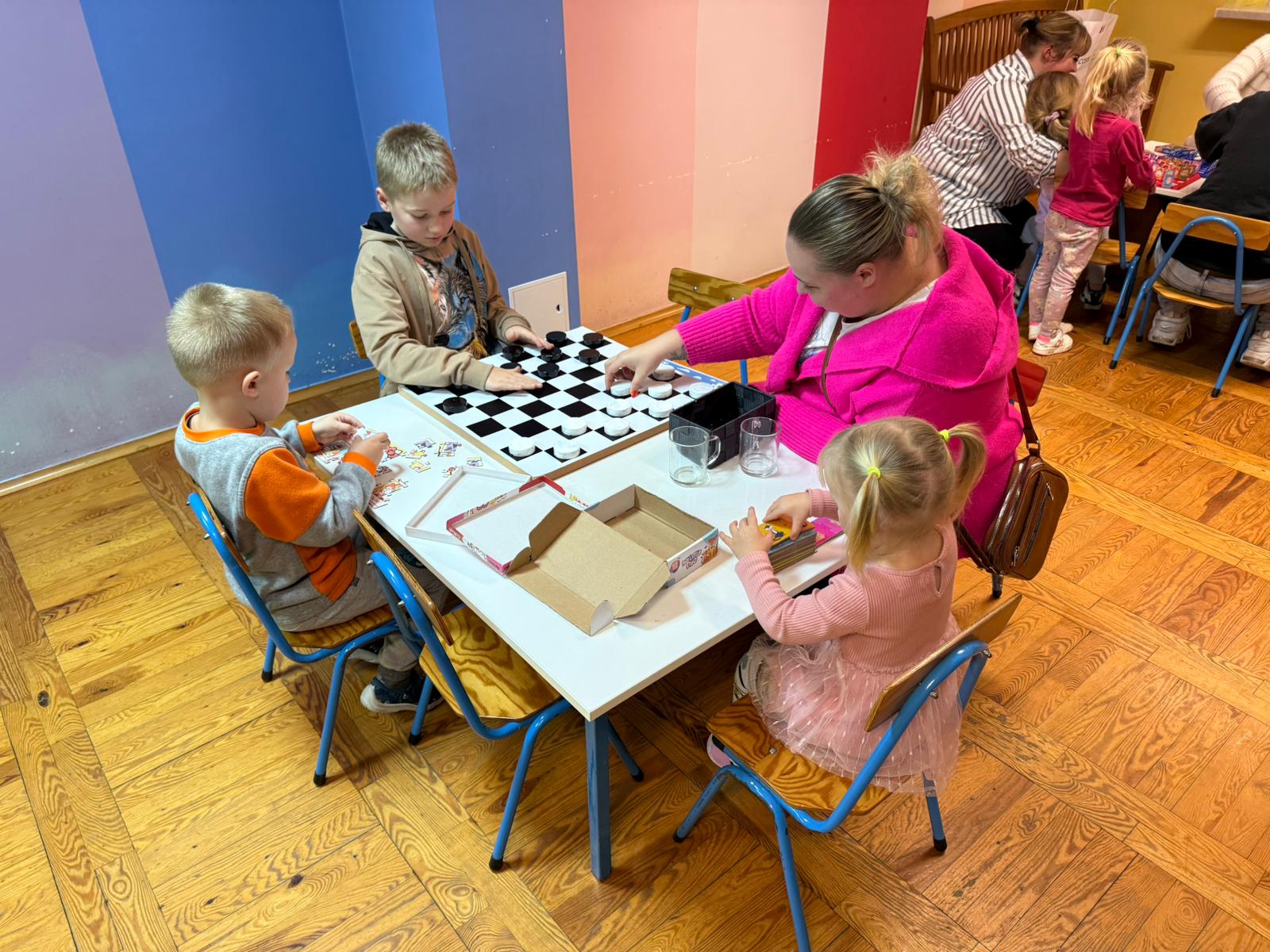 13 listopada w naszej Piąteczce odbył się Wieczór Gier Planszowych, który na długo pozostanie w naszej pamięci. Spotkanie zostało zorganizowane w ramach III zagadnienia Przedszkola Promującego Zdrowie, dotyczącego wspierania rozwoju emocjonalnego. Wydarzenie zgromadziło dzieci, rodziców oraz rodzeństwo tworząc atmosferę pełną radości, współpracy i rodzinnego ciepła. Uczestnicy przynieśli swoje ulubione gry z domu, a także korzystali z bogatego zestawu gier dostępnych w przedszkolu. Na stołach pojawiły się gry znane od lat, jak i takie, które rozwijają logiczne myślenie, spostrzegawczość oraz kreatywność. Gry planszowe to nie tylko świetny sposób na wspólne spędzanie czasu, lecz także ważny element wspierający rozwój emocjonalny dzieci. Podczas rozgrywek najmłodsi uczyli się radzenia sobie z emocjami – zarówno tymi trudniejszymi, pojawiającymi się przy porażce, jak i radosnymi, towarzyszącymi zwycięstwu. Ćwiczyli cierpliwość, czekanie na swoją kolej, przestrzeganie zasad, dzielenie się własnością, komunikację, współpracę oraz zdrową rywalizację. Wieczór był również okazją do integracji całej społeczności Piąteczki. Rodzice mieli chwilę na rozmowy i wymianę doświadczeń, a dzieci mogły cieszyć się obecnością kolegów i rodzeństwa w wyjątkowym, ciepłym klimacie. Dodatkowym umileniem były aromatyczna herbatka i orzeźwiająca lemoniada, które czekały na każdego uczestnika.