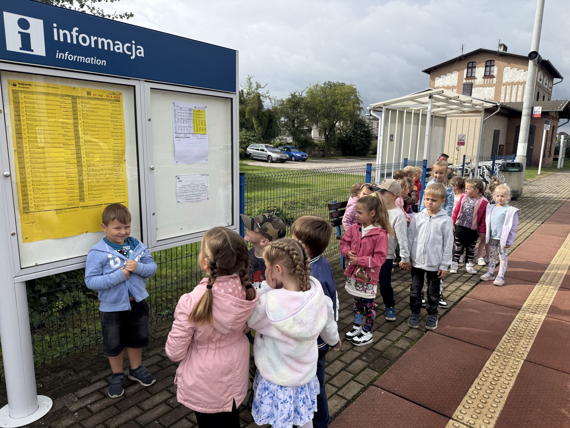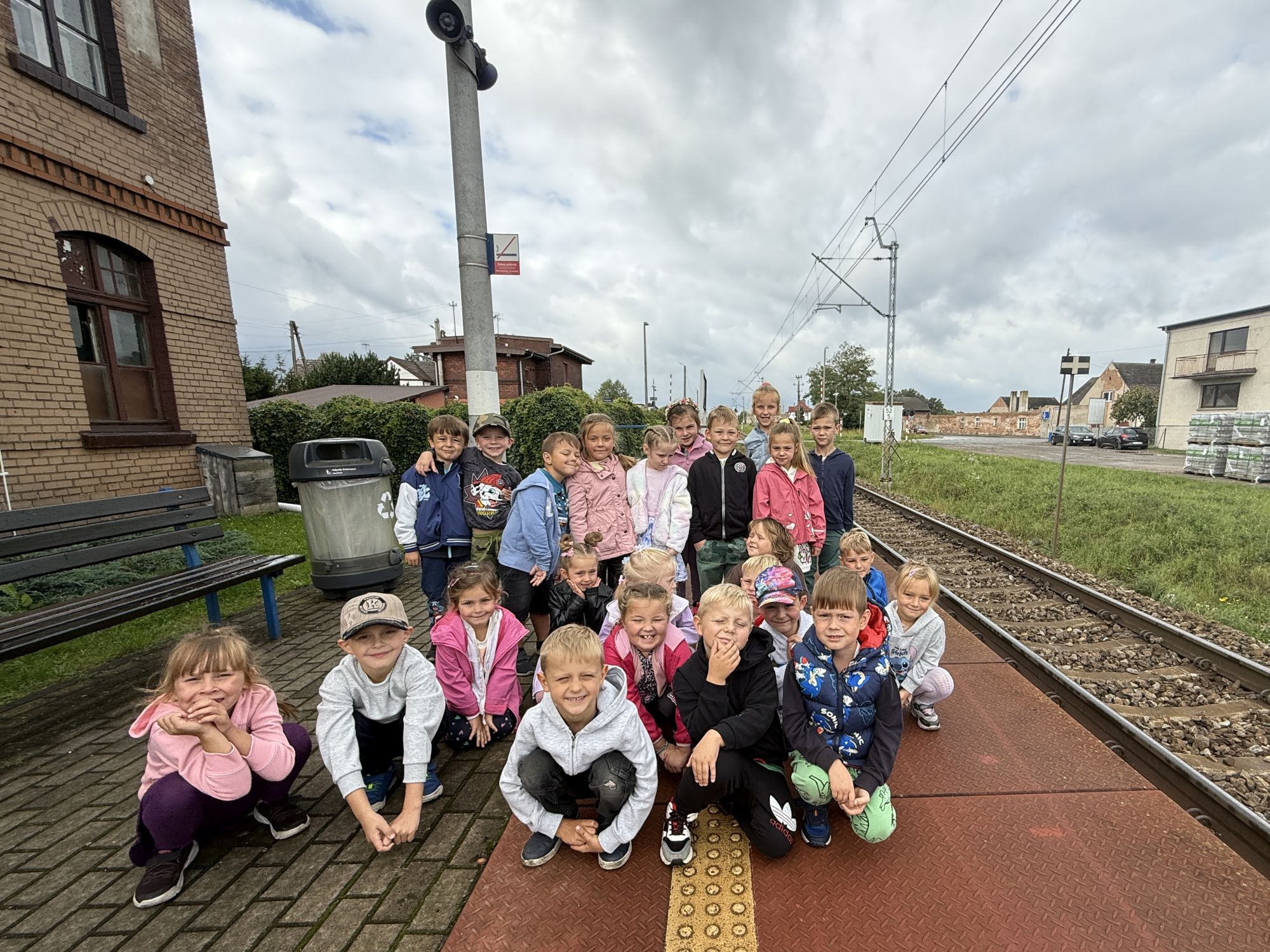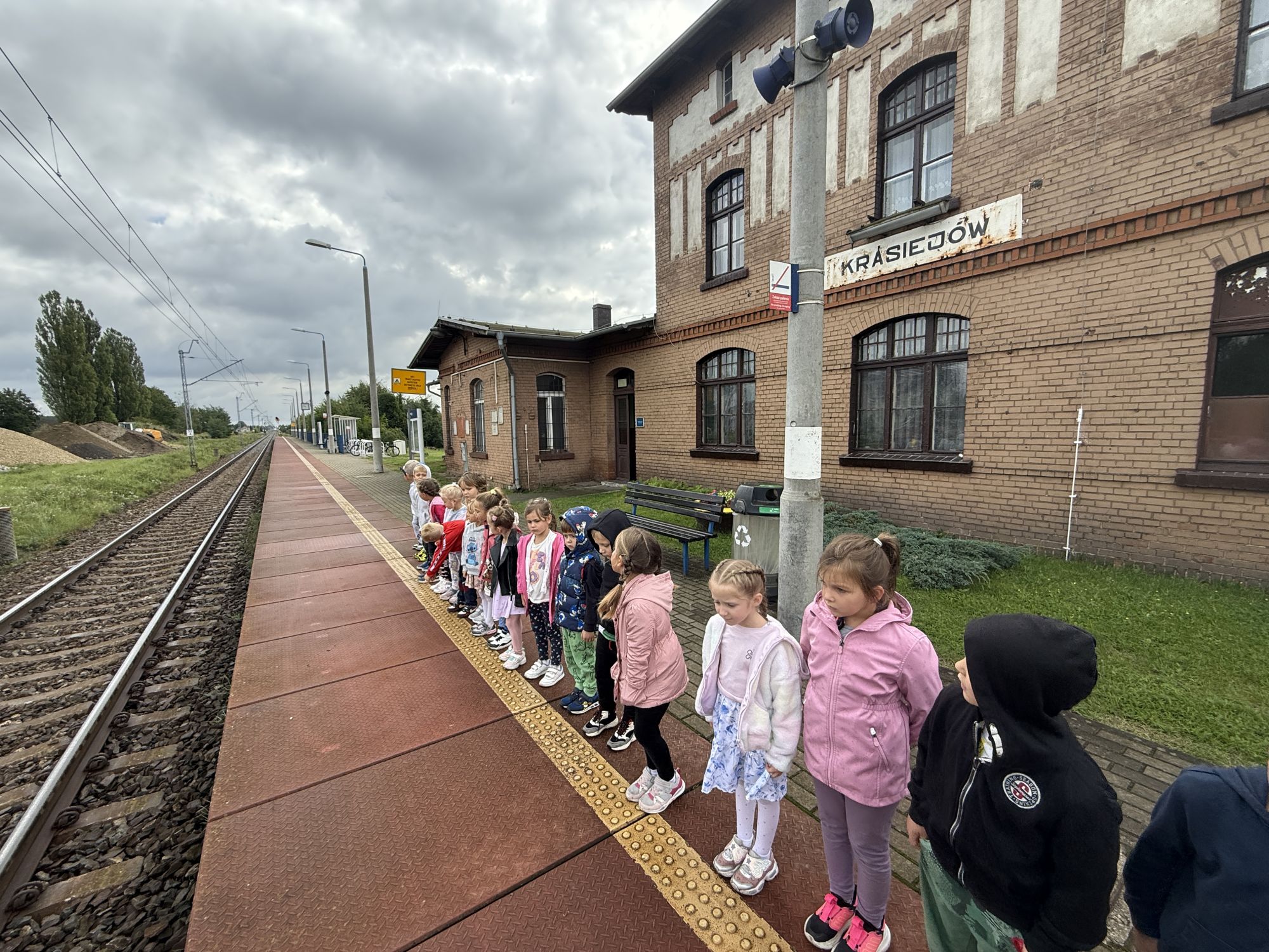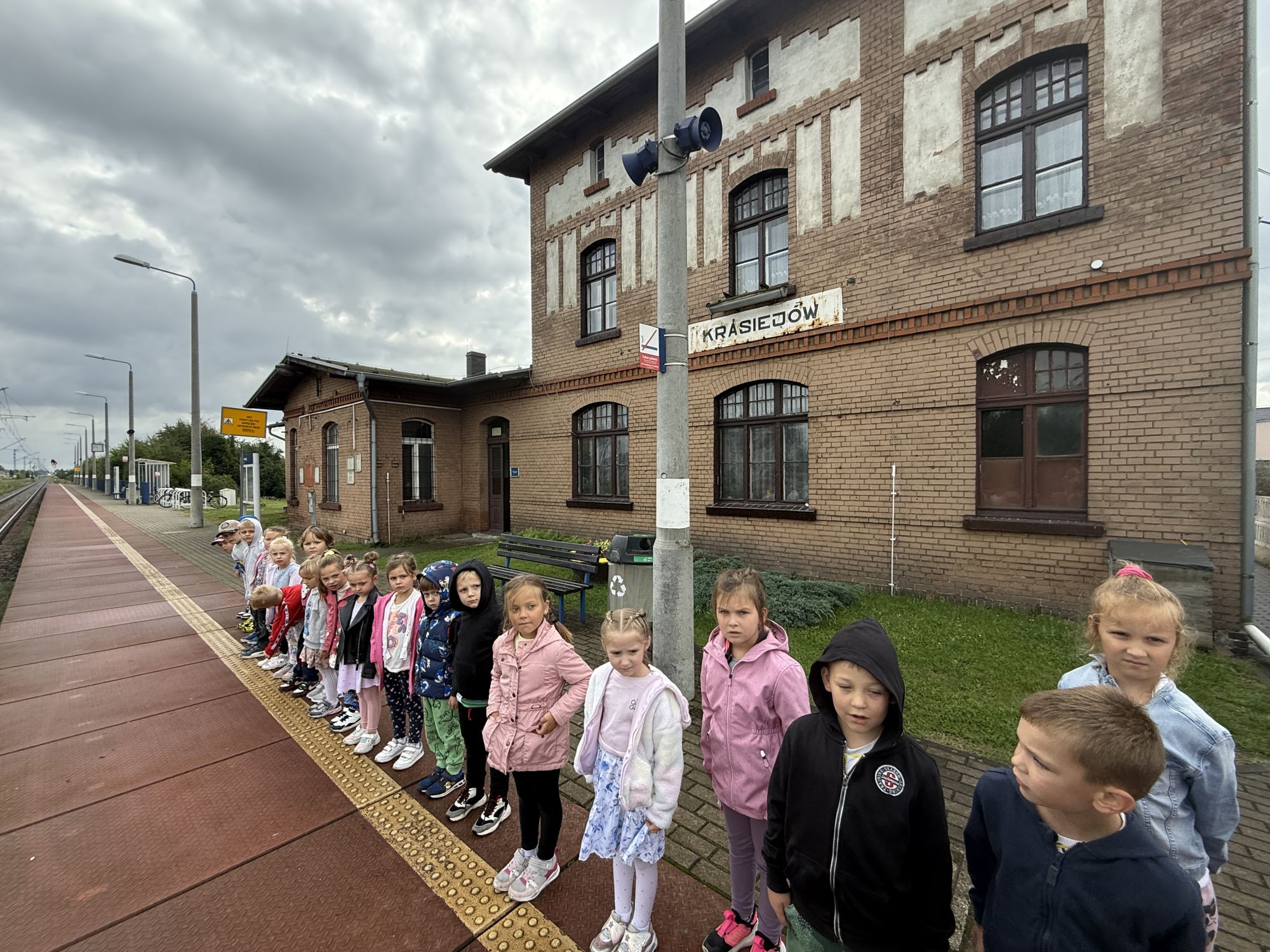 17 września na starszaków czekała kolejna wycieczka w ramach realizacji projektu ETM. Tym razem dzieci odwiedziły stację kolejową PKP w Krasiejowie. Było to niezwykle ciekawe doświadczenie, które pozwoliło dzieciom z bliska zobaczyć, jak wygląda i funkcjonuje miejsce, z którego wyruszają pociągi. Zanim jednak mali podróżnicy udali się na stację, w sali odbyły się zajęcia wprowadzające w tematykę podróży koleją. Dzieci rozwiązywały zagadki o pociągach, rozmawiały o tym, do czego służą i jakie mamy ich rodzaje – pasażerskie, towarowe, szybkie czy regionalne. Nie zabrakło również zabawy przy znanej piosence „Jedzie pociąg z daleka”, a także prac plastycznych czy układania puzzli z wizerunkiem pociągu. Wszystko to przygotowało przedszkolaków do spotkania z prawdziwym światem kolei. Na miejscu dzieci mogły podziwiać dworzec kolejowy, tory, peron i poczekalnię. Szczególną uwagę przyciągnął rozkład jazdy, który wydał się dla wielu bardzo interesujący – dzieci uczyły się, że to dzięki niemu podróżni wiedzą, o której godzinie odjeżdżają i przyjeżdżają pociągi. Przedszkolaki zobaczyły także, jak ważne jest zachowanie ostrożności i zasad bezpieczeństwa w pobliżu torów. Wycieczka była nie tylko pouczająca, ale i inspirująca. Dzieci mogły poczuć się jak prawdziwi podróżnicy, a niektórzy z nich już podczas wizyty marzyli o wyprawach pociągiem. Takie doświadczenia rozwijają wyobraźnię, wzbogacają wiedzę i uczą samodzielności. Podsumowując, wyprawa na stację kolejową w Krasiejowie okazała się wspaniałą lekcją w terenie. Przedszkolaki wróciły pełne wrażeń i nowych wiadomości.