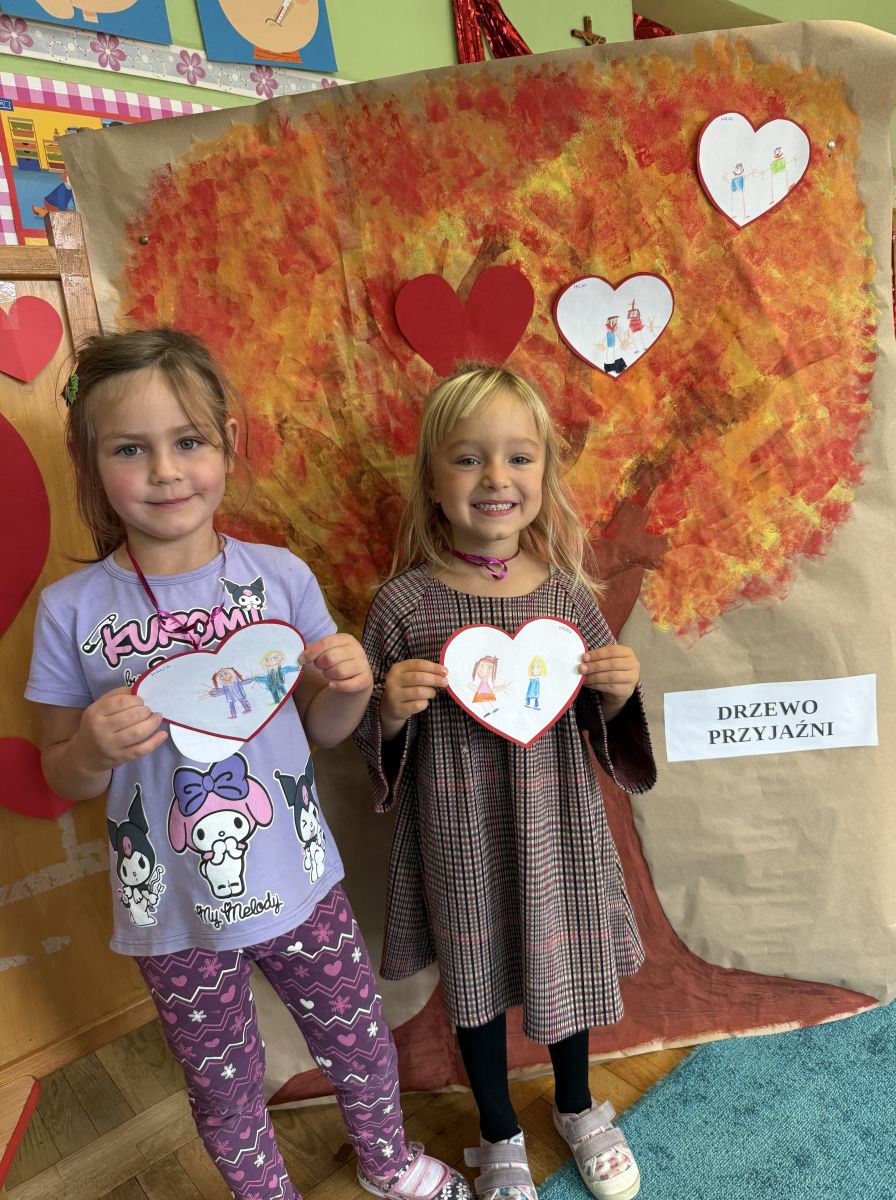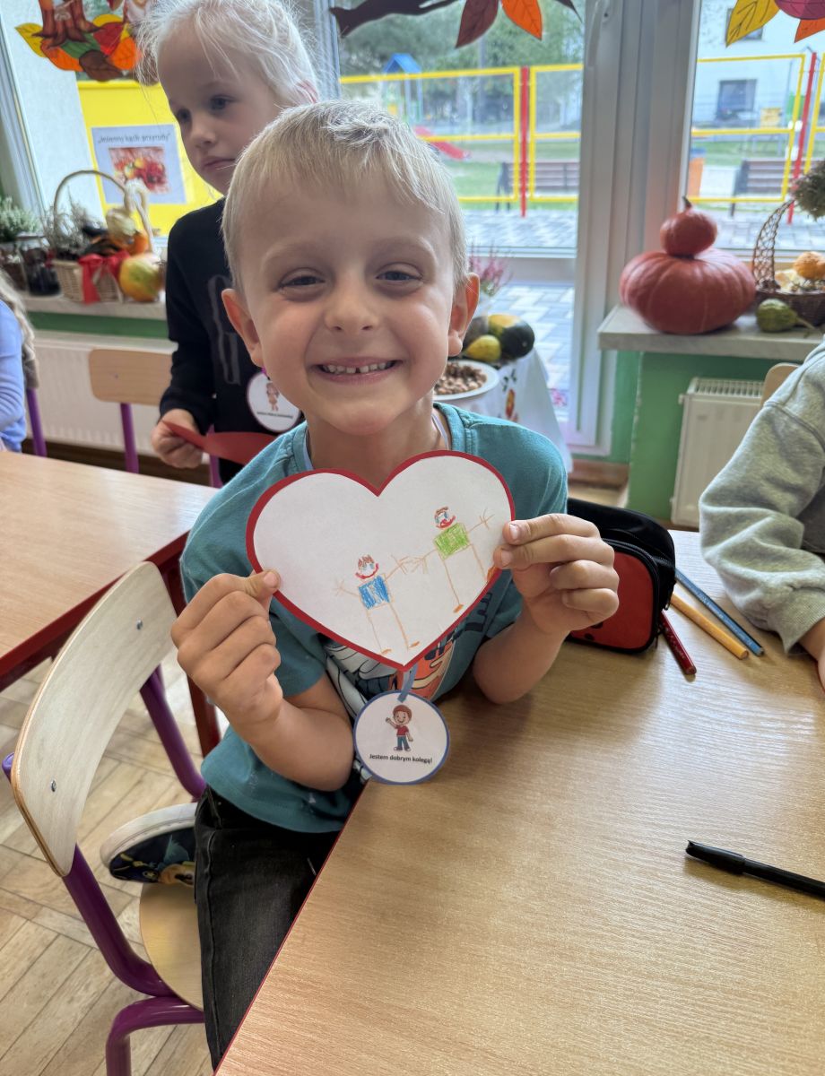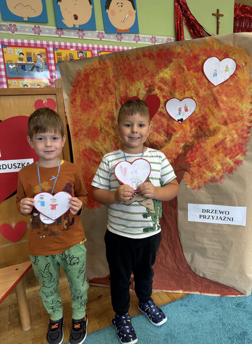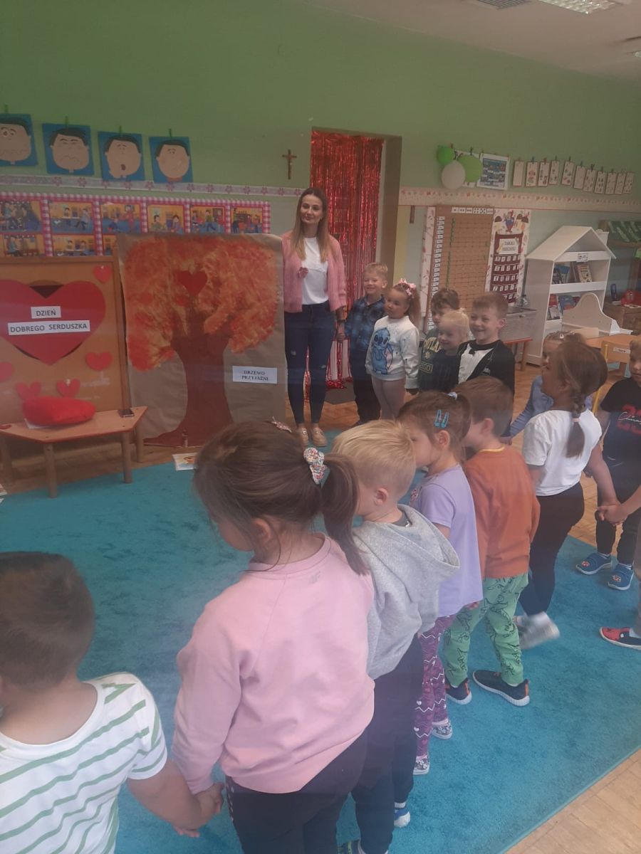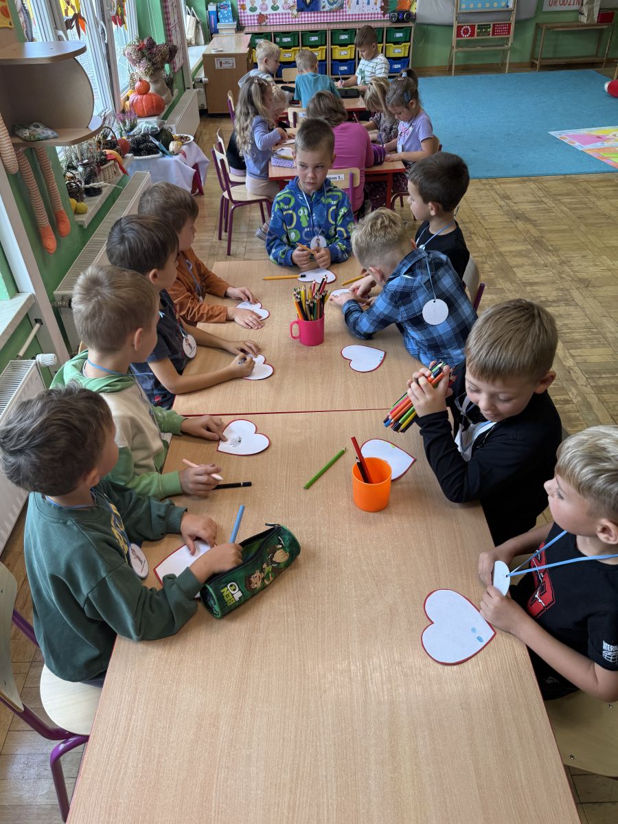 29 września w starszej grupie naszego przedszkola odbył się wyjątkowy dzień – „Dzień Dobrego Serduszka”, zorganizowany w ramach Tygodnia Dobrych Relacji. Była to okazja do rozmów, zabawy i wspólnej refleksji nad tym, co to znaczy mieć dobre serce i jak budować wartościowe przyjaźnie. Dzieci rozpoczęły zajęcia od burzy mózgów, podczas której wspólnie zastanawiały się, co oznacza bycie osobą o dobrym sercu. Następnie wysłuchały pięknej bajki pt. „Serduszko małego misia”. Opowieść stała się punktem wyjścia do rozmowy o miłości, przyjaźni i odwadze – wartościach szczególnie ważnych w codziennym życiu przedszkolaka. Aby lepiej zrozumieć treść bajki, dzieci ułożyły gałązkę logiczną, porządkując kolejno wydarzenia i ukazując ich sens. Nie zabrakło również aktywności rozwijających relacje rówieśnicze. Podczas zabawy „Wędrujące serduszko” dzieci mówiły sobie nawzajem coś miłego, ucząc się dostrzegać i doceniać innych. Odgrywały różne scenki dramowe, w których wyrażały emocje za pomocą ruchu i mimiki. Radosnym akcentem był udział w tańcach w parach oraz zabawach integrujących grupę. Szczególną atrakcją była praca plastyczna – dzieci w grupach kolorowały duże obrazki przedstawiające dziewczynkę i chłopca, a następnie rozmawiały o tym, jaki powinien być dobry kolega i dobra koleżanka. Dzięki temu mogły nie tylko rozwijać swoją kreatywność, ale także uświadomić sobie, jak ważne są pozytywne cechy w budowaniu przyjaźni. Powstało również niezwykłe Drzewo Przyjaźni – każde dziecko narysowało na serduszku siebie i swojego przyjaciela z grupy, a następnie zawiesiło je na wspólnym drzewie. Na zakończenie pełnego wrażeń dnia dzieci otrzymały wyjątkowe medale z napisem „Jestem dobrym kolegą/koleżanką”. Była to piękna nagroda za zaangażowanie, życzliwość i otwarte serca.