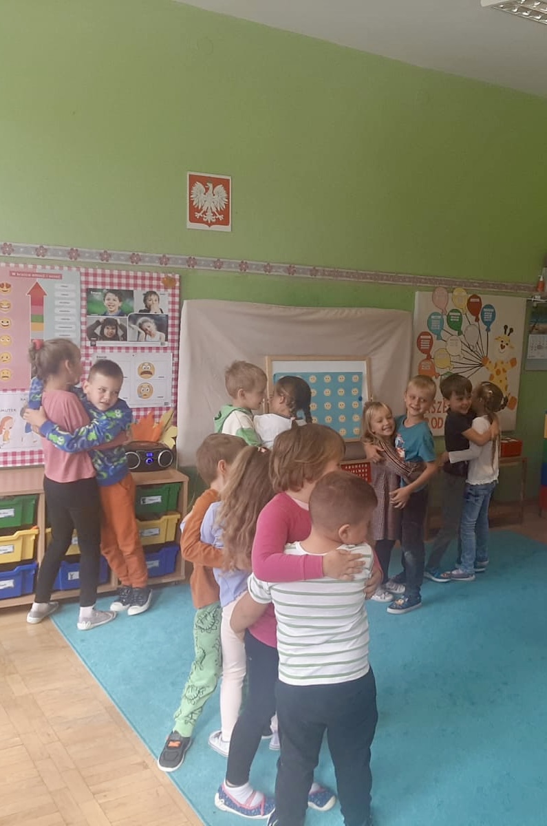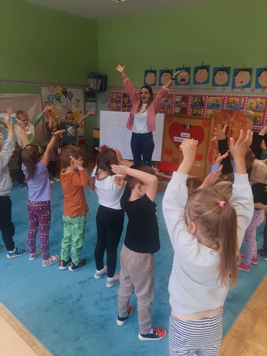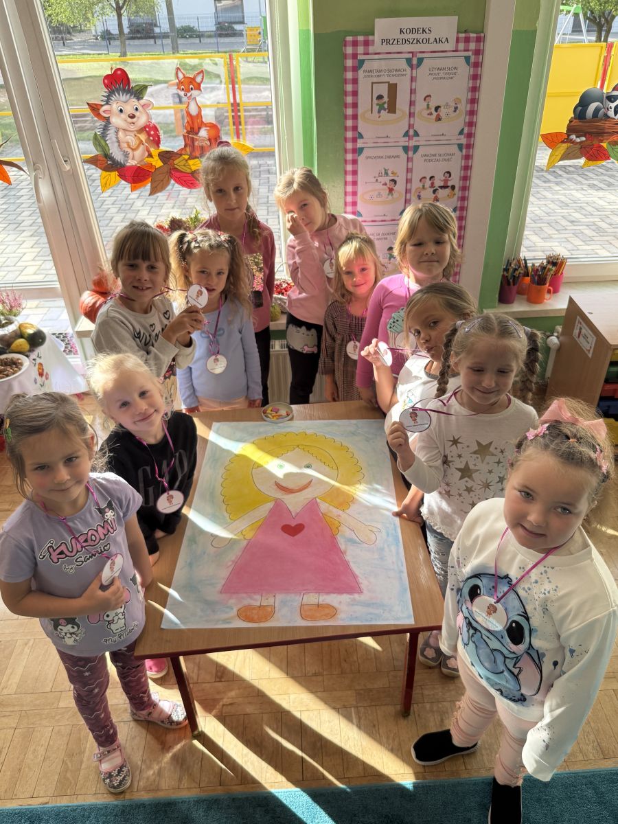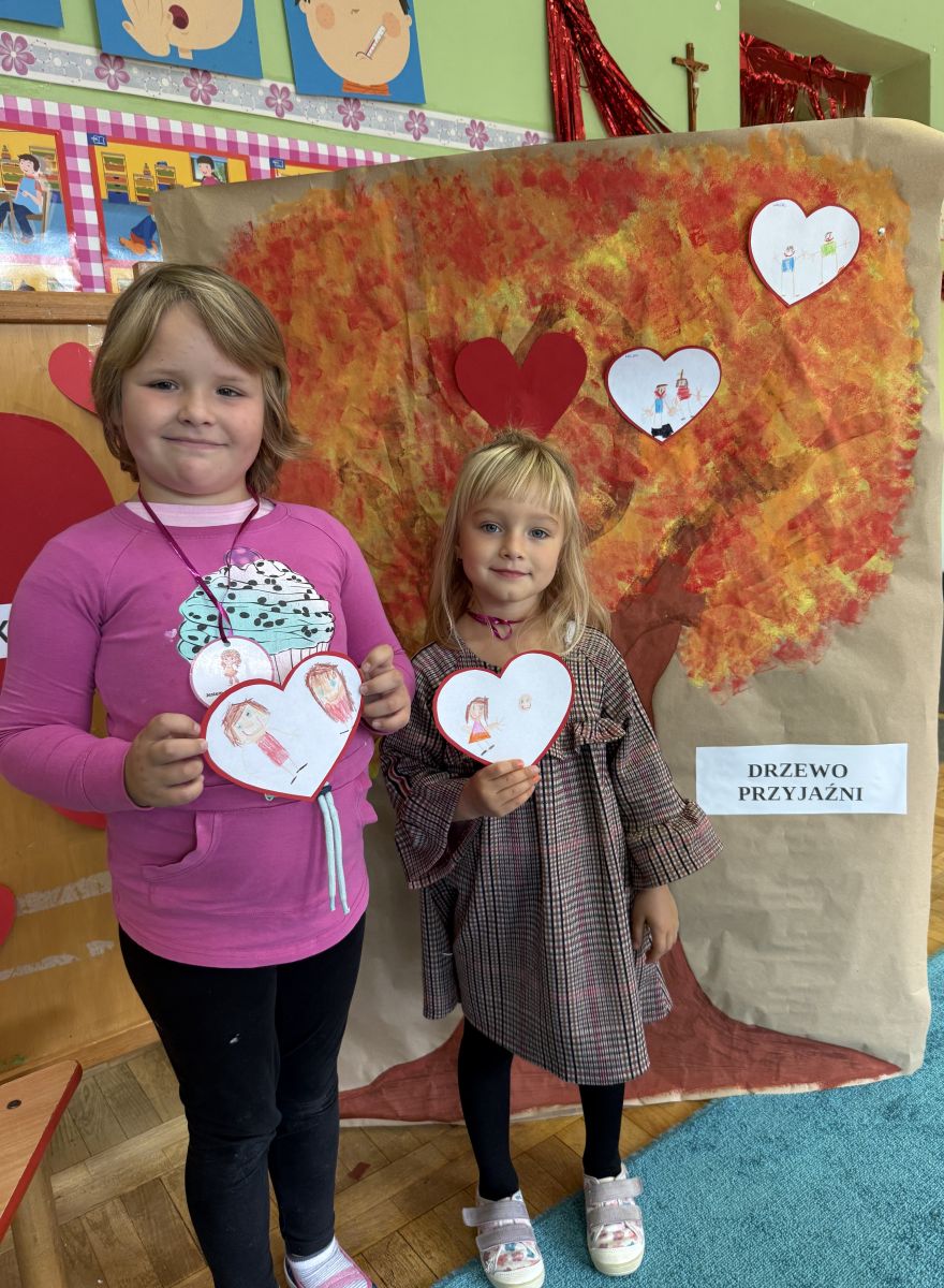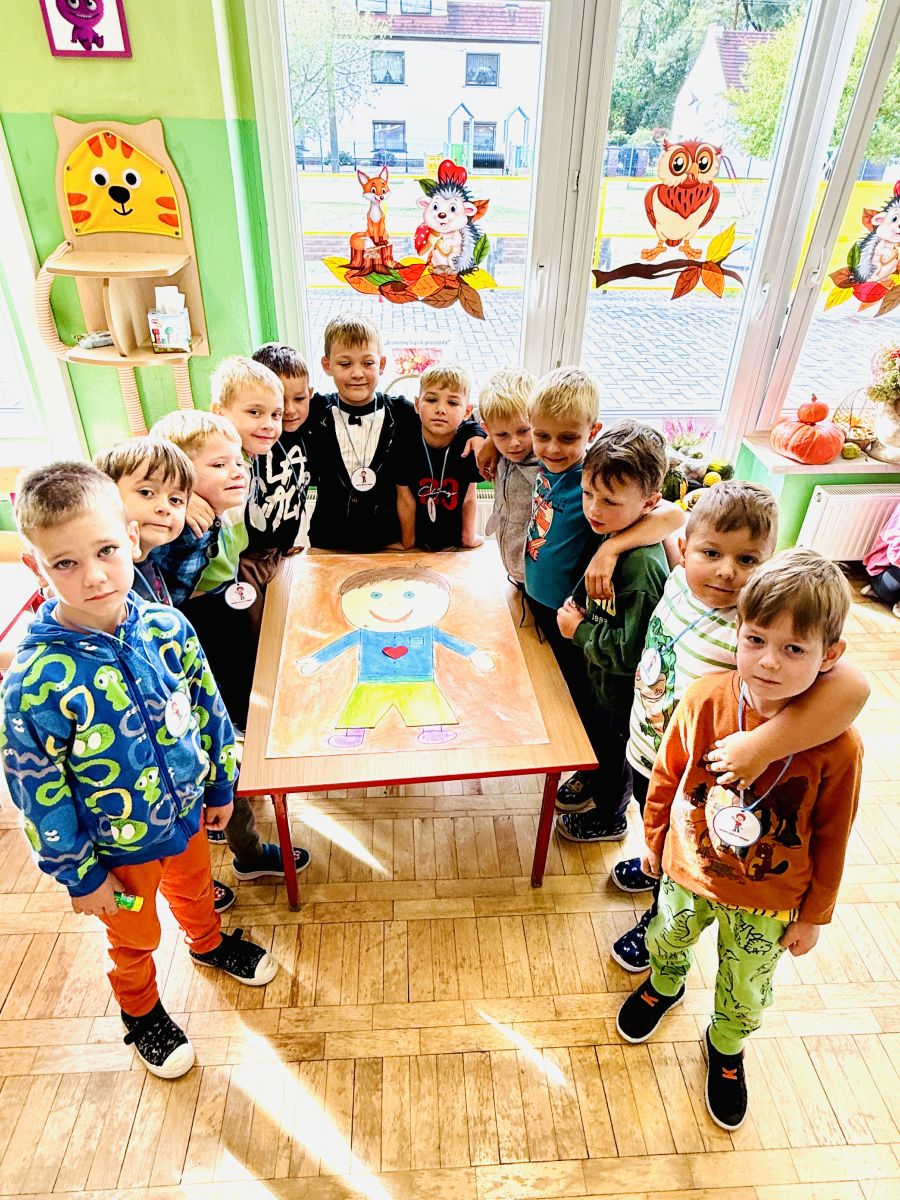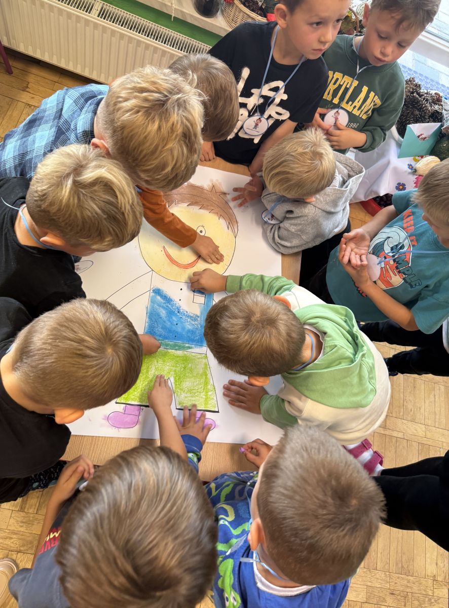 29 września w starszej grupie naszego przedszkola odbył się wyjątkowy dzień – „Dzień Dobrego Serduszka”, zorganizowany w ramach Tygodnia Dobrych Relacji. Była to okazja do rozmów, zabawy i wspólnej refleksji nad tym, co to znaczy mieć dobre serce i jak budować wartościowe przyjaźnie. Dzieci rozpoczęły zajęcia od burzy mózgów, podczas której wspólnie zastanawiały się, co oznacza bycie osobą o dobrym sercu. Następnie wysłuchały pięknej bajki pt. „Serduszko małego misia”. Opowieść stała się punktem wyjścia do rozmowy o miłości, przyjaźni i odwadze – wartościach szczególnie ważnych w codziennym życiu przedszkolaka. Aby lepiej zrozumieć treść bajki, dzieci ułożyły gałązkę logiczną, porządkując kolejno wydarzenia i ukazując ich sens. Nie zabrakło również aktywności rozwijających relacje rówieśnicze. Podczas zabawy „Wędrujące serduszko” dzieci mówiły sobie nawzajem coś miłego, ucząc się dostrzegać i doceniać innych. Odgrywały różne scenki dramowe, w których wyrażały emocje za pomocą ruchu i mimiki. Radosnym akcentem był udział w tańcach w parach oraz zabawach integrujących grupę. Szczególną atrakcją była praca plastyczna – dzieci w grupach kolorowały duże obrazki przedstawiające dziewczynkę i chłopca, a następnie rozmawiały o tym, jaki powinien być dobry kolega i dobra koleżanka. Dzięki temu mogły nie tylko rozwijać swoją kreatywność, ale także uświadomić sobie, jak ważne są pozytywne cechy w budowaniu przyjaźni. Powstało również niezwykłe Drzewo Przyjaźni – każde dziecko narysowało na serduszku siebie i swojego przyjaciela z grupy, a następnie zawiesiło je na wspólnym drzewie. Na zakończenie pełnego wrażeń dnia dzieci otrzymały wyjątkowe medale z napisem „Jestem dobrym kolegą/koleżanką”. Była to piękna nagroda za zaangażowanie, życzliwość i otwarte serca.