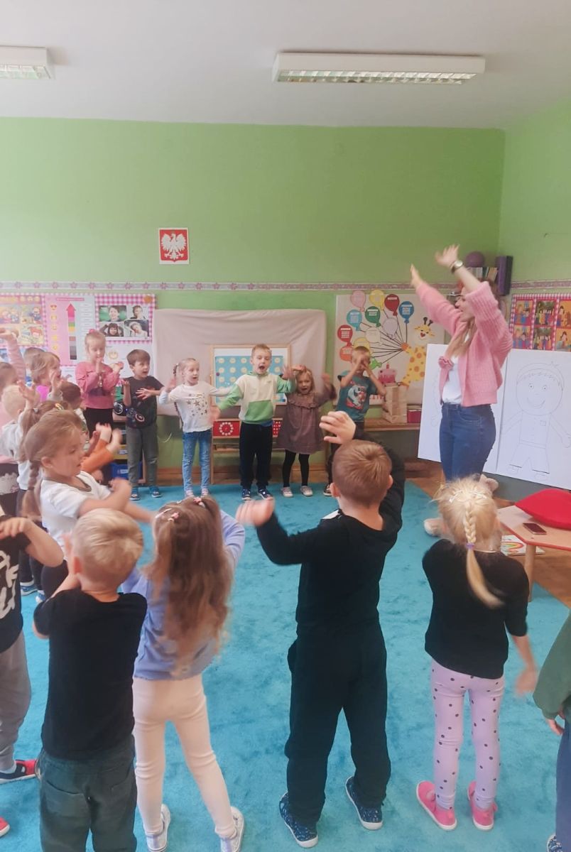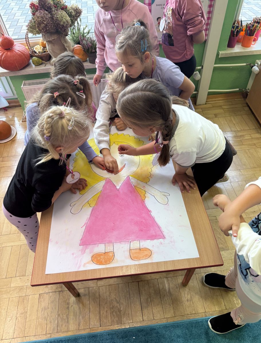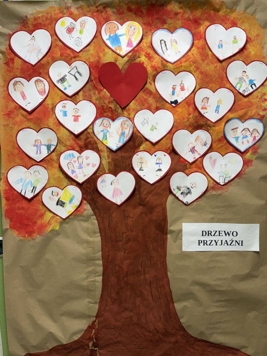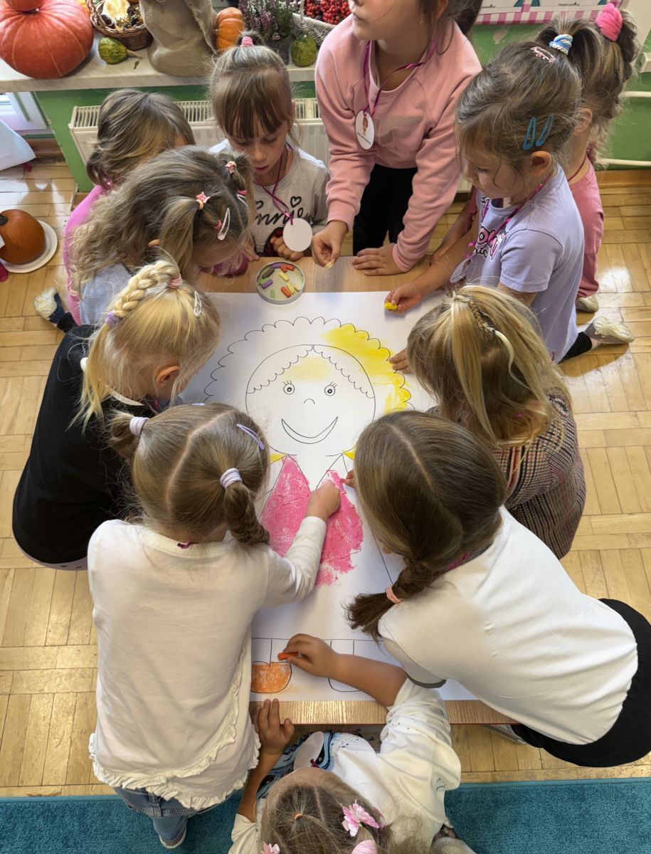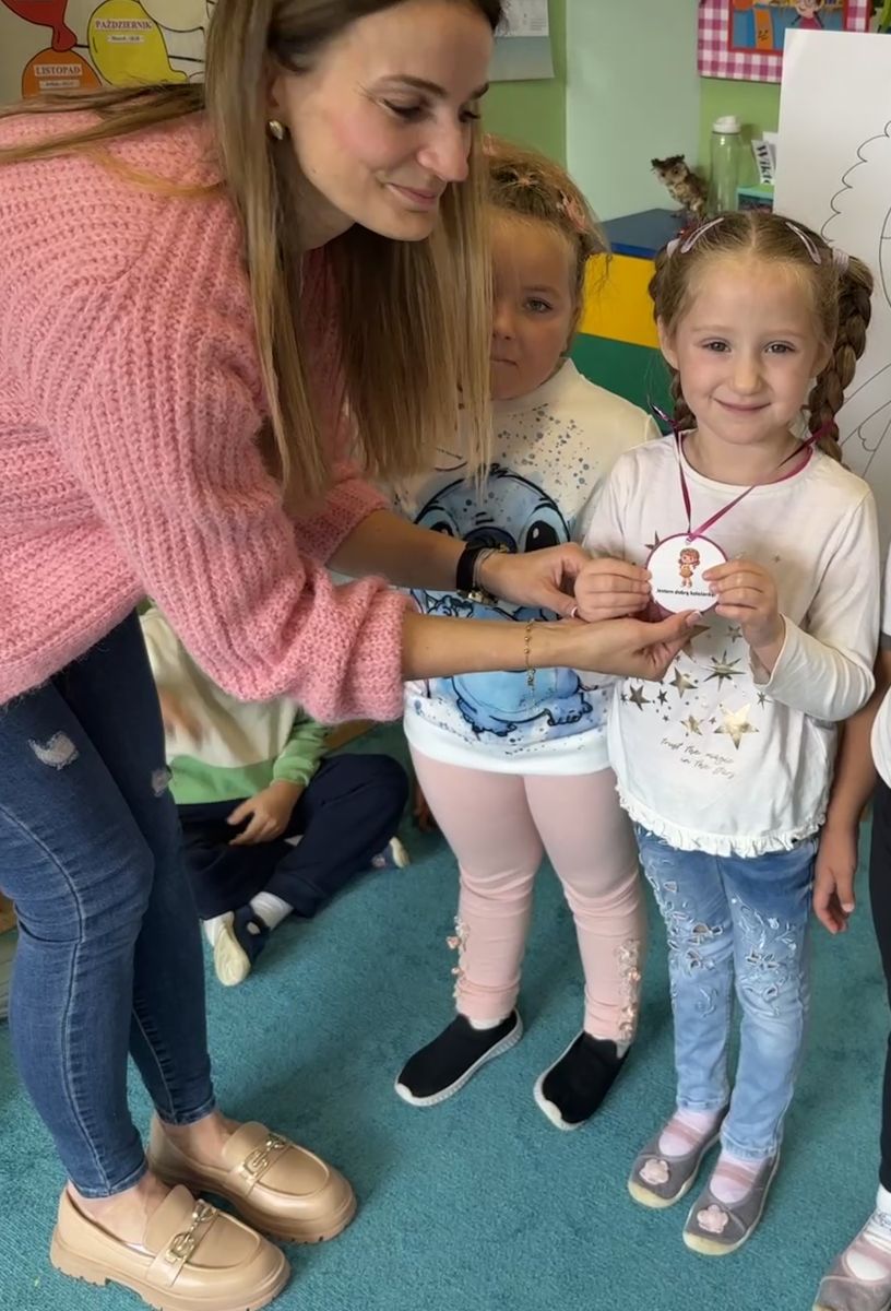 29 września w starszej grupie naszego przedszkola odbył się wyjątkowy dzień – „Dzień Dobrego Serduszka”, zorganizowany w ramach Tygodnia Dobrych Relacji. Była to okazja do rozmów, zabawy i wspólnej refleksji nad tym, co to znaczy mieć dobre serce i jak budować wartościowe przyjaźnie. Dzieci rozpoczęły zajęcia od burzy mózgów, podczas której wspólnie zastanawiały się, co oznacza bycie osobą o dobrym sercu. Następnie wysłuchały pięknej bajki pt. „Serduszko małego misia”. Opowieść stała się punktem wyjścia do rozmowy o miłości, przyjaźni i odwadze – wartościach szczególnie ważnych w codziennym życiu przedszkolaka. Aby lepiej zrozumieć treść bajki, dzieci ułożyły gałązkę logiczną, porządkując kolejno wydarzenia i ukazując ich sens. Nie zabrakło również aktywności rozwijających relacje rówieśnicze. Podczas zabawy „Wędrujące serduszko” dzieci mówiły sobie nawzajem coś miłego, ucząc się dostrzegać i doceniać innych. Odgrywały różne scenki dramowe, w których wyrażały emocje za pomocą ruchu i mimiki. Radosnym akcentem był udział w tańcach w parach oraz zabawach integrujących grupę. Szczególną atrakcją była praca plastyczna – dzieci w grupach kolorowały duże obrazki przedstawiające dziewczynkę i chłopca, a następnie rozmawiały o tym, jaki powinien być dobry kolega i dobra koleżanka. Dzięki temu mogły nie tylko rozwijać swoją kreatywność, ale także uświadomić sobie, jak ważne są pozytywne cechy w budowaniu przyjaźni. Powstało również niezwykłe Drzewo Przyjaźni – każde dziecko narysowało na serduszku siebie i swojego przyjaciela z grupy, a następnie zawiesiło je na wspólnym drzewie. Na zakończenie pełnego wrażeń dnia dzieci otrzymały wyjątkowe medale z napisem „Jestem dobrym kolegą/koleżanką”. Była to piękna nagroda za zaangażowanie, życzliwość i otwarte serca.