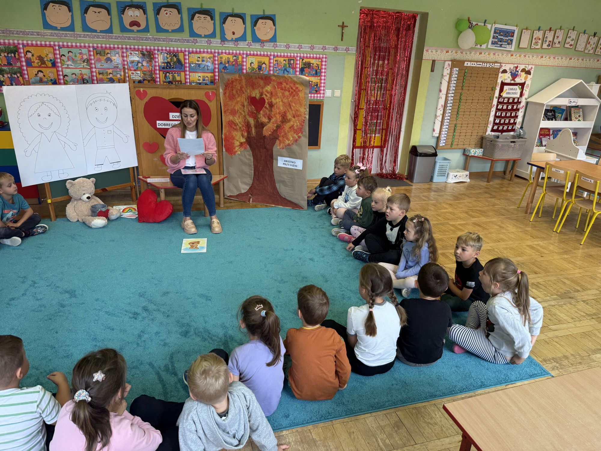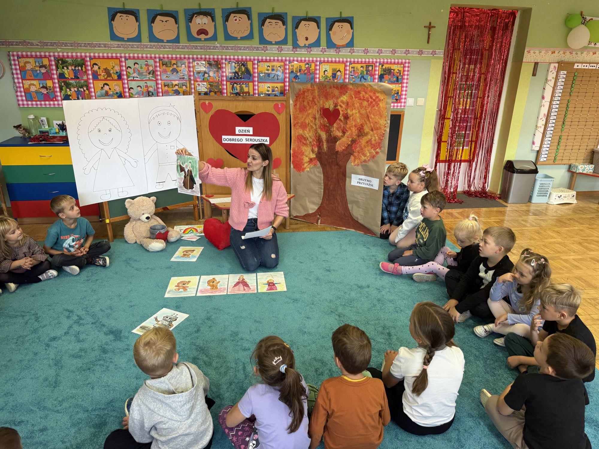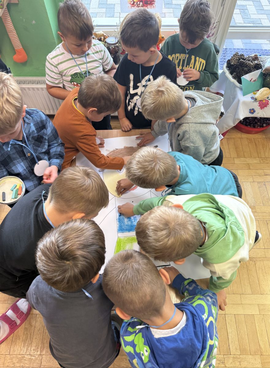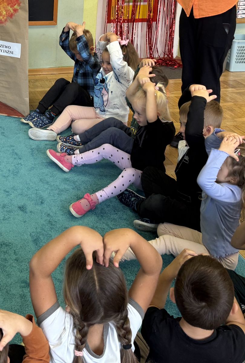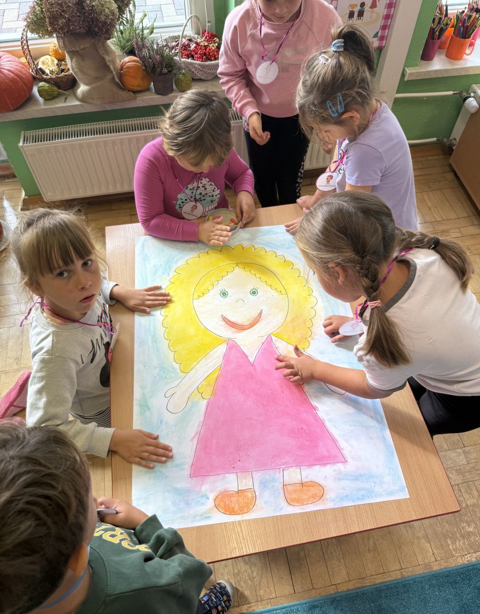 29 września w starszej grupie naszego przedszkola odbył się wyjątkowy dzień – „Dzień Dobrego Serduszka”, zorganizowany w ramach Tygodnia Dobrych Relacji. Była to okazja do rozmów, zabawy i wspólnej refleksji nad tym, co to znaczy mieć dobre serce i jak budować wartościowe przyjaźnie. Dzieci rozpoczęły zajęcia od burzy mózgów, podczas której wspólnie zastanawiały się, co oznacza bycie osobą o dobrym sercu. Następnie wysłuchały pięknej bajki pt. „Serduszko małego misia”. Opowieść stała się punktem wyjścia do rozmowy o miłości, przyjaźni i odwadze – wartościach szczególnie ważnych w codziennym życiu przedszkolaka. Aby lepiej zrozumieć treść bajki, dzieci ułożyły gałązkę logiczną, porządkując kolejno wydarzenia i ukazując ich sens. Nie zabrakło również aktywności rozwijających relacje rówieśnicze. Podczas zabawy „Wędrujące serduszko” dzieci mówiły sobie nawzajem coś miłego, ucząc się dostrzegać i doceniać innych. Odgrywały różne scenki dramowe, w których wyrażały emocje za pomocą ruchu i mimiki. Radosnym akcentem był udział w tańcach w parach oraz zabawach integrujących grupę. Szczególną atrakcją była praca plastyczna – dzieci w grupach kolorowały duże obrazki przedstawiające dziewczynkę i chłopca, a następnie rozmawiały o tym, jaki powinien być dobry kolega i dobra koleżanka. Dzięki temu mogły nie tylko rozwijać swoją kreatywność, ale także uświadomić sobie, jak ważne są pozytywne cechy w budowaniu przyjaźni. Powstało również niezwykłe Drzewo Przyjaźni – każde dziecko narysowało na serduszku siebie i swojego przyjaciela z grupy, a następnie zawiesiło je na wspólnym drzewie. Na zakończenie pełnego wrażeń dnia dzieci otrzymały wyjątkowe medale z napisem „Jestem dobrym kolegą/koleżanką”. Była to piękna nagroda za zaangażowanie, życzliwość i otwarte serca.