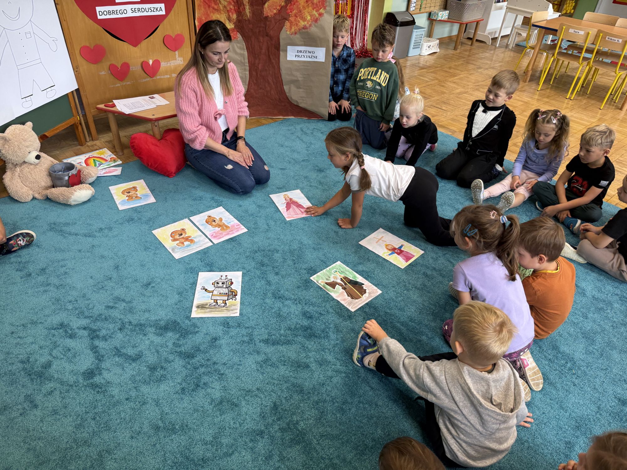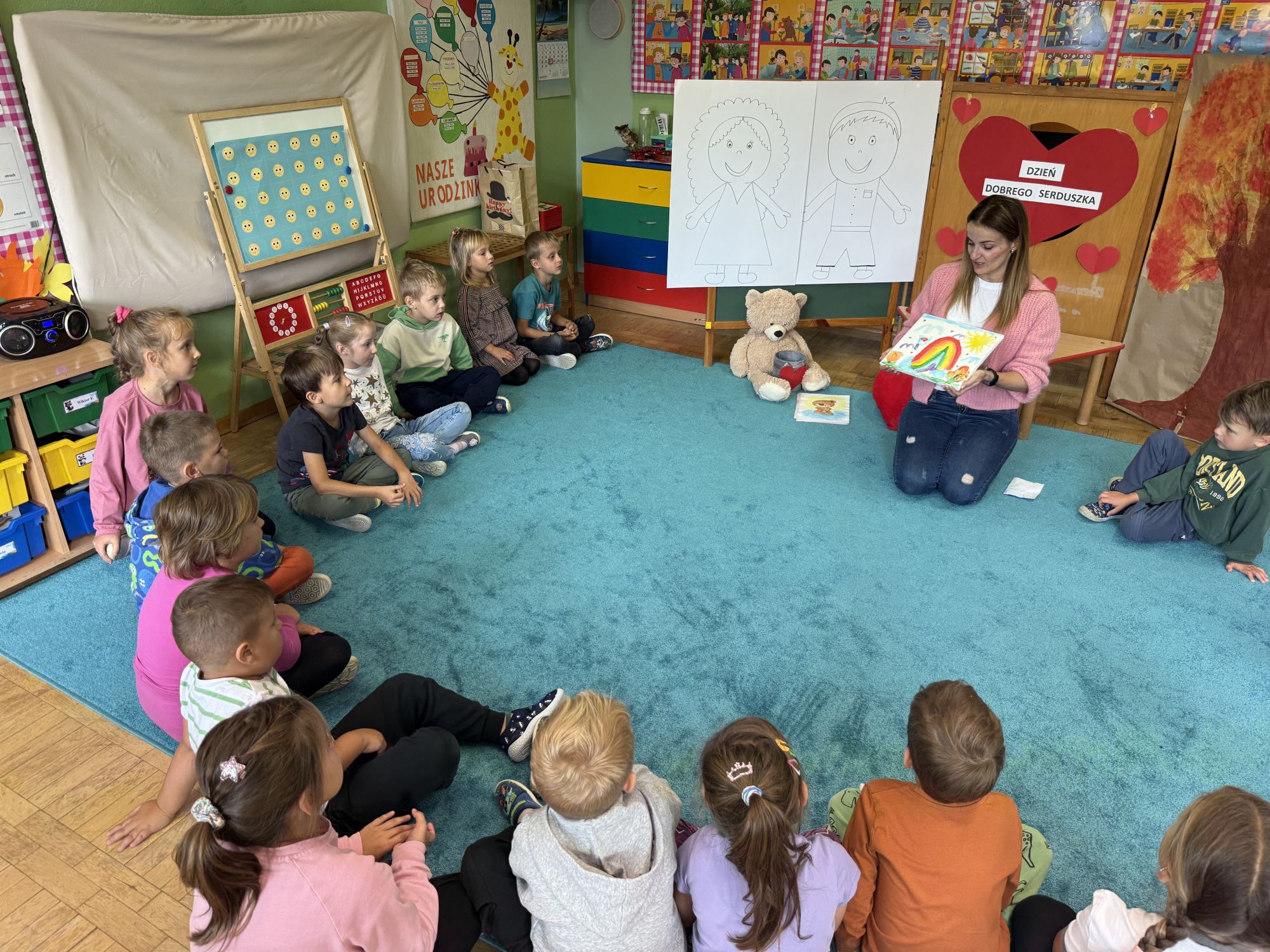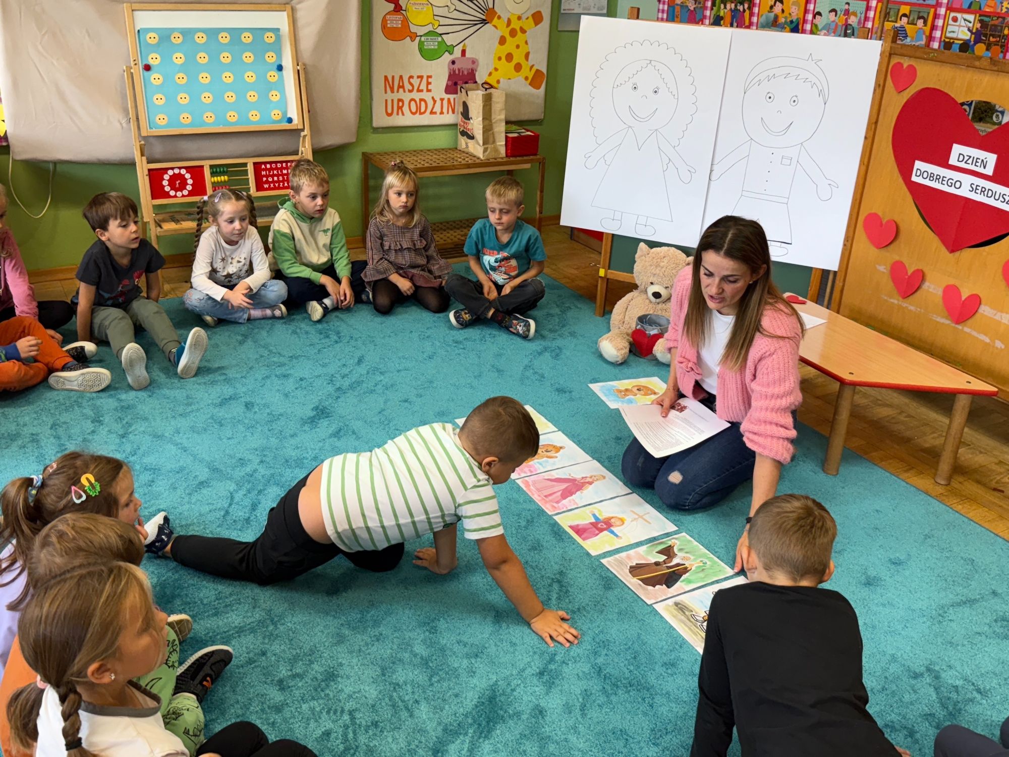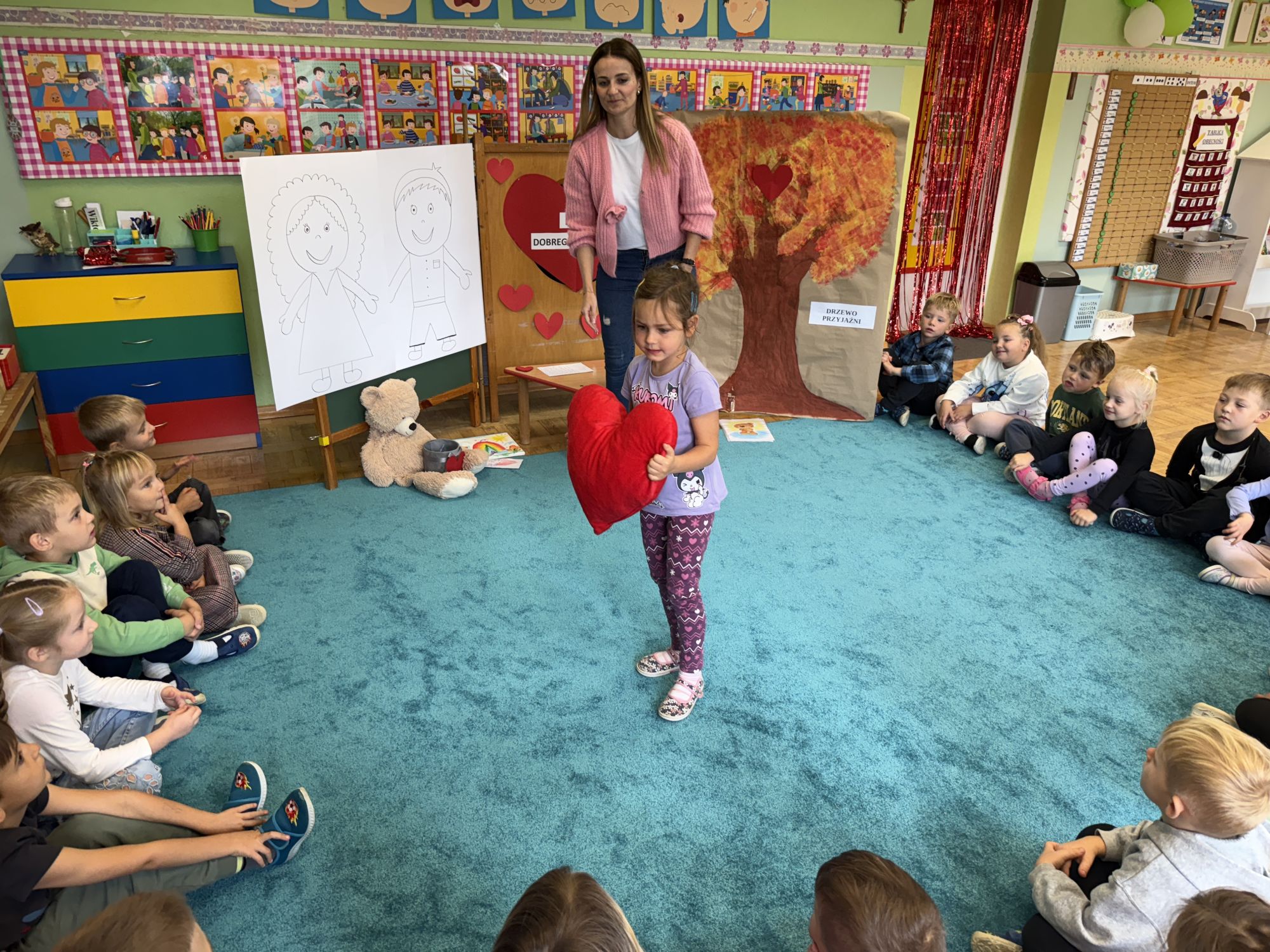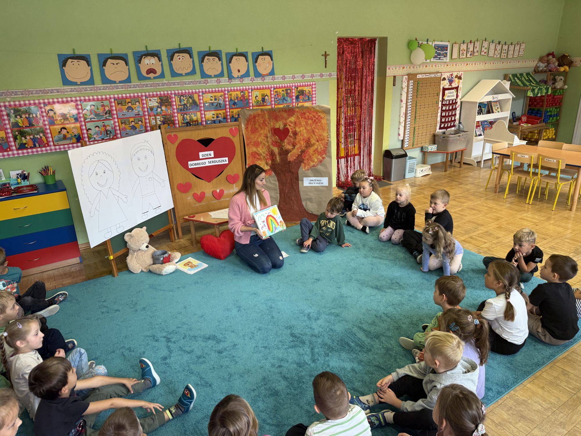 29 września w starszej grupie naszego przedszkola odbył się wyjątkowy dzień – „Dzień Dobrego Serduszka”, zorganizowany w ramach Tygodnia Dobrych Relacji. Była to okazja do rozmów, zabawy i wspólnej refleksji nad tym, co to znaczy mieć dobre serce i jak budować wartościowe przyjaźnie. Dzieci rozpoczęły zajęcia od burzy mózgów, podczas której wspólnie zastanawiały się, co oznacza bycie osobą o dobrym sercu. Następnie wysłuchały pięknej bajki pt. „Serduszko małego misia”. Opowieść stała się punktem wyjścia do rozmowy o miłości, przyjaźni i odwadze – wartościach szczególnie ważnych w codziennym życiu przedszkolaka. Aby lepiej zrozumieć treść bajki, dzieci ułożyły gałązkę logiczną, porządkując kolejno wydarzenia i ukazując ich sens. Nie zabrakło również aktywności rozwijających relacje rówieśnicze. Podczas zabawy „Wędrujące serduszko” dzieci mówiły sobie nawzajem coś miłego, ucząc się dostrzegać i doceniać innych. Odgrywały różne scenki dramowe, w których wyrażały emocje za pomocą ruchu i mimiki. Radosnym akcentem był udział w tańcach w parach oraz zabawach integrujących grupę. Szczególną atrakcją była praca plastyczna – dzieci w grupach kolorowały duże obrazki przedstawiające dziewczynkę i chłopca, a następnie rozmawiały o tym, jaki powinien być dobry kolega i dobra koleżanka. Dzięki temu mogły nie tylko rozwijać swoją kreatywność, ale także uświadomić sobie, jak ważne są pozytywne cechy w budowaniu przyjaźni. Powstało również niezwykłe Drzewo Przyjaźni – każde dziecko narysowało na serduszku siebie i swojego przyjaciela z grupy, a następnie zawiesiło je na wspólnym drzewie. Na zakończenie pełnego wrażeń dnia dzieci otrzymały wyjątkowe medale z napisem „Jestem dobrym kolegą/koleżanką”. Była to piękna nagroda za zaangażowanie, życzliwość i otwarte serca.