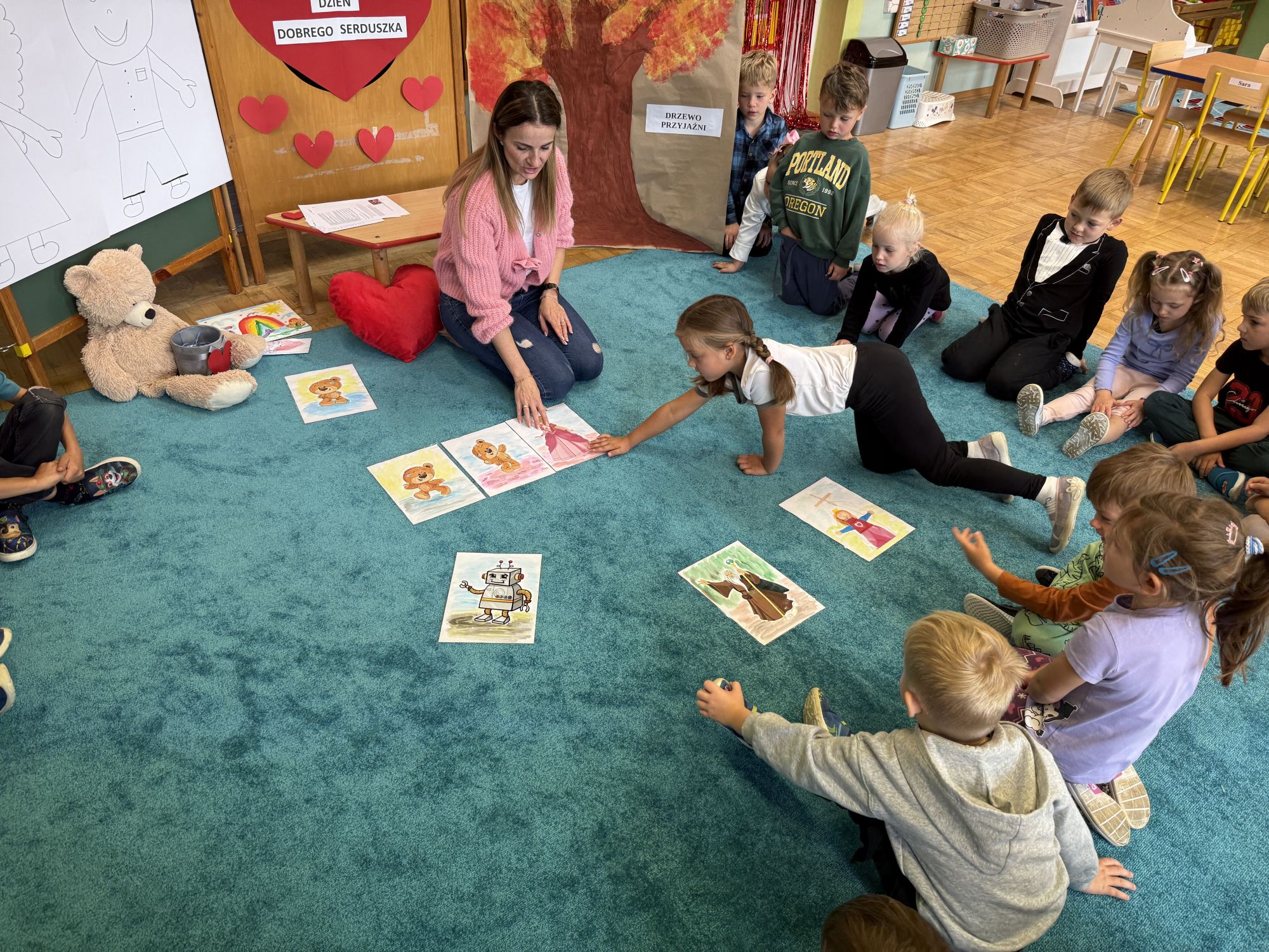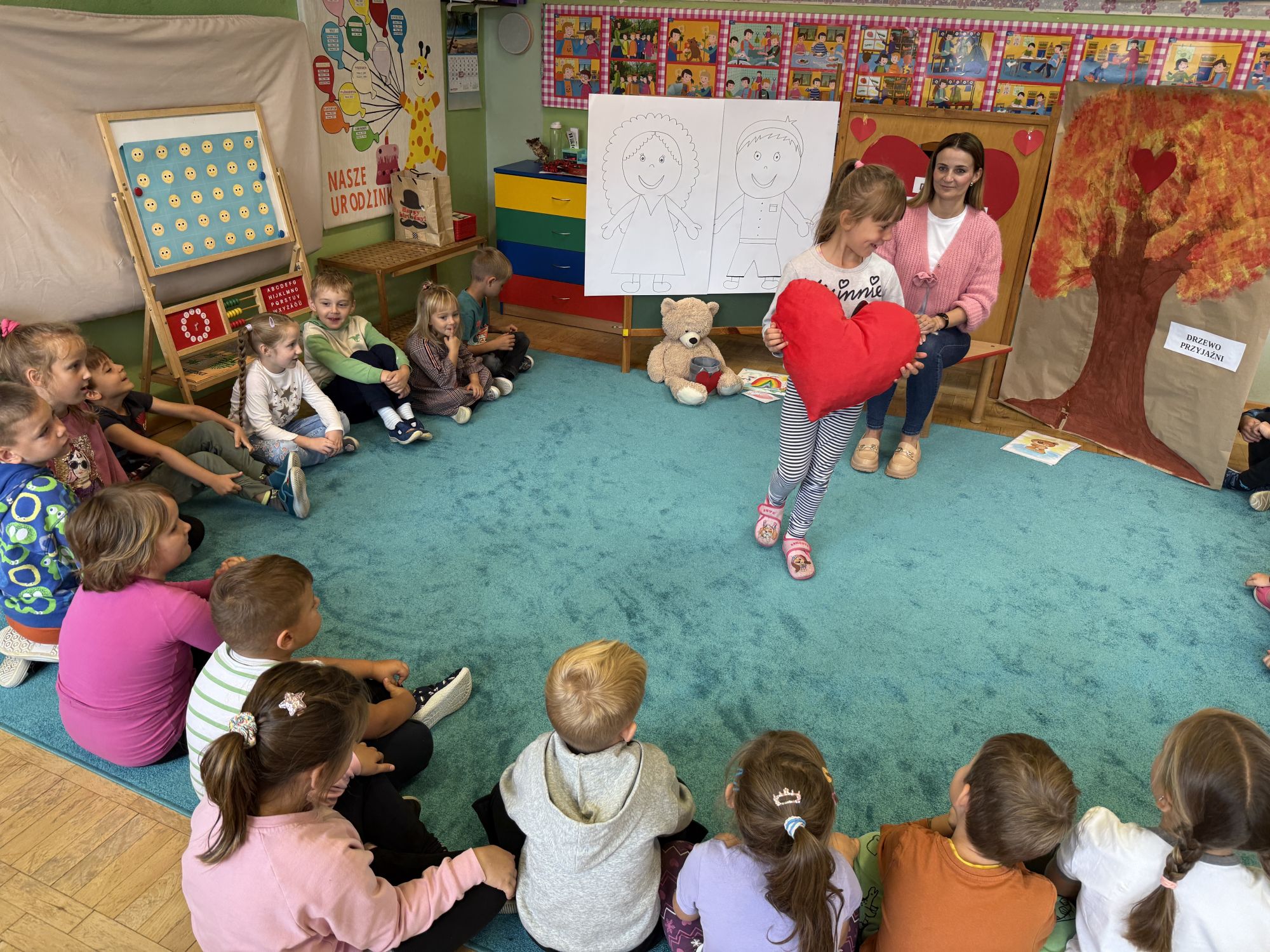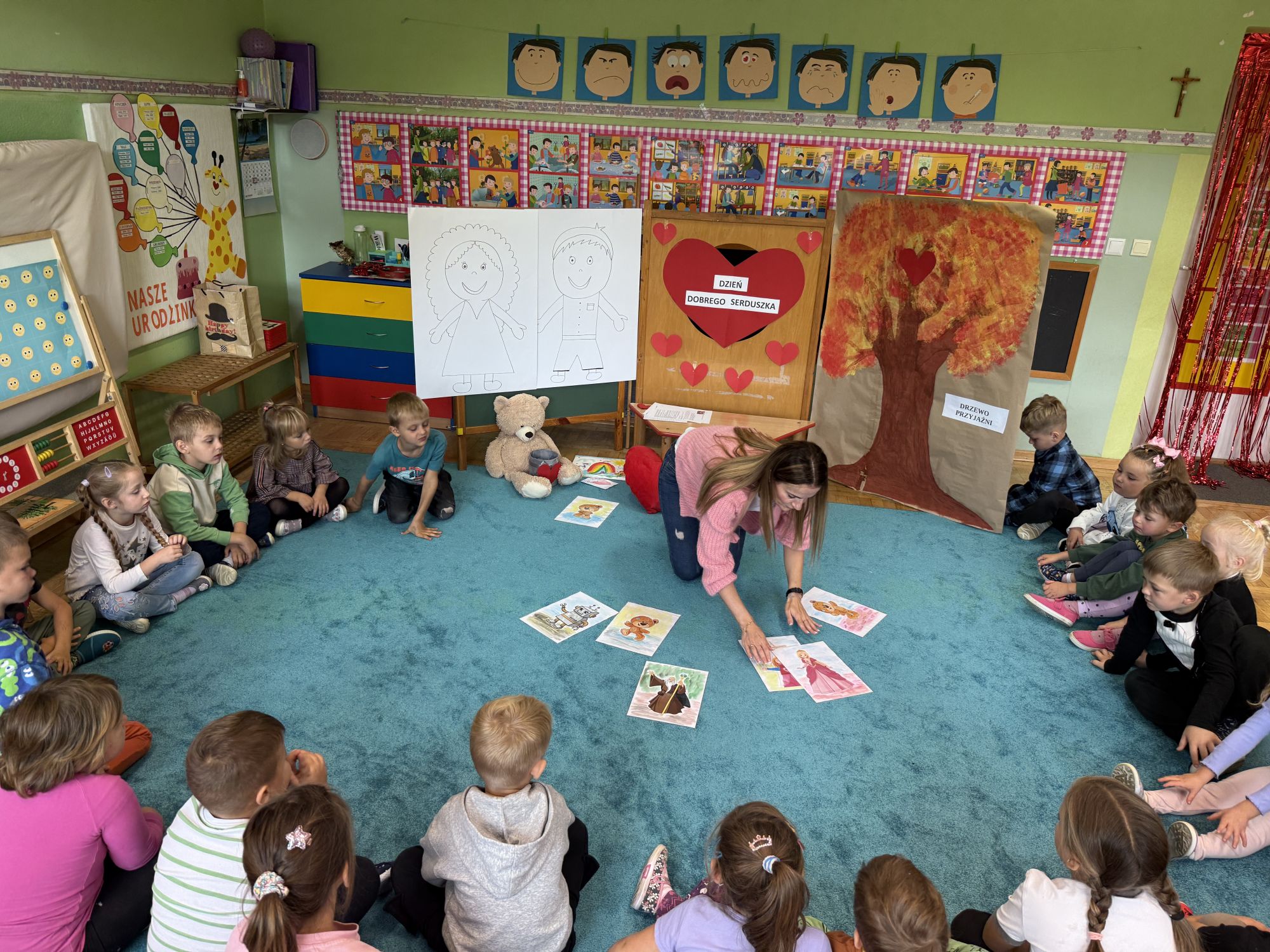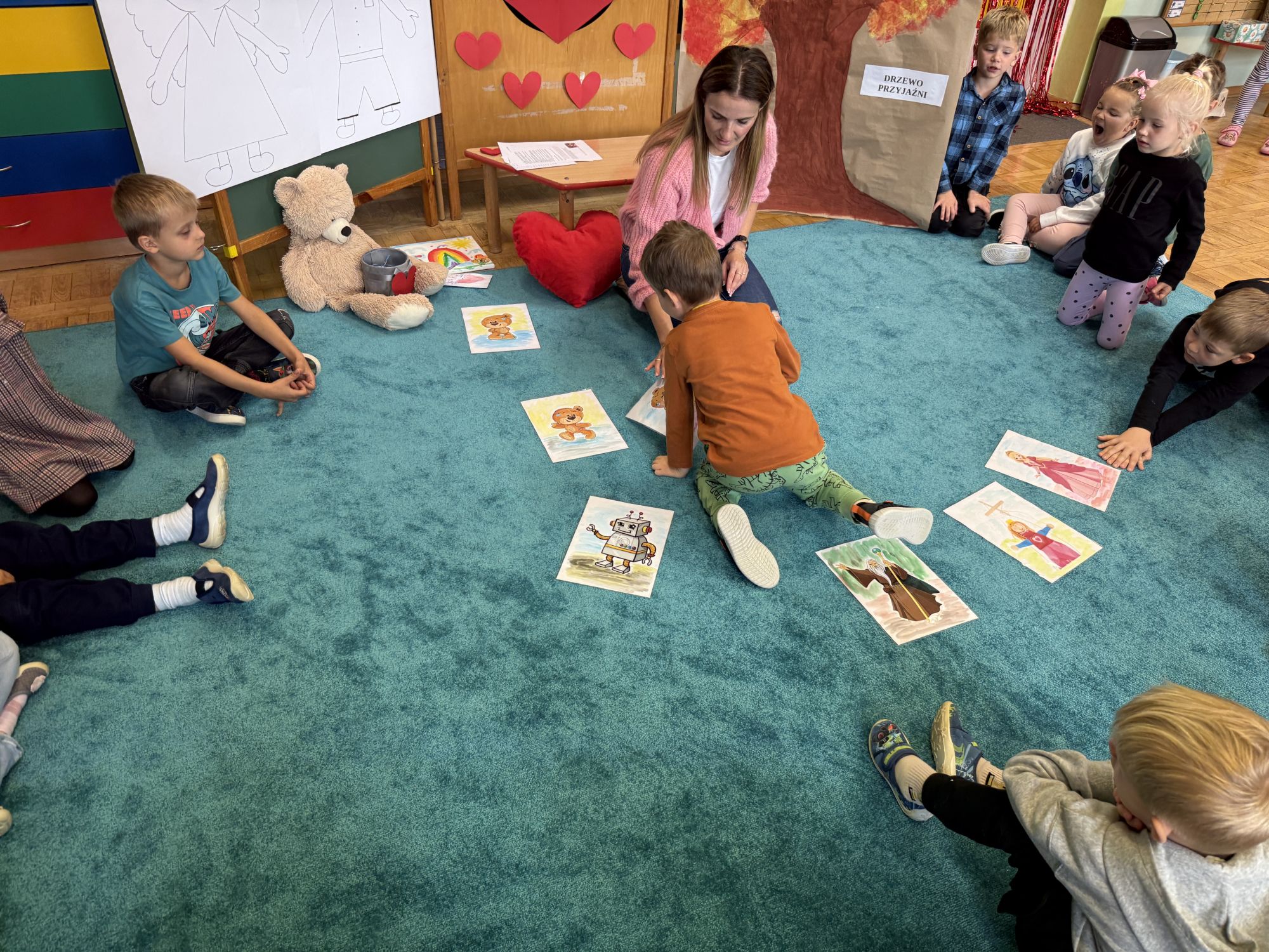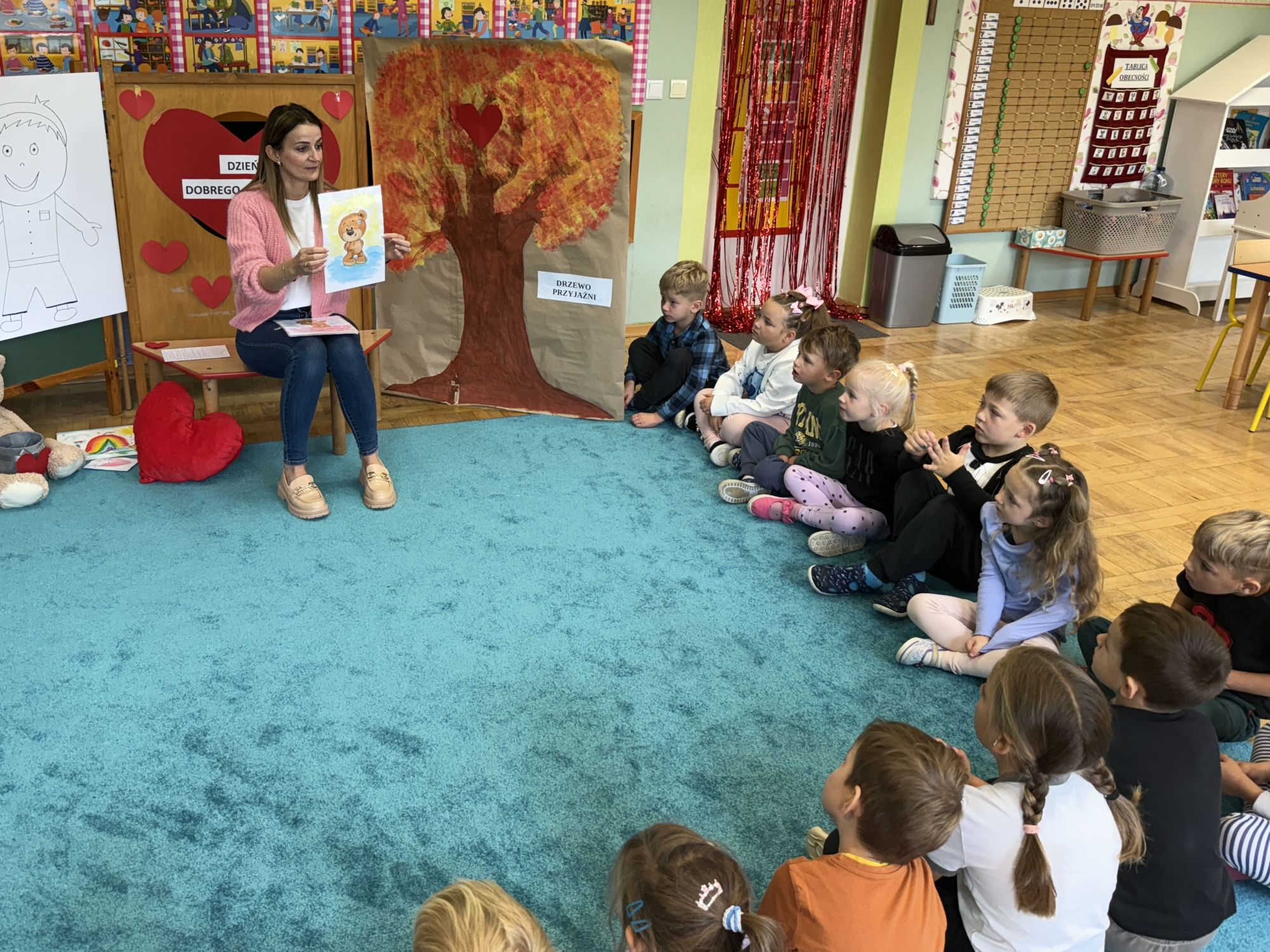 29 września w starszej grupie naszego przedszkola odbył się wyjątkowy dzień – „Dzień Dobrego Serduszka”, zorganizowany w ramach Tygodnia Dobrych Relacji. Była to okazja do rozmów, zabawy i wspólnej refleksji nad tym, co to znaczy mieć dobre serce i jak budować wartościowe przyjaźnie. Dzieci rozpoczęły zajęcia od burzy mózgów, podczas której wspólnie zastanawiały się, co oznacza bycie osobą o dobrym sercu. Następnie wysłuchały pięknej bajki pt. „Serduszko małego misia”. Opowieść stała się punktem wyjścia do rozmowy o miłości, przyjaźni i odwadze – wartościach szczególnie ważnych w codziennym życiu przedszkolaka. Aby lepiej zrozumieć treść bajki, dzieci ułożyły gałązkę logiczną, porządkując kolejno wydarzenia i ukazując ich sens. Nie zabrakło również aktywności rozwijających relacje rówieśnicze. Podczas zabawy „Wędrujące serduszko” dzieci mówiły sobie nawzajem coś miłego, ucząc się dostrzegać i doceniać innych. Odgrywały różne scenki dramowe, w których wyrażały emocje za pomocą ruchu i mimiki. Radosnym akcentem był udział w tańcach w parach oraz zabawach integrujących grupę. Szczególną atrakcją była praca plastyczna – dzieci w grupach kolorowały duże obrazki przedstawiające dziewczynkę i chłopca, a następnie rozmawiały o tym, jaki powinien być dobry kolega i dobra koleżanka. Dzięki temu mogły nie tylko rozwijać swoją kreatywność, ale także uświadomić sobie, jak ważne są pozytywne cechy w budowaniu przyjaźni. Powstało również niezwykłe Drzewo Przyjaźni – każde dziecko narysowało na serduszku siebie i swojego przyjaciela z grupy, a następnie zawiesiło je na wspólnym drzewie. Na zakończenie pełnego wrażeń dnia dzieci otrzymały wyjątkowe medale z napisem „Jestem dobrym kolegą/koleżanką”. Była to piękna nagroda za zaangażowanie, życzliwość i otwarte serca.