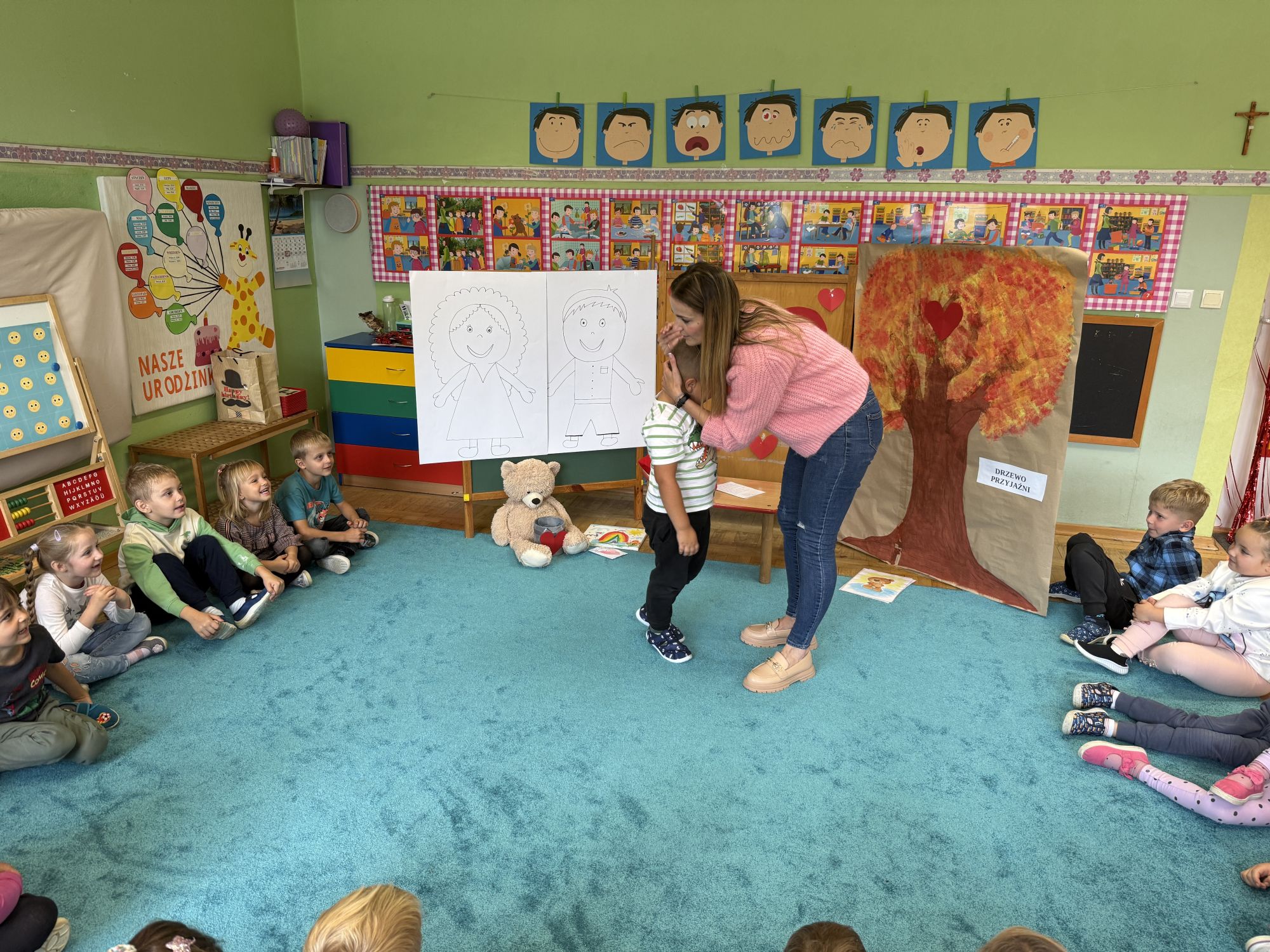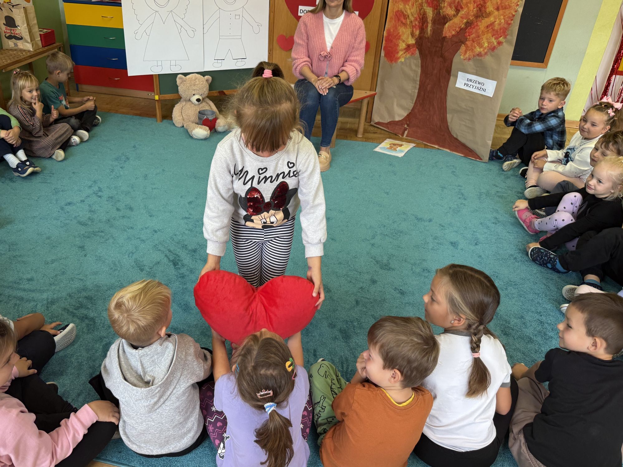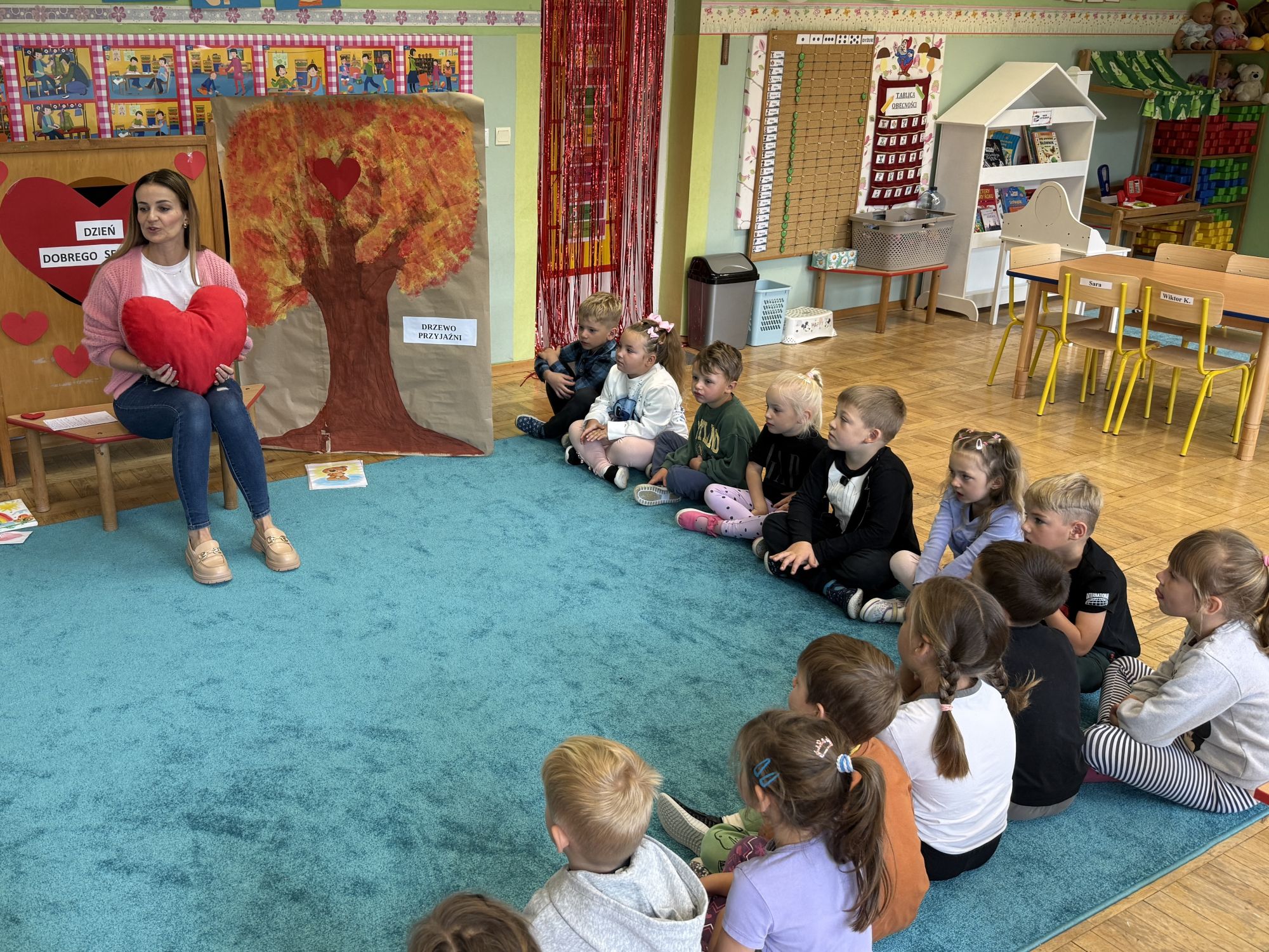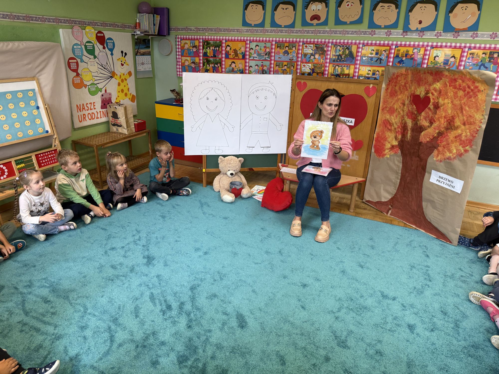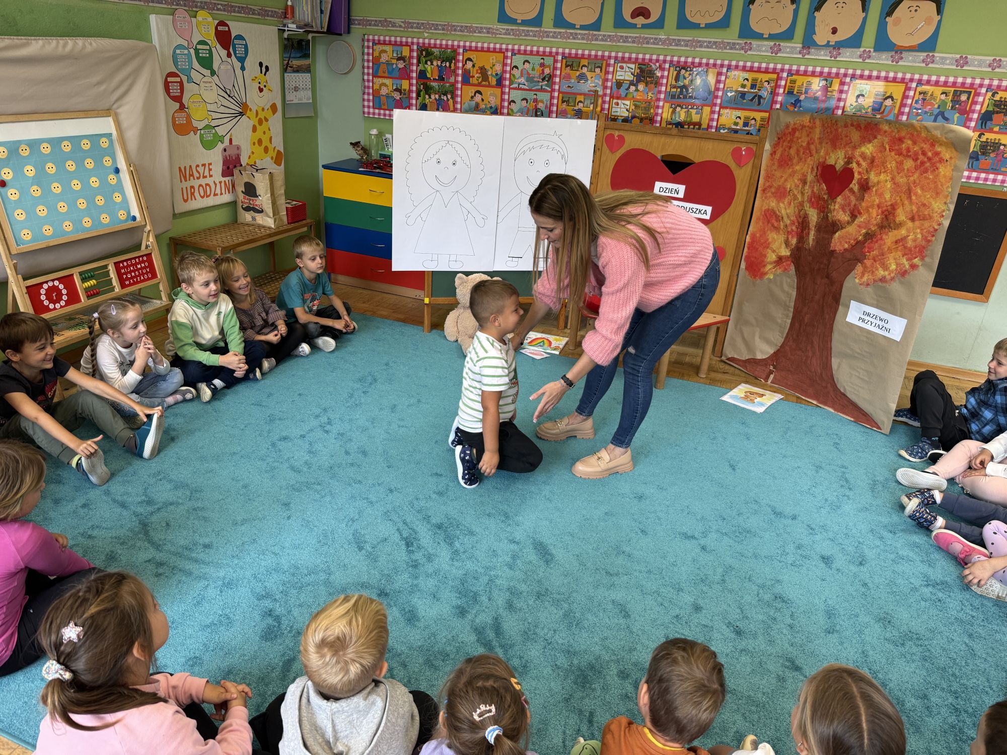 29 września w starszej grupie naszego przedszkola odbył się wyjątkowy dzień – „Dzień Dobrego Serduszka”, zorganizowany w ramach Tygodnia Dobrych Relacji. Była to okazja do rozmów, zabawy i wspólnej refleksji nad tym, co to znaczy mieć dobre serce i jak budować wartościowe przyjaźnie. Dzieci rozpoczęły zajęcia od burzy mózgów, podczas której wspólnie zastanawiały się, co oznacza bycie osobą o dobrym sercu. Następnie wysłuchały pięknej bajki pt. „Serduszko małego misia”. Opowieść stała się punktem wyjścia do rozmowy o miłości, przyjaźni i odwadze – wartościach szczególnie ważnych w codziennym życiu przedszkolaka. Aby lepiej zrozumieć treść bajki, dzieci ułożyły gałązkę logiczną, porządkując kolejno wydarzenia i ukazując ich sens. Nie zabrakło również aktywności rozwijających relacje rówieśnicze. Podczas zabawy „Wędrujące serduszko” dzieci mówiły sobie nawzajem coś miłego, ucząc się dostrzegać i doceniać innych. Odgrywały różne scenki dramowe, w których wyrażały emocje za pomocą ruchu i mimiki. Radosnym akcentem był udział w tańcach w parach oraz zabawach integrujących grupę. Szczególną atrakcją była praca plastyczna – dzieci w grupach kolorowały duże obrazki przedstawiające dziewczynkę i chłopca, a następnie rozmawiały o tym, jaki powinien być dobry kolega i dobra koleżanka. Dzięki temu mogły nie tylko rozwijać swoją kreatywność, ale także uświadomić sobie, jak ważne są pozytywne cechy w budowaniu przyjaźni. Powstało również niezwykłe Drzewo Przyjaźni – każde dziecko narysowało na serduszku siebie i swojego przyjaciela z grupy, a następnie zawiesiło je na wspólnym drzewie. Na zakończenie pełnego wrażeń dnia dzieci otrzymały wyjątkowe medale z napisem „Jestem dobrym kolegą/koleżanką”. Była to piękna nagroda za zaangażowanie, życzliwość i otwarte serca.