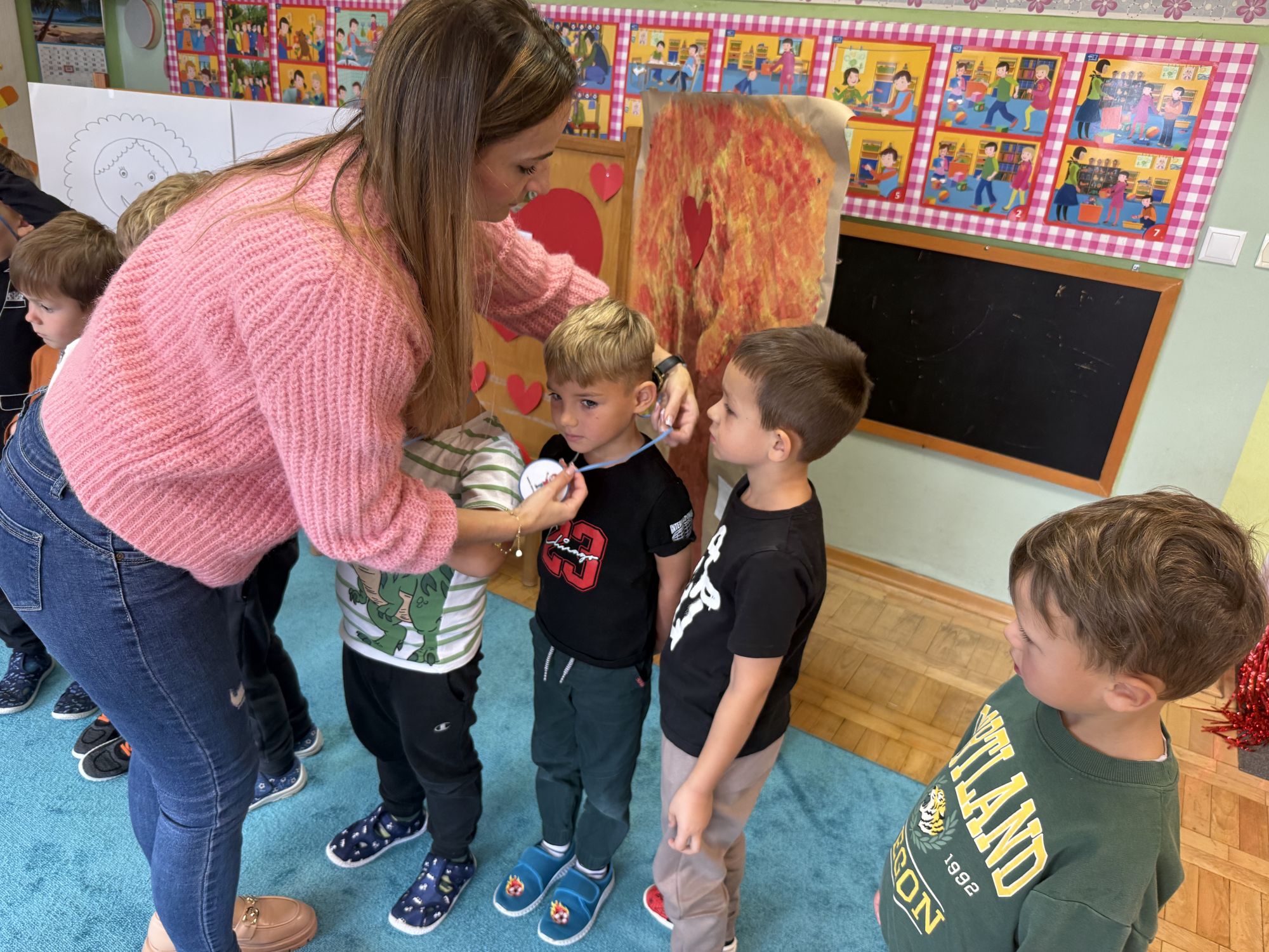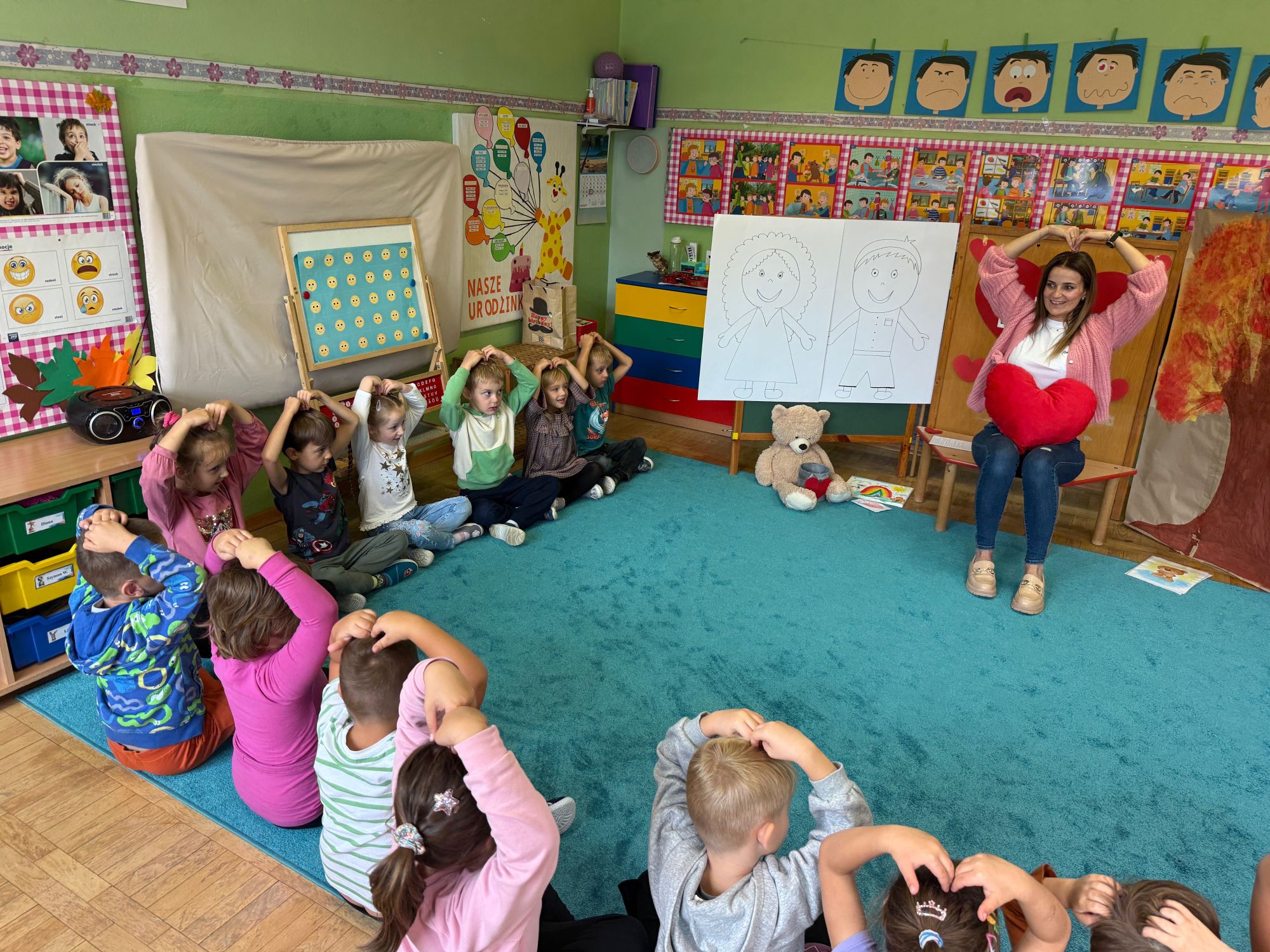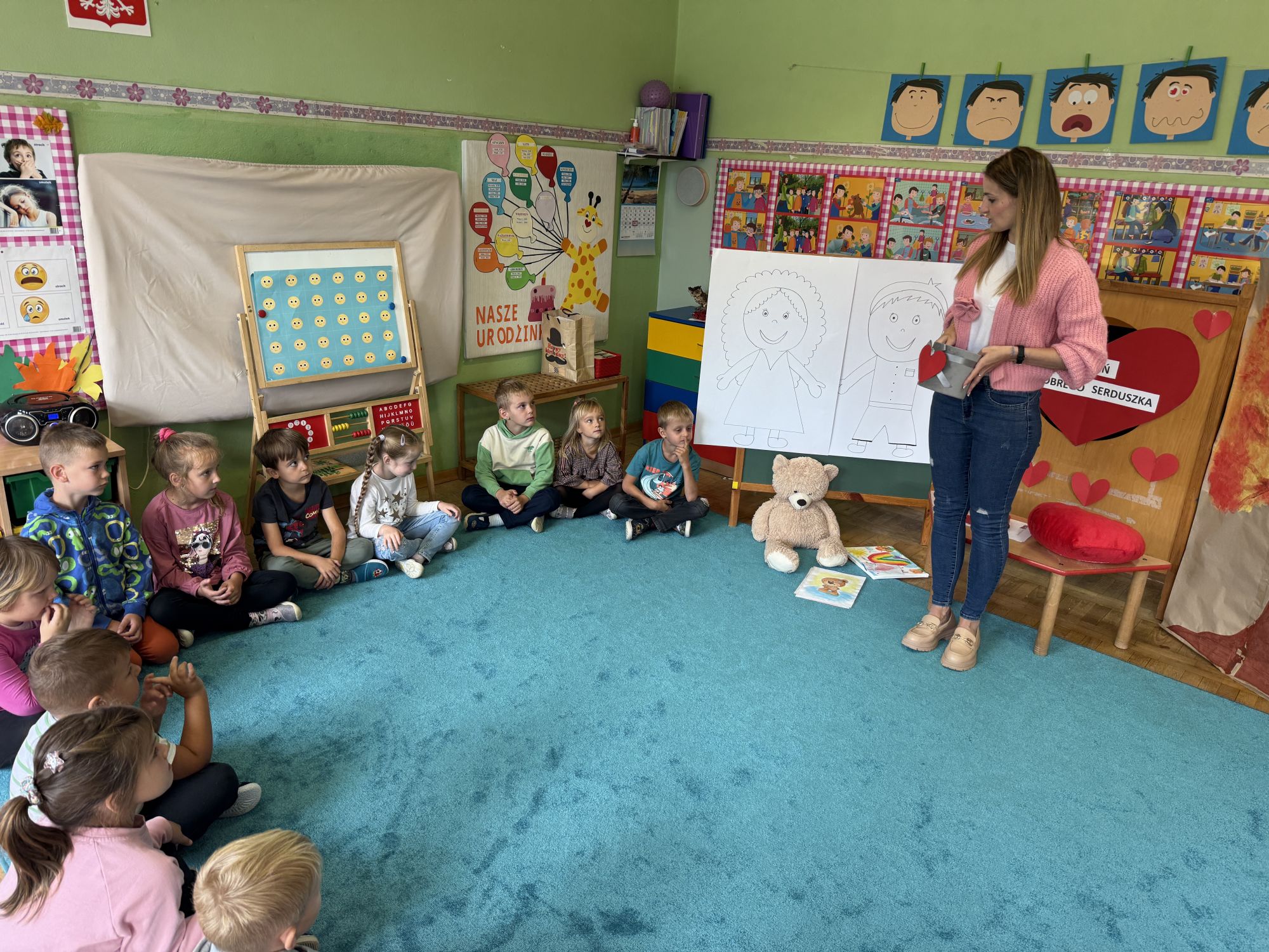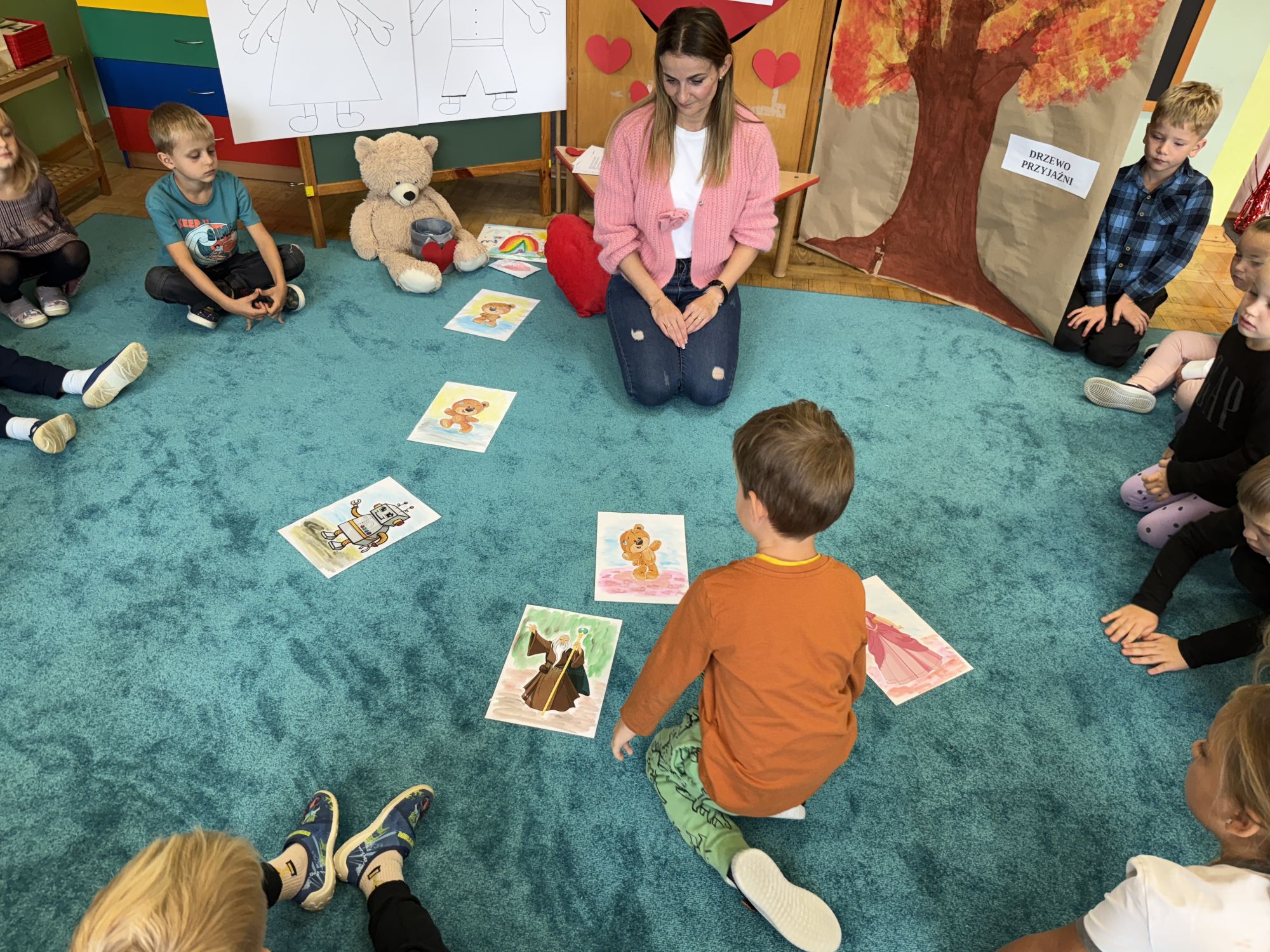 29 września w starszej grupie naszego przedszkola odbył się wyjątkowy dzień – „Dzień Dobrego Serduszka”, zorganizowany w ramach Tygodnia Dobrych Relacji. Była to okazja do rozmów, zabawy i wspólnej refleksji nad tym, co to znaczy mieć dobre serce i jak budować wartościowe przyjaźnie. Dzieci rozpoczęły zajęcia od burzy mózgów, podczas której wspólnie zastanawiały się, co oznacza bycie osobą o dobrym sercu. Następnie wysłuchały pięknej bajki pt. „Serduszko małego misia”. Opowieść stała się punktem wyjścia do rozmowy o miłości, przyjaźni i odwadze – wartościach szczególnie ważnych w codziennym życiu przedszkolaka. Aby lepiej zrozumieć treść bajki, dzieci ułożyły gałązkę logiczną, porządkując kolejno wydarzenia i ukazując ich sens. Nie zabrakło również aktywności rozwijających relacje rówieśnicze. Podczas zabawy „Wędrujące serduszko” dzieci mówiły sobie nawzajem coś miłego, ucząc się dostrzegać i doceniać innych. Odgrywały różne scenki dramowe, w których wyrażały emocje za pomocą ruchu i mimiki. Radosnym akcentem był udział w tańcach w parach oraz zabawach integrujących grupę. Szczególną atrakcją była praca plastyczna – dzieci w grupach kolorowały duże obrazki przedstawiające dziewczynkę i chłopca, a następnie rozmawiały o tym, jaki powinien być dobry kolega i dobra koleżanka. Dzięki temu mogły nie tylko rozwijać swoją kreatywność, ale także uświadomić sobie, jak ważne są pozytywne cechy w budowaniu przyjaźni. Powstało również niezwykłe Drzewo Przyjaźni – każde dziecko narysowało na serduszku siebie i swojego przyjaciela z grupy, a następnie zawiesiło je na wspólnym drzewie. Na zakończenie pełnego wrażeń dnia dzieci otrzymały wyjątkowe medale z napisem „Jestem dobrym kolegą/koleżanką”. Była to piękna nagroda za zaangażowanie, życzliwość i otwarte serca.