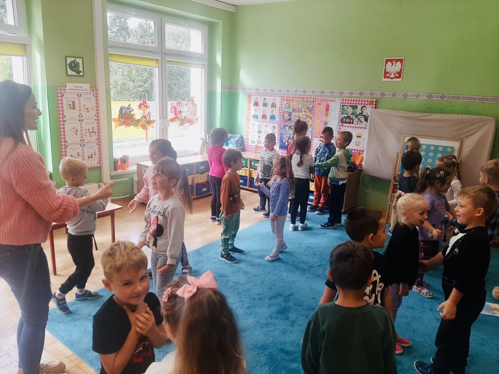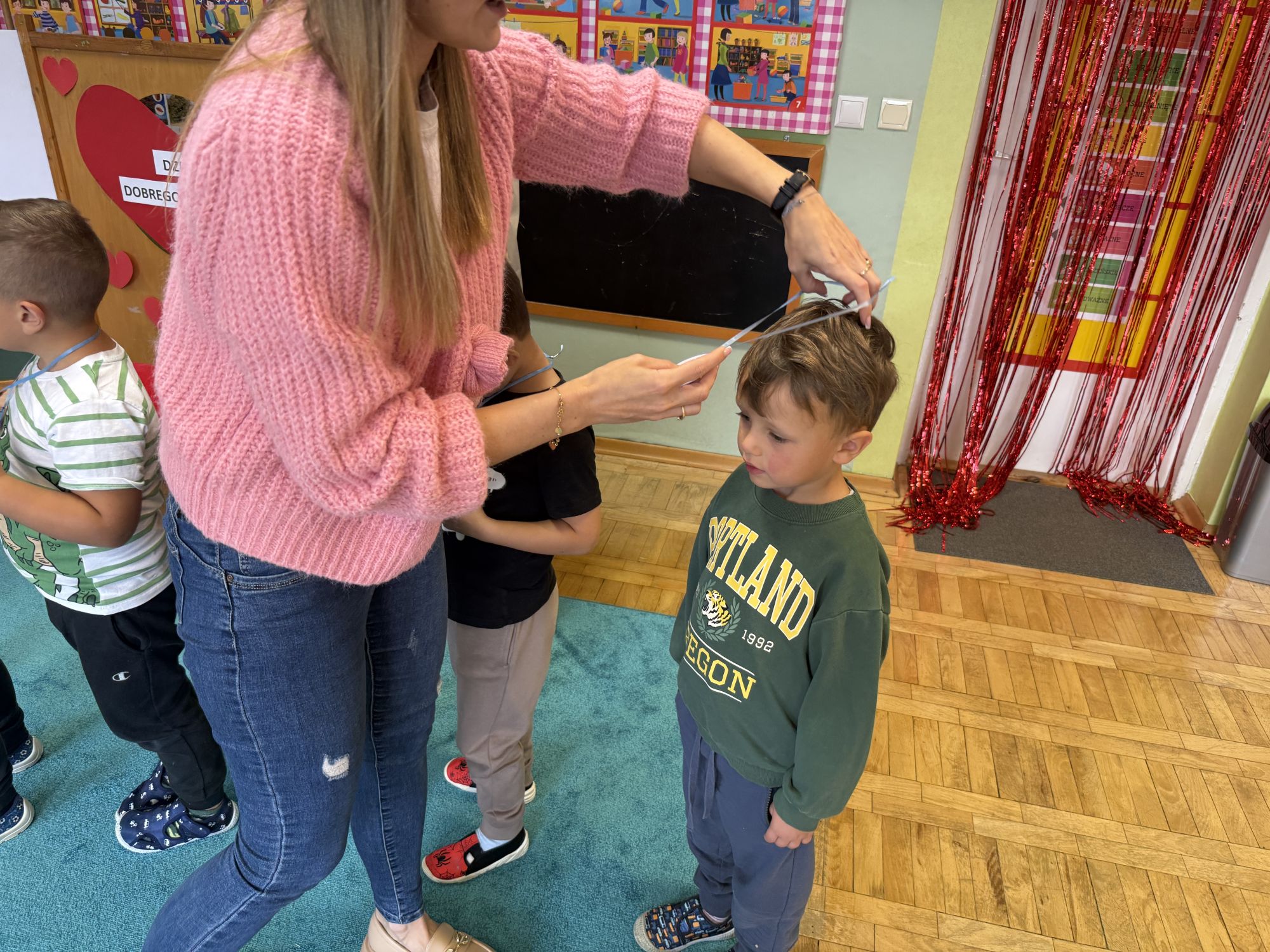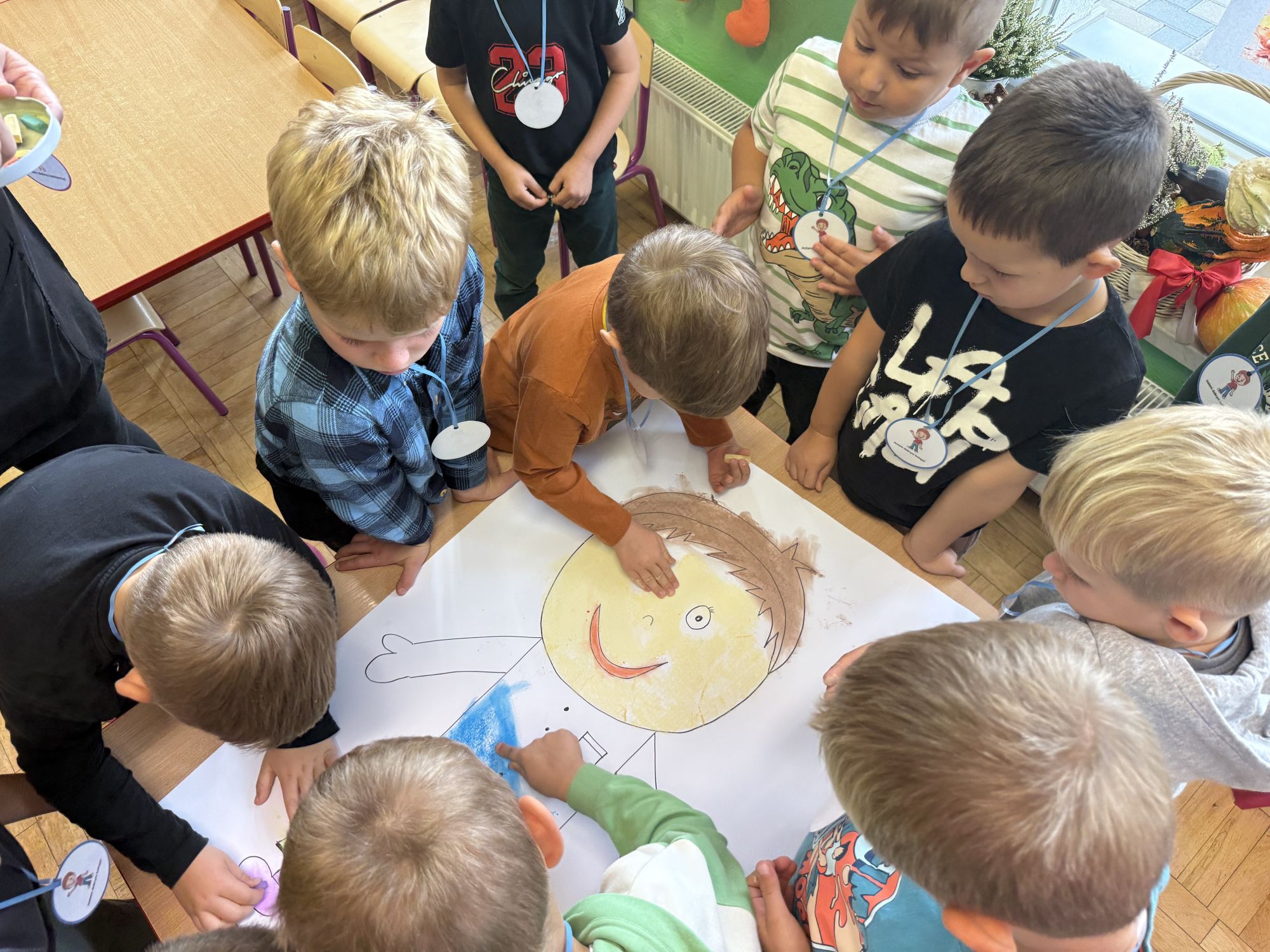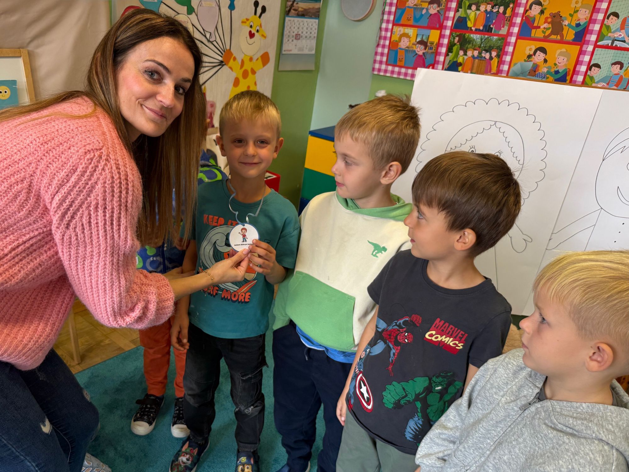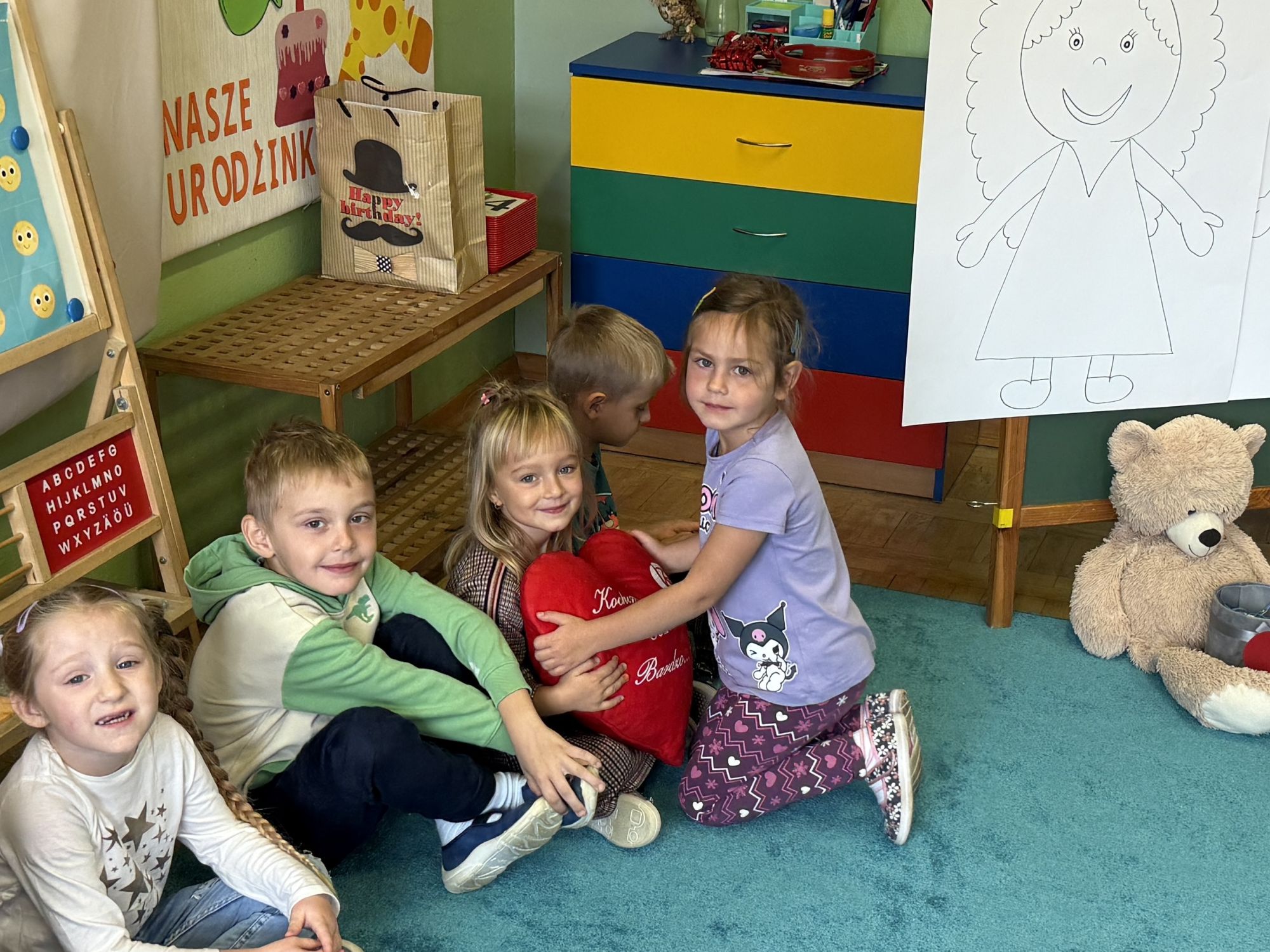 29 września w starszej grupie naszego przedszkola odbył się wyjątkowy dzień – „Dzień Dobrego Serduszka”, zorganizowany w ramach Tygodnia Dobrych Relacji. Była to okazja do rozmów, zabawy i wspólnej refleksji nad tym, co to znaczy mieć dobre serce i jak budować wartościowe przyjaźnie. Dzieci rozpoczęły zajęcia od burzy mózgów, podczas której wspólnie zastanawiały się, co oznacza bycie osobą o dobrym sercu. Następnie wysłuchały pięknej bajki pt. „Serduszko małego misia”. Opowieść stała się punktem wyjścia do rozmowy o miłości, przyjaźni i odwadze – wartościach szczególnie ważnych w codziennym życiu przedszkolaka. Aby lepiej zrozumieć treść bajki, dzieci ułożyły gałązkę logiczną, porządkując kolejno wydarzenia i ukazując ich sens. Nie zabrakło również aktywności rozwijających relacje rówieśnicze. Podczas zabawy „Wędrujące serduszko” dzieci mówiły sobie nawzajem coś miłego, ucząc się dostrzegać i doceniać innych. Odgrywały różne scenki dramowe, w których wyrażały emocje za pomocą ruchu i mimiki. Radosnym akcentem był udział w tańcach w parach oraz zabawach integrujących grupę. Szczególną atrakcją była praca plastyczna – dzieci w grupach kolorowały duże obrazki przedstawiające dziewczynkę i chłopca, a następnie rozmawiały o tym, jaki powinien być dobry kolega i dobra koleżanka. Dzięki temu mogły nie tylko rozwijać swoją kreatywność, ale także uświadomić sobie, jak ważne są pozytywne cechy w budowaniu przyjaźni. Powstało również niezwykłe Drzewo Przyjaźni – każde dziecko narysowało na serduszku siebie i swojego przyjaciela z grupy, a następnie zawiesiło je na wspólnym drzewie. Na zakończenie pełnego wrażeń dnia dzieci otrzymały wyjątkowe medale z napisem „Jestem dobrym kolegą/koleżanką”. Była to piękna nagroda za zaangażowanie, życzliwość i otwarte serca.