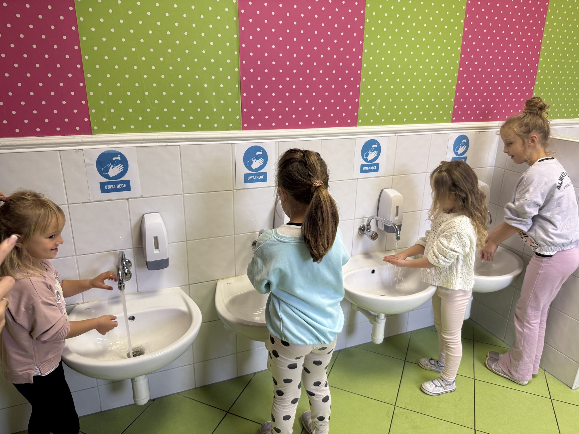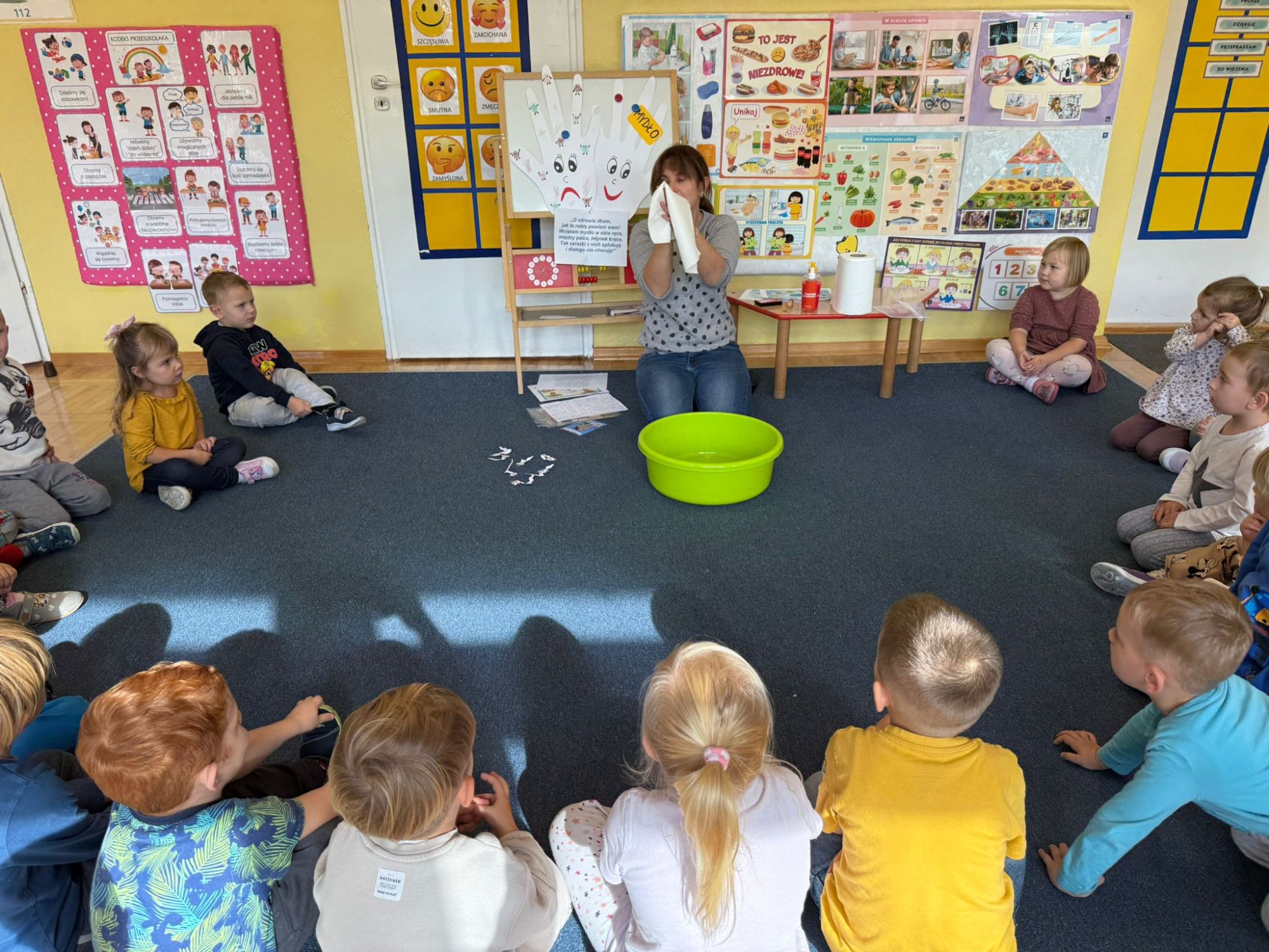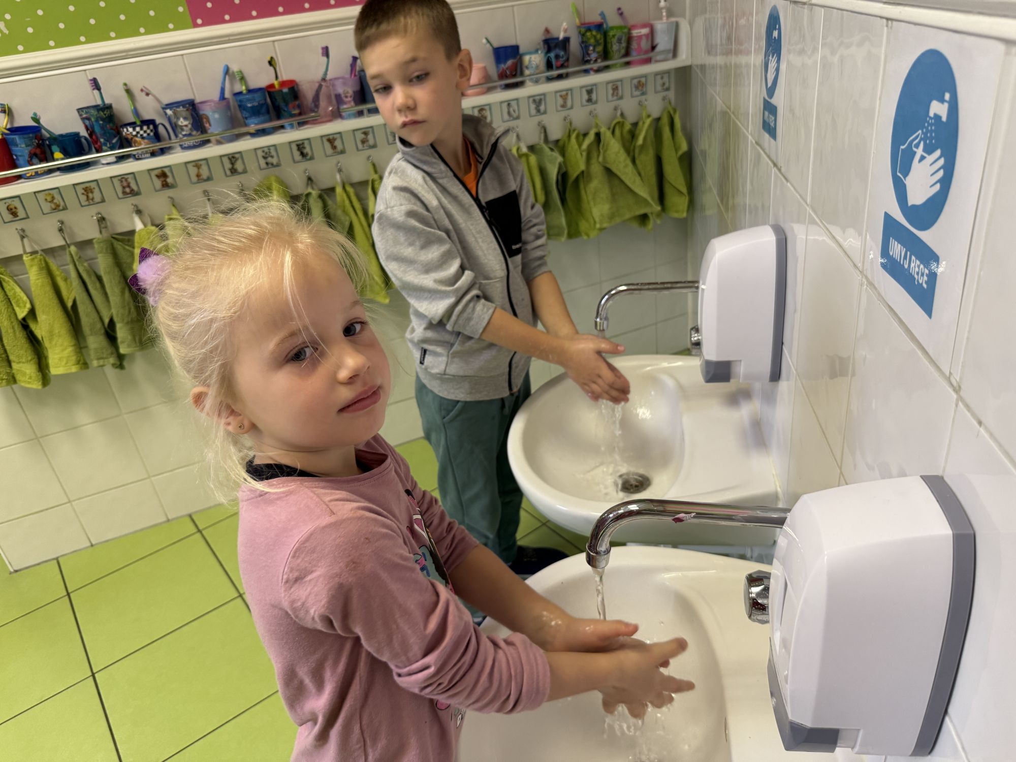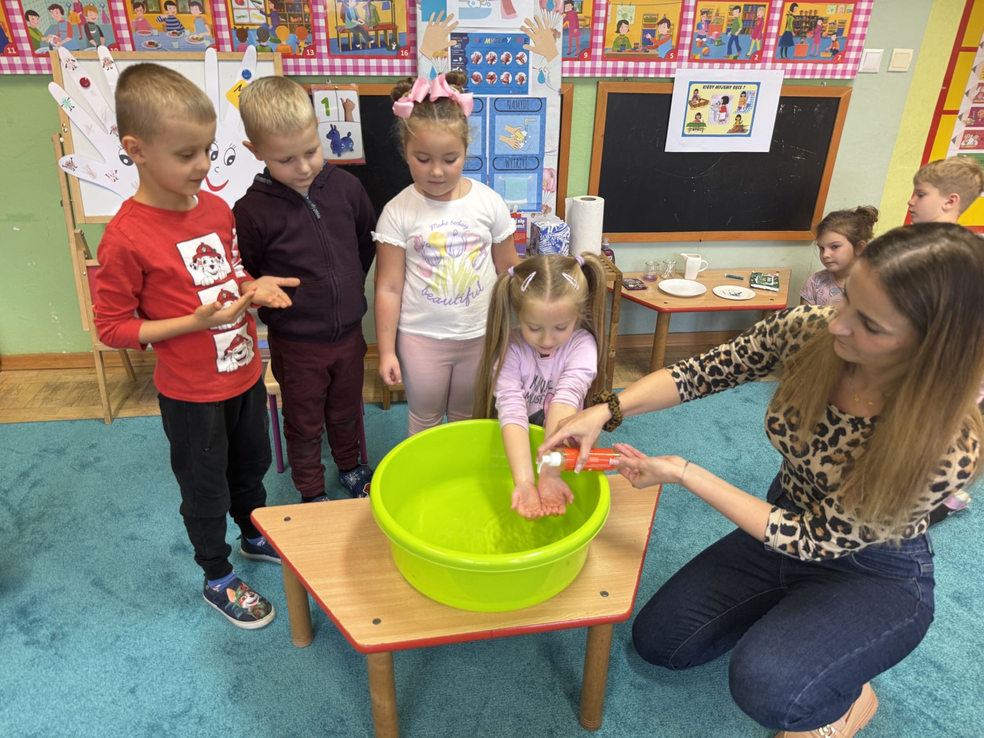 Nasze Przedszkole kolejny raz zrealizowało program Przedszkole Bez Owsików, który stał się integralną cześcia obchodzonego 15 października, Światowego Dnia Mycia Rąk. Celem programu jest kształtowanie odpowiednich nawyków w zakresie dbania o czystość rąk wśród dzieci. Przedszkolaki wzięły udział w zajęciach edukacyjnych, które w ciekawy i zrozumiały sposób pokazały, jak ważne jest dbanie o czyste ręce w kontekście naszego zdrowia. Wychowankowie na samym początku odpowiadały na pytanie: do jakich czynności służą nam ręce? Obejrzały prezentację multimedialną, ukazującą proces zarażania się owsikami oraz zasady, których należy przestrzegać, aby owsiki się nie rozpowszechniały. Następnie utrwaliły technikę prawidłowego mycia rąk poprzez udział w zabawie, miały zadanie zmycia różnymi sposobami brokatu z dłoni. Po wielu próbach okazało się, że najlepszym, rozwiązaniem pozbycia się brokatu jest umycie rąk mydłem. Kolejnym eksperymentem było doświadczenie z pieprzem i mydłem. To prosta demonstracja pokazująca, jak mydło działa w walce z zarazkami, wizualizując efekt jego działania poprzez "uciekanie" pieprzu na brzegi miski. Doświadczenie pokazuje, jak mydło pomaga pozbyć się brudu i bakterii. Na zakończenie zajęć, przedszkolaki, pokolorowały obrazki.