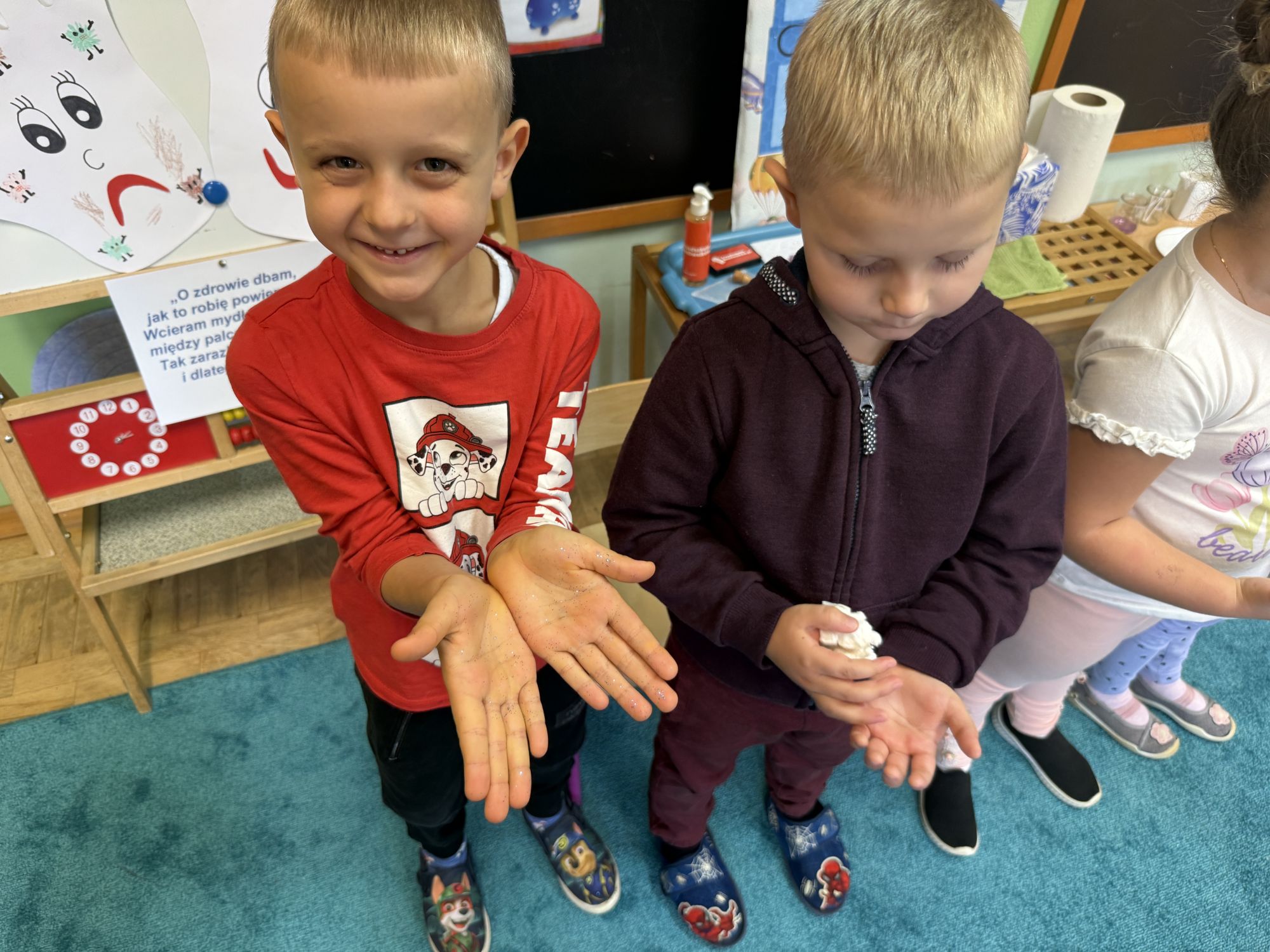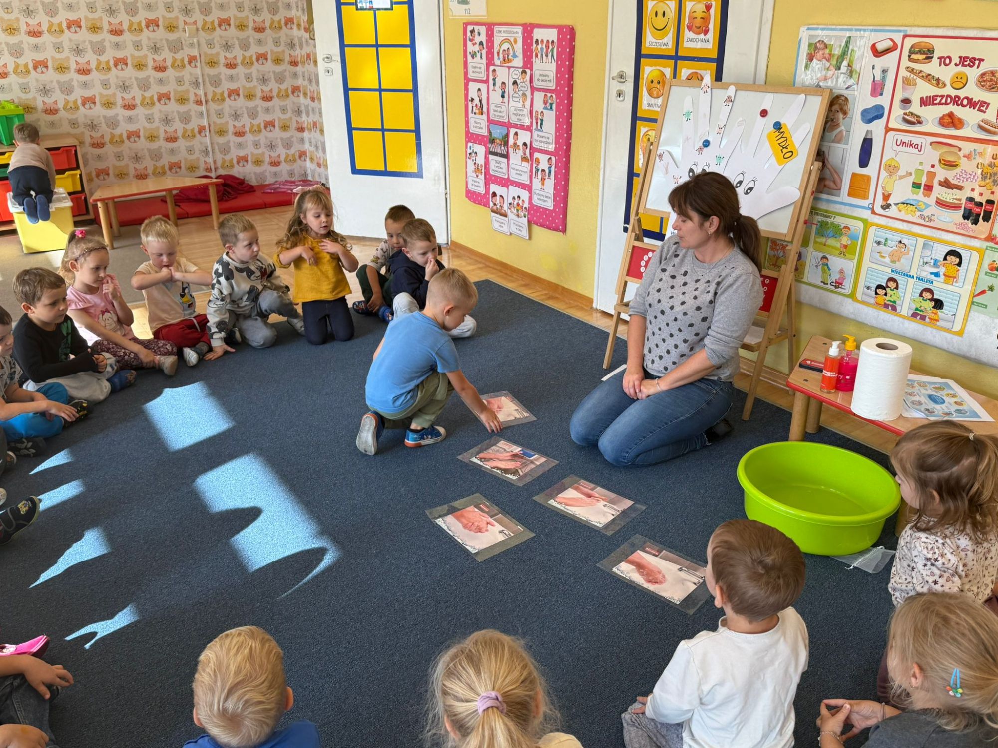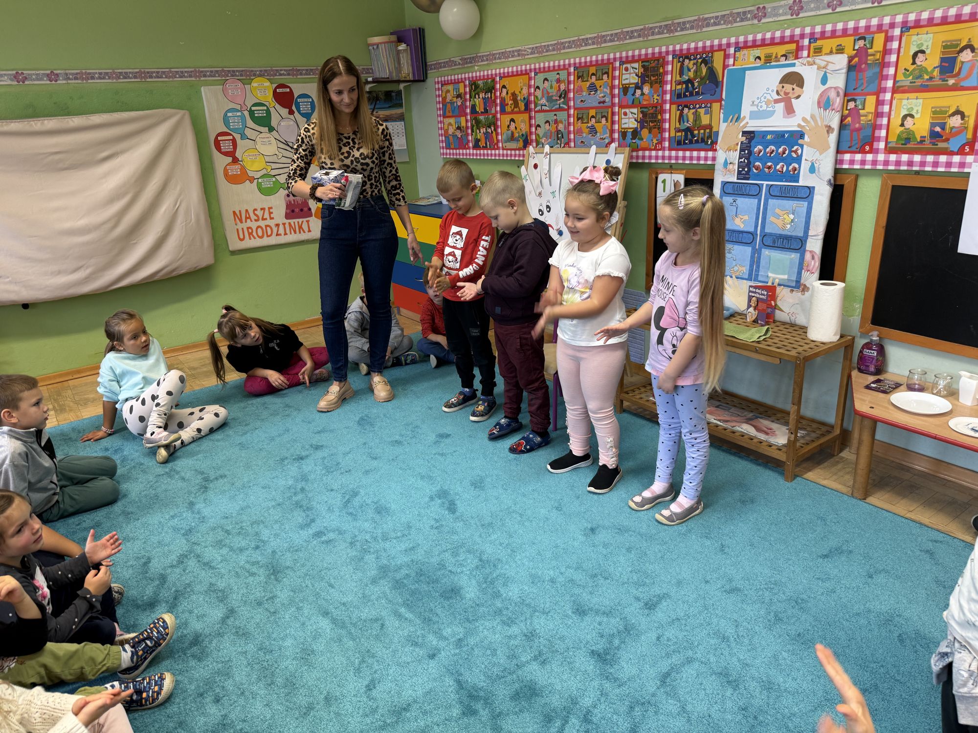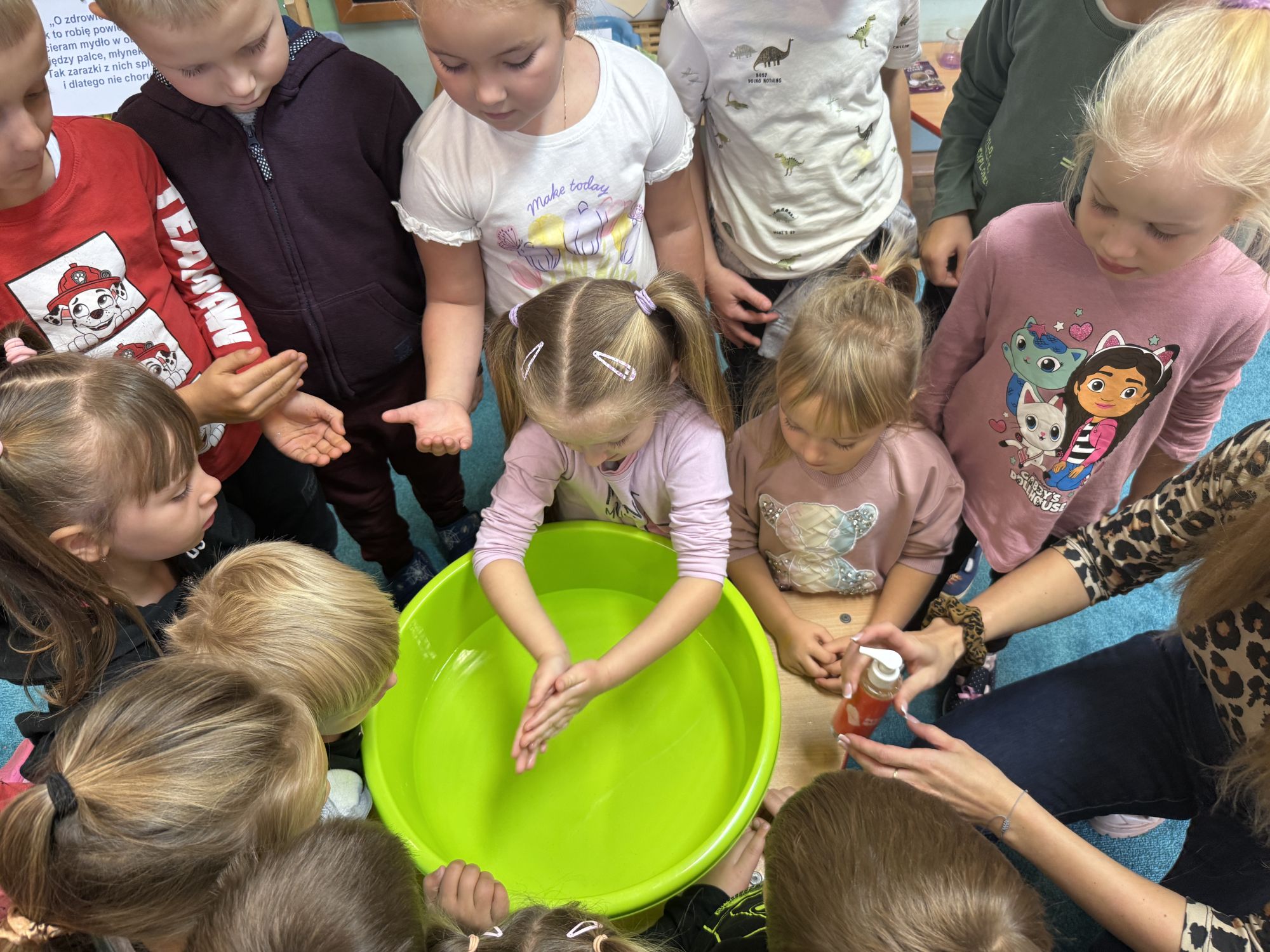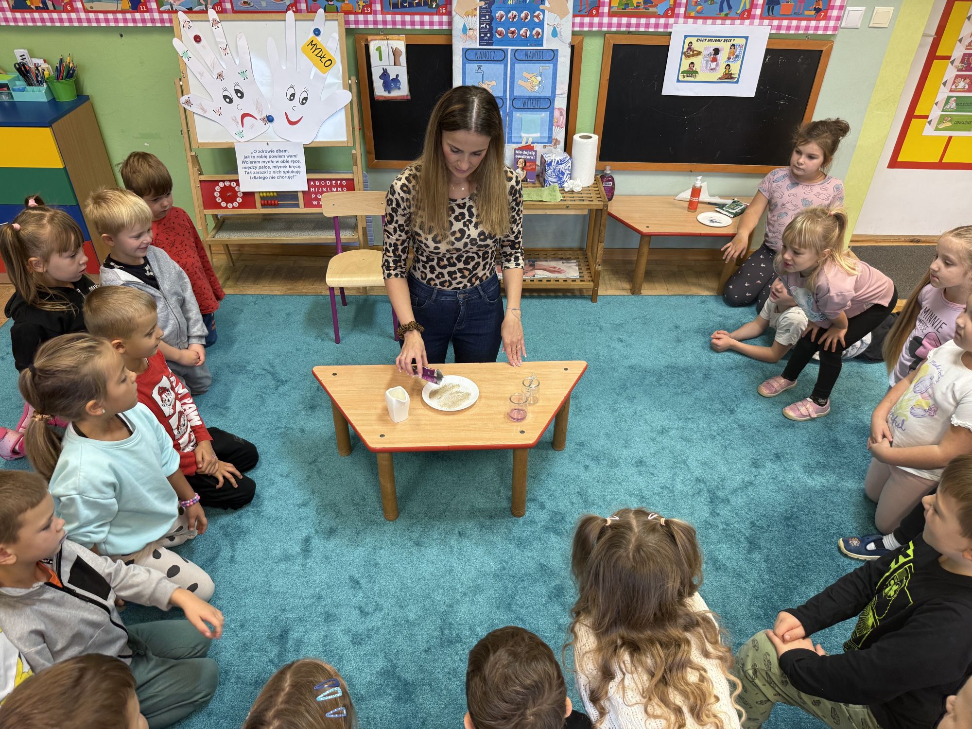 Nasze Przedszkole kolejny raz zrealizowało program Przedszkole Bez Owsików, który stał się integralną cześcia obchodzonego 15 października, Światowego Dnia Mycia Rąk. Celem programu jest kształtowanie odpowiednich nawyków w zakresie dbania o czystość rąk wśród dzieci. Przedszkolaki wzięły udział w zajęciach edukacyjnych, które w ciekawy i zrozumiały sposób pokazały, jak ważne jest dbanie o czyste ręce w kontekście naszego zdrowia. Wychowankowie na samym początku odpowiadały na pytanie: do jakich czynności służą nam ręce? Obejrzały prezentację multimedialną, ukazującą proces zarażania się owsikami oraz zasady, których należy przestrzegać, aby owsiki się nie rozpowszechniały. Następnie utrwaliły technikę prawidłowego mycia rąk poprzez udział w zabawie, miały zadanie zmycia różnymi sposobami brokatu z dłoni. Po wielu próbach okazało się, że najlepszym, rozwiązaniem pozbycia się brokatu jest umycie rąk mydłem. Kolejnym eksperymentem było doświadczenie z pieprzem i mydłem. To prosta demonstracja pokazująca, jak mydło działa w walce z zarazkami, wizualizując efekt jego działania poprzez "uciekanie" pieprzu na brzegi miski. Doświadczenie pokazuje, jak mydło pomaga pozbyć się brudu i bakterii. Na zakończenie zajęć, przedszkolaki, pokolorowały obrazki.
