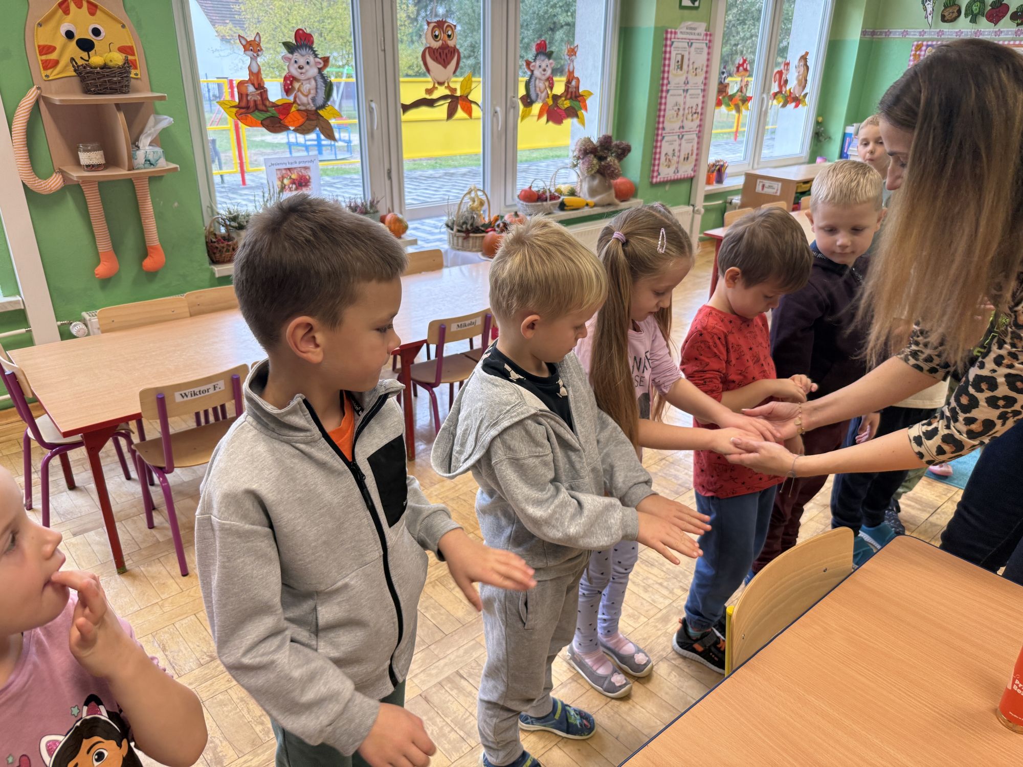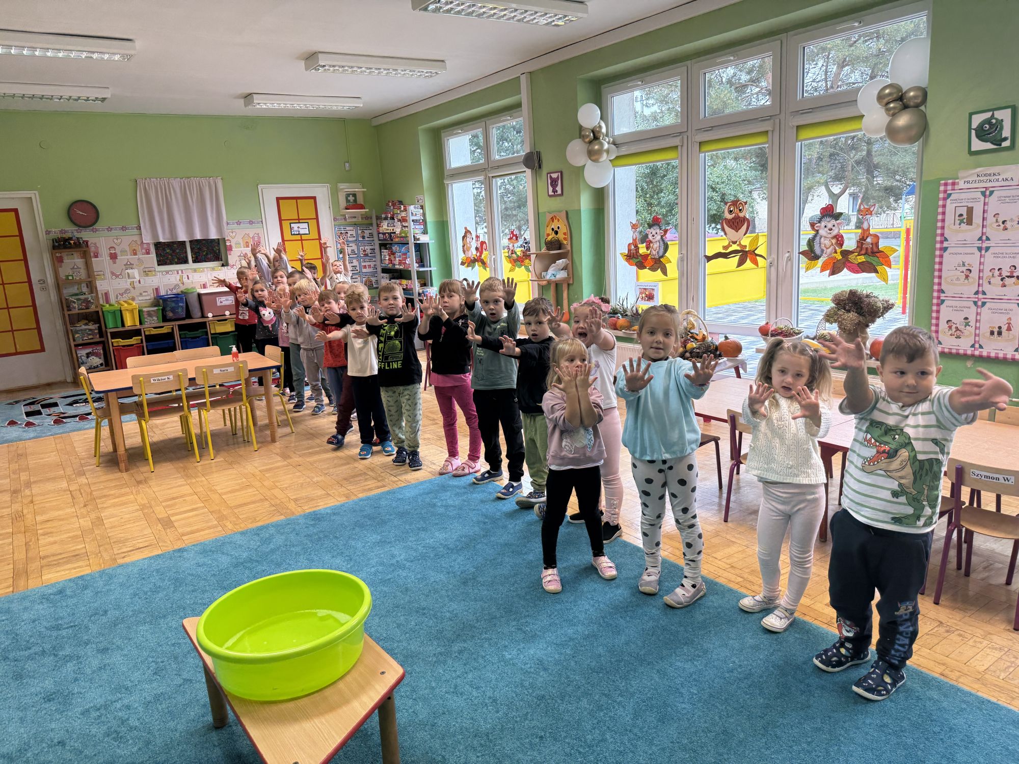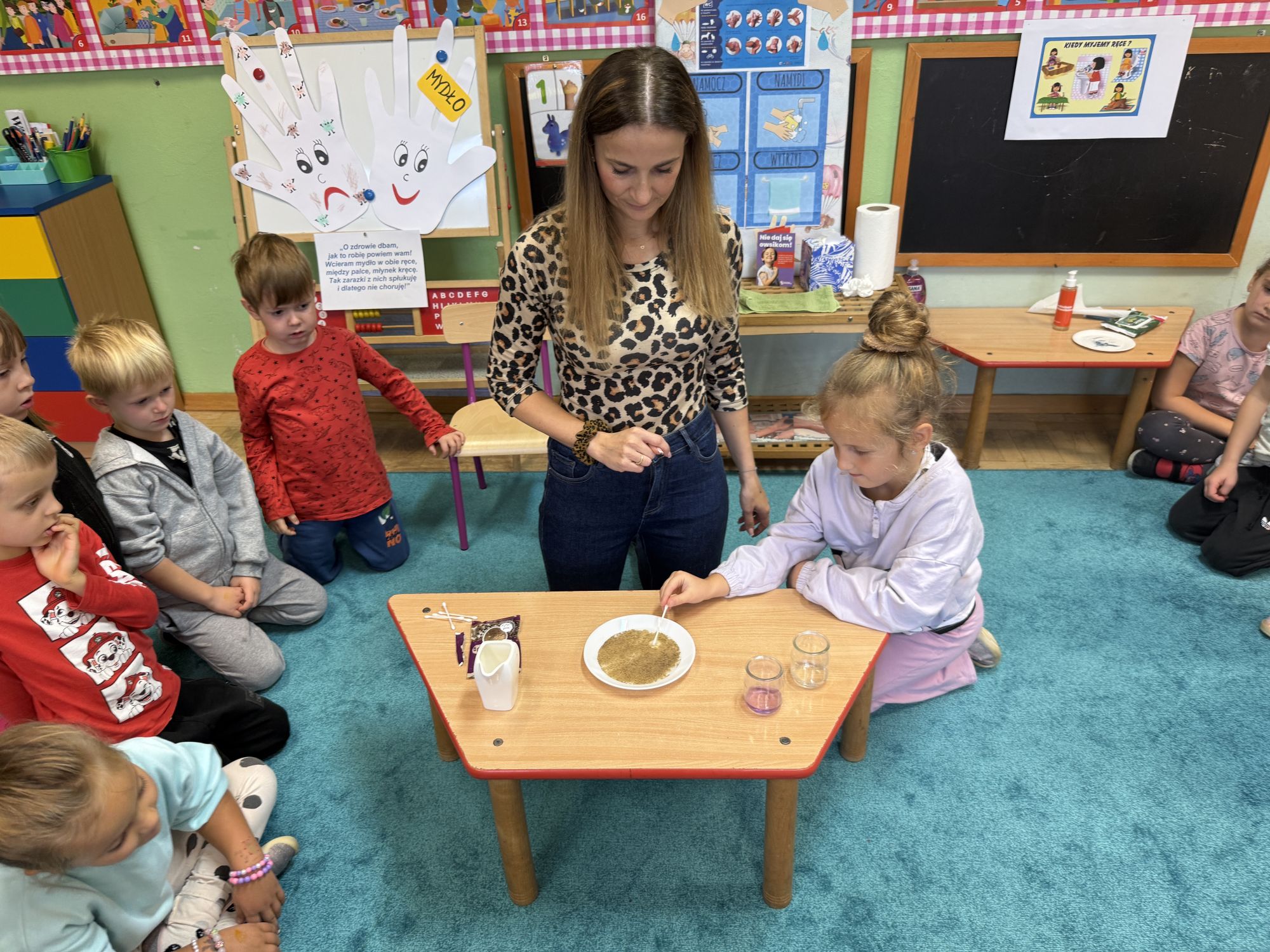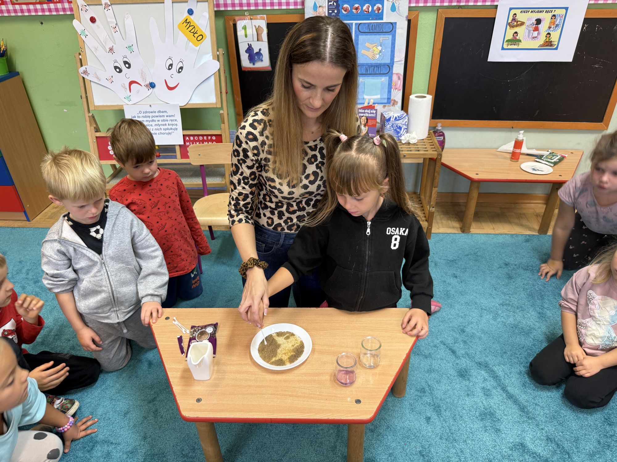Nasze Przedszkole kolejny raz zrealizowało program Przedszkole Bez Owsików, który stał się integralną cześcia obchodzonego 15 października, Światowego Dnia Mycia Rąk. Celem programu jest kształtowanie odpowiednich nawyków w zakresie dbania o czystość rąk wśród dzieci. Przedszkolaki wzięły udział w zajęciach edukacyjnych, które w ciekawy i zrozumiały sposób pokazały, jak ważne jest dbanie o czyste ręce w kontekście naszego zdrowia. Wychowankowie na samym początku odpowiadały na pytanie: do jakich czynności służą nam ręce? Obejrzały prezentację multimedialną, ukazującą proces zarażania się owsikami oraz zasady, których należy przestrzegać, aby owsiki się nie rozpowszechniały. Następnie utrwaliły technikę prawidłowego mycia rąk poprzez udział w zabawie, miały zadanie zmycia różnymi sposobami brokatu z dłoni. Po wielu próbach okazało się, że najlepszym, rozwiązaniem pozbycia się brokatu jest umycie rąk mydłem. Kolejnym eksperymentem było doświadczenie z pieprzem i mydłem. To prosta demonstracja pokazująca, jak mydło działa w walce z zarazkami, wizualizując efekt jego działania poprzez "uciekanie" pieprzu na brzegi miski. Doświadczenie pokazuje, jak mydło pomaga pozbyć się brudu i bakterii. Na zakończenie zajęć, przedszkolaki, pokolorowały obrazki.