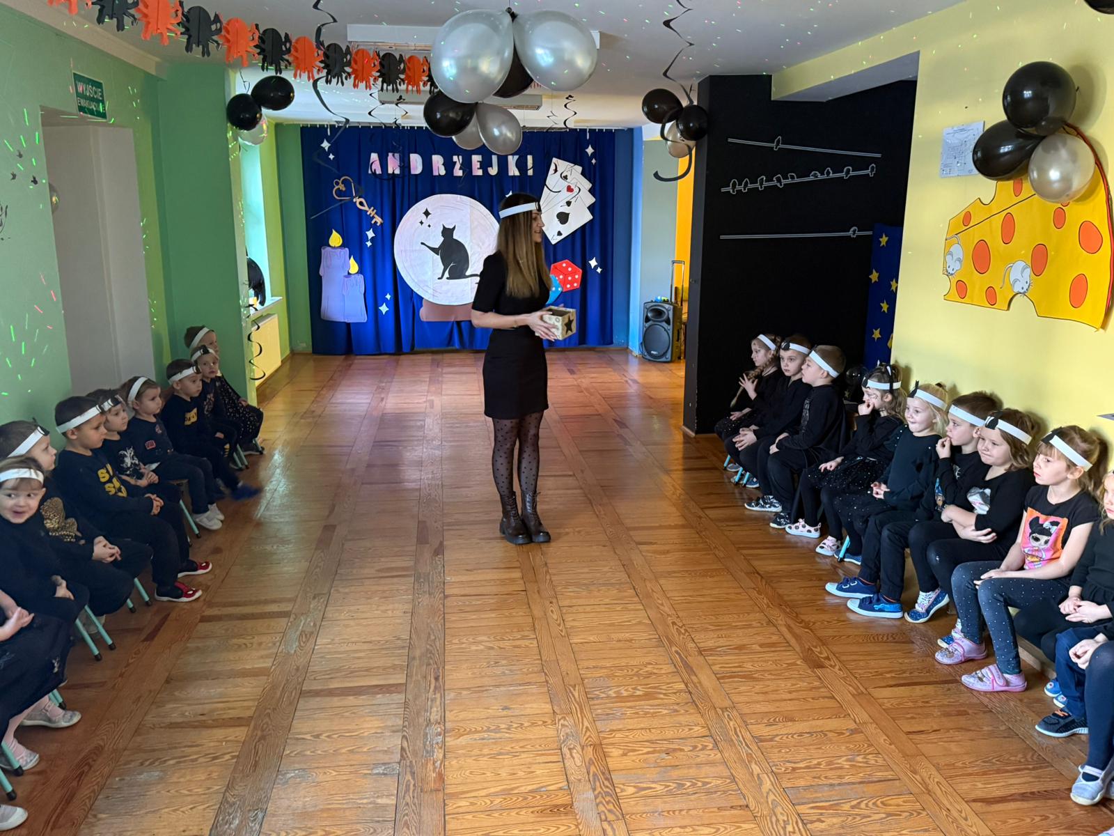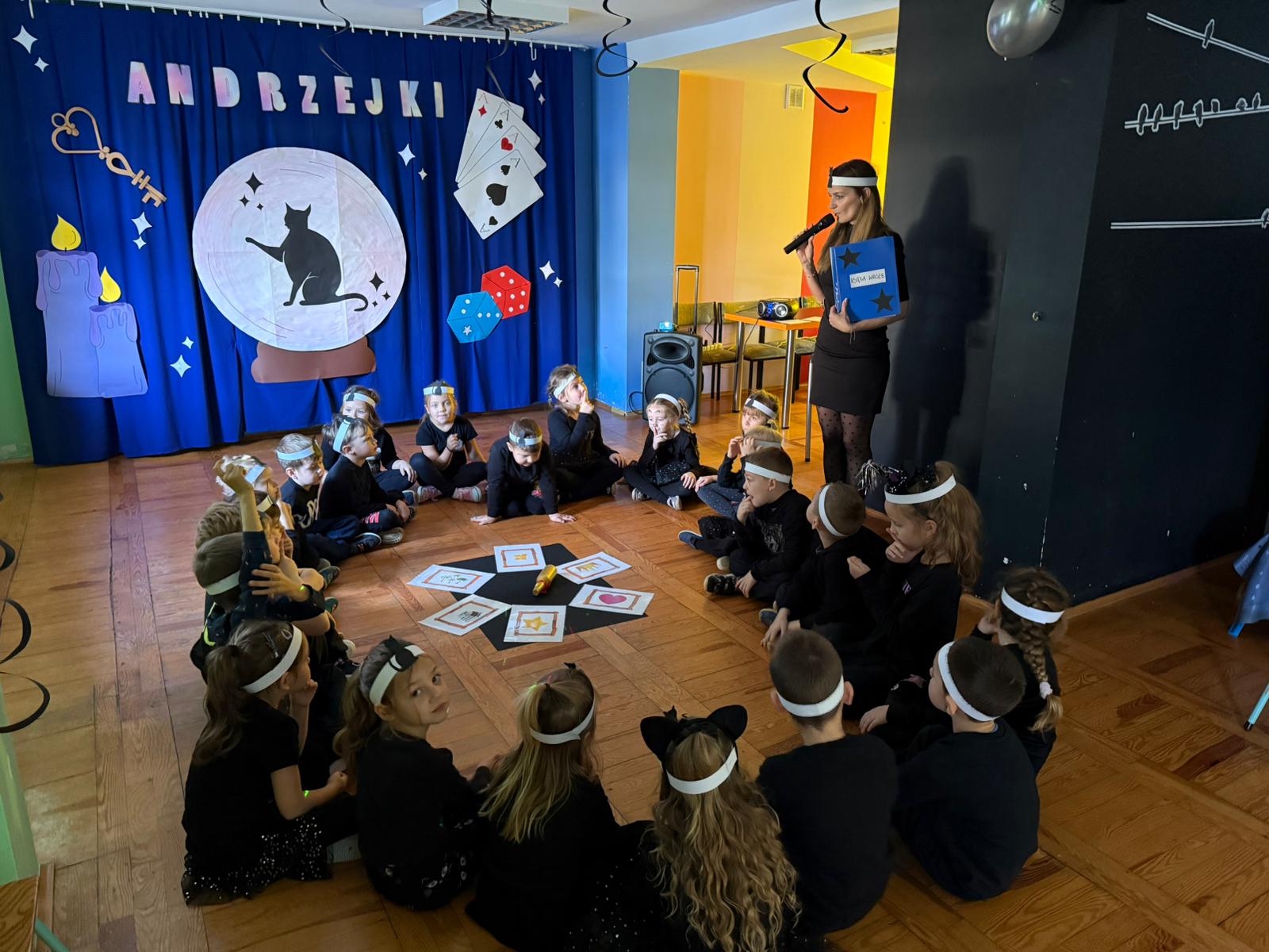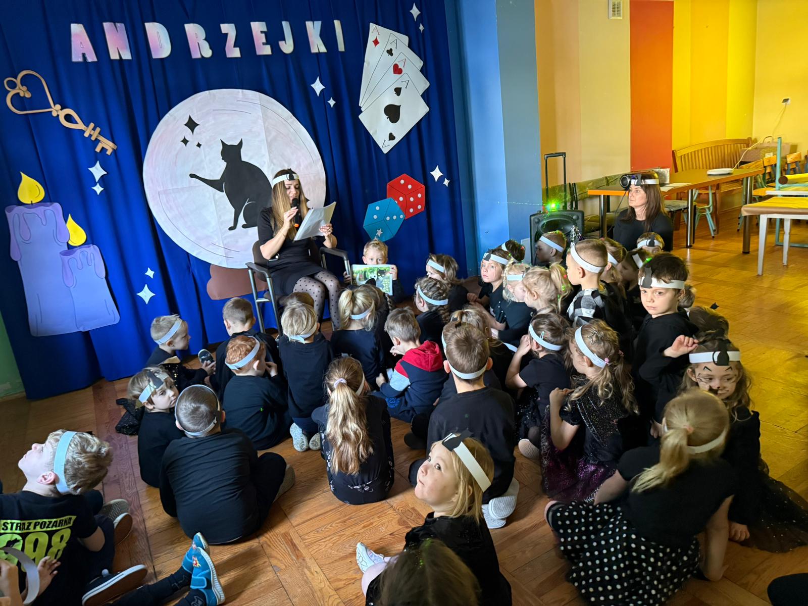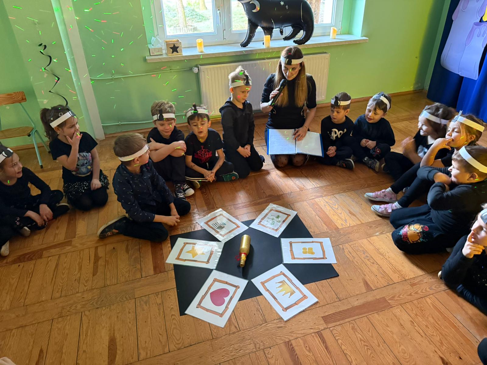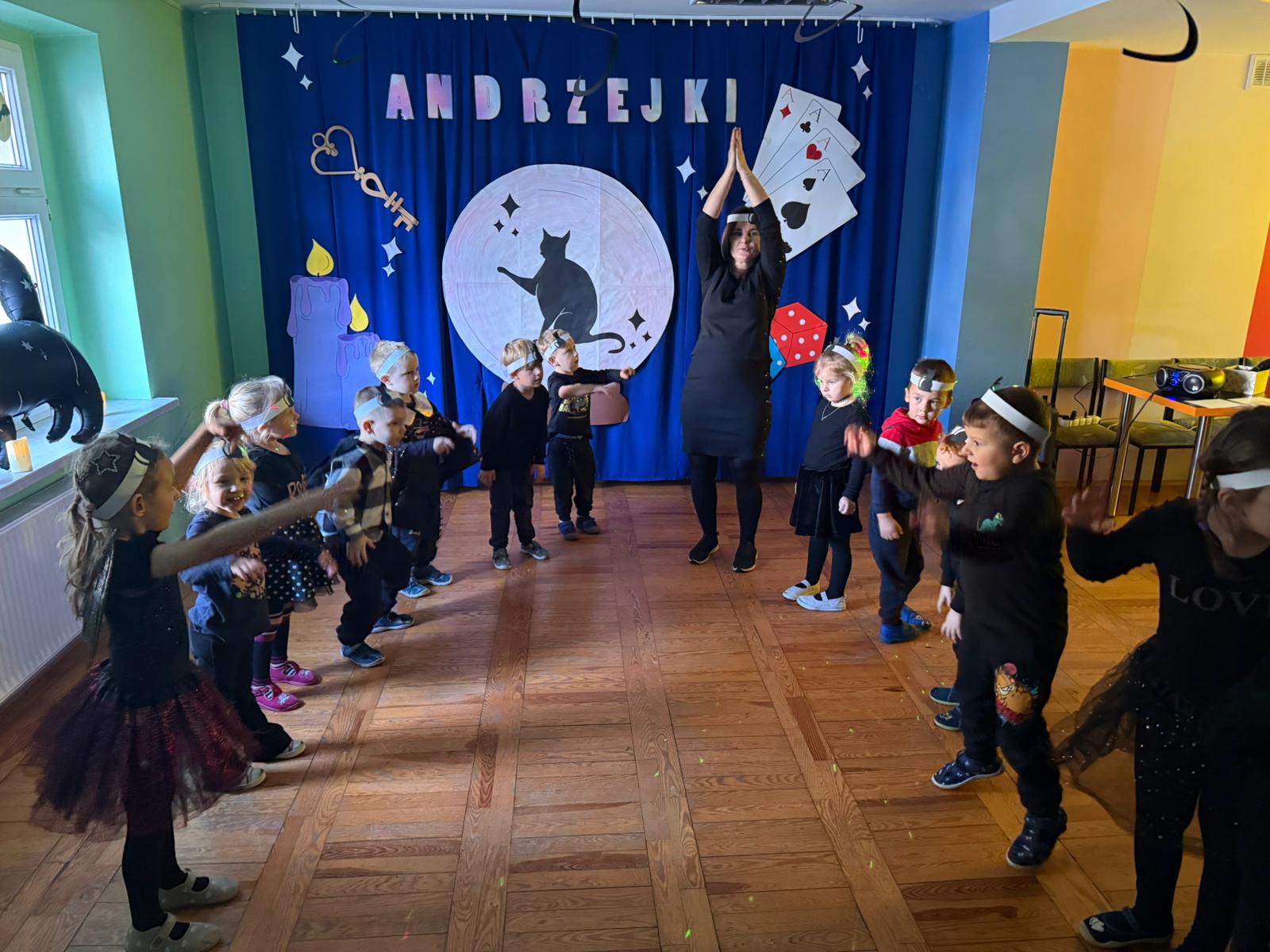 28 listopada w naszym przedszkolu odbyły się radosne i pełne magii Andrzejki. Od samego rana dzieci przeniosły się w świat wróżb, czarów i dobrej zabawy. Na początku spotkania przedszkolaki poznały tradycje andrzejkowe – dowiedziały się, skąd pochodzi zwyczaj wróżenia i dlaczego właśnie w tym dniu próbuje się zajrzeć w przyszłość. Dzieci słuchały z ogromną uwagą, a w sali z każdą chwilą narastała magiczna atmosfera. Następnie obie grupy udały się do przygotowanego „czarodziejskiego kącika”. Tam, przy zaczarowanej kuli, uczyły się specjalnego zaklęcia. Gdy wspólnie je wypowiedziały i kula „ożyła”, mieniąc się kolorami, dzieci mogły wreszcie przystąpić do wyczekiwanych wróżb. Rozpoczęło się odkrywanie przyszłości poprzez zabawy: „Kolory”, „Czarodziejska butelka”, „Grosiki” oraz „Kim będę w przyszłości?”. Wszystkie wróżby wywoływały u dzieci radość i uśmiech na twarzach. Następnie przedszkolaki ruszyły do tańca, bawiąc się wesoło przy ulubionych utworach z dziecięcego repertuaru. Wysłuchały opowiadania „O kotku, który szukał czarnego mleka”, a następnie z wielkim zaangażowaniem odpowiadały na pytania dotyczące treści. Nie zabrakło także zabaw animacyjno-ruchowych, m.in. z liną oraz pełnej emocji zabawy sprawnościowej „Kotki łapią myszki”. Po tylu atrakcjach na dzieci czekał słodko-owocowy poczęstunek, który dodał im energii na kolejne aktywności. Tradycyjne lanie wosku przez ucho czarodziejskiego klucza było kolejnym punktem programu. Powstające z wosku kształty pobudzały wyobraźnię i zachęcały do przepowiadania przyszłości. Na zakończenie wszyscy wykonali urocze czarne kotki z papierowych talerzyków – kreatywne prace plastyczne, które stały się pamiątką tego wyjątkowego, pełnego magii dnia.