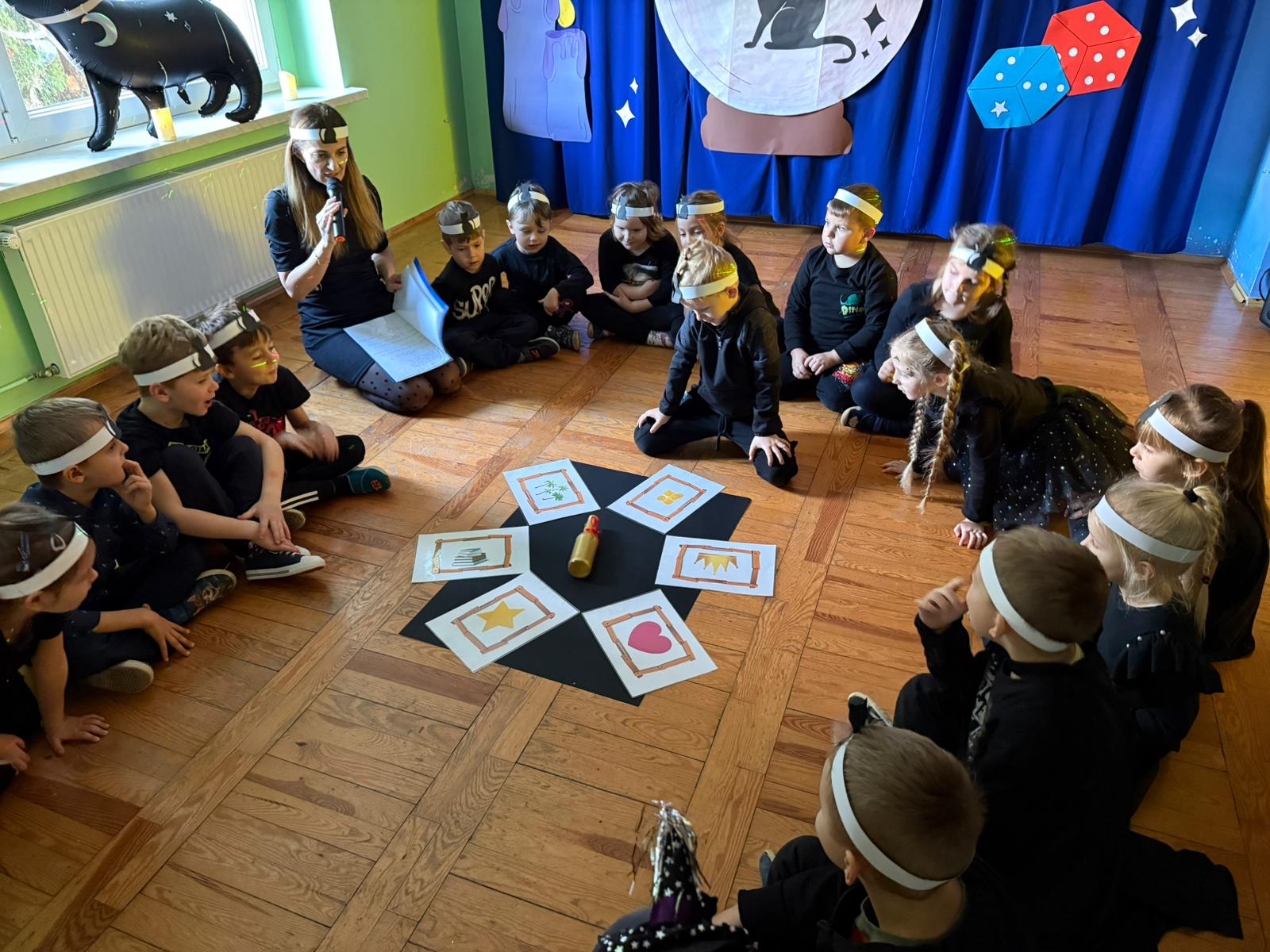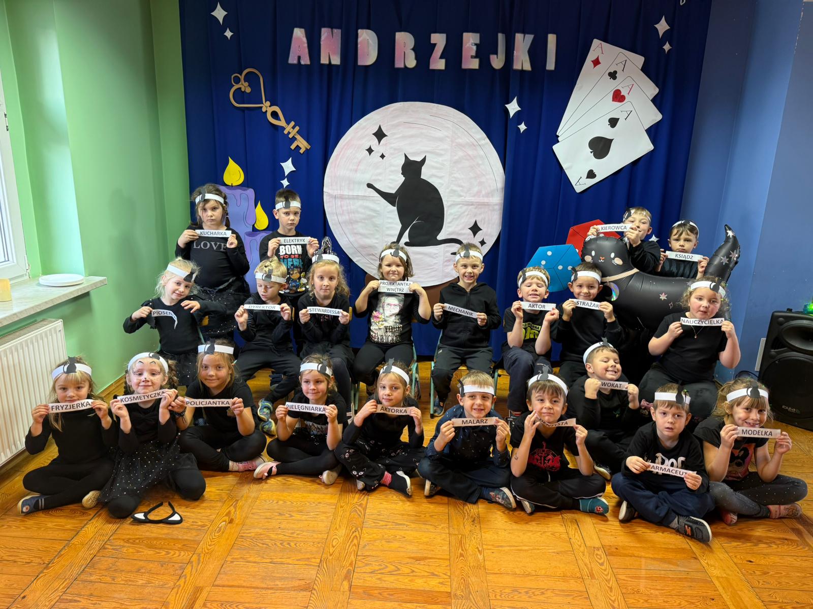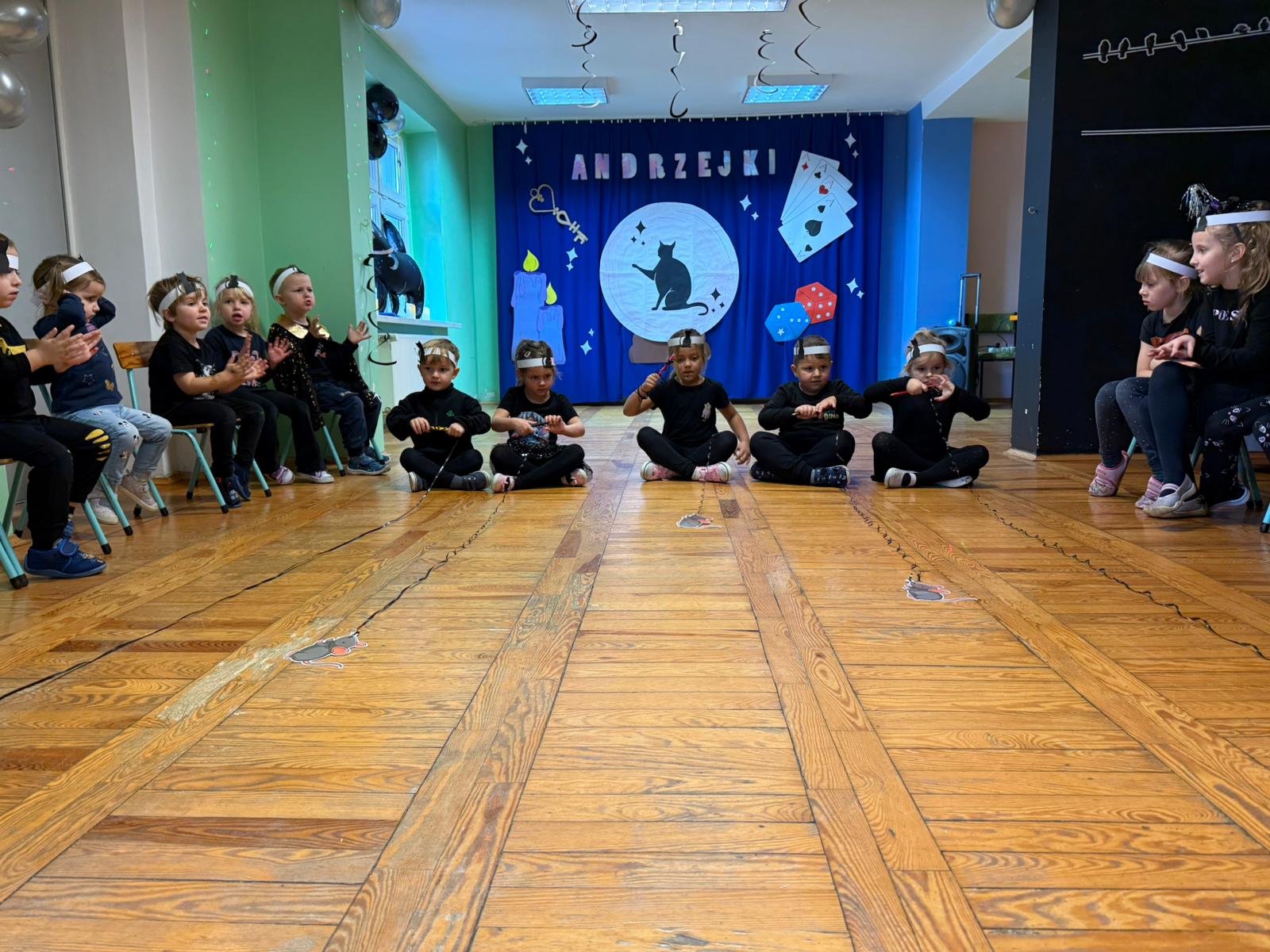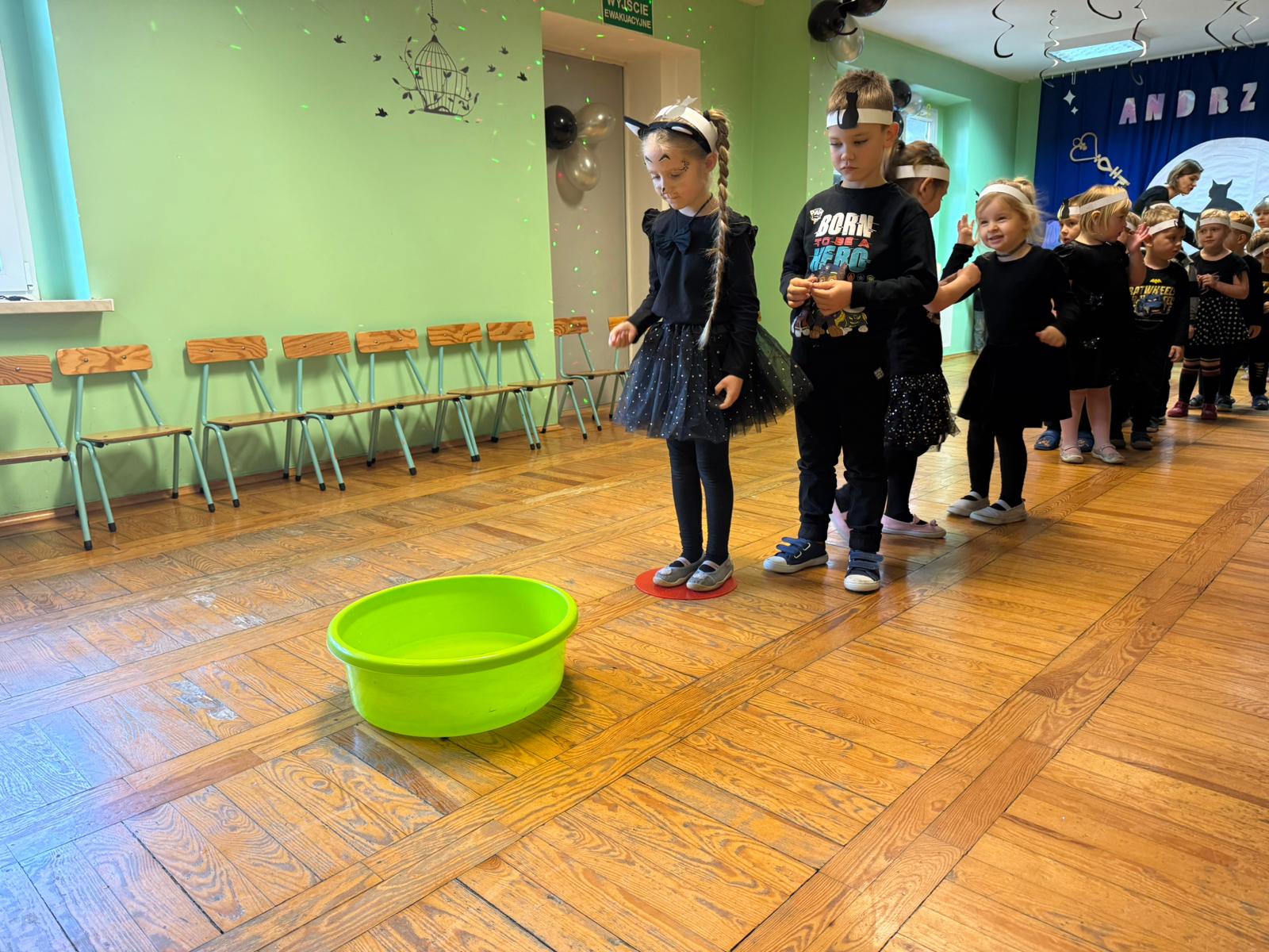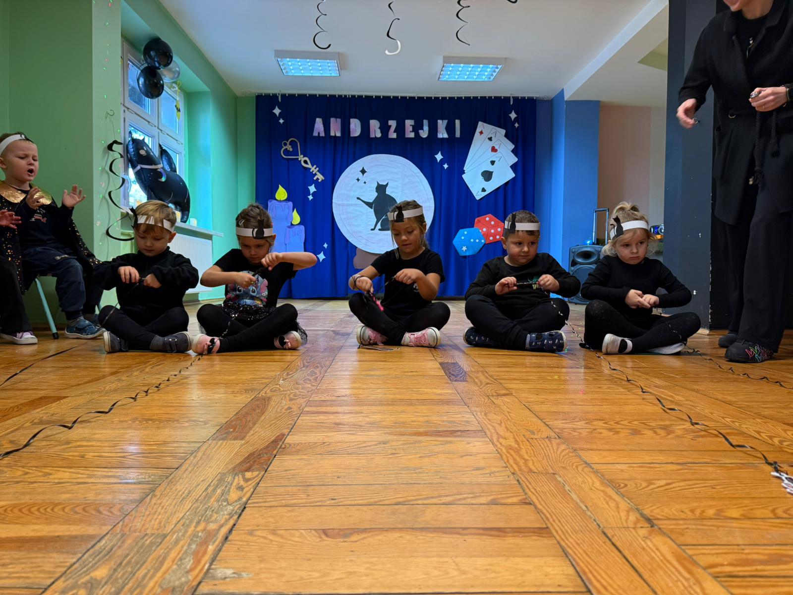 28 listopada w naszym przedszkolu odbyły się radosne i pełne magii Andrzejki. Od samego rana dzieci przeniosły się w świat wróżb, czarów i dobrej zabawy. Na początku spotkania przedszkolaki poznały tradycje andrzejkowe – dowiedziały się, skąd pochodzi zwyczaj wróżenia i dlaczego właśnie w tym dniu próbuje się zajrzeć w przyszłość. Dzieci słuchały z ogromną uwagą, a w sali z każdą chwilą narastała magiczna atmosfera. Następnie obie grupy udały się do przygotowanego „czarodziejskiego kącika”. Tam, przy zaczarowanej kuli, uczyły się specjalnego zaklęcia. Gdy wspólnie je wypowiedziały i kula „ożyła”, mieniąc się kolorami, dzieci mogły wreszcie przystąpić do wyczekiwanych wróżb. Rozpoczęło się odkrywanie przyszłości poprzez zabawy: „Kolory”, „Czarodziejska butelka”, „Grosiki” oraz „Kim będę w przyszłości?”. Wszystkie wróżby wywoływały u dzieci radość i uśmiech na twarzach. Następnie przedszkolaki ruszyły do tańca, bawiąc się wesoło przy ulubionych utworach z dziecięcego repertuaru. Wysłuchały opowiadania „O kotku, który szukał czarnego mleka”, a następnie z wielkim zaangażowaniem odpowiadały na pytania dotyczące treści. Nie zabrakło także zabaw animacyjno-ruchowych, m.in. z liną oraz pełnej emocji zabawy sprawnościowej „Kotki łapią myszki”. Po tylu atrakcjach na dzieci czekał słodko-owocowy poczęstunek, który dodał im energii na kolejne aktywności. Tradycyjne lanie wosku przez ucho czarodziejskiego klucza było kolejnym punktem programu. Powstające z wosku kształty pobudzały wyobraźnię i zachęcały do przepowiadania przyszłości. Na zakończenie wszyscy wykonali urocze czarne kotki z papierowych talerzyków – kreatywne prace plastyczne, które stały się pamiątką tego wyjątkowego, pełnego magii dnia.
