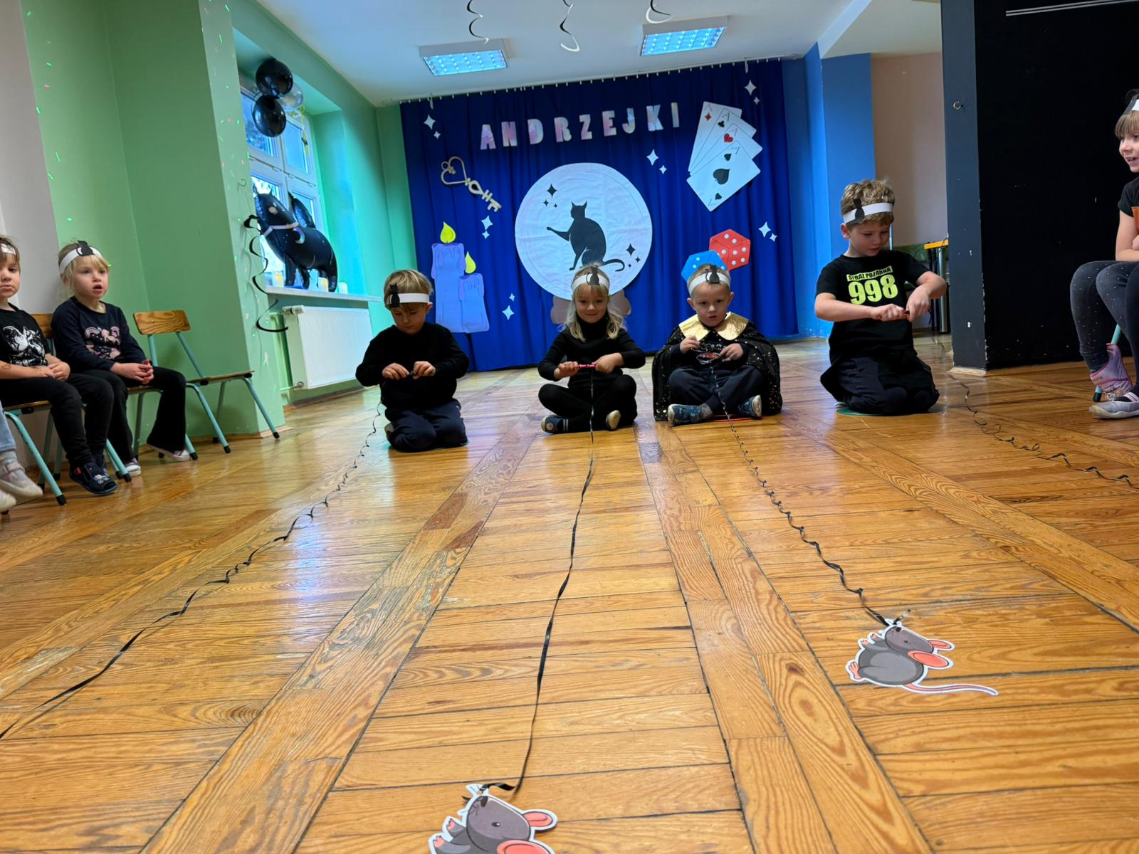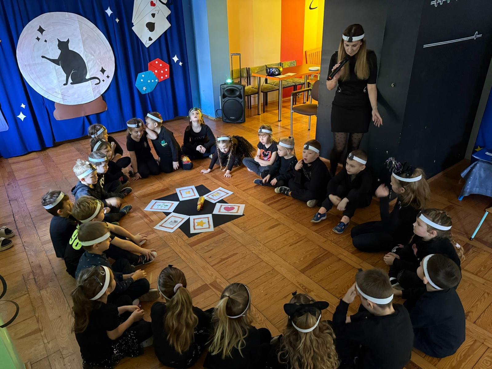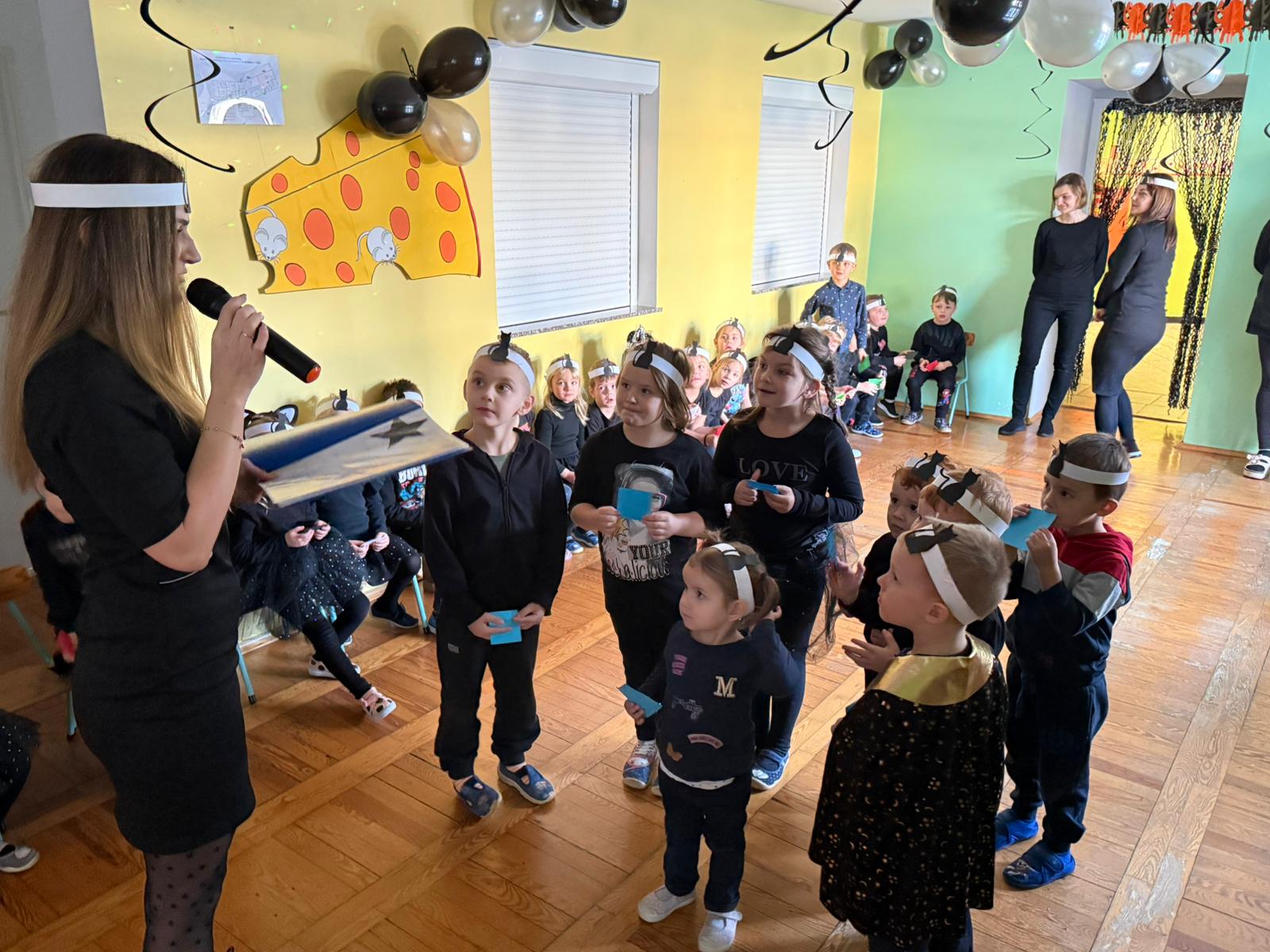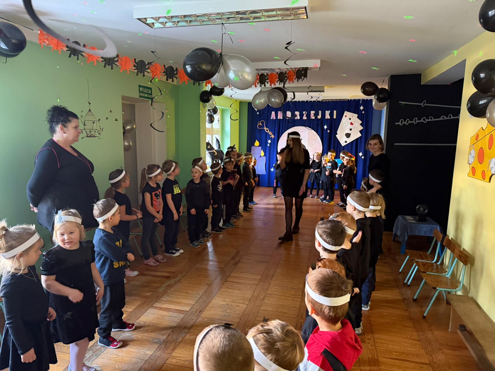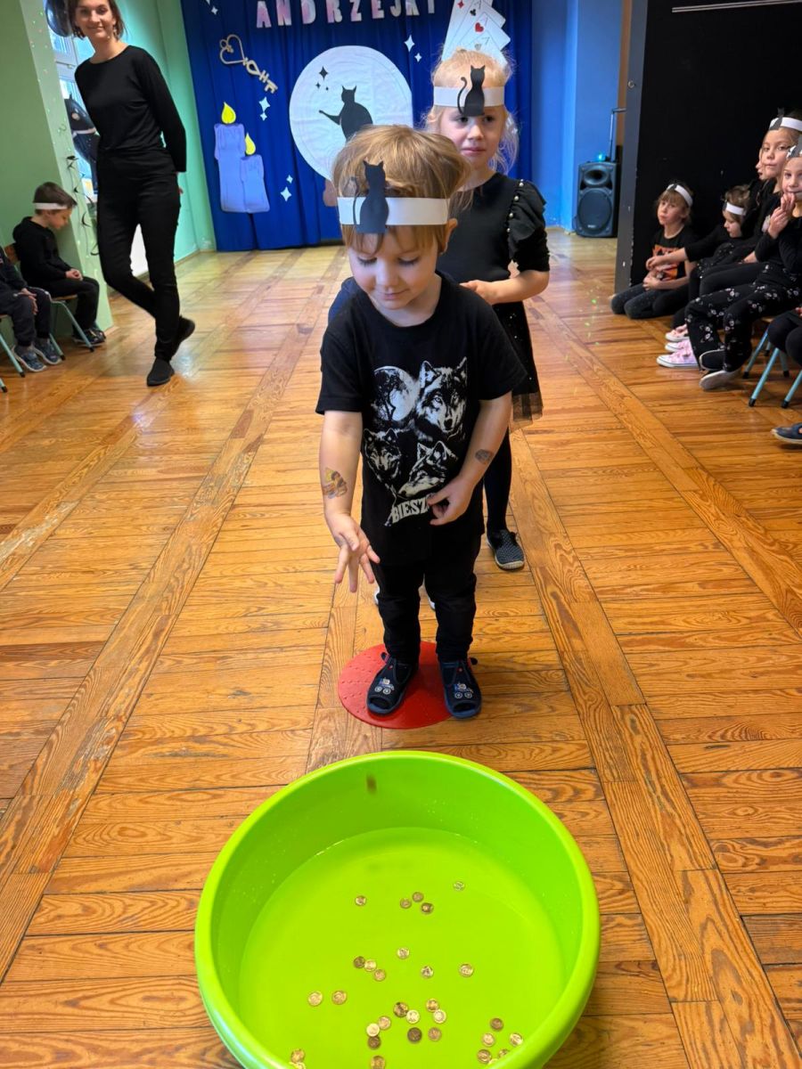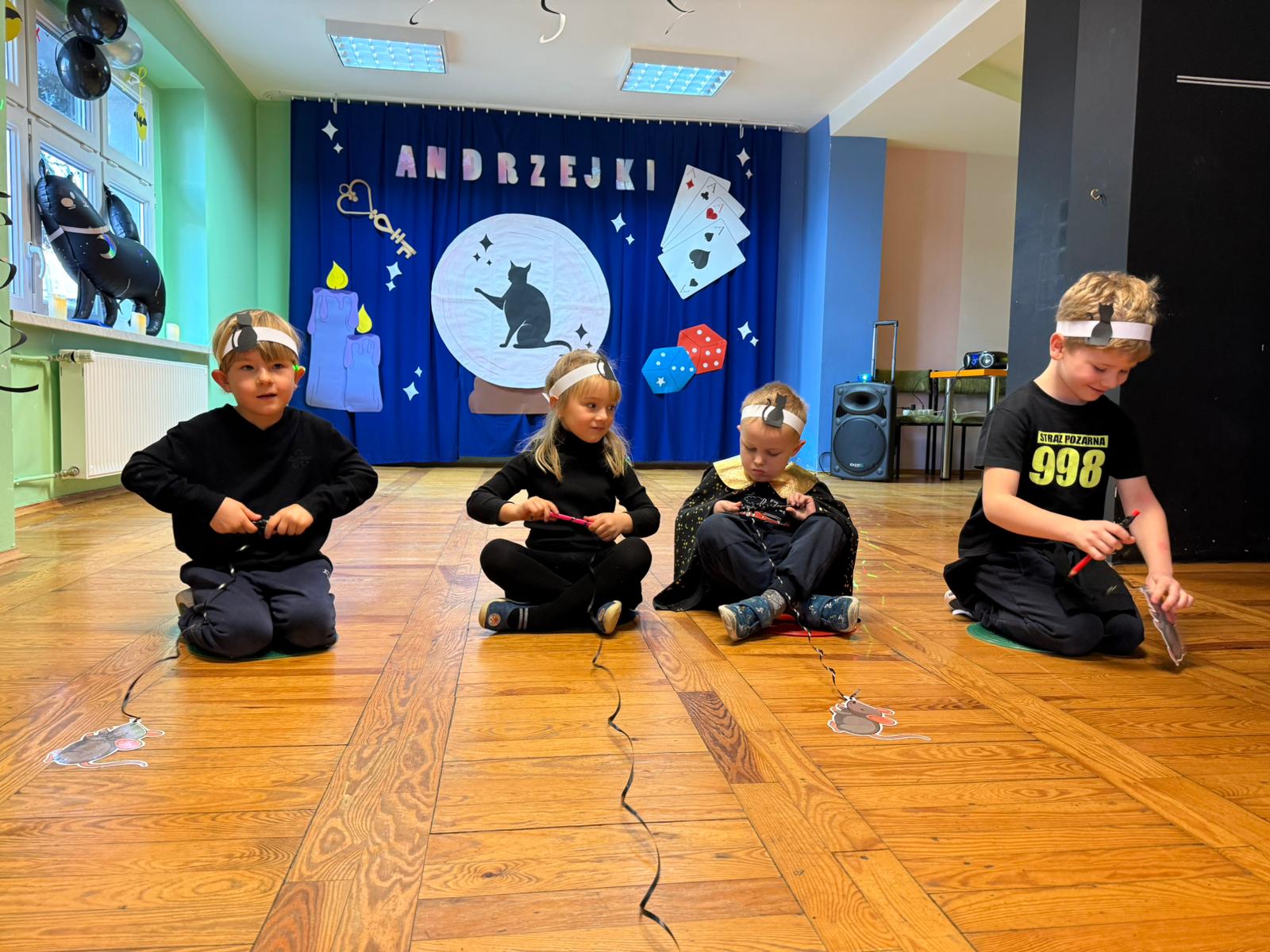28 listopada w naszym przedszkolu odbyły się radosne i pełne magii Andrzejki. Od samego rana dzieci przeniosły się w świat wróżb, czarów i dobrej zabawy. Na początku spotkania przedszkolaki poznały tradycje andrzejkowe – dowiedziały się, skąd pochodzi zwyczaj wróżenia i dlaczego właśnie w tym dniu próbuje się zajrzeć w przyszłość. Dzieci słuchały z ogromną uwagą, a w sali z każdą chwilą narastała magiczna atmosfera. Następnie obie grupy udały się do przygotowanego „czarodziejskiego kącika”. Tam, przy zaczarowanej kuli, uczyły się specjalnego zaklęcia. Gdy wspólnie je wypowiedziały i kula „ożyła”, mieniąc się kolorami, dzieci mogły wreszcie przystąpić do wyczekiwanych wróżb. Rozpoczęło się odkrywanie przyszłości poprzez zabawy: „Kolory”, „Czarodziejska butelka”, „Grosiki” oraz „Kim będę w przyszłości?”. Wszystkie wróżby wywoływały u dzieci radość i uśmiech na twarzach. Następnie przedszkolaki ruszyły do tańca, bawiąc się wesoło przy ulubionych utworach z dziecięcego repertuaru. Wysłuchały opowiadania „O kotku, który szukał czarnego mleka”, a następnie z wielkim zaangażowaniem odpowiadały na pytania dotyczące treści. Nie zabrakło także zabaw animacyjno-ruchowych, m.in. z liną oraz pełnej emocji zabawy sprawnościowej „Kotki łapią myszki”. Po tylu atrakcjach na dzieci czekał słodko-owocowy poczęstunek, który dodał im energii na kolejne aktywności. Tradycyjne lanie wosku przez ucho czarodziejskiego klucza było kolejnym punktem programu. Powstające z wosku kształty pobudzały wyobraźnię i zachęcały do przepowiadania przyszłości. Na zakończenie wszyscy wykonali urocze czarne kotki z papierowych talerzyków – kreatywne prace plastyczne, które stały się pamiątką tego wyjątkowego, pełnego magii dnia.
