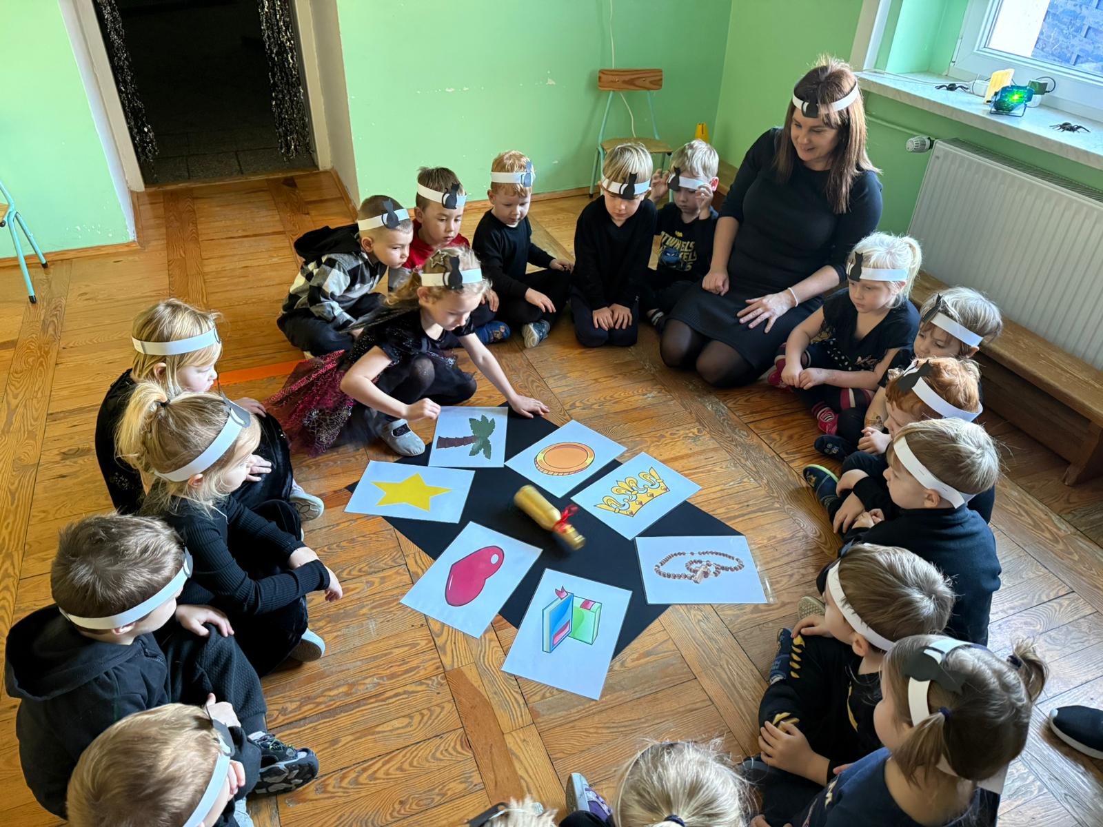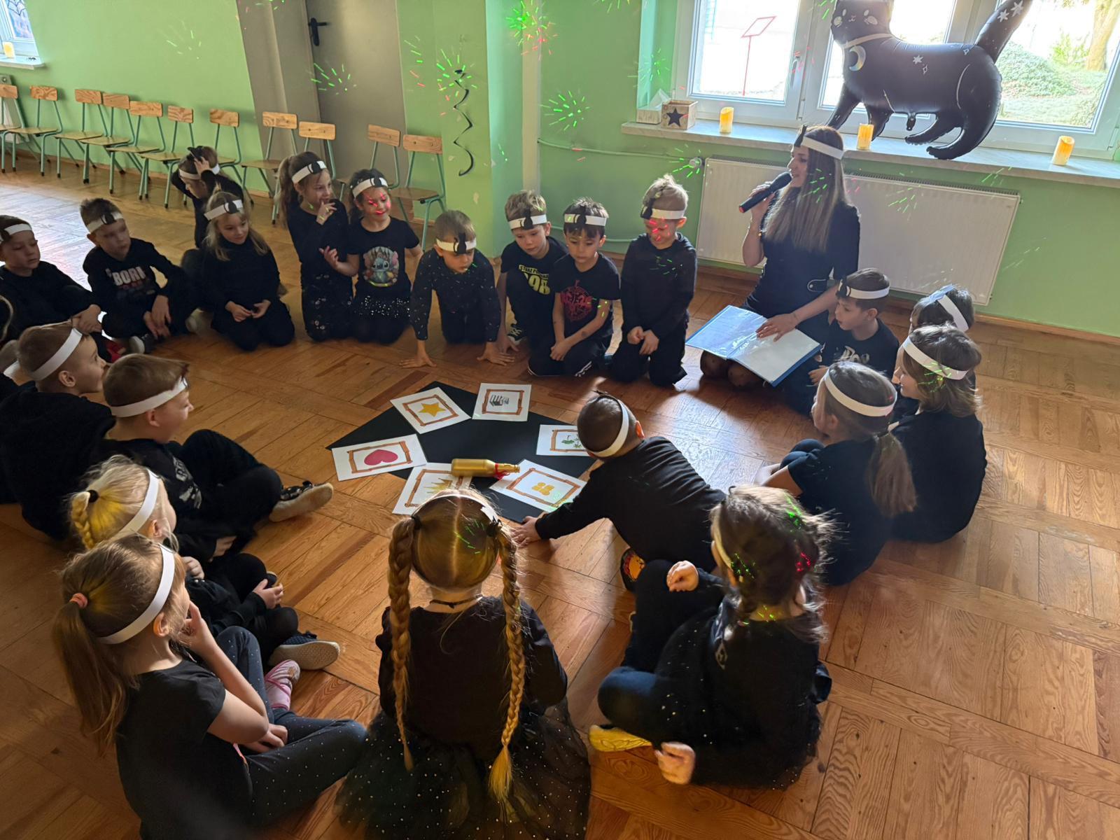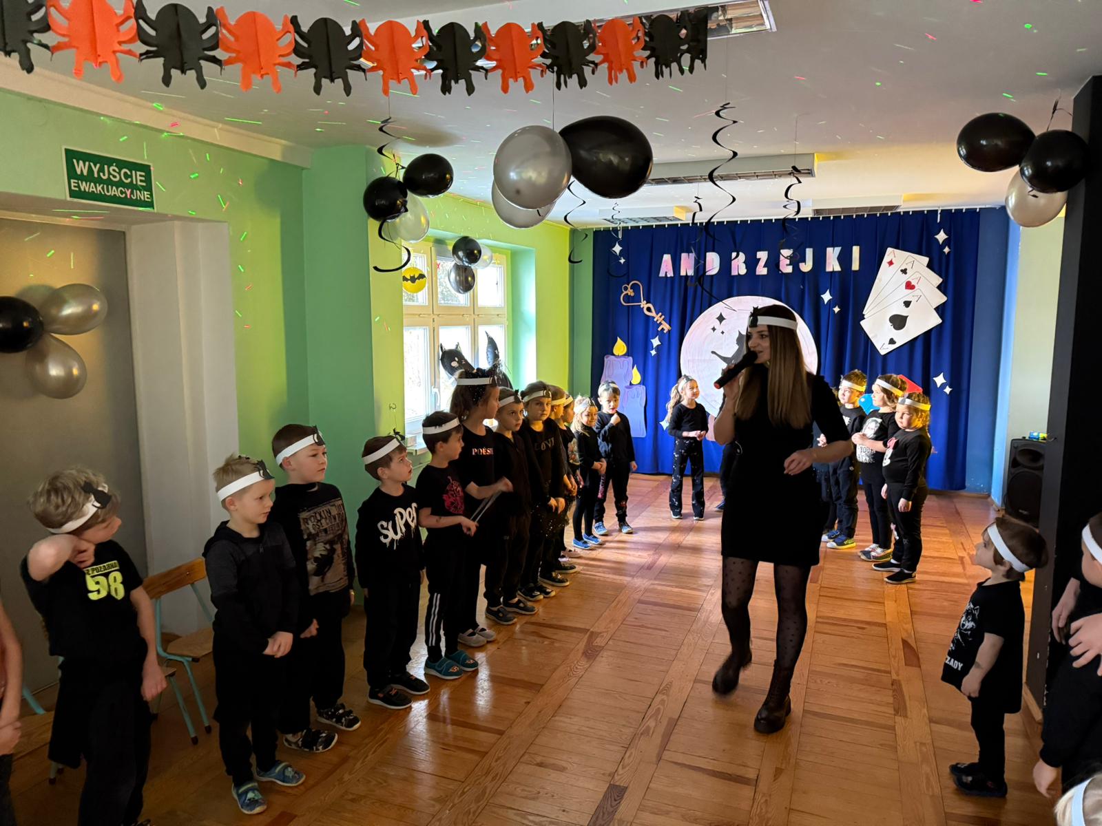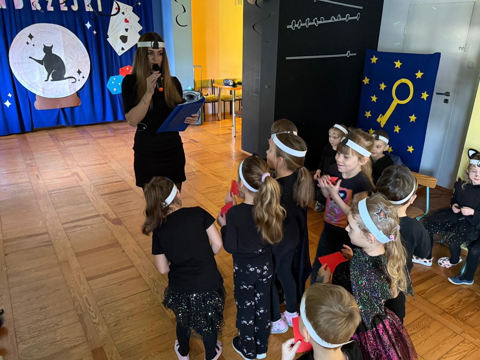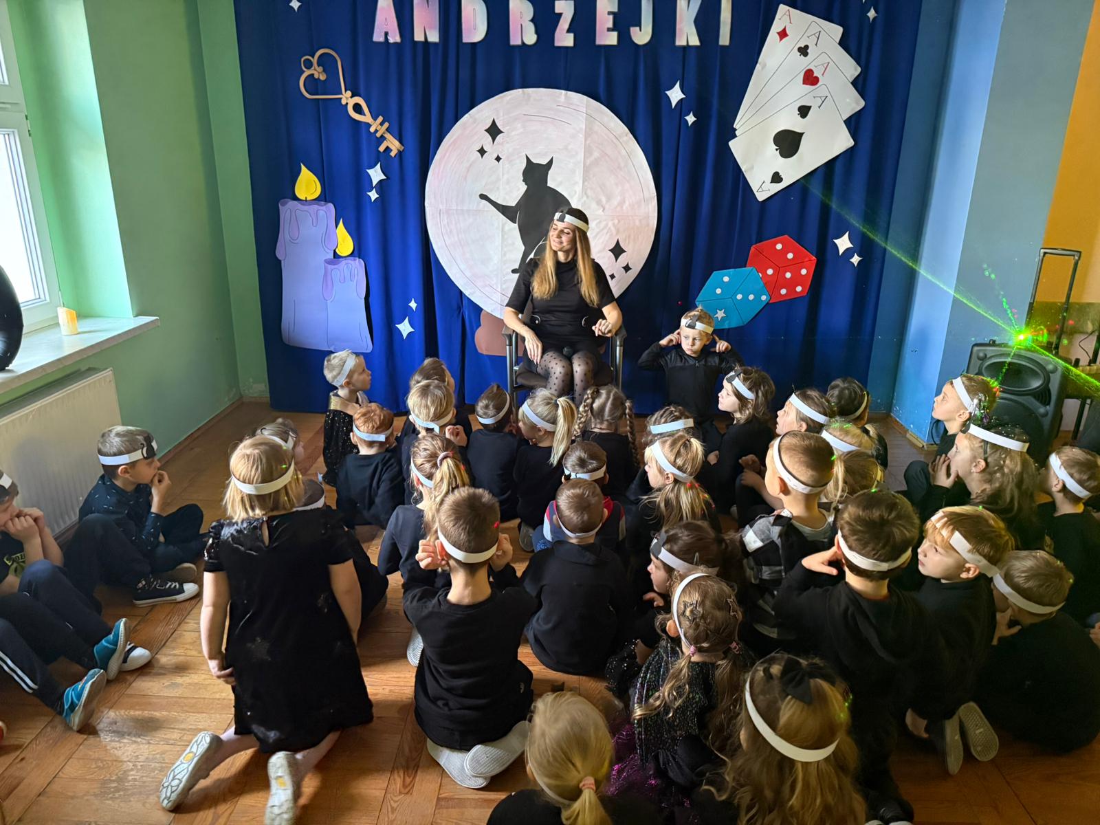 28 listopada w naszym przedszkolu odbyły się radosne i pełne magii Andrzejki. Od samego rana dzieci przeniosły się w świat wróżb, czarów i dobrej zabawy. Na początku spotkania przedszkolaki poznały tradycje andrzejkowe – dowiedziały się, skąd pochodzi zwyczaj wróżenia i dlaczego właśnie w tym dniu próbuje się zajrzeć w przyszłość. Dzieci słuchały z ogromną uwagą, a w sali z każdą chwilą narastała magiczna atmosfera. Następnie obie grupy udały się do przygotowanego „czarodziejskiego kącika”. Tam, przy zaczarowanej kuli, uczyły się specjalnego zaklęcia. Gdy wspólnie je wypowiedziały i kula „ożyła”, mieniąc się kolorami, dzieci mogły wreszcie przystąpić do wyczekiwanych wróżb. Rozpoczęło się odkrywanie przyszłości poprzez zabawy: „Kolory”, „Czarodziejska butelka”, „Grosiki” oraz „Kim będę w przyszłości?”. Wszystkie wróżby wywoływały u dzieci radość i uśmiech na twarzach. Następnie przedszkolaki ruszyły do tańca, bawiąc się wesoło przy ulubionych utworach z dziecięcego repertuaru. Wysłuchały opowiadania „O kotku, który szukał czarnego mleka”, a następnie z wielkim zaangażowaniem odpowiadały na pytania dotyczące treści. Nie zabrakło także zabaw animacyjno-ruchowych, m.in. z liną oraz pełnej emocji zabawy sprawnościowej „Kotki łapią myszki”. Po tylu atrakcjach na dzieci czekał słodko-owocowy poczęstunek, który dodał im energii na kolejne aktywności. Tradycyjne lanie wosku przez ucho czarodziejskiego klucza było kolejnym punktem programu. Powstające z wosku kształty pobudzały wyobraźnię i zachęcały do przepowiadania przyszłości. Na zakończenie wszyscy wykonali urocze czarne kotki z papierowych talerzyków – kreatywne prace plastyczne, które stały się pamiątką tego wyjątkowego, pełnego magii dnia.