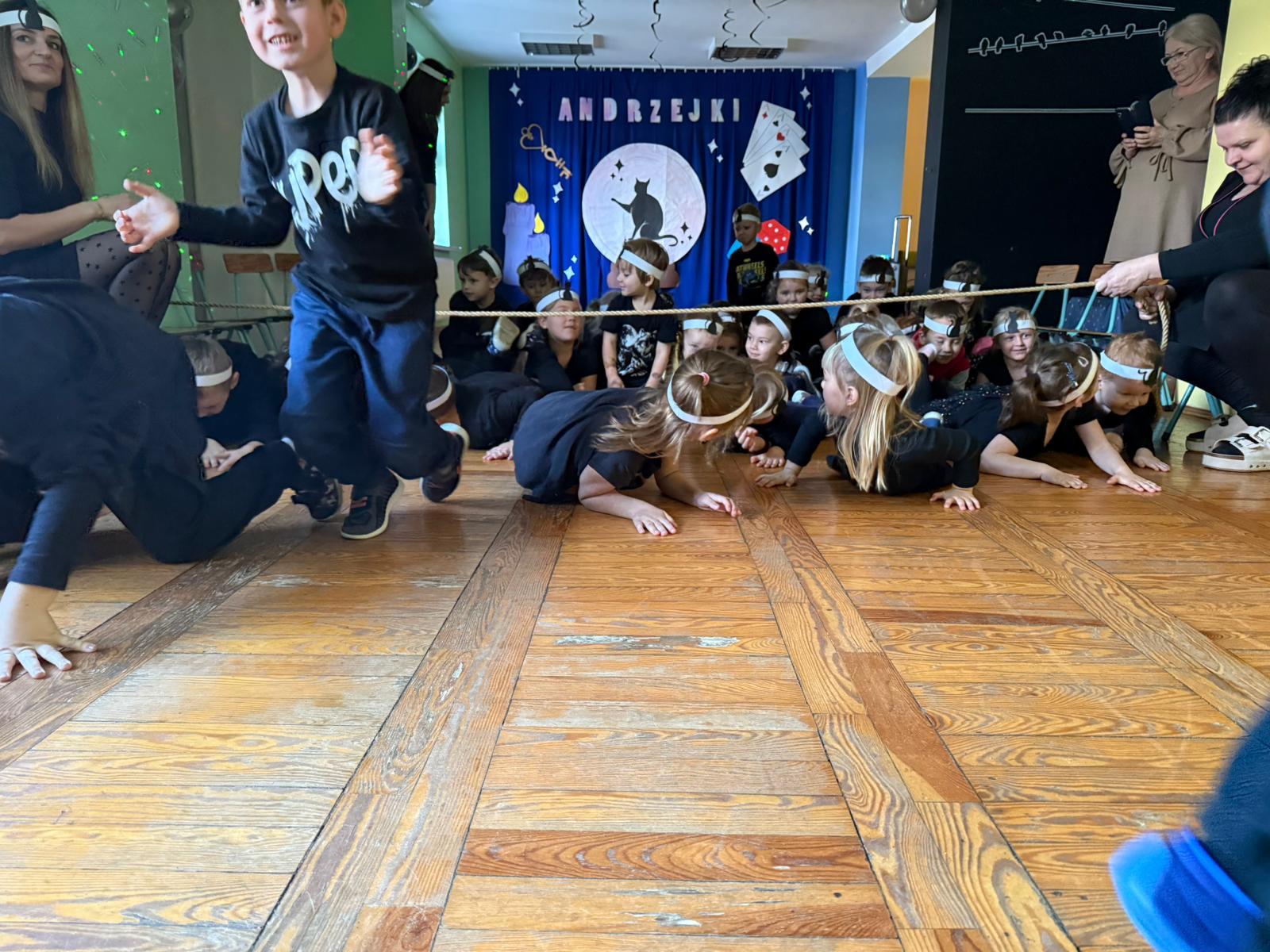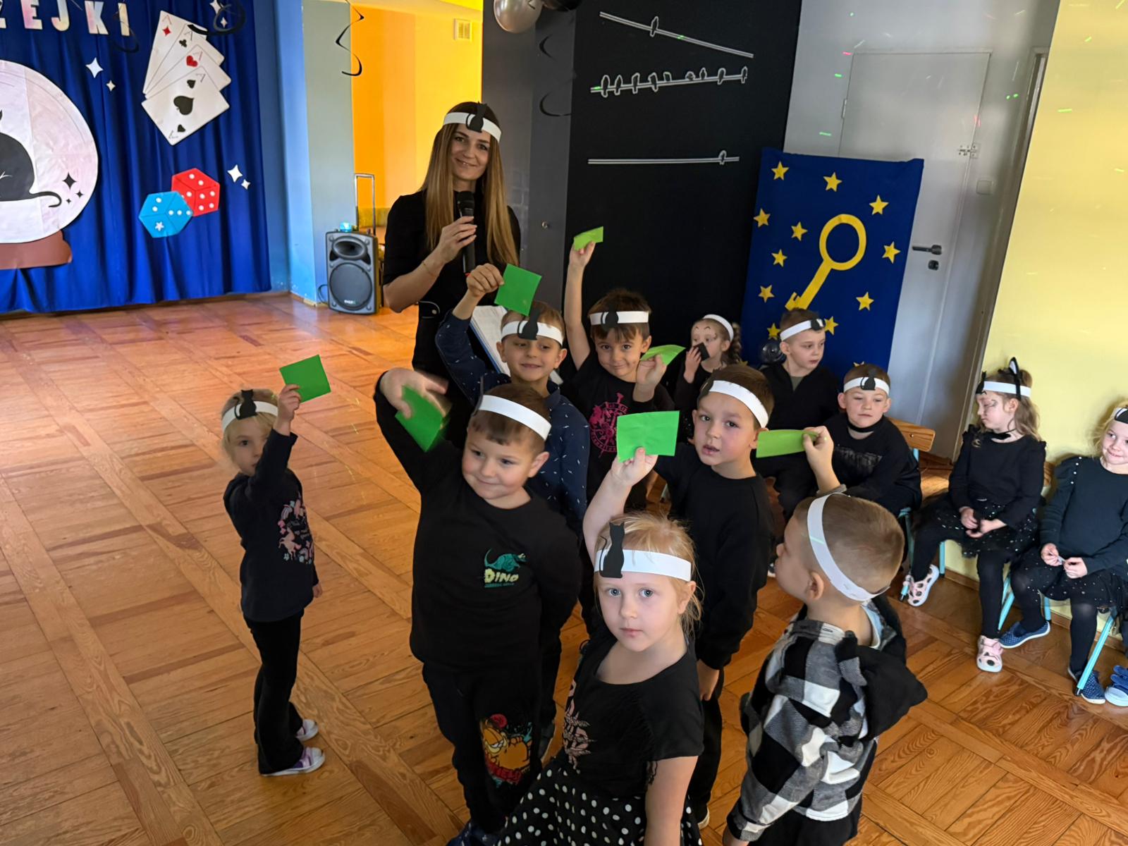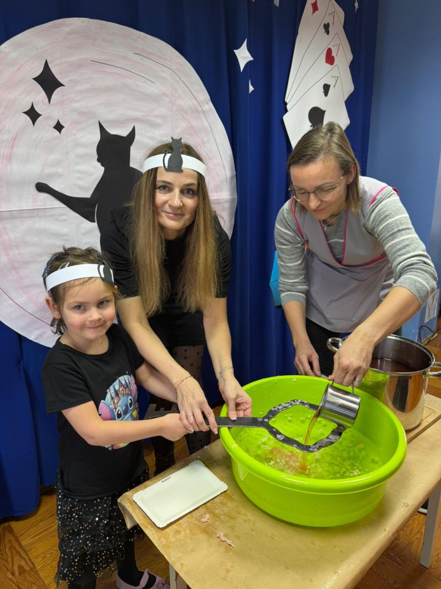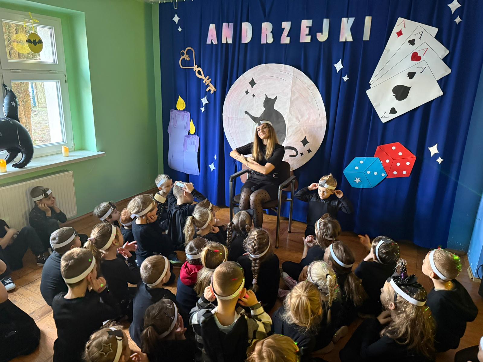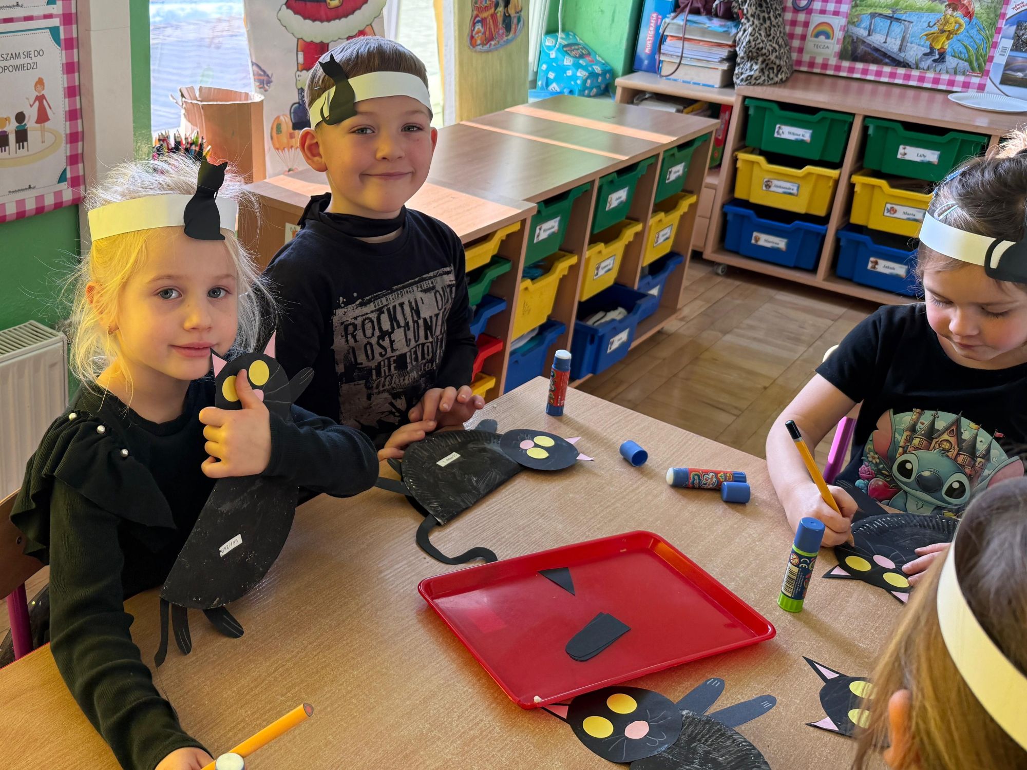 28 listopada w naszym przedszkolu odbyły się radosne i pełne magii Andrzejki. Od samego rana dzieci przeniosły się w świat wróżb, czarów i dobrej zabawy. Na początku spotkania przedszkolaki poznały tradycje andrzejkowe – dowiedziały się, skąd pochodzi zwyczaj wróżenia i dlaczego właśnie w tym dniu próbuje się zajrzeć w przyszłość. Dzieci słuchały z ogromną uwagą, a w sali z każdą chwilą narastała magiczna atmosfera. Następnie obie grupy udały się do przygotowanego „czarodziejskiego kącika”. Tam, przy zaczarowanej kuli, uczyły się specjalnego zaklęcia. Gdy wspólnie je wypowiedziały i kula „ożyła”, mieniąc się kolorami, dzieci mogły wreszcie przystąpić do wyczekiwanych wróżb. Rozpoczęło się odkrywanie przyszłości poprzez zabawy: „Kolory”, „Czarodziejska butelka”, „Grosiki” oraz „Kim będę w przyszłości?”. Wszystkie wróżby wywoływały u dzieci radość i uśmiech na twarzach. Następnie przedszkolaki ruszyły do tańca, bawiąc się wesoło przy ulubionych utworach z dziecięcego repertuaru. Wysłuchały opowiadania „O kotku, który szukał czarnego mleka”, a następnie z wielkim zaangażowaniem odpowiadały na pytania dotyczące treści. Nie zabrakło także zabaw animacyjno-ruchowych, m.in. z liną oraz pełnej emocji zabawy sprawnościowej „Kotki łapią myszki”. Po tylu atrakcjach na dzieci czekał słodko-owocowy poczęstunek, który dodał im energii na kolejne aktywności. Tradycyjne lanie wosku przez ucho czarodziejskiego klucza było kolejnym punktem programu. Powstające z wosku kształty pobudzały wyobraźnię i zachęcały do przepowiadania przyszłości. Na zakończenie wszyscy wykonali urocze czarne kotki z papierowych talerzyków – kreatywne prace plastyczne, które stały się pamiątką tego wyjątkowego, pełnego magii dnia.