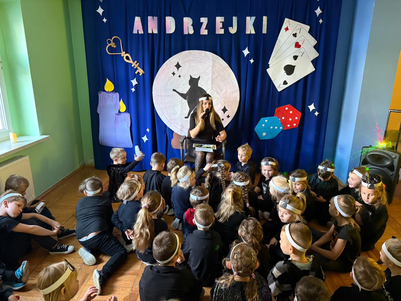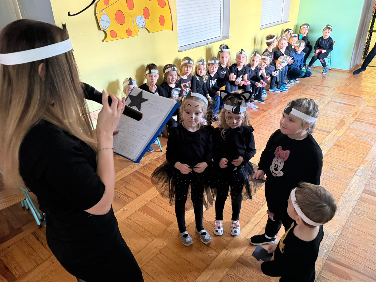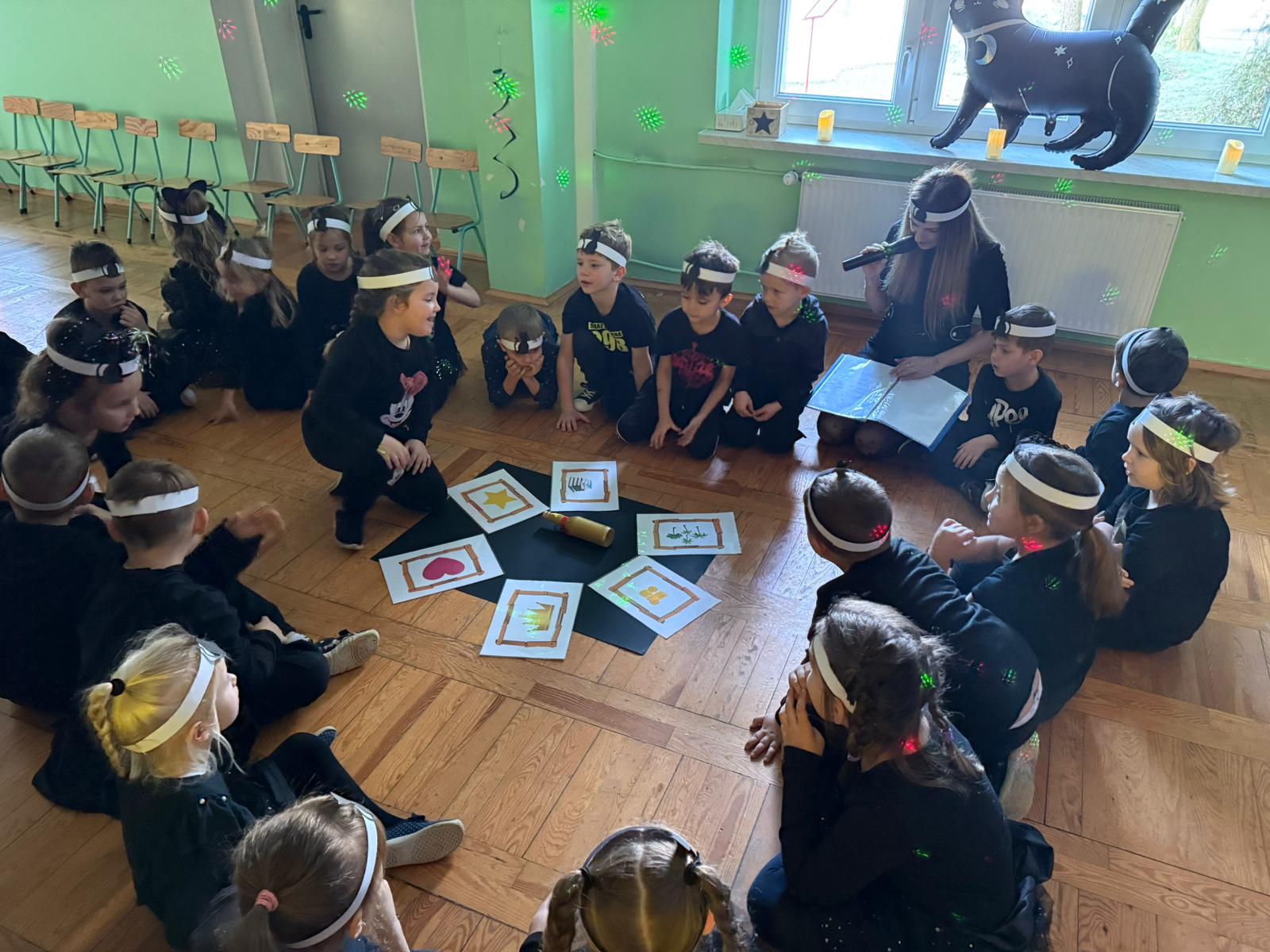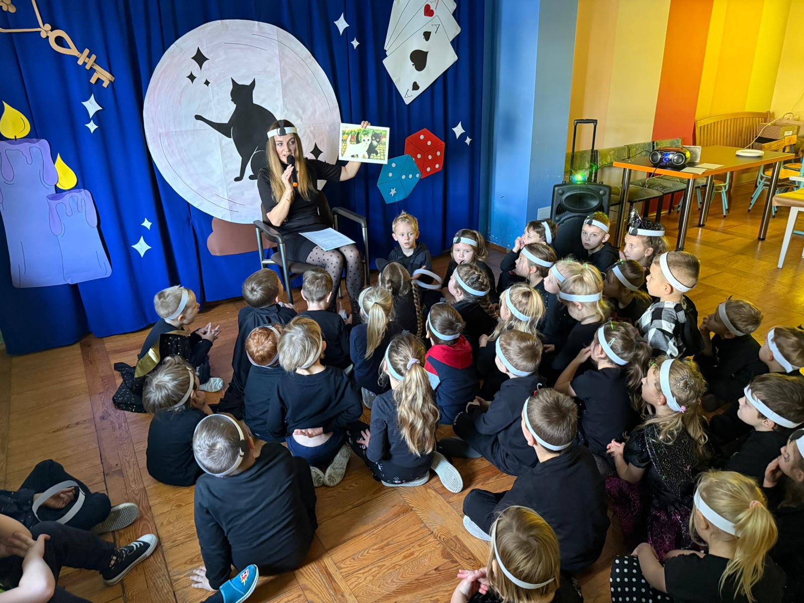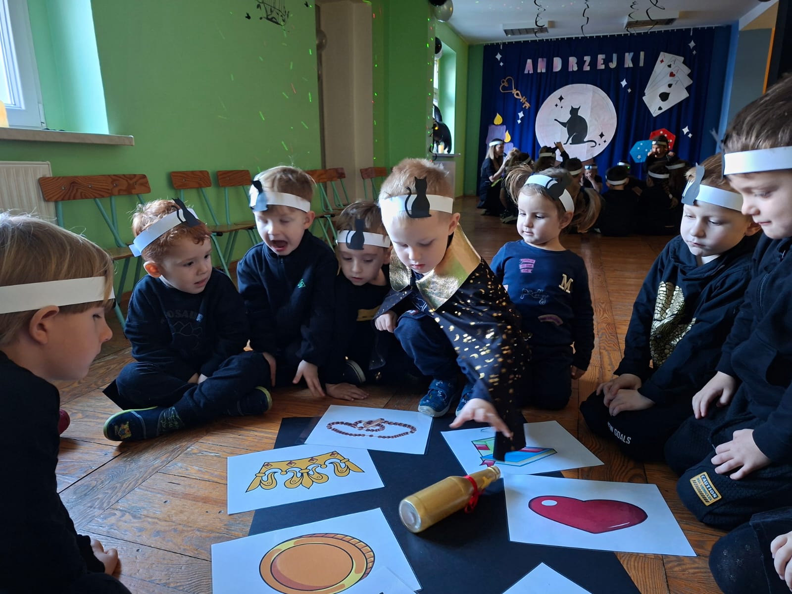 28 listopada w naszym przedszkolu odbyły się radosne i pełne magii Andrzejki. Od samego rana dzieci przeniosły się w świat wróżb, czarów i dobrej zabawy. Na początku spotkania przedszkolaki poznały tradycje andrzejkowe – dowiedziały się, skąd pochodzi zwyczaj wróżenia i dlaczego właśnie w tym dniu próbuje się zajrzeć w przyszłość. Dzieci słuchały z ogromną uwagą, a w sali z każdą chwilą narastała magiczna atmosfera. Następnie obie grupy udały się do przygotowanego „czarodziejskiego kącika”. Tam, przy zaczarowanej kuli, uczyły się specjalnego zaklęcia. Gdy wspólnie je wypowiedziały i kula „ożyła”, mieniąc się kolorami, dzieci mogły wreszcie przystąpić do wyczekiwanych wróżb. Rozpoczęło się odkrywanie przyszłości poprzez zabawy: „Kolory”, „Czarodziejska butelka”, „Grosiki” oraz „Kim będę w przyszłości?”. Wszystkie wróżby wywoływały u dzieci radość i uśmiech na twarzach. Następnie przedszkolaki ruszyły do tańca, bawiąc się wesoło przy ulubionych utworach z dziecięcego repertuaru. Wysłuchały opowiadania „O kotku, który szukał czarnego mleka”, a następnie z wielkim zaangażowaniem odpowiadały na pytania dotyczące treści. Nie zabrakło także zabaw animacyjno-ruchowych, m.in. z liną oraz pełnej emocji zabawy sprawnościowej „Kotki łapią myszki”. Po tylu atrakcjach na dzieci czekał słodko-owocowy poczęstunek, który dodał im energii na kolejne aktywności. Tradycyjne lanie wosku przez ucho czarodziejskiego klucza było kolejnym punktem programu. Powstające z wosku kształty pobudzały wyobraźnię i zachęcały do przepowiadania przyszłości. Na zakończenie wszyscy wykonali urocze czarne kotki z papierowych talerzyków – kreatywne prace plastyczne, które stały się pamiątką tego wyjątkowego, pełnego magii dnia.