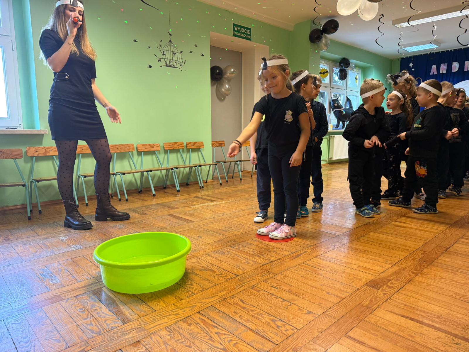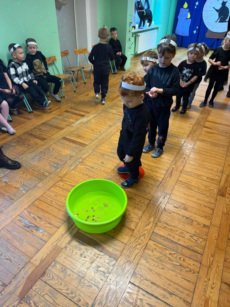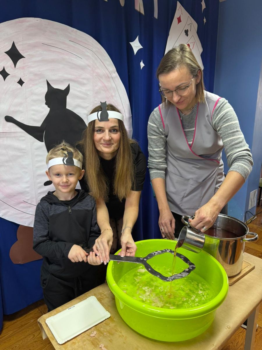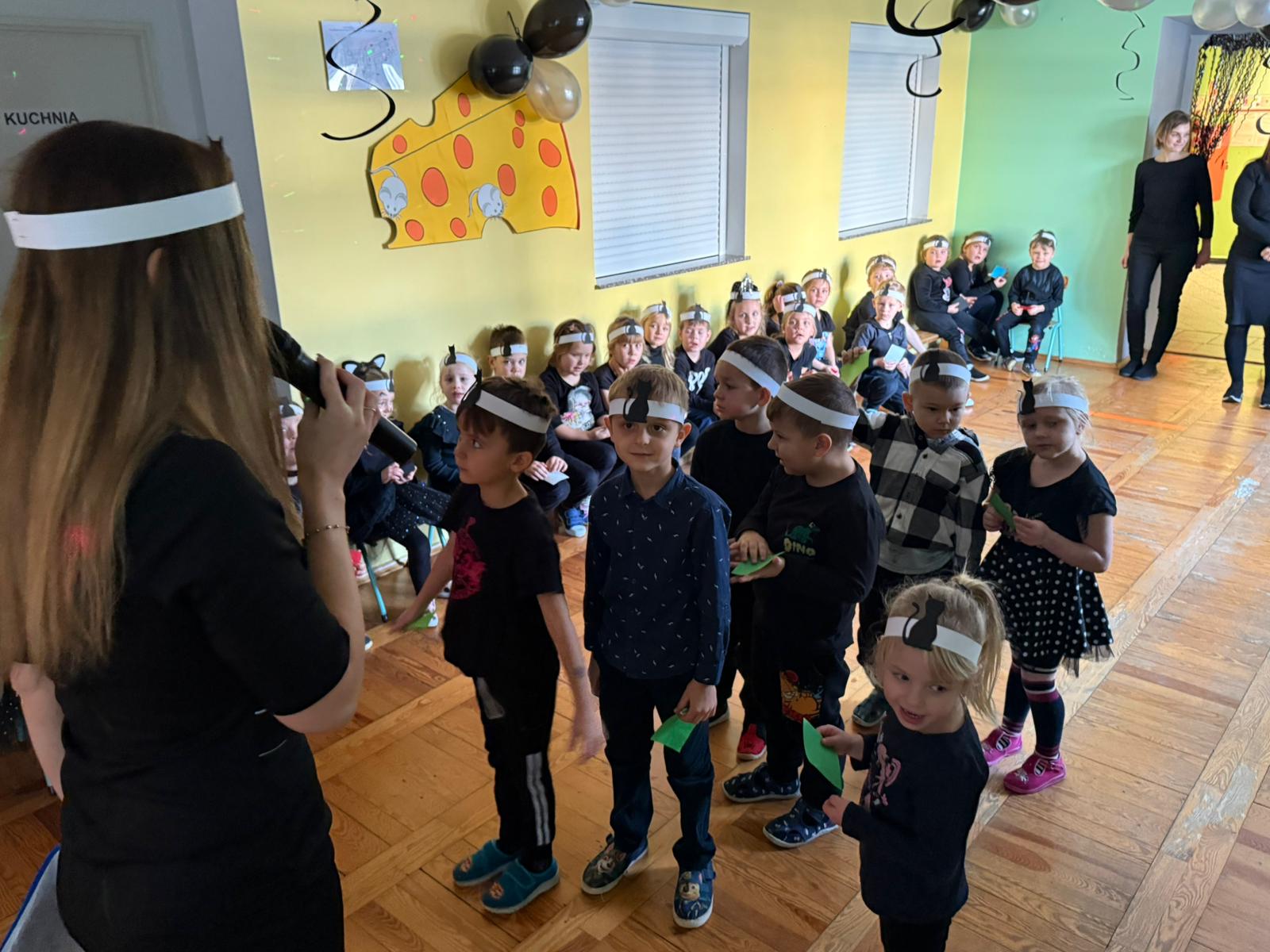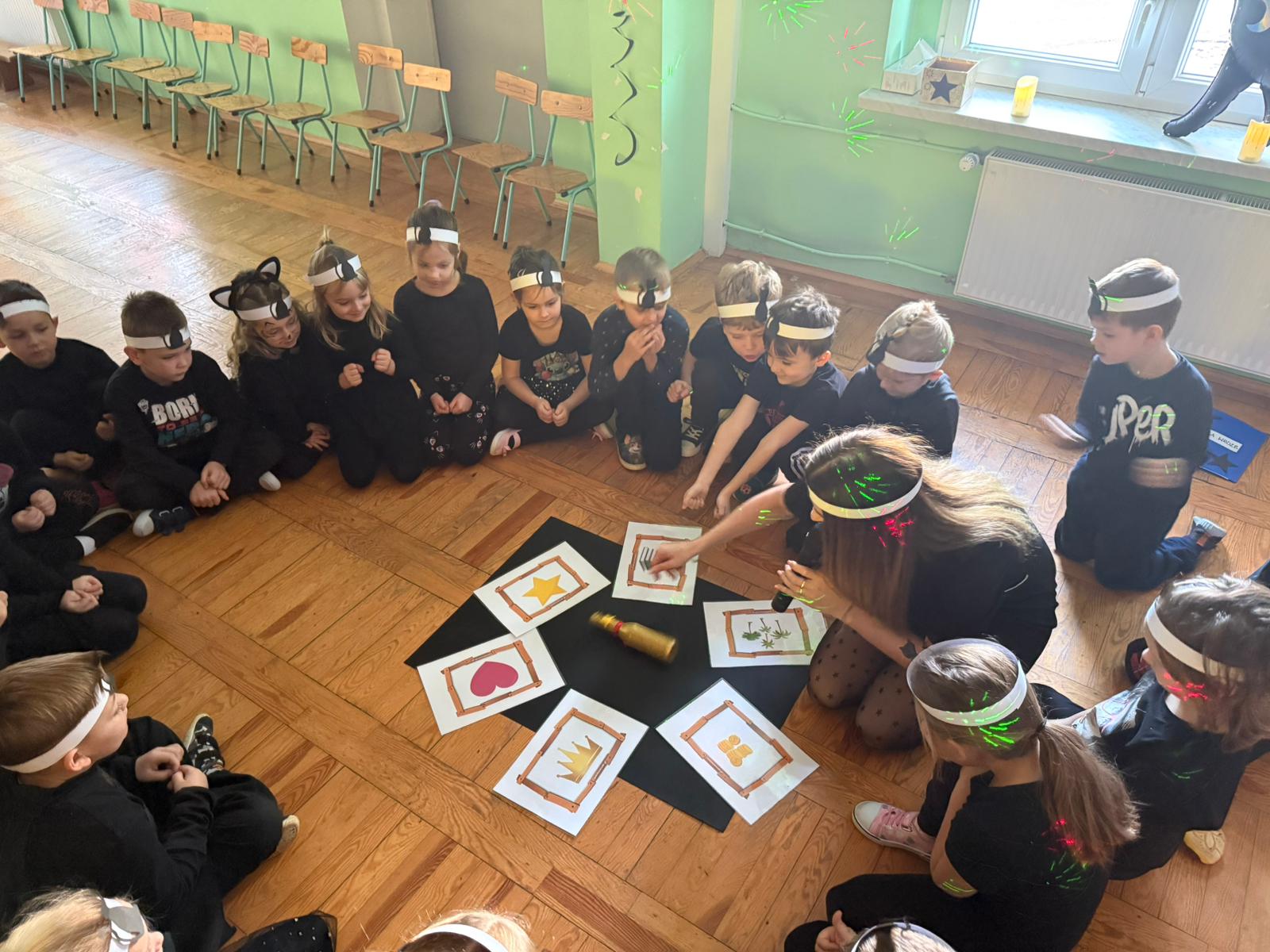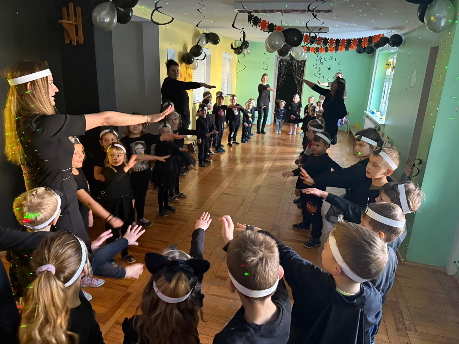 28 listopada w naszym przedszkolu odbyły się radosne i pełne magii Andrzejki. Od samego rana dzieci przeniosły się w świat wróżb, czarów i dobrej zabawy. Na początku spotkania przedszkolaki poznały tradycje andrzejkowe – dowiedziały się, skąd pochodzi zwyczaj wróżenia i dlaczego właśnie w tym dniu próbuje się zajrzeć w przyszłość. Dzieci słuchały z ogromną uwagą, a w sali z każdą chwilą narastała magiczna atmosfera. Następnie obie grupy udały się do przygotowanego „czarodziejskiego kącika”. Tam, przy zaczarowanej kuli, uczyły się specjalnego zaklęcia. Gdy wspólnie je wypowiedziały i kula „ożyła”, mieniąc się kolorami, dzieci mogły wreszcie przystąpić do wyczekiwanych wróżb. Rozpoczęło się odkrywanie przyszłości poprzez zabawy: „Kolory”, „Czarodziejska butelka”, „Grosiki” oraz „Kim będę w przyszłości?”. Wszystkie wróżby wywoływały u dzieci radość i uśmiech na twarzach. Następnie przedszkolaki ruszyły do tańca, bawiąc się wesoło przy ulubionych utworach z dziecięcego repertuaru. Wysłuchały opowiadania „O kotku, który szukał czarnego mleka”, a następnie z wielkim zaangażowaniem odpowiadały na pytania dotyczące treści. Nie zabrakło także zabaw animacyjno-ruchowych, m.in. z liną oraz pełnej emocji zabawy sprawnościowej „Kotki łapią myszki”. Po tylu atrakcjach na dzieci czekał słodko-owocowy poczęstunek, który dodał im energii na kolejne aktywności. Tradycyjne lanie wosku przez ucho czarodziejskiego klucza było kolejnym punktem programu. Powstające z wosku kształty pobudzały wyobraźnię i zachęcały do przepowiadania przyszłości. Na zakończenie wszyscy wykonali urocze czarne kotki z papierowych talerzyków – kreatywne prace plastyczne, które stały się pamiątką tego wyjątkowego, pełnego magii dnia.