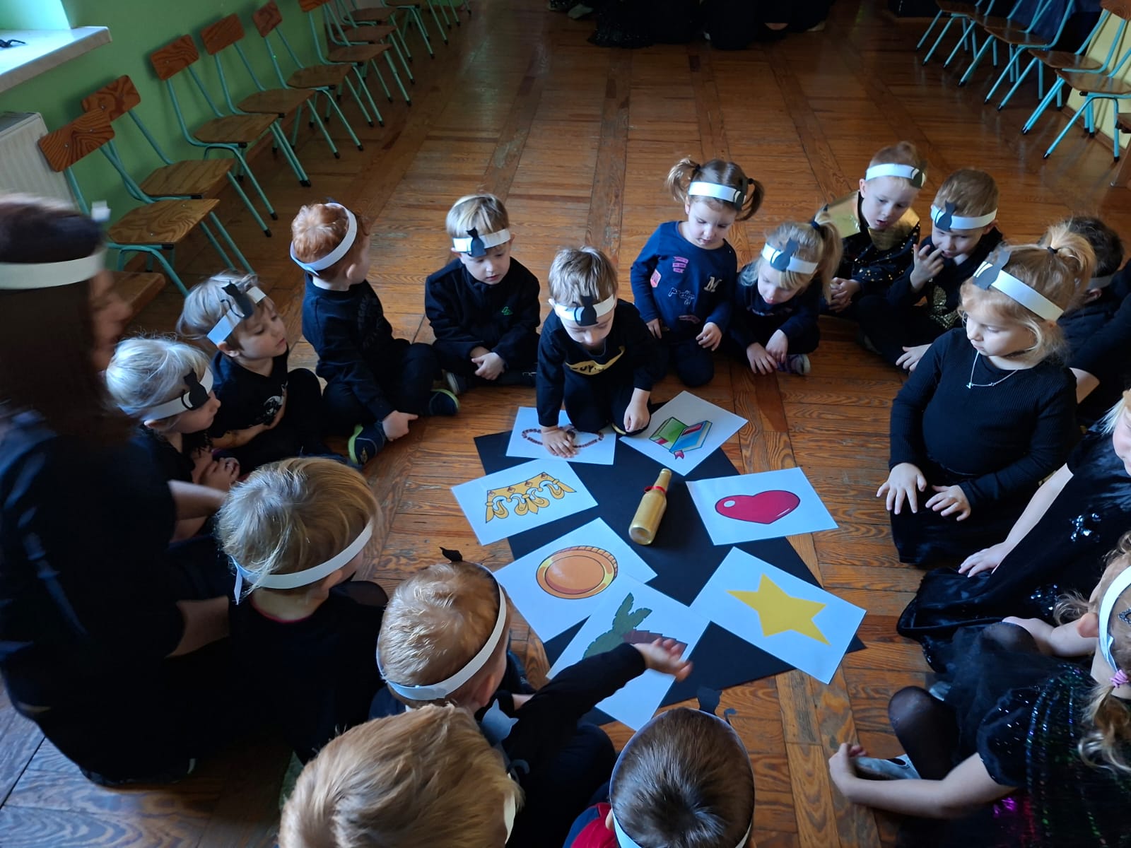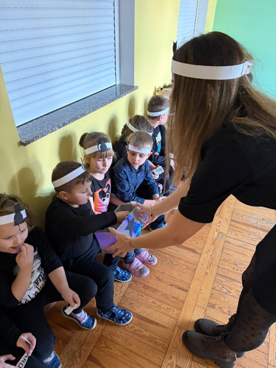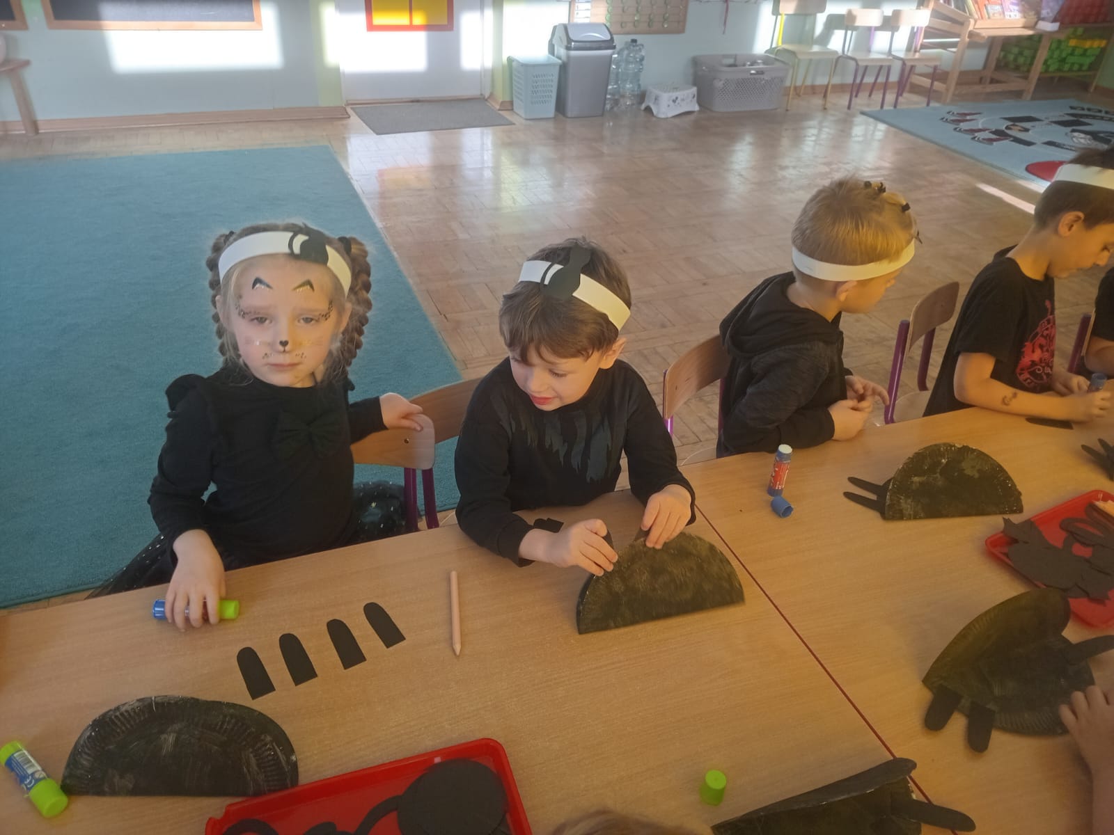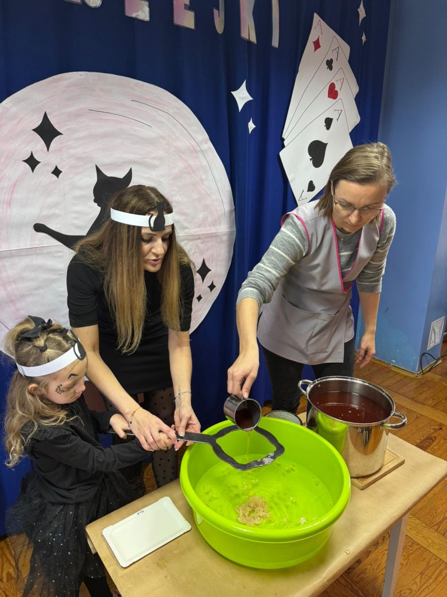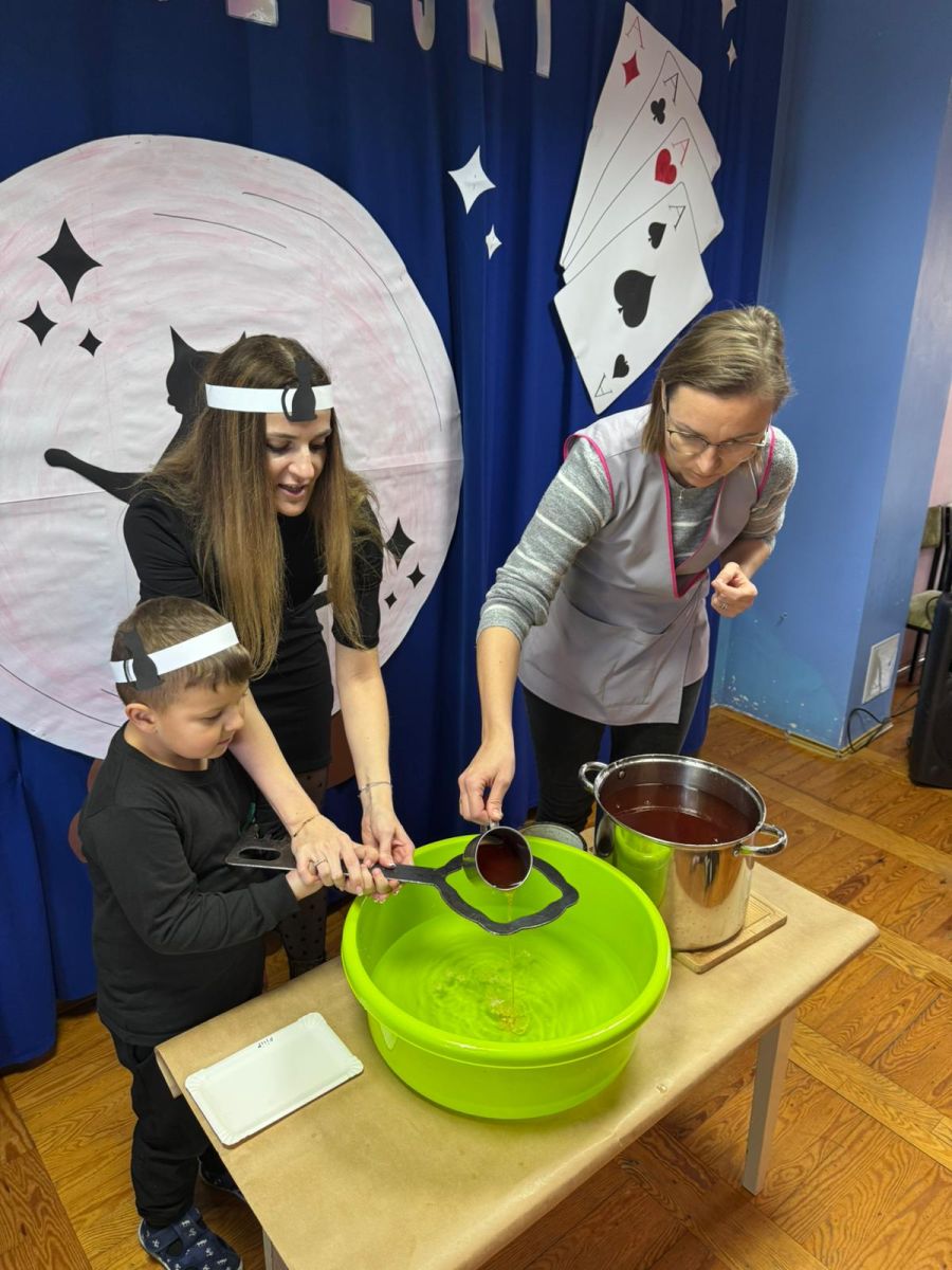28 listopada w naszym przedszkolu odbyły się radosne i pełne magii Andrzejki. Od samego rana dzieci przeniosły się w świat wróżb, czarów i dobrej zabawy. Na początku spotkania przedszkolaki poznały tradycje andrzejkowe – dowiedziały się, skąd pochodzi zwyczaj wróżenia i dlaczego właśnie w tym dniu próbuje się zajrzeć w przyszłość. Dzieci słuchały z ogromną uwagą, a w sali z każdą chwilą narastała magiczna atmosfera. Następnie obie grupy udały się do przygotowanego „czarodziejskiego kącika”. Tam, przy zaczarowanej kuli, uczyły się specjalnego zaklęcia. Gdy wspólnie je wypowiedziały i kula „ożyła”, mieniąc się kolorami, dzieci mogły wreszcie przystąpić do wyczekiwanych wróżb. Rozpoczęło się odkrywanie przyszłości poprzez zabawy: „Kolory”, „Czarodziejska butelka”, „Grosiki” oraz „Kim będę w przyszłości?”. Wszystkie wróżby wywoływały u dzieci radość i uśmiech na twarzach. Następnie przedszkolaki ruszyły do tańca, bawiąc się wesoło przy ulubionych utworach z dziecięcego repertuaru. Wysłuchały opowiadania „O kotku, który szukał czarnego mleka”, a następnie z wielkim zaangażowaniem odpowiadały na pytania dotyczące treści. Nie zabrakło także zabaw animacyjno-ruchowych, m.in. z liną oraz pełnej emocji zabawy sprawnościowej „Kotki łapią myszki”. Po tylu atrakcjach na dzieci czekał słodko-owocowy poczęstunek, który dodał im energii na kolejne aktywności. Tradycyjne lanie wosku przez ucho czarodziejskiego klucza było kolejnym punktem programu. Powstające z wosku kształty pobudzały wyobraźnię i zachęcały do przepowiadania przyszłości. Na zakończenie wszyscy wykonali urocze czarne kotki z papierowych talerzyków – kreatywne prace plastyczne, które stały się pamiątką tego wyjątkowego, pełnego magii dnia.