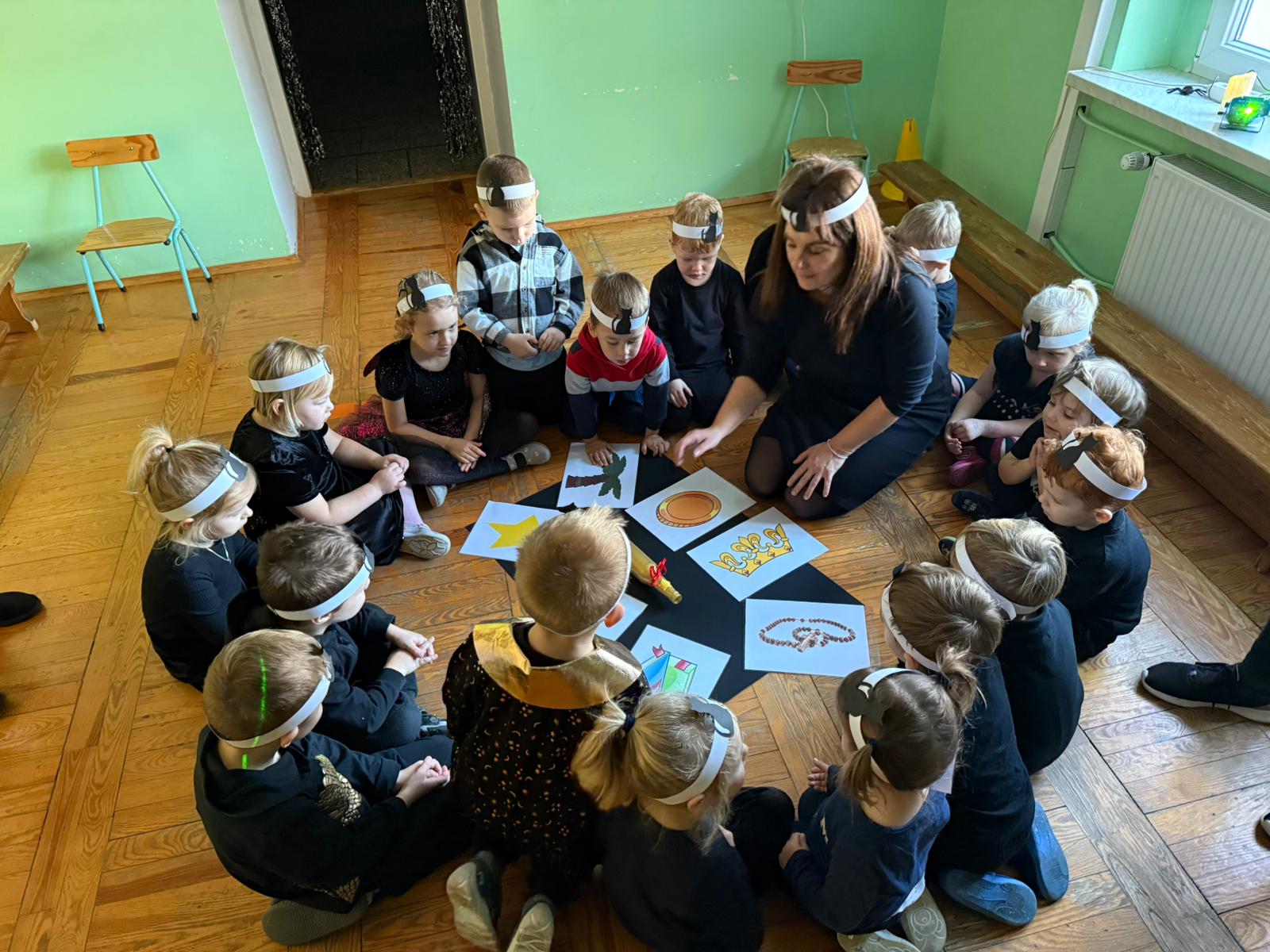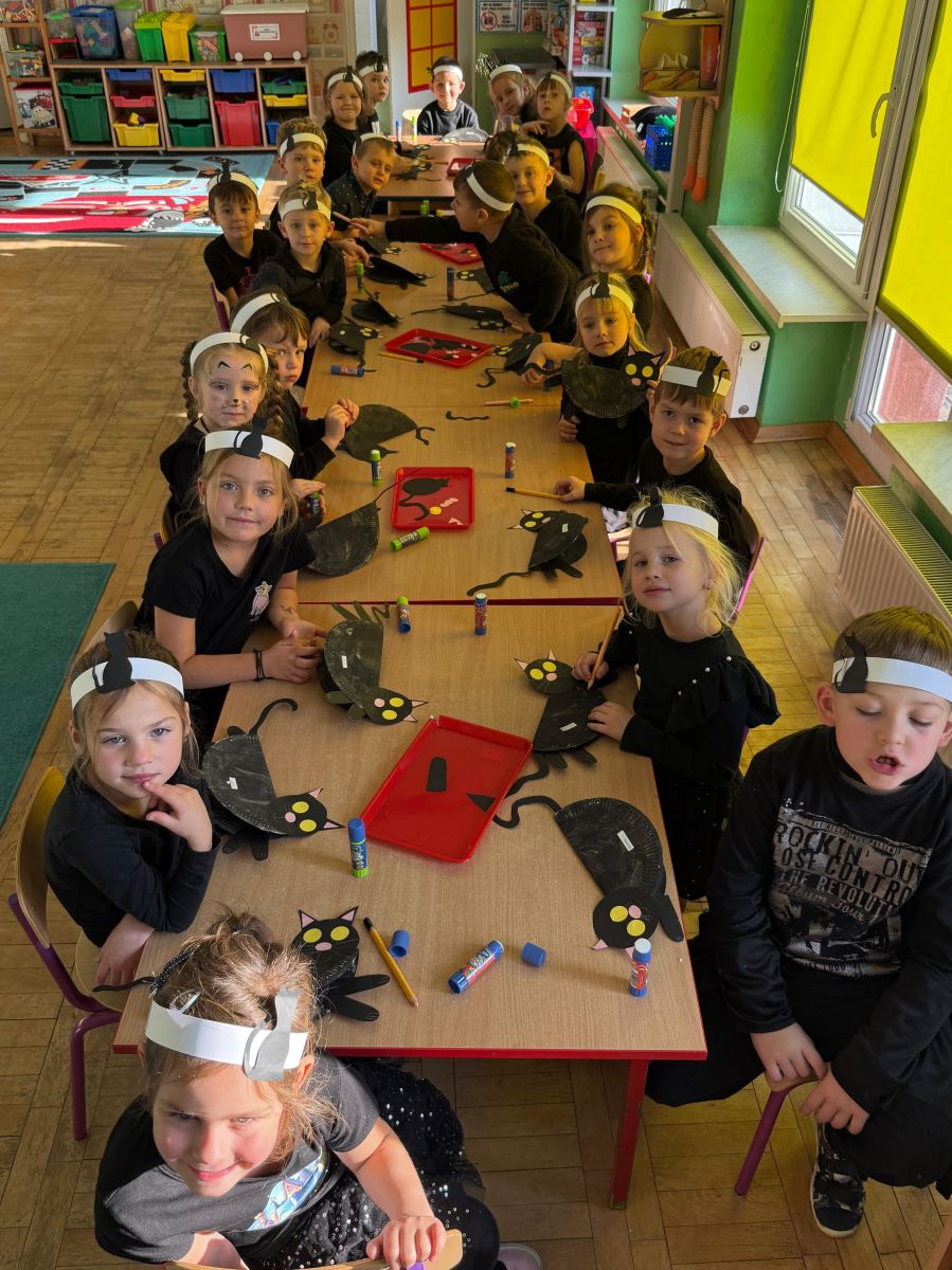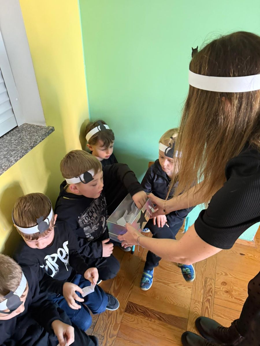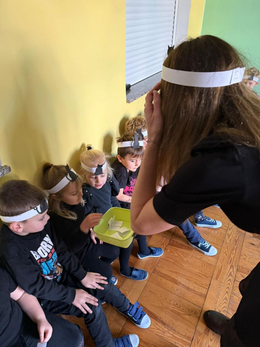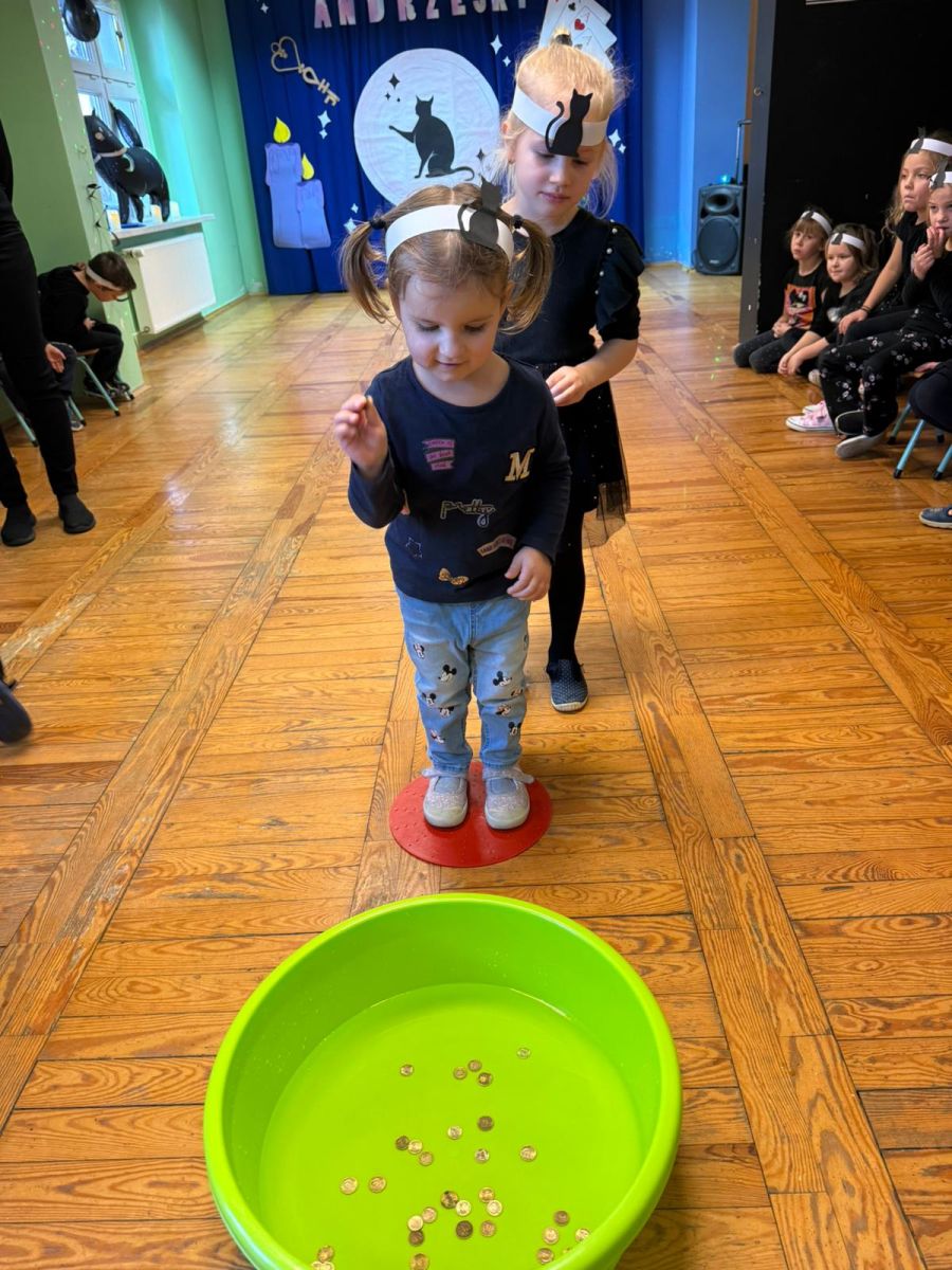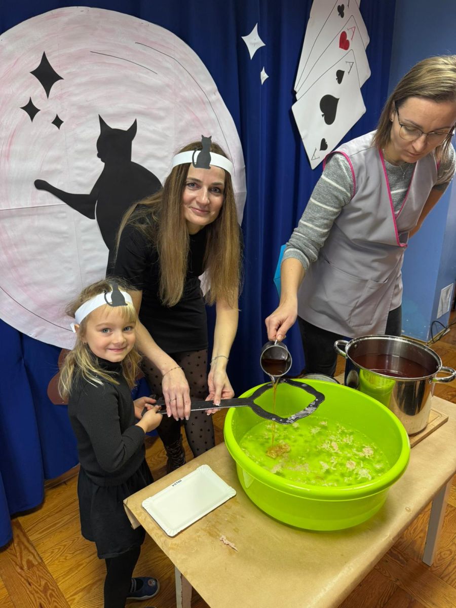 28 listopada w naszym przedszkolu odbyły się radosne i pełne magii Andrzejki. Od samego rana dzieci przeniosły się w świat wróżb, czarów i dobrej zabawy. Na początku spotkania przedszkolaki poznały tradycje andrzejkowe – dowiedziały się, skąd pochodzi zwyczaj wróżenia i dlaczego właśnie w tym dniu próbuje się zajrzeć w przyszłość. Dzieci słuchały z ogromną uwagą, a w sali z każdą chwilą narastała magiczna atmosfera. Następnie obie grupy udały się do przygotowanego „czarodziejskiego kącika”. Tam, przy zaczarowanej kuli, uczyły się specjalnego zaklęcia. Gdy wspólnie je wypowiedziały i kula „ożyła”, mieniąc się kolorami, dzieci mogły wreszcie przystąpić do wyczekiwanych wróżb. Rozpoczęło się odkrywanie przyszłości poprzez zabawy: „Kolory”, „Czarodziejska butelka”, „Grosiki” oraz „Kim będę w przyszłości?”. Wszystkie wróżby wywoływały u dzieci radość i uśmiech na twarzach. Następnie przedszkolaki ruszyły do tańca, bawiąc się wesoło przy ulubionych utworach z dziecięcego repertuaru. Wysłuchały opowiadania „O kotku, który szukał czarnego mleka”, a następnie z wielkim zaangażowaniem odpowiadały na pytania dotyczące treści. Nie zabrakło także zabaw animacyjno-ruchowych, m.in. z liną oraz pełnej emocji zabawy sprawnościowej „Kotki łapią myszki”. Po tylu atrakcjach na dzieci czekał słodko-owocowy poczęstunek, który dodał im energii na kolejne aktywności. Tradycyjne lanie wosku przez ucho czarodziejskiego klucza było kolejnym punktem programu. Powstające z wosku kształty pobudzały wyobraźnię i zachęcały do przepowiadania przyszłości. Na zakończenie wszyscy wykonali urocze czarne kotki z papierowych talerzyków – kreatywne prace plastyczne, które stały się pamiątką tego wyjątkowego, pełnego magii dnia.