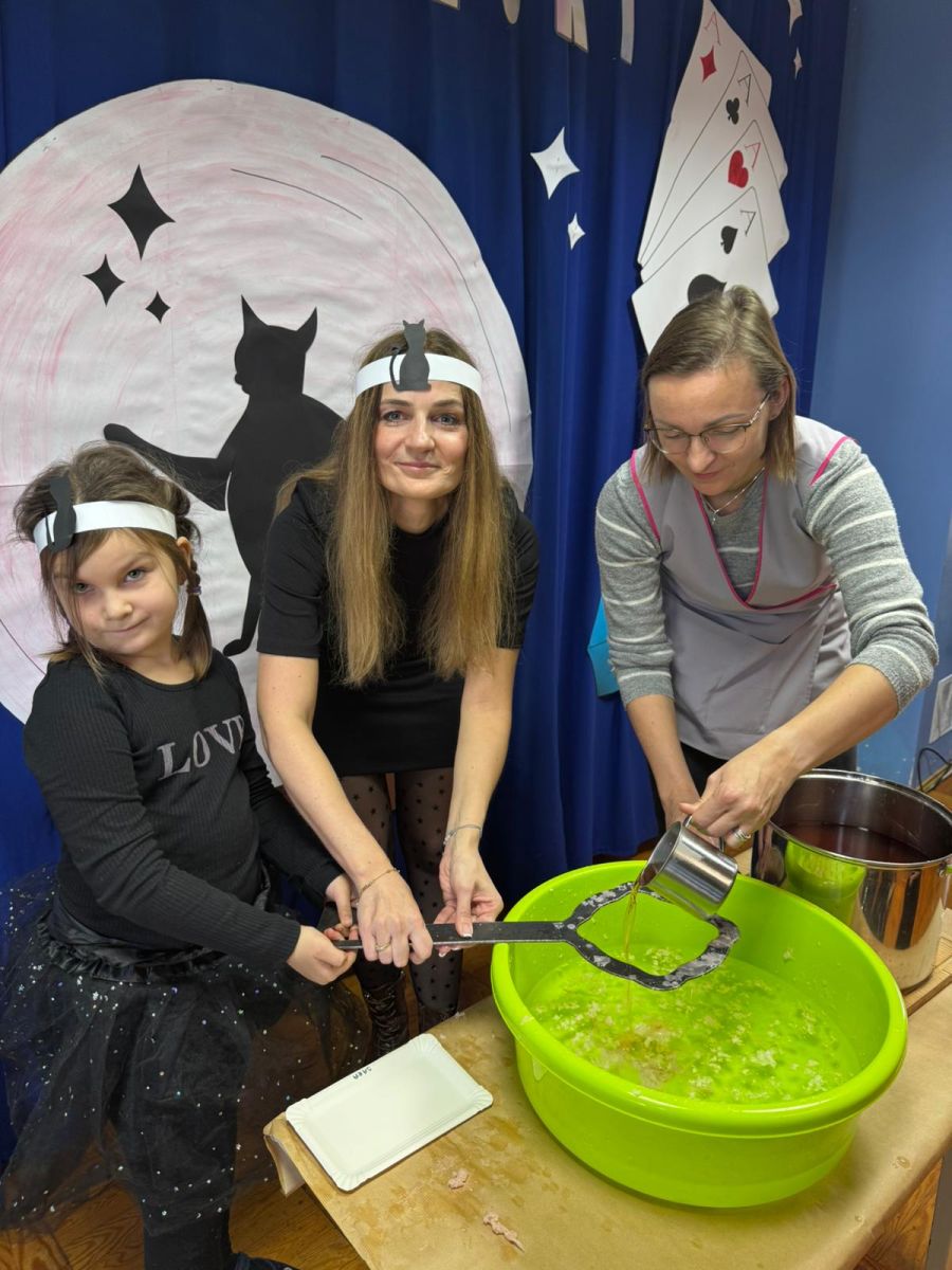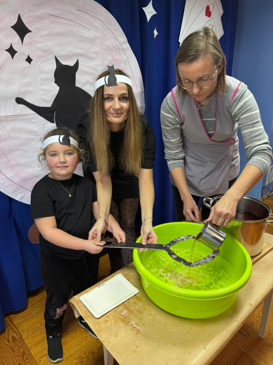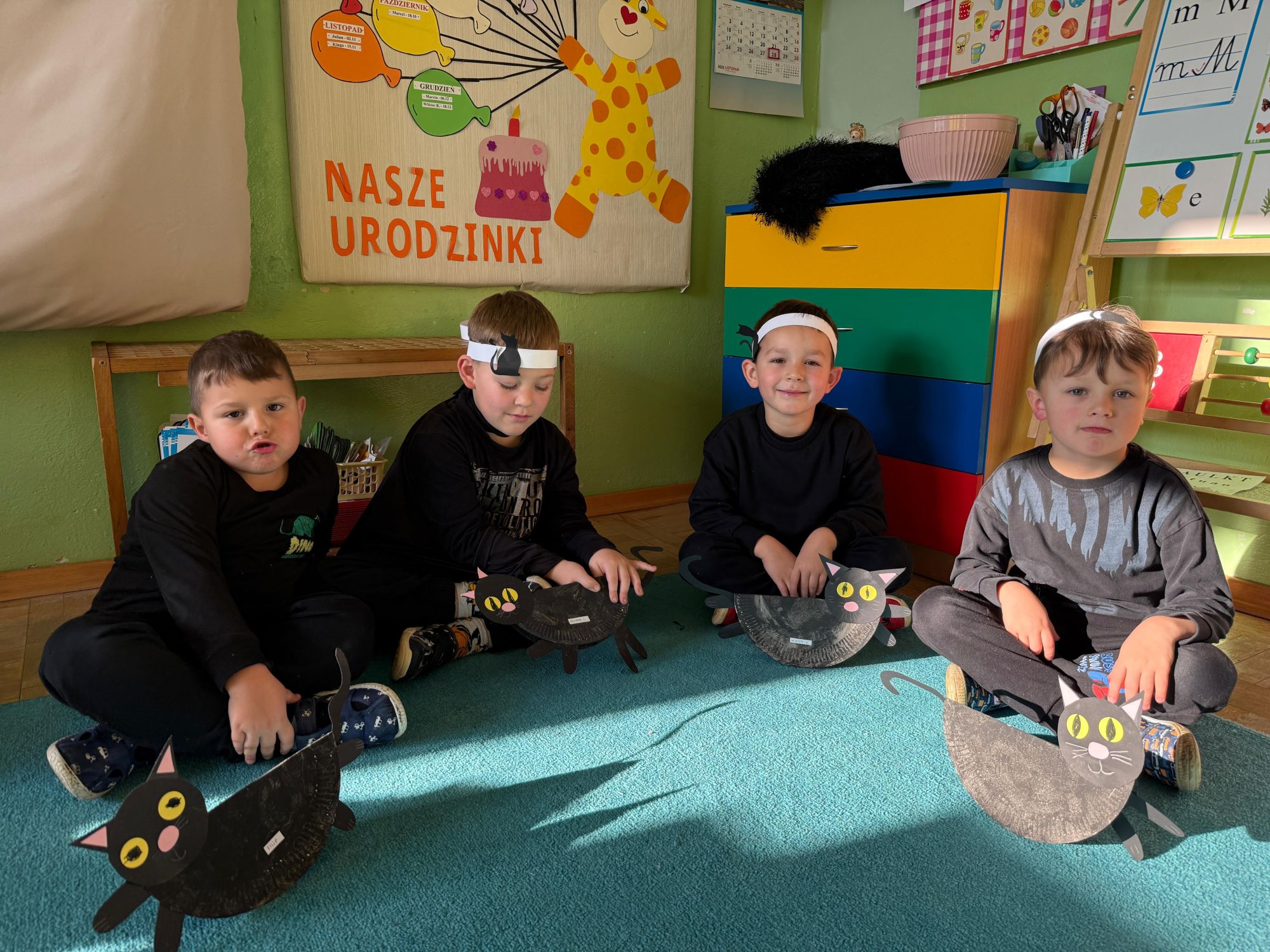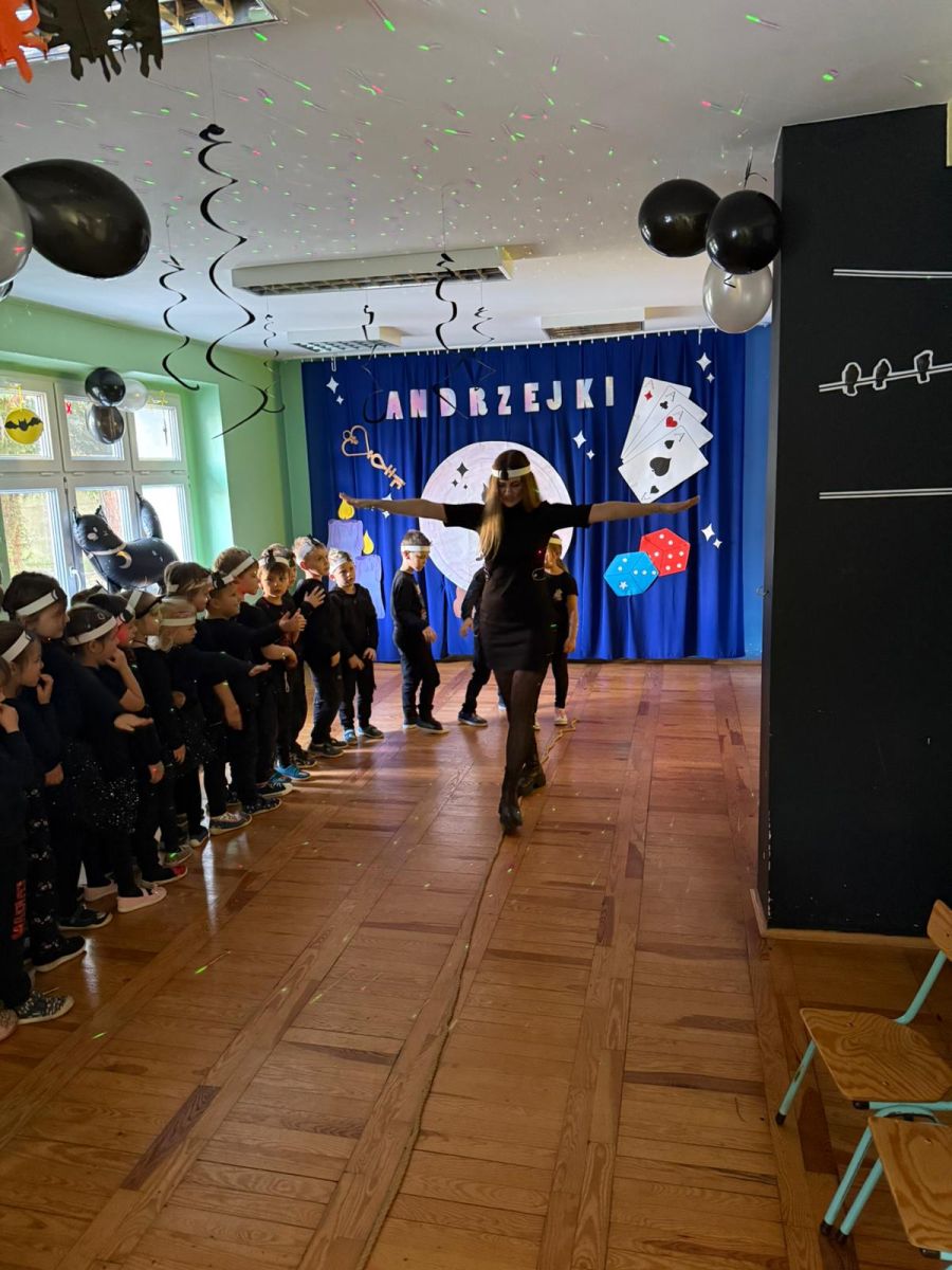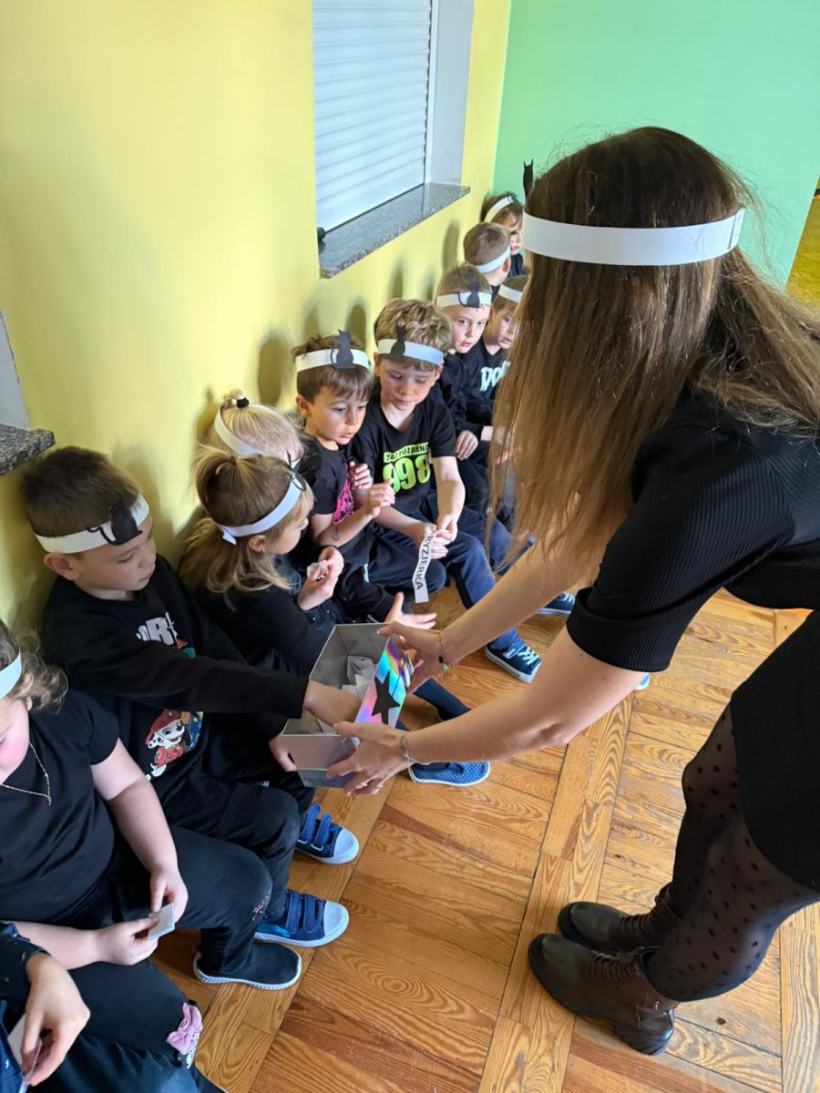 28 listopada w naszym przedszkolu odbyły się radosne i pełne magii Andrzejki. Od samego rana dzieci przeniosły się w świat wróżb, czarów i dobrej zabawy. Na początku spotkania przedszkolaki poznały tradycje andrzejkowe – dowiedziały się, skąd pochodzi zwyczaj wróżenia i dlaczego właśnie w tym dniu próbuje się zajrzeć w przyszłość. Dzieci słuchały z ogromną uwagą, a w sali z każdą chwilą narastała magiczna atmosfera. Następnie obie grupy udały się do przygotowanego „czarodziejskiego kącika”. Tam, przy zaczarowanej kuli, uczyły się specjalnego zaklęcia. Gdy wspólnie je wypowiedziały i kula „ożyła”, mieniąc się kolorami, dzieci mogły wreszcie przystąpić do wyczekiwanych wróżb. Rozpoczęło się odkrywanie przyszłości poprzez zabawy: „Kolory”, „Czarodziejska butelka”, „Grosiki” oraz „Kim będę w przyszłości?”. Wszystkie wróżby wywoływały u dzieci radość i uśmiech na twarzach. Następnie przedszkolaki ruszyły do tańca, bawiąc się wesoło przy ulubionych utworach z dziecięcego repertuaru. Wysłuchały opowiadania „O kotku, który szukał czarnego mleka”, a następnie z wielkim zaangażowaniem odpowiadały na pytania dotyczące treści. Nie zabrakło także zabaw animacyjno-ruchowych, m.in. z liną oraz pełnej emocji zabawy sprawnościowej „Kotki łapią myszki”. Po tylu atrakcjach na dzieci czekał słodko-owocowy poczęstunek, który dodał im energii na kolejne aktywności. Tradycyjne lanie wosku przez ucho czarodziejskiego klucza było kolejnym punktem programu. Powstające z wosku kształty pobudzały wyobraźnię i zachęcały do przepowiadania przyszłości. Na zakończenie wszyscy wykonali urocze czarne kotki z papierowych talerzyków – kreatywne prace plastyczne, które stały się pamiątką tego wyjątkowego, pełnego magii dnia.