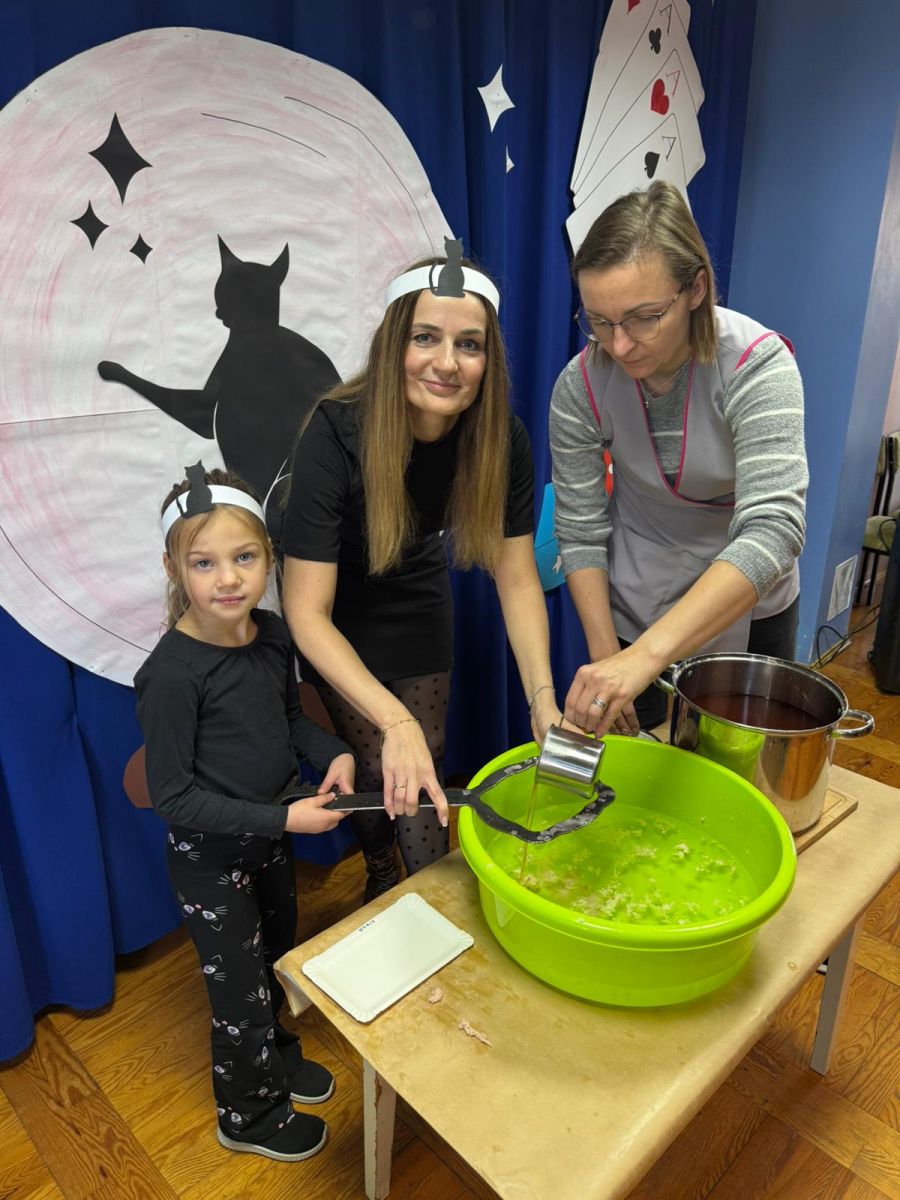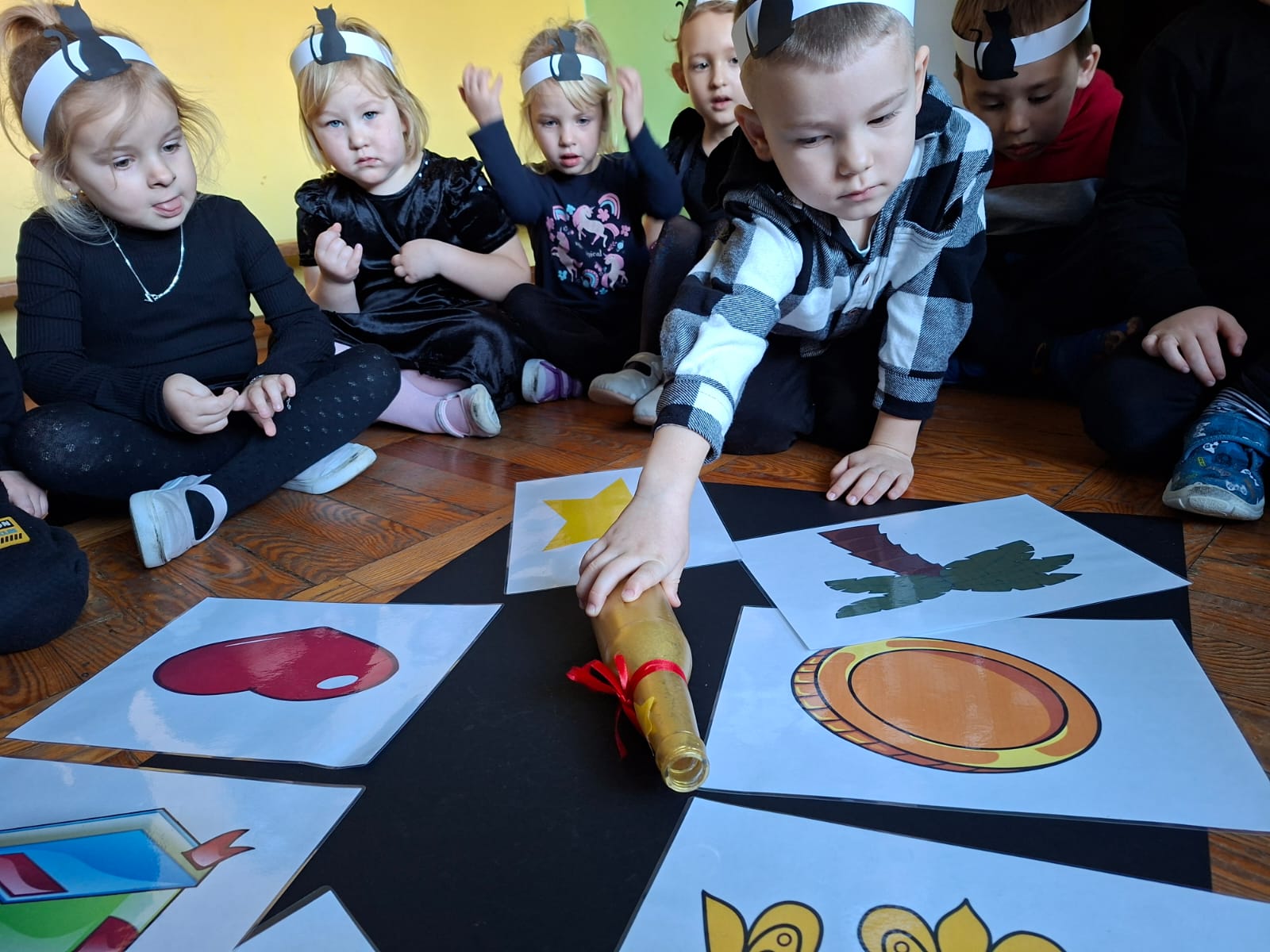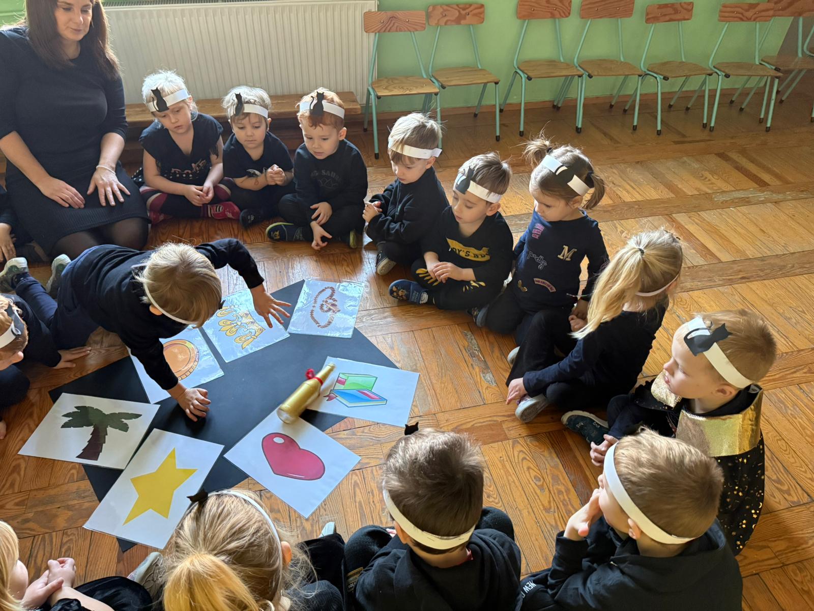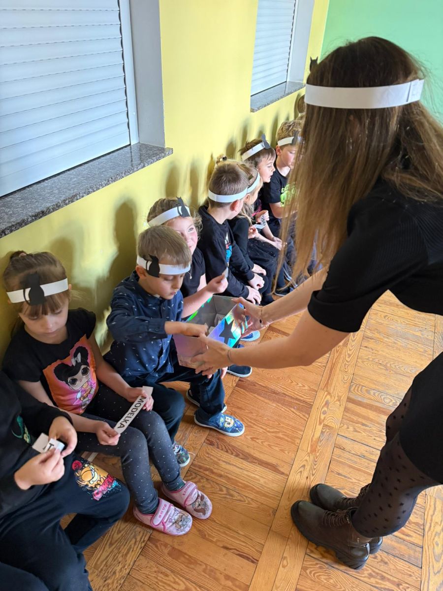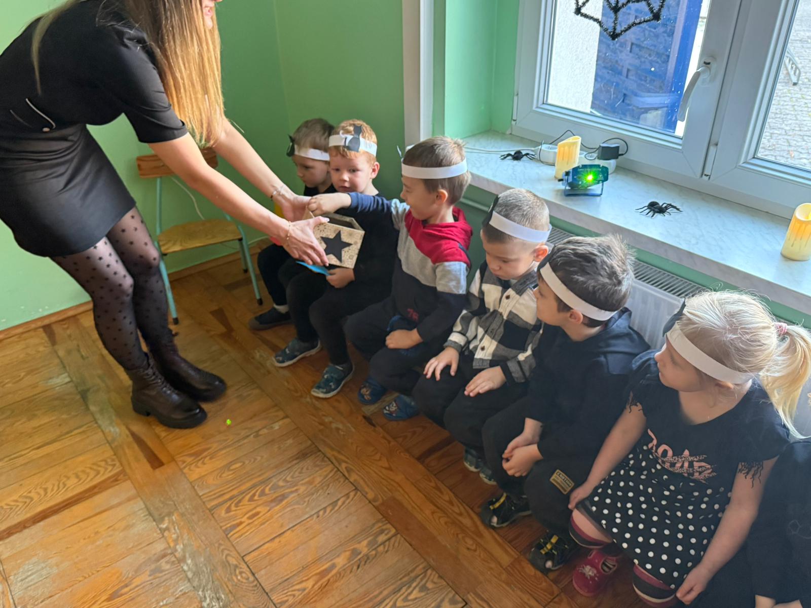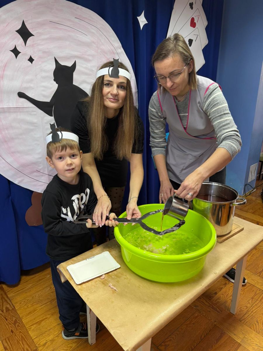 28 listopada w naszym przedszkolu odbyły się radosne i pełne magii Andrzejki. Od samego rana dzieci przeniosły się w świat wróżb, czarów i dobrej zabawy. Na początku spotkania przedszkolaki poznały tradycje andrzejkowe – dowiedziały się, skąd pochodzi zwyczaj wróżenia i dlaczego właśnie w tym dniu próbuje się zajrzeć w przyszłość. Dzieci słuchały z ogromną uwagą, a w sali z każdą chwilą narastała magiczna atmosfera. Następnie obie grupy udały się do przygotowanego „czarodziejskiego kącika”. Tam, przy zaczarowanej kuli, uczyły się specjalnego zaklęcia. Gdy wspólnie je wypowiedziały i kula „ożyła”, mieniąc się kolorami, dzieci mogły wreszcie przystąpić do wyczekiwanych wróżb. Rozpoczęło się odkrywanie przyszłości poprzez zabawy: „Kolory”, „Czarodziejska butelka”, „Grosiki” oraz „Kim będę w przyszłości?”. Wszystkie wróżby wywoływały u dzieci radość i uśmiech na twarzach. Następnie przedszkolaki ruszyły do tańca, bawiąc się wesoło przy ulubionych utworach z dziecięcego repertuaru. Wysłuchały opowiadania „O kotku, który szukał czarnego mleka”, a następnie z wielkim zaangażowaniem odpowiadały na pytania dotyczące treści. Nie zabrakło także zabaw animacyjno-ruchowych, m.in. z liną oraz pełnej emocji zabawy sprawnościowej „Kotki łapią myszki”. Po tylu atrakcjach na dzieci czekał słodko-owocowy poczęstunek, który dodał im energii na kolejne aktywności. Tradycyjne lanie wosku przez ucho czarodziejskiego klucza było kolejnym punktem programu. Powstające z wosku kształty pobudzały wyobraźnię i zachęcały do przepowiadania przyszłości. Na zakończenie wszyscy wykonali urocze czarne kotki z papierowych talerzyków – kreatywne prace plastyczne, które stały się pamiątką tego wyjątkowego, pełnego magii dnia.