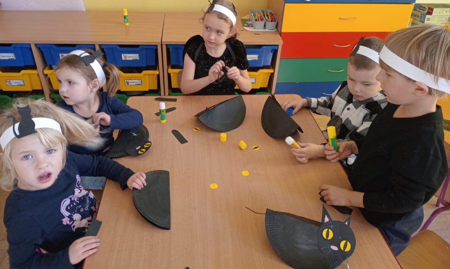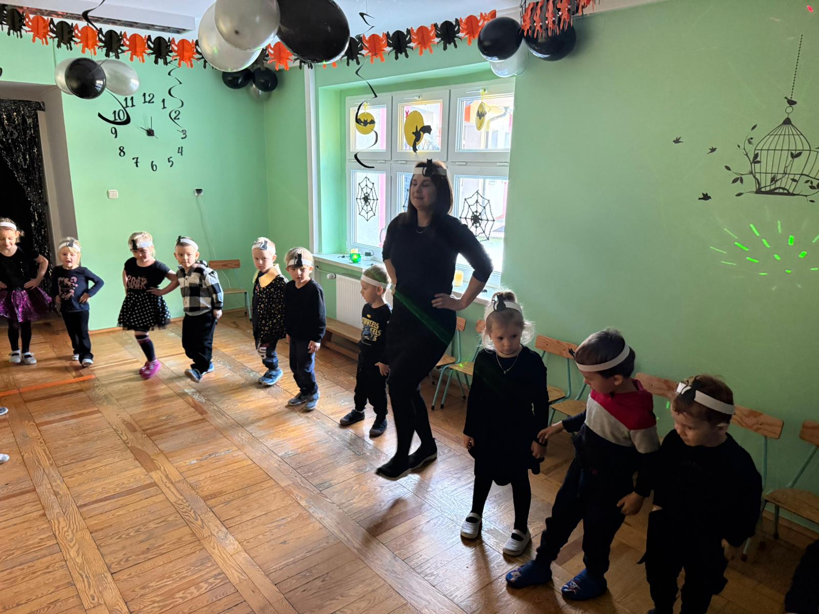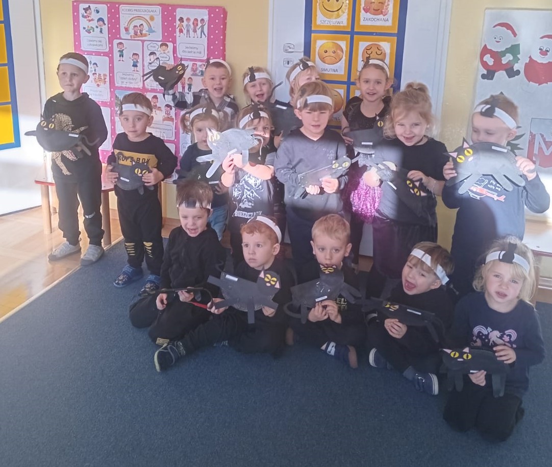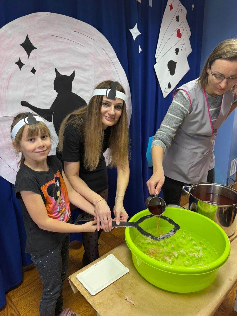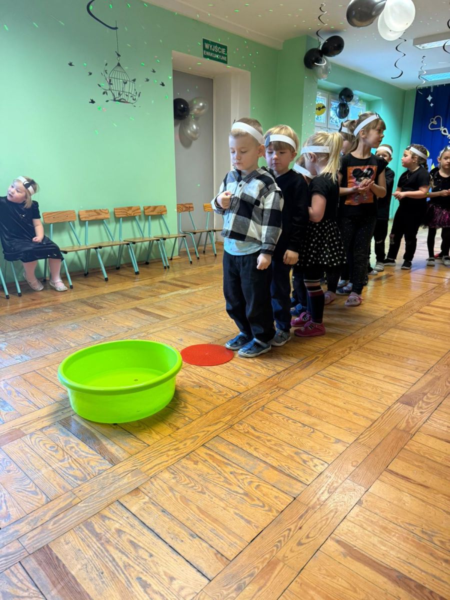 28 listopada w naszym przedszkolu odbyły się radosne i pełne magii Andrzejki. Od samego rana dzieci przeniosły się w świat wróżb, czarów i dobrej zabawy. Na początku spotkania przedszkolaki poznały tradycje andrzejkowe – dowiedziały się, skąd pochodzi zwyczaj wróżenia i dlaczego właśnie w tym dniu próbuje się zajrzeć w przyszłość. Dzieci słuchały z ogromną uwagą, a w sali z każdą chwilą narastała magiczna atmosfera. Następnie obie grupy udały się do przygotowanego „czarodziejskiego kącika”. Tam, przy zaczarowanej kuli, uczyły się specjalnego zaklęcia. Gdy wspólnie je wypowiedziały i kula „ożyła”, mieniąc się kolorami, dzieci mogły wreszcie przystąpić do wyczekiwanych wróżb. Rozpoczęło się odkrywanie przyszłości poprzez zabawy: „Kolory”, „Czarodziejska butelka”, „Grosiki” oraz „Kim będę w przyszłości?”. Wszystkie wróżby wywoływały u dzieci radość i uśmiech na twarzach. Następnie przedszkolaki ruszyły do tańca, bawiąc się wesoło przy ulubionych utworach z dziecięcego repertuaru. Wysłuchały opowiadania „O kotku, który szukał czarnego mleka”, a następnie z wielkim zaangażowaniem odpowiadały na pytania dotyczące treści. Nie zabrakło także zabaw animacyjno-ruchowych, m.in. z liną oraz pełnej emocji zabawy sprawnościowej „Kotki łapią myszki”. Po tylu atrakcjach na dzieci czekał słodko-owocowy poczęstunek, który dodał im energii na kolejne aktywności. Tradycyjne lanie wosku przez ucho czarodziejskiego klucza było kolejnym punktem programu. Powstające z wosku kształty pobudzały wyobraźnię i zachęcały do przepowiadania przyszłości. Na zakończenie wszyscy wykonali urocze czarne kotki z papierowych talerzyków – kreatywne prace plastyczne, które stały się pamiątką tego wyjątkowego, pełnego magii dnia.