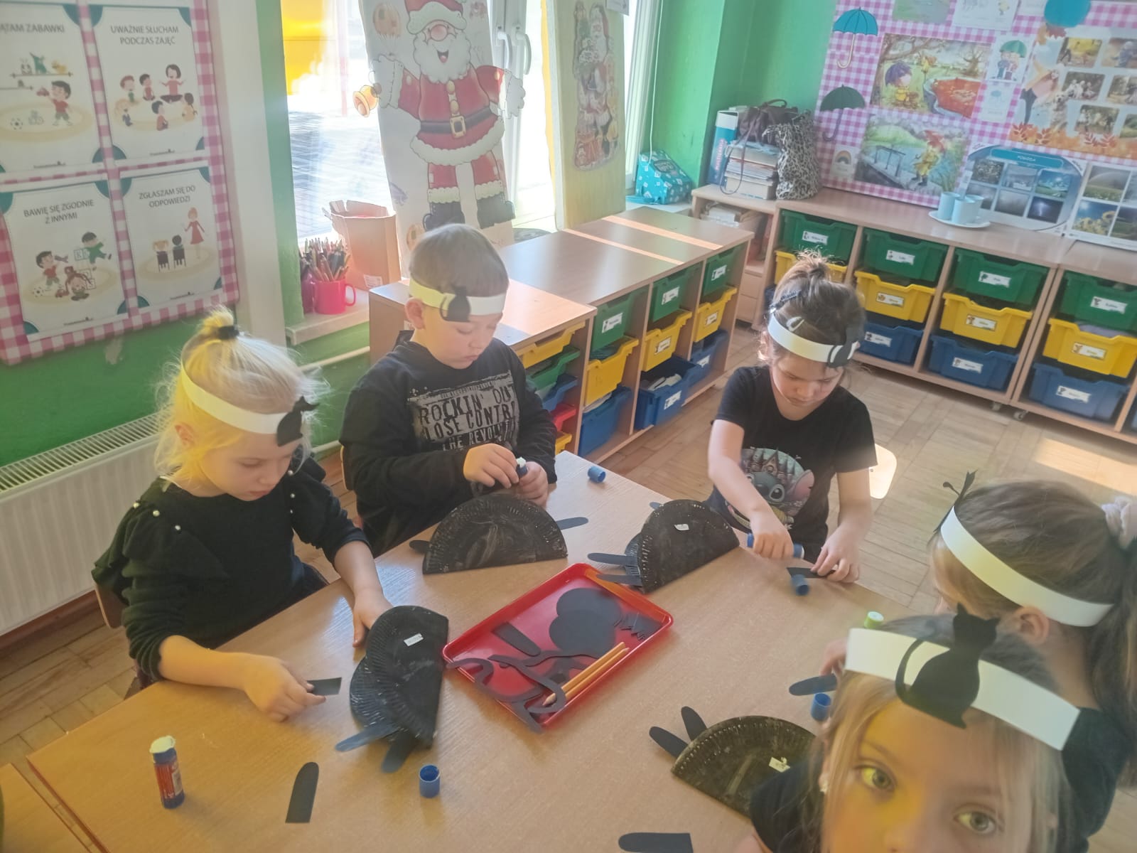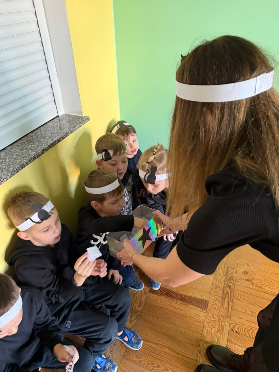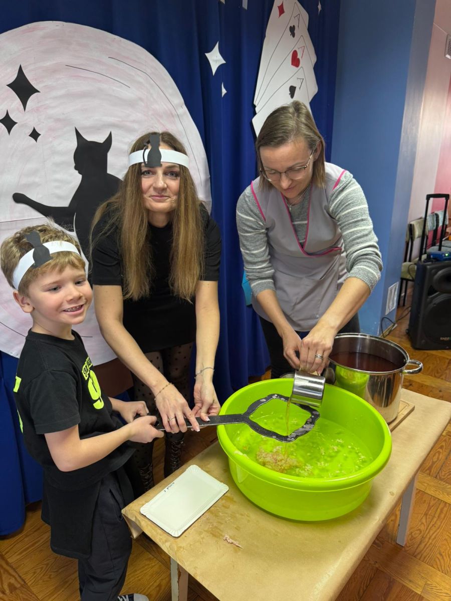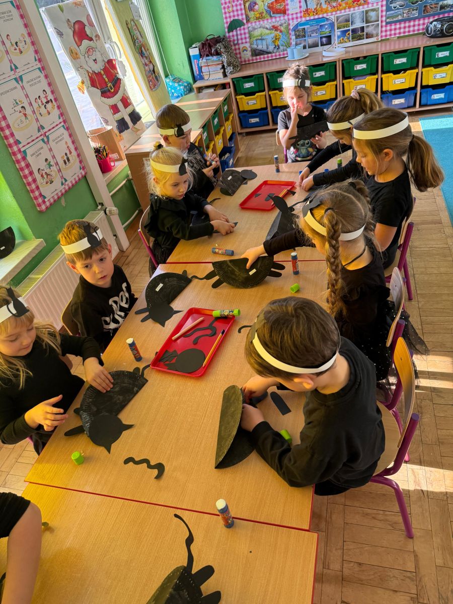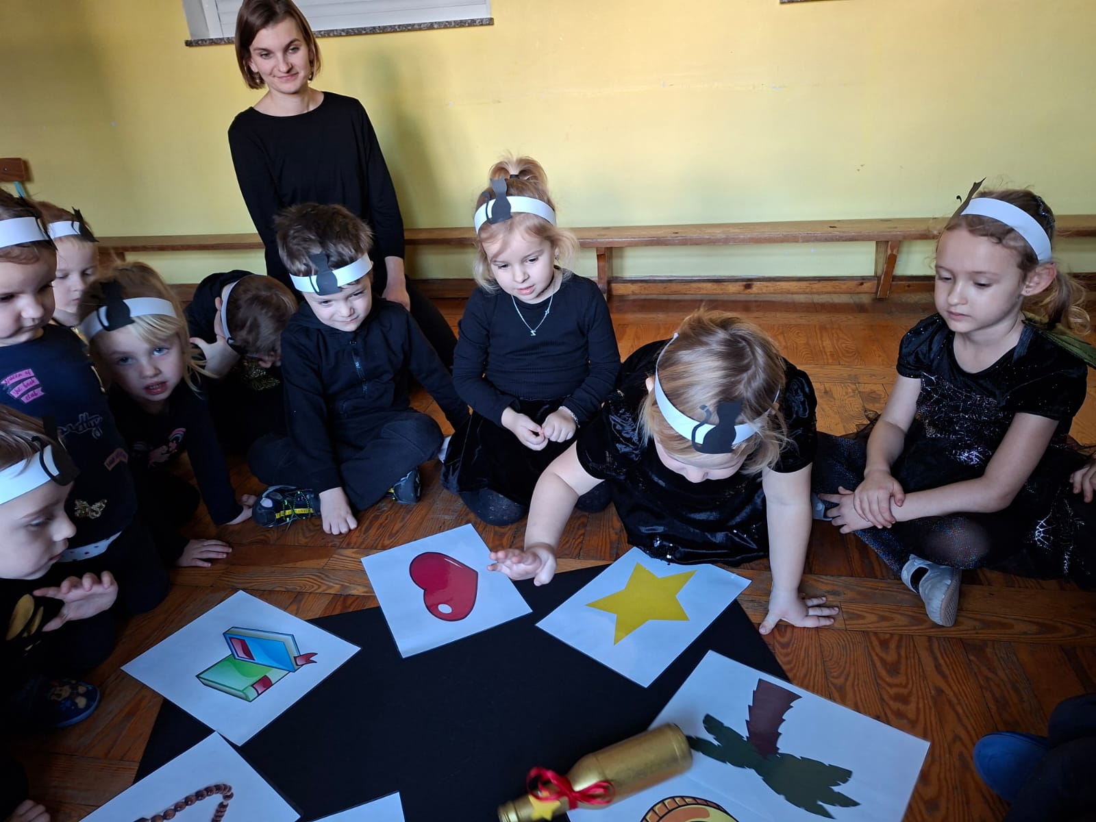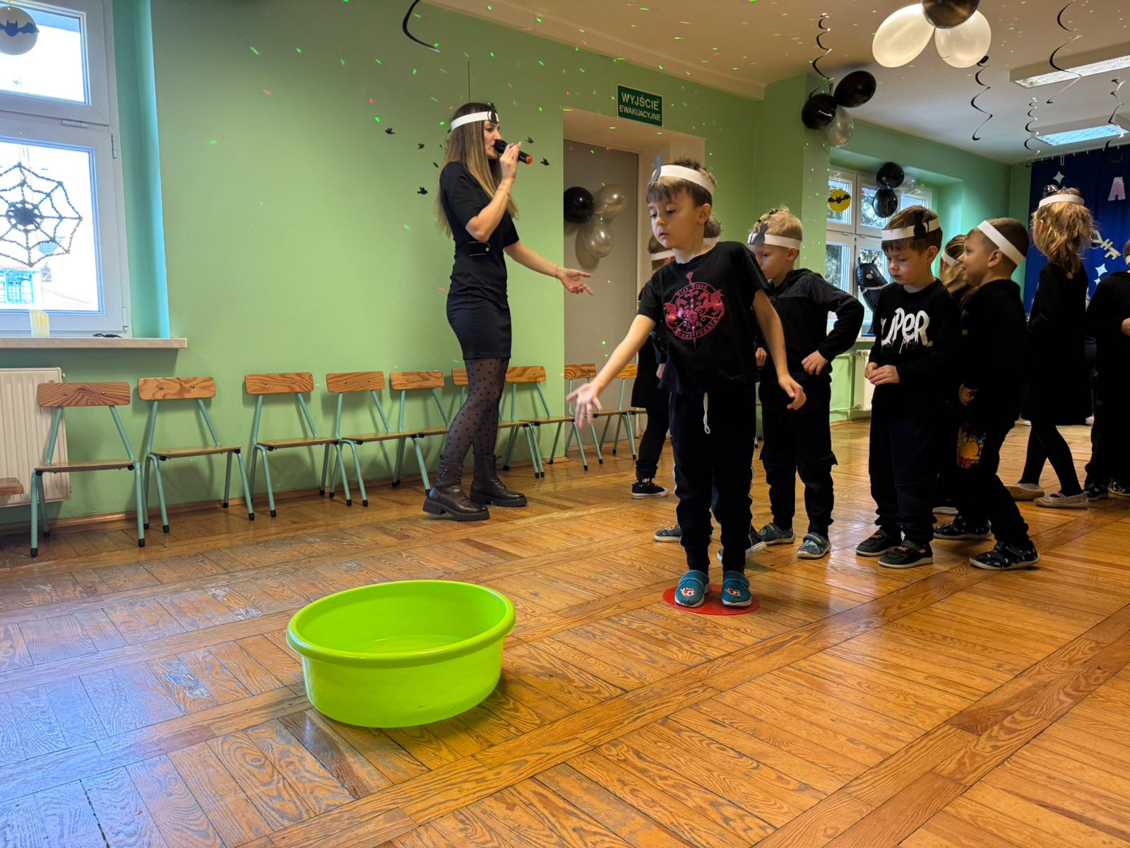 28 listopada w naszym przedszkolu odbyły się radosne i pełne magii Andrzejki. Od samego rana dzieci przeniosły się w świat wróżb, czarów i dobrej zabawy. Na początku spotkania przedszkolaki poznały tradycje andrzejkowe – dowiedziały się, skąd pochodzi zwyczaj wróżenia i dlaczego właśnie w tym dniu próbuje się zajrzeć w przyszłość. Dzieci słuchały z ogromną uwagą, a w sali z każdą chwilą narastała magiczna atmosfera. Następnie obie grupy udały się do przygotowanego „czarodziejskiego kącika”. Tam, przy zaczarowanej kuli, uczyły się specjalnego zaklęcia. Gdy wspólnie je wypowiedziały i kula „ożyła”, mieniąc się kolorami, dzieci mogły wreszcie przystąpić do wyczekiwanych wróżb. Rozpoczęło się odkrywanie przyszłości poprzez zabawy: „Kolory”, „Czarodziejska butelka”, „Grosiki” oraz „Kim będę w przyszłości?”. Wszystkie wróżby wywoływały u dzieci radość i uśmiech na twarzach. Następnie przedszkolaki ruszyły do tańca, bawiąc się wesoło przy ulubionych utworach z dziecięcego repertuaru. Wysłuchały opowiadania „O kotku, który szukał czarnego mleka”, a następnie z wielkim zaangażowaniem odpowiadały na pytania dotyczące treści. Nie zabrakło także zabaw animacyjno-ruchowych, m.in. z liną oraz pełnej emocji zabawy sprawnościowej „Kotki łapią myszki”. Po tylu atrakcjach na dzieci czekał słodko-owocowy poczęstunek, który dodał im energii na kolejne aktywności. Tradycyjne lanie wosku przez ucho czarodziejskiego klucza było kolejnym punktem programu. Powstające z wosku kształty pobudzały wyobraźnię i zachęcały do przepowiadania przyszłości. Na zakończenie wszyscy wykonali urocze czarne kotki z papierowych talerzyków – kreatywne prace plastyczne, które stały się pamiątką tego wyjątkowego, pełnego magii dnia.
