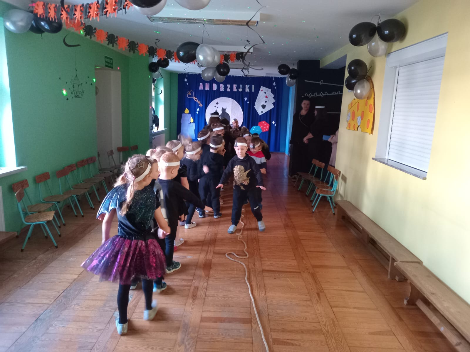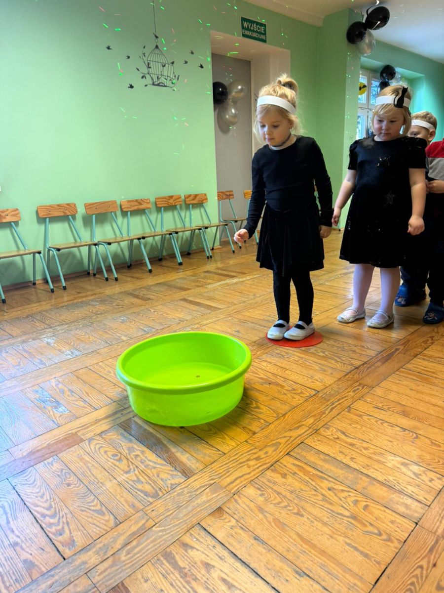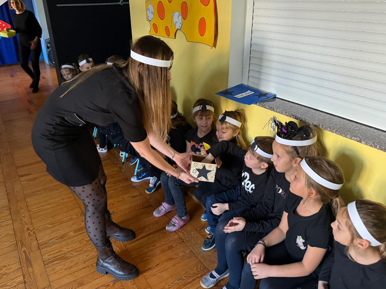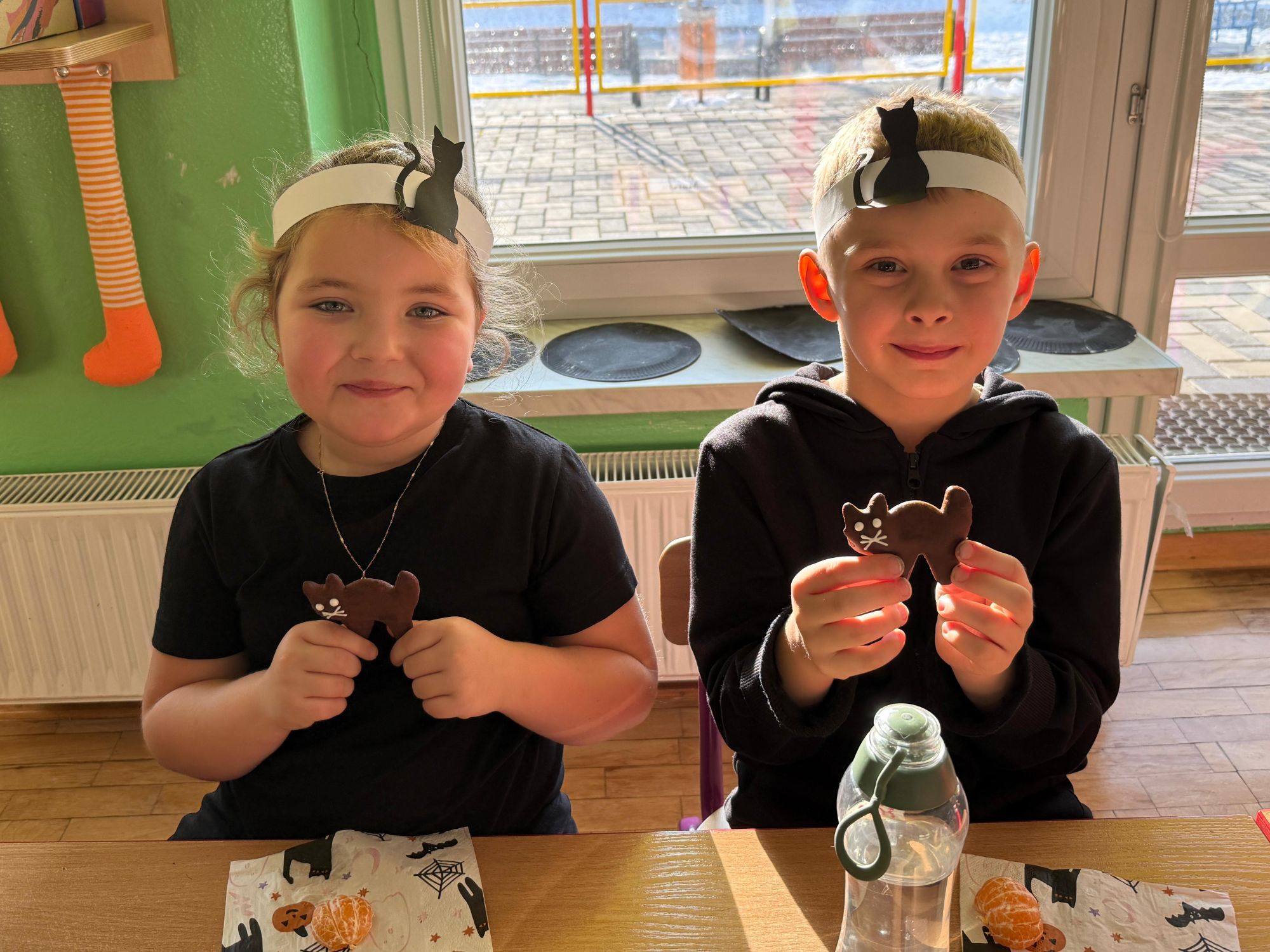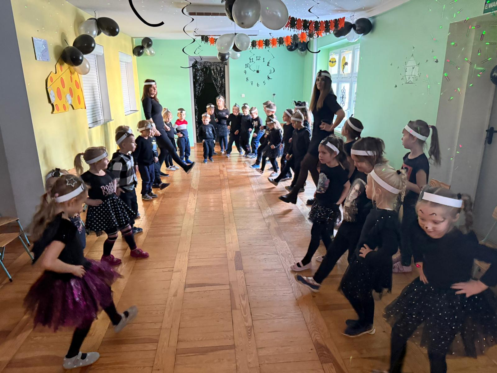 28 listopada w naszym przedszkolu odbyły się radosne i pełne magii Andrzejki. Od samego rana dzieci przeniosły się w świat wróżb, czarów i dobrej zabawy. Na początku spotkania przedszkolaki poznały tradycje andrzejkowe – dowiedziały się, skąd pochodzi zwyczaj wróżenia i dlaczego właśnie w tym dniu próbuje się zajrzeć w przyszłość. Dzieci słuchały z ogromną uwagą, a w sali z każdą chwilą narastała magiczna atmosfera. Następnie obie grupy udały się do przygotowanego „czarodziejskiego kącika”. Tam, przy zaczarowanej kuli, uczyły się specjalnego zaklęcia. Gdy wspólnie je wypowiedziały i kula „ożyła”, mieniąc się kolorami, dzieci mogły wreszcie przystąpić do wyczekiwanych wróżb. Rozpoczęło się odkrywanie przyszłości poprzez zabawy: „Kolory”, „Czarodziejska butelka”, „Grosiki” oraz „Kim będę w przyszłości?”. Wszystkie wróżby wywoływały u dzieci radość i uśmiech na twarzach. Następnie przedszkolaki ruszyły do tańca, bawiąc się wesoło przy ulubionych utworach z dziecięcego repertuaru. Wysłuchały opowiadania „O kotku, który szukał czarnego mleka”, a następnie z wielkim zaangażowaniem odpowiadały na pytania dotyczące treści. Nie zabrakło także zabaw animacyjno-ruchowych, m.in. z liną oraz pełnej emocji zabawy sprawnościowej „Kotki łapią myszki”. Po tylu atrakcjach na dzieci czekał słodko-owocowy poczęstunek, który dodał im energii na kolejne aktywności. Tradycyjne lanie wosku przez ucho czarodziejskiego klucza było kolejnym punktem programu. Powstające z wosku kształty pobudzały wyobraźnię i zachęcały do przepowiadania przyszłości. Na zakończenie wszyscy wykonali urocze czarne kotki z papierowych talerzyków – kreatywne prace plastyczne, które stały się pamiątką tego wyjątkowego, pełnego magii dnia.