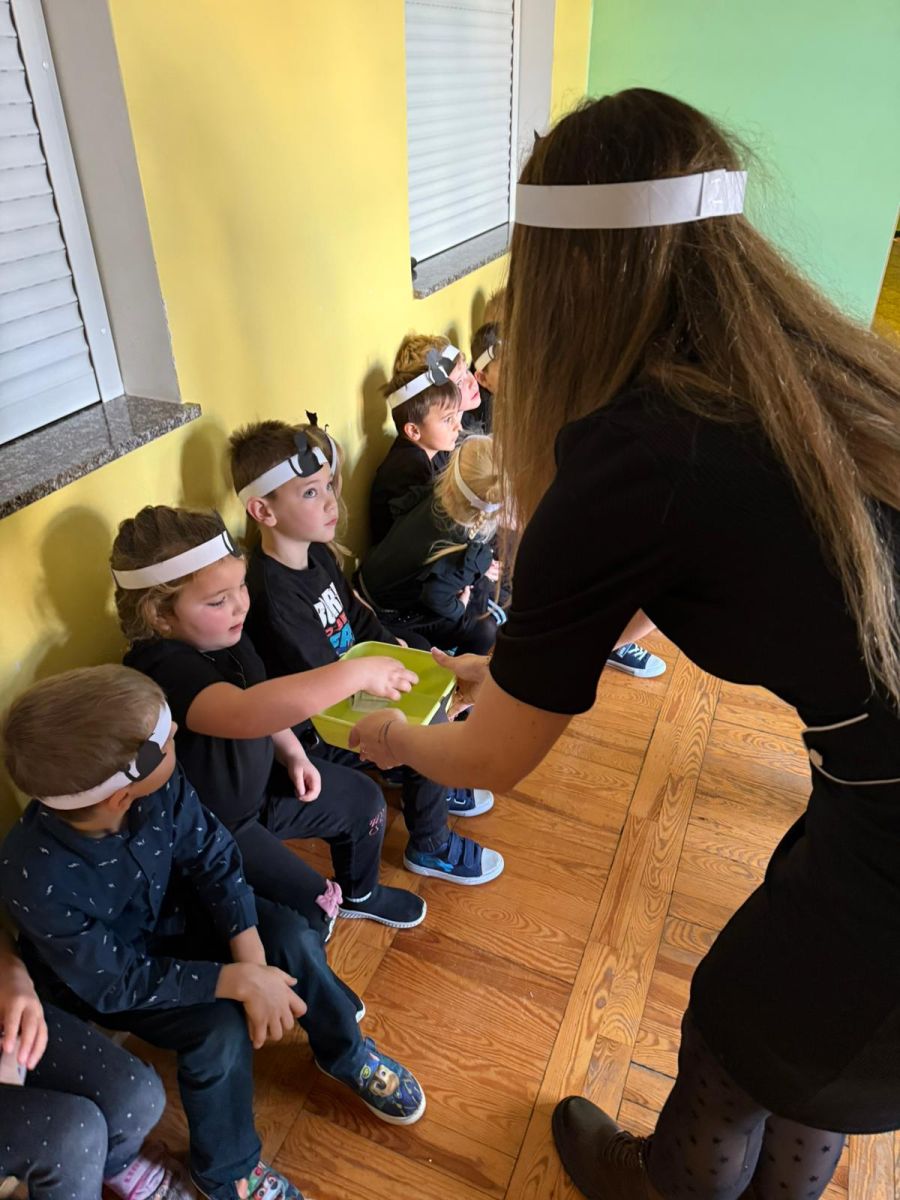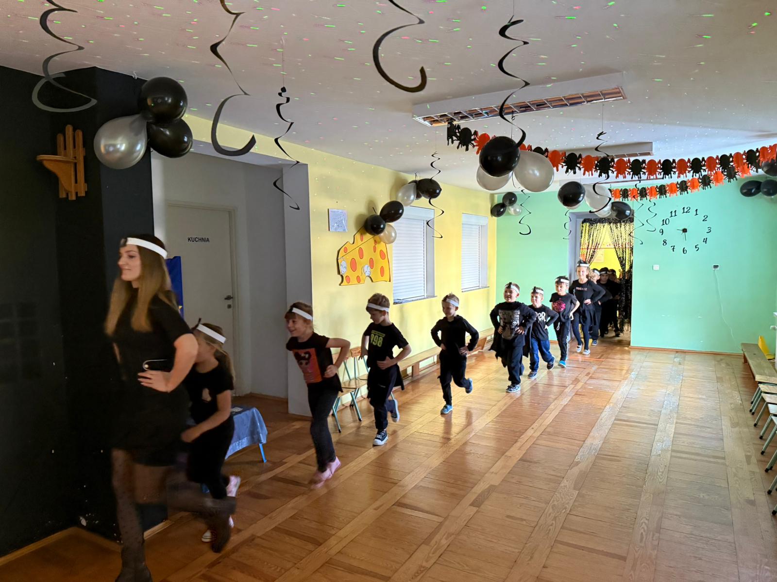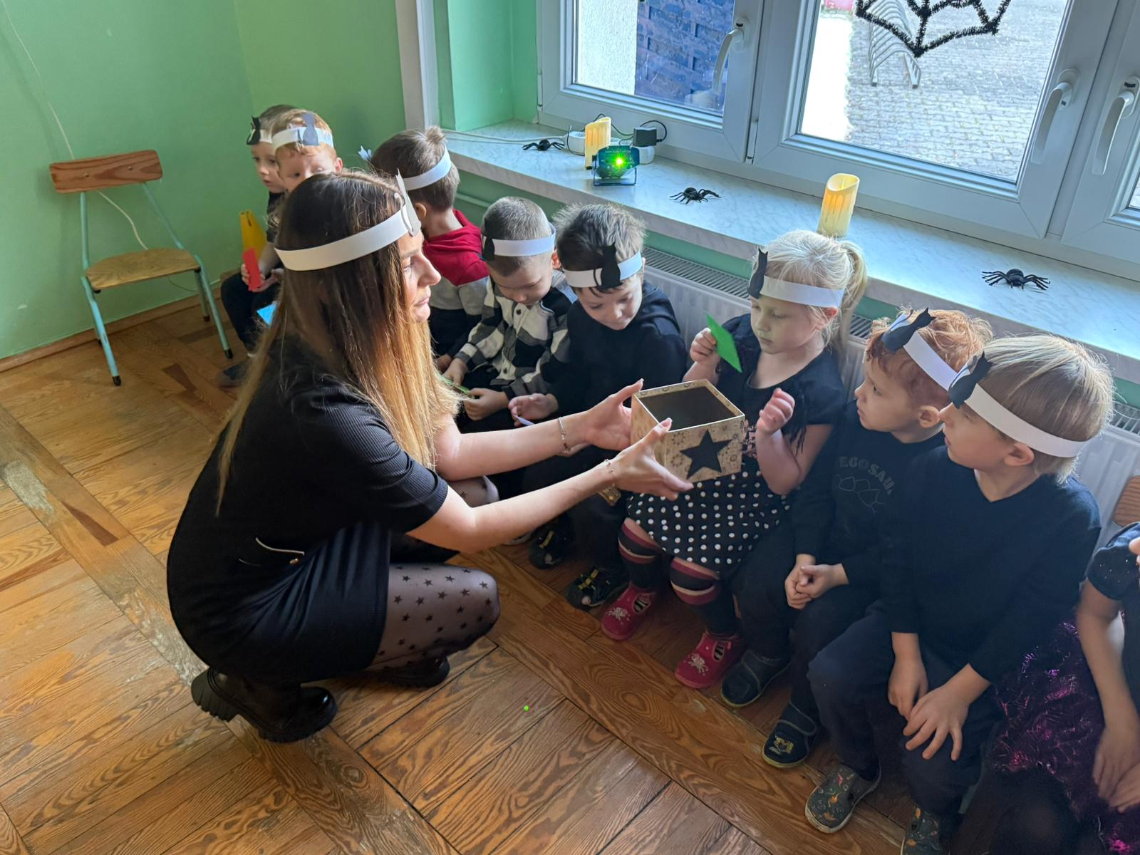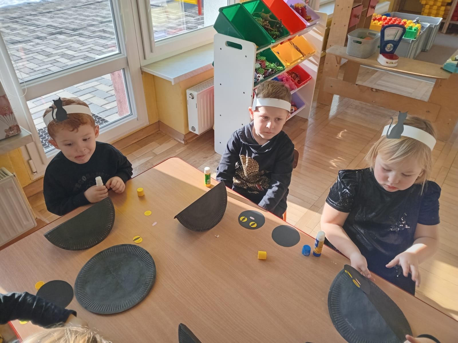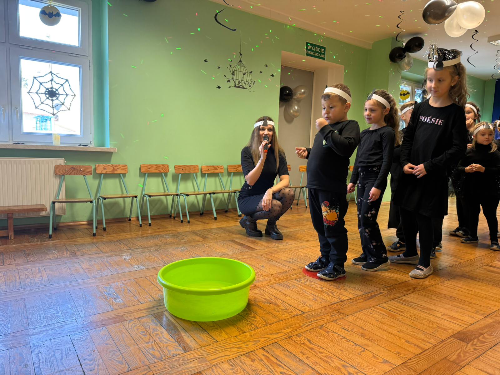 28 listopada w naszym przedszkolu odbyły się radosne i pełne magii Andrzejki. Od samego rana dzieci przeniosły się w świat wróżb, czarów i dobrej zabawy. Na początku spotkania przedszkolaki poznały tradycje andrzejkowe – dowiedziały się, skąd pochodzi zwyczaj wróżenia i dlaczego właśnie w tym dniu próbuje się zajrzeć w przyszłość. Dzieci słuchały z ogromną uwagą, a w sali z każdą chwilą narastała magiczna atmosfera. Następnie obie grupy udały się do przygotowanego „czarodziejskiego kącika”. Tam, przy zaczarowanej kuli, uczyły się specjalnego zaklęcia. Gdy wspólnie je wypowiedziały i kula „ożyła”, mieniąc się kolorami, dzieci mogły wreszcie przystąpić do wyczekiwanych wróżb. Rozpoczęło się odkrywanie przyszłości poprzez zabawy: „Kolory”, „Czarodziejska butelka”, „Grosiki” oraz „Kim będę w przyszłości?”. Wszystkie wróżby wywoływały u dzieci radość i uśmiech na twarzach. Następnie przedszkolaki ruszyły do tańca, bawiąc się wesoło przy ulubionych utworach z dziecięcego repertuaru. Wysłuchały opowiadania „O kotku, który szukał czarnego mleka”, a następnie z wielkim zaangażowaniem odpowiadały na pytania dotyczące treści. Nie zabrakło także zabaw animacyjno-ruchowych, m.in. z liną oraz pełnej emocji zabawy sprawnościowej „Kotki łapią myszki”. Po tylu atrakcjach na dzieci czekał słodko-owocowy poczęstunek, który dodał im energii na kolejne aktywności. Tradycyjne lanie wosku przez ucho czarodziejskiego klucza było kolejnym punktem programu. Powstające z wosku kształty pobudzały wyobraźnię i zachęcały do przepowiadania przyszłości. Na zakończenie wszyscy wykonali urocze czarne kotki z papierowych talerzyków – kreatywne prace plastyczne, które stały się pamiątką tego wyjątkowego, pełnego magii dnia.