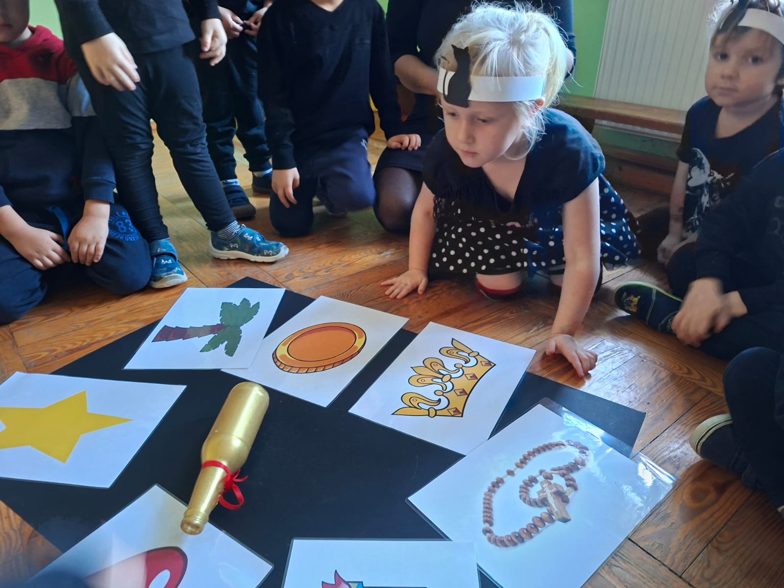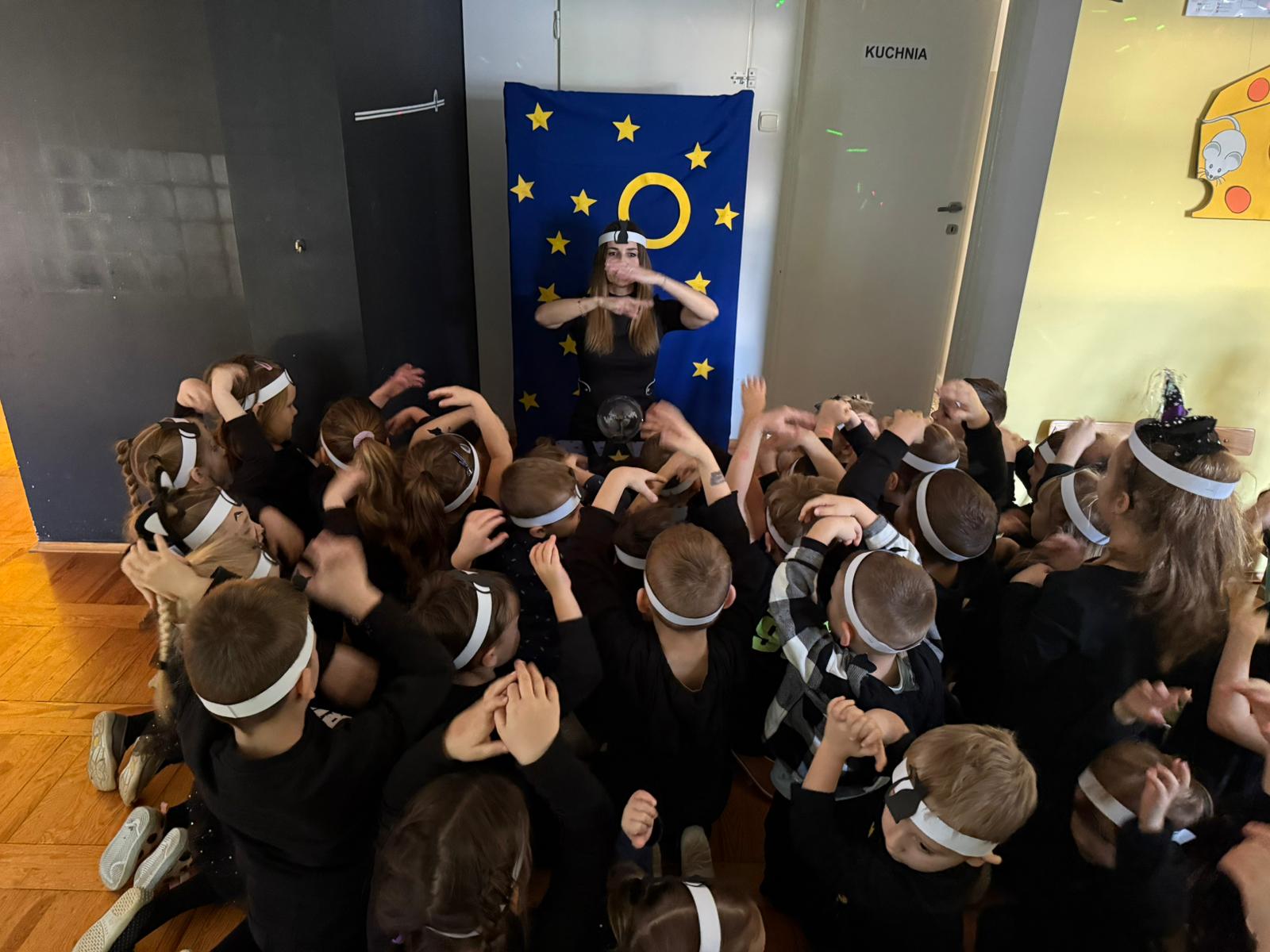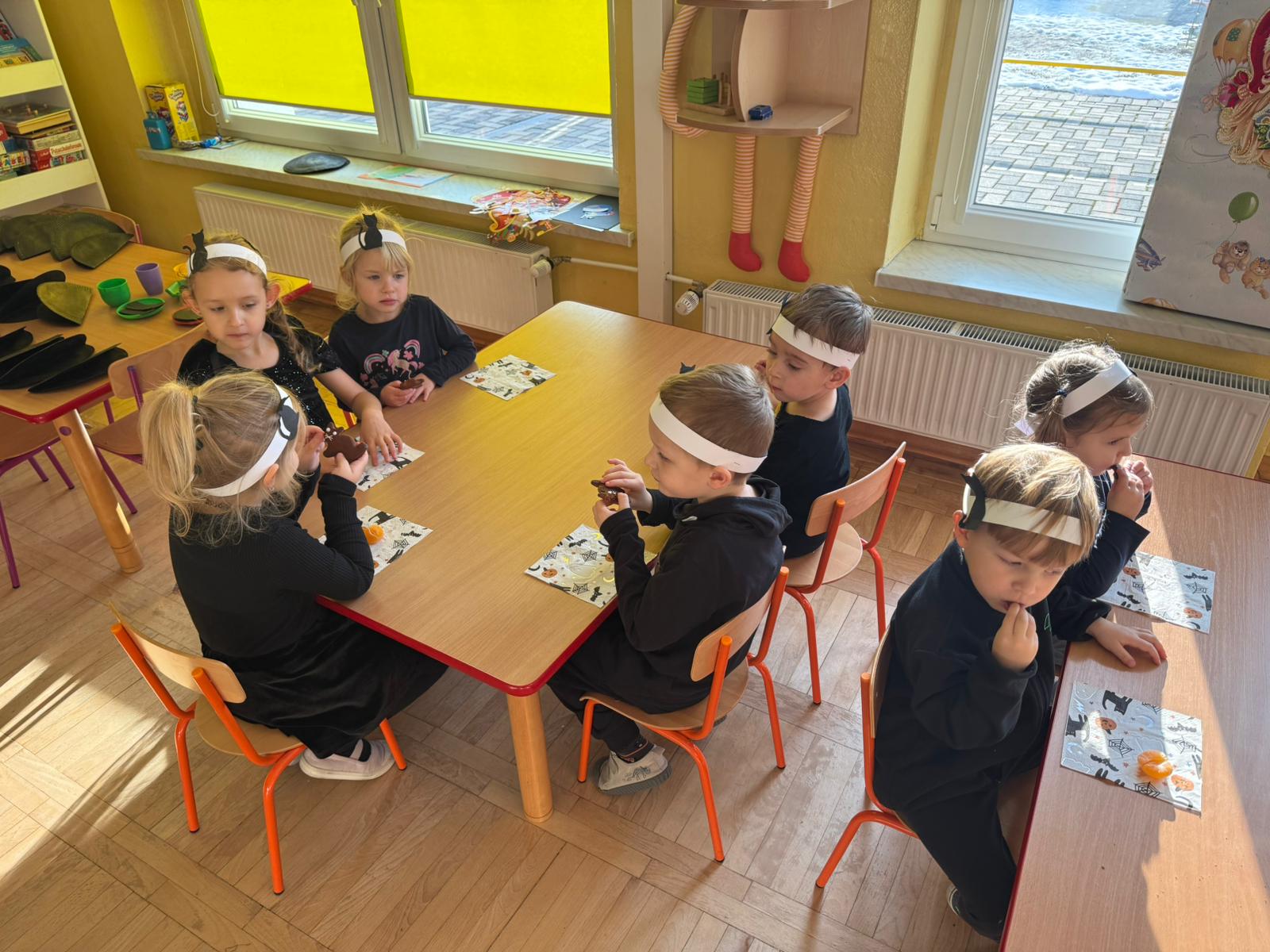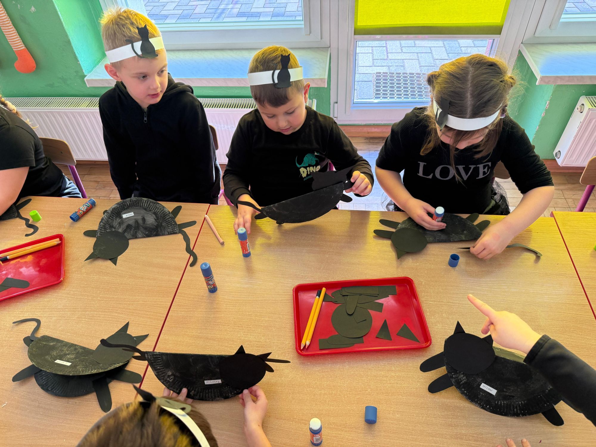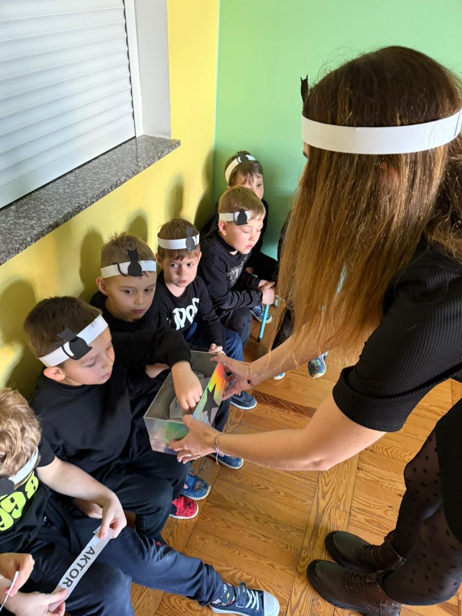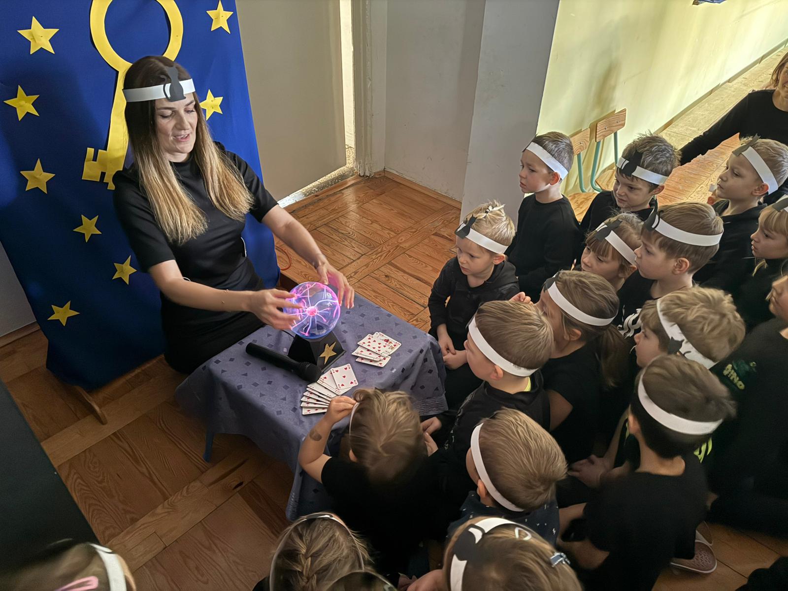 28 listopada w naszym przedszkolu odbyły się radosne i pełne magii Andrzejki. Od samego rana dzieci przeniosły się w świat wróżb, czarów i dobrej zabawy. Na początku spotkania przedszkolaki poznały tradycje andrzejkowe – dowiedziały się, skąd pochodzi zwyczaj wróżenia i dlaczego właśnie w tym dniu próbuje się zajrzeć w przyszłość. Dzieci słuchały z ogromną uwagą, a w sali z każdą chwilą narastała magiczna atmosfera. Następnie obie grupy udały się do przygotowanego „czarodziejskiego kącika”. Tam, przy zaczarowanej kuli, uczyły się specjalnego zaklęcia. Gdy wspólnie je wypowiedziały i kula „ożyła”, mieniąc się kolorami, dzieci mogły wreszcie przystąpić do wyczekiwanych wróżb. Rozpoczęło się odkrywanie przyszłości poprzez zabawy: „Kolory”, „Czarodziejska butelka”, „Grosiki” oraz „Kim będę w przyszłości?”. Wszystkie wróżby wywoływały u dzieci radość i uśmiech na twarzach. Następnie przedszkolaki ruszyły do tańca, bawiąc się wesoło przy ulubionych utworach z dziecięcego repertuaru. Wysłuchały opowiadania „O kotku, który szukał czarnego mleka”, a następnie z wielkim zaangażowaniem odpowiadały na pytania dotyczące treści. Nie zabrakło także zabaw animacyjno-ruchowych, m.in. z liną oraz pełnej emocji zabawy sprawnościowej „Kotki łapią myszki”. Po tylu atrakcjach na dzieci czekał słodko-owocowy poczęstunek, który dodał im energii na kolejne aktywności. Tradycyjne lanie wosku przez ucho czarodziejskiego klucza było kolejnym punktem programu. Powstające z wosku kształty pobudzały wyobraźnię i zachęcały do przepowiadania przyszłości. Na zakończenie wszyscy wykonali urocze czarne kotki z papierowych talerzyków – kreatywne prace plastyczne, które stały się pamiątką tego wyjątkowego, pełnego magii dnia.