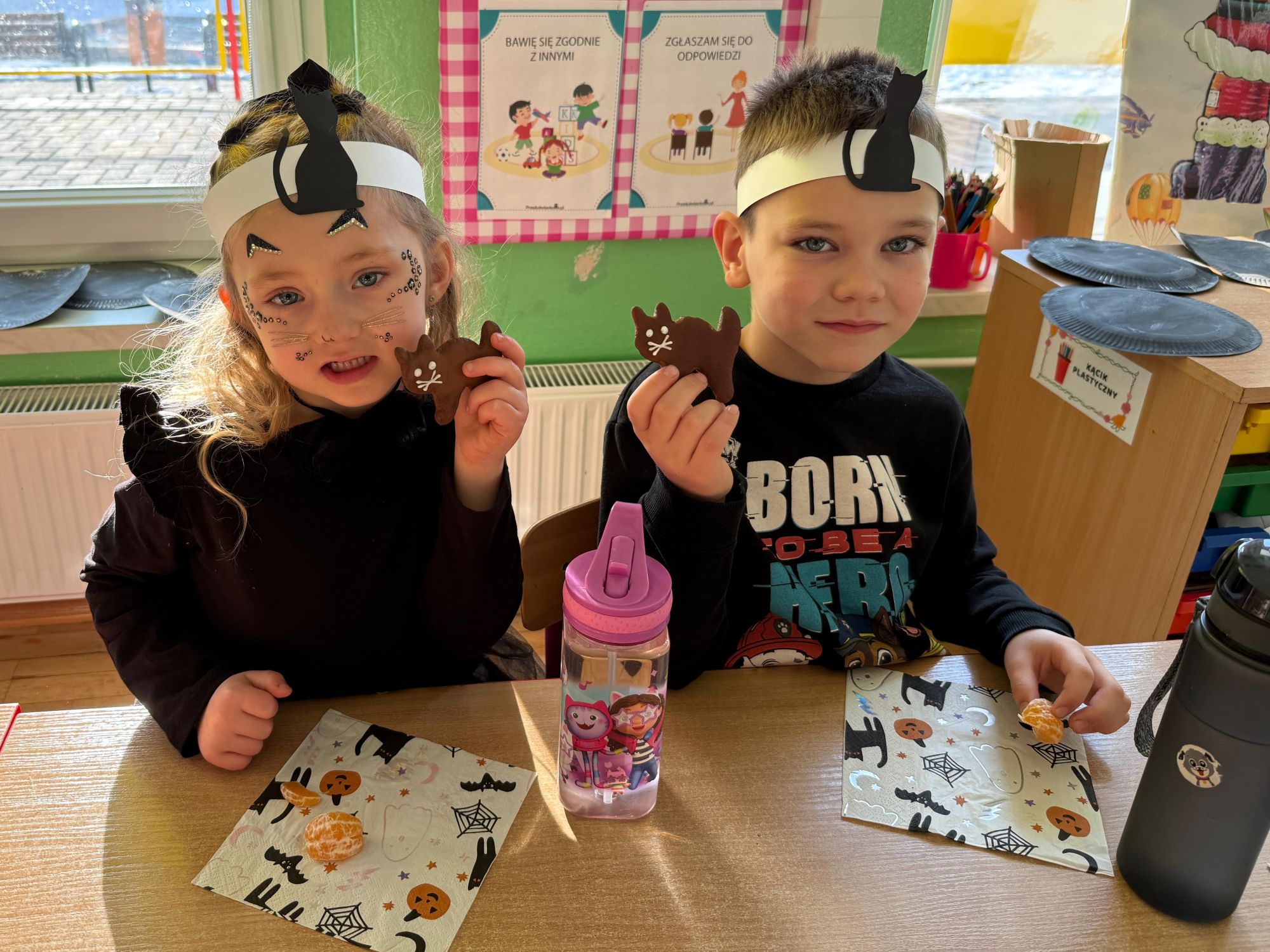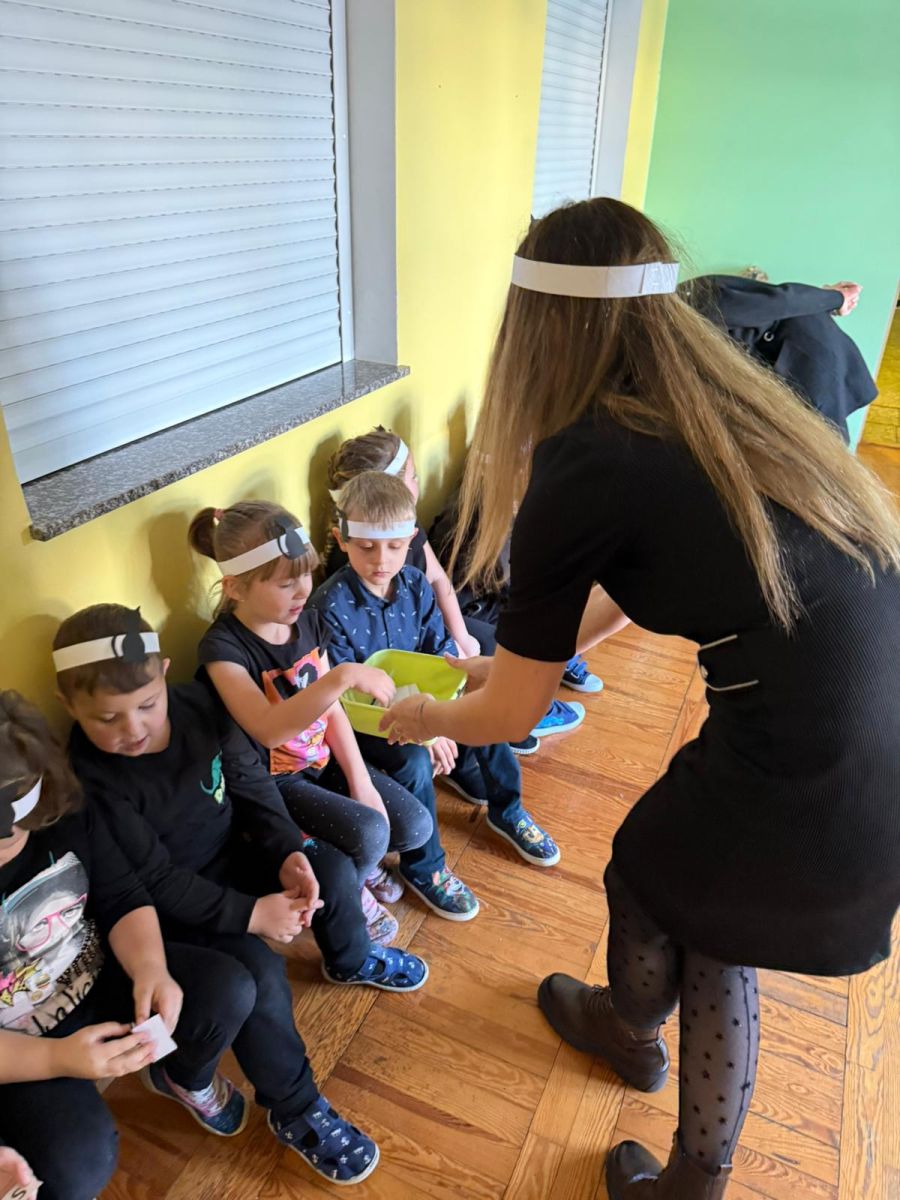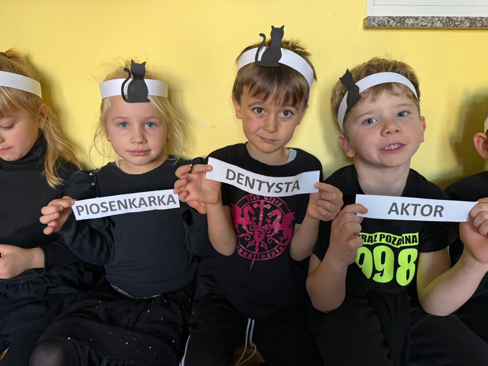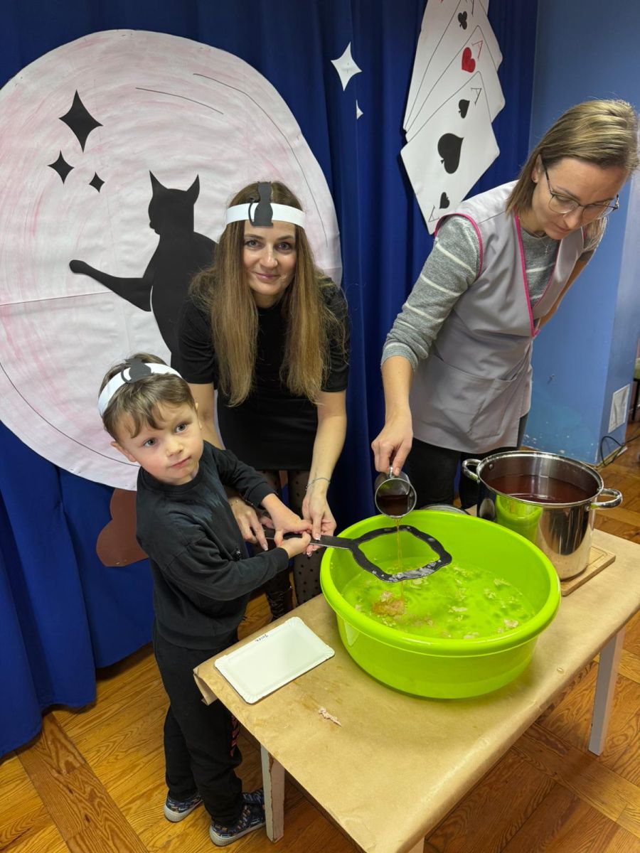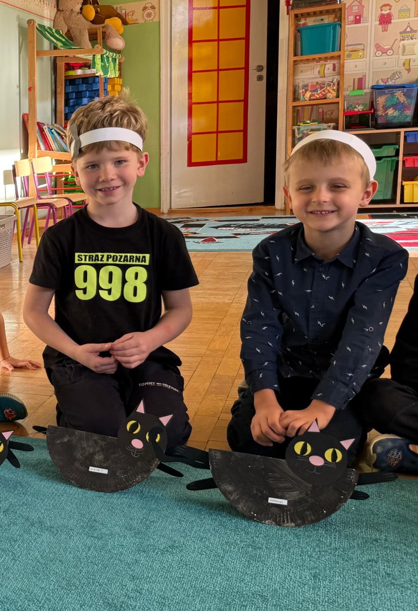 28 listopada w naszym przedszkolu odbyły się radosne i pełne magii Andrzejki. Od samego rana dzieci przeniosły się w świat wróżb, czarów i dobrej zabawy. Na początku spotkania przedszkolaki poznały tradycje andrzejkowe – dowiedziały się, skąd pochodzi zwyczaj wróżenia i dlaczego właśnie w tym dniu próbuje się zajrzeć w przyszłość. Dzieci słuchały z ogromną uwagą, a w sali z każdą chwilą narastała magiczna atmosfera. Następnie obie grupy udały się do przygotowanego „czarodziejskiego kącika”. Tam, przy zaczarowanej kuli, uczyły się specjalnego zaklęcia. Gdy wspólnie je wypowiedziały i kula „ożyła”, mieniąc się kolorami, dzieci mogły wreszcie przystąpić do wyczekiwanych wróżb. Rozpoczęło się odkrywanie przyszłości poprzez zabawy: „Kolory”, „Czarodziejska butelka”, „Grosiki” oraz „Kim będę w przyszłości?”. Wszystkie wróżby wywoływały u dzieci radość i uśmiech na twarzach. Następnie przedszkolaki ruszyły do tańca, bawiąc się wesoło przy ulubionych utworach z dziecięcego repertuaru. Wysłuchały opowiadania „O kotku, który szukał czarnego mleka”, a następnie z wielkim zaangażowaniem odpowiadały na pytania dotyczące treści. Nie zabrakło także zabaw animacyjno-ruchowych, m.in. z liną oraz pełnej emocji zabawy sprawnościowej „Kotki łapią myszki”. Po tylu atrakcjach na dzieci czekał słodko-owocowy poczęstunek, który dodał im energii na kolejne aktywności. Tradycyjne lanie wosku przez ucho czarodziejskiego klucza było kolejnym punktem programu. Powstające z wosku kształty pobudzały wyobraźnię i zachęcały do przepowiadania przyszłości. Na zakończenie wszyscy wykonali urocze czarne kotki z papierowych talerzyków – kreatywne prace plastyczne, które stały się pamiątką tego wyjątkowego, pełnego magii dnia.