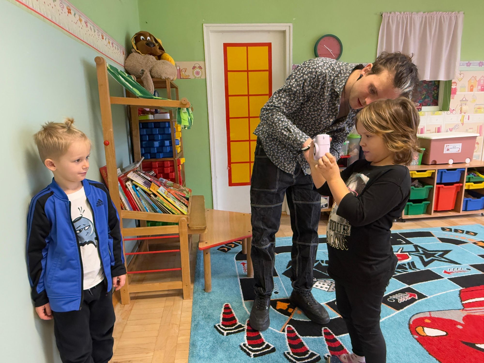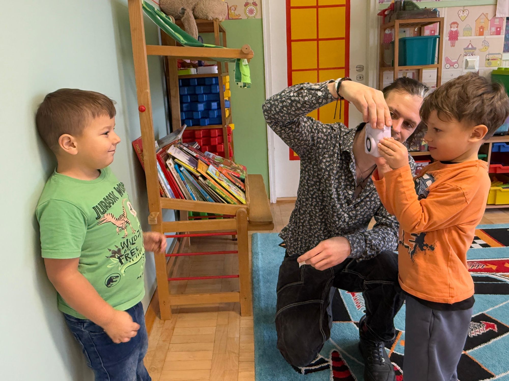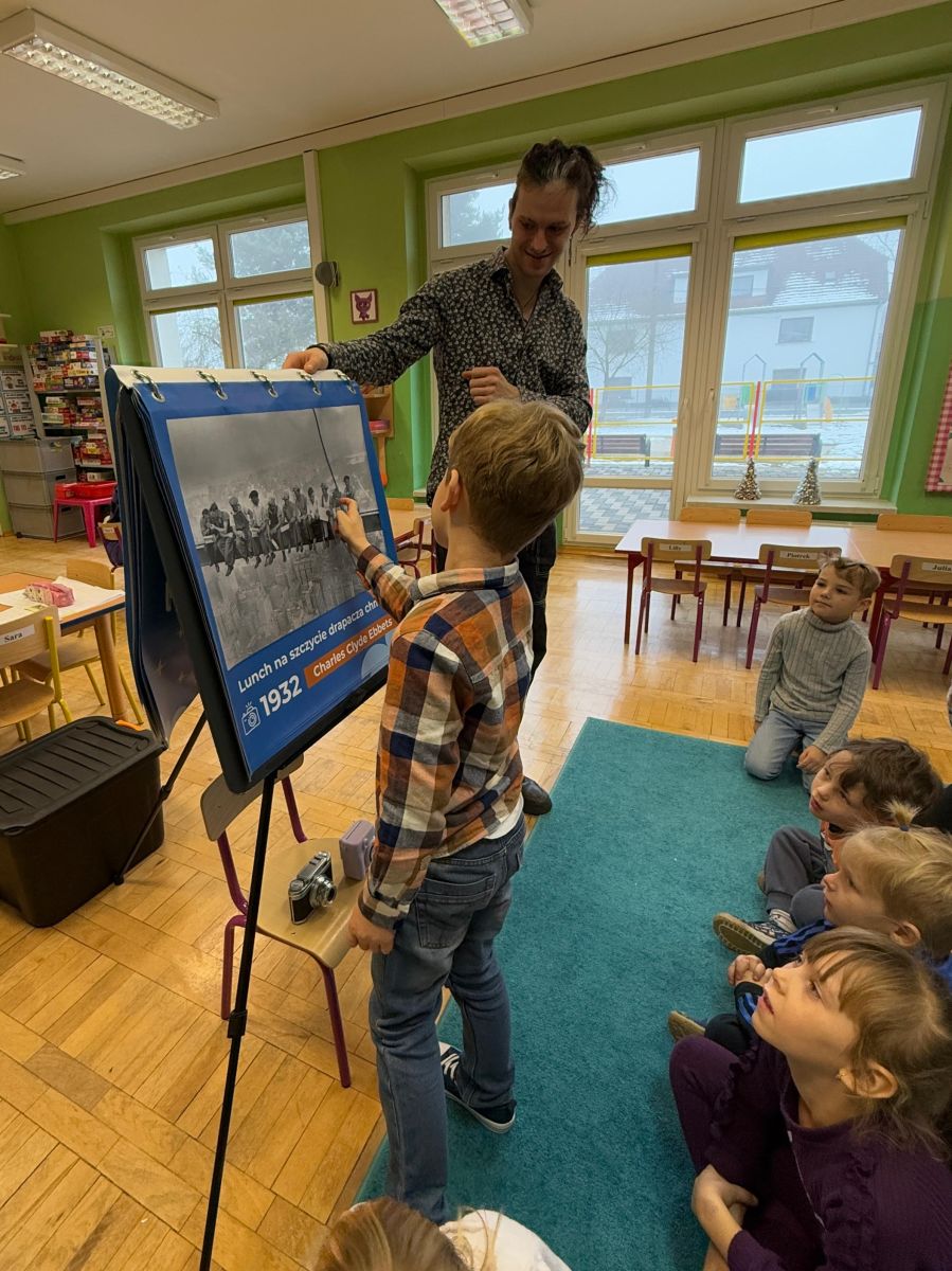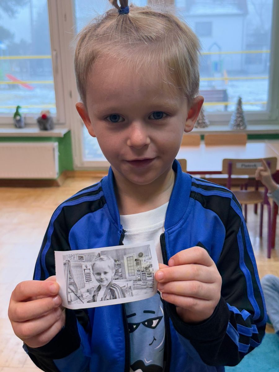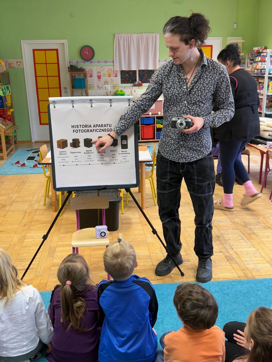 Podczas zajęć dzieci poznały historię aparatu fotograficznego, od dawnych, dużych kamer po nowoczesne cyfrowe aparaty. Dowiedziały się również, jak zrobić ładne i dobrze wyglądające zdjęcie, gdzie stanąć, jak ustawić światło, jak się uśmiechnąć. Następnie wychowankowie w parach wykonywały zdjęcia portretowe, ucząc się współpracy. Mogły dotknąć prawdziwego sprzętu fotograficznego i zobaczyć, jak działa. Największą atrakcją było to, że każde dziecko stanęło również przed obiektywem fotografa. W wyniku tego powstały piękne, profesjonalne portrety dzieci! Na koniec zajęć każdy otrzymał swój portret, który samodzielnie wkleił do przygotowanego dyplomu fotografa małego odkrywcy. To była wspaniała chwila. Wszystkie przedszkolaki z dumą prezentowały swoje dyplomy i zdjęcia! Dzień z fotografią nie tylko dostarczył wiele radości, ale także rozwinął kreatywność, ciekawość świata i umiejętność obserwacji. Jesteśmy pewni, że będzie to wspomnienie, które pozostanie z naszymi przedszkolakami na długo.