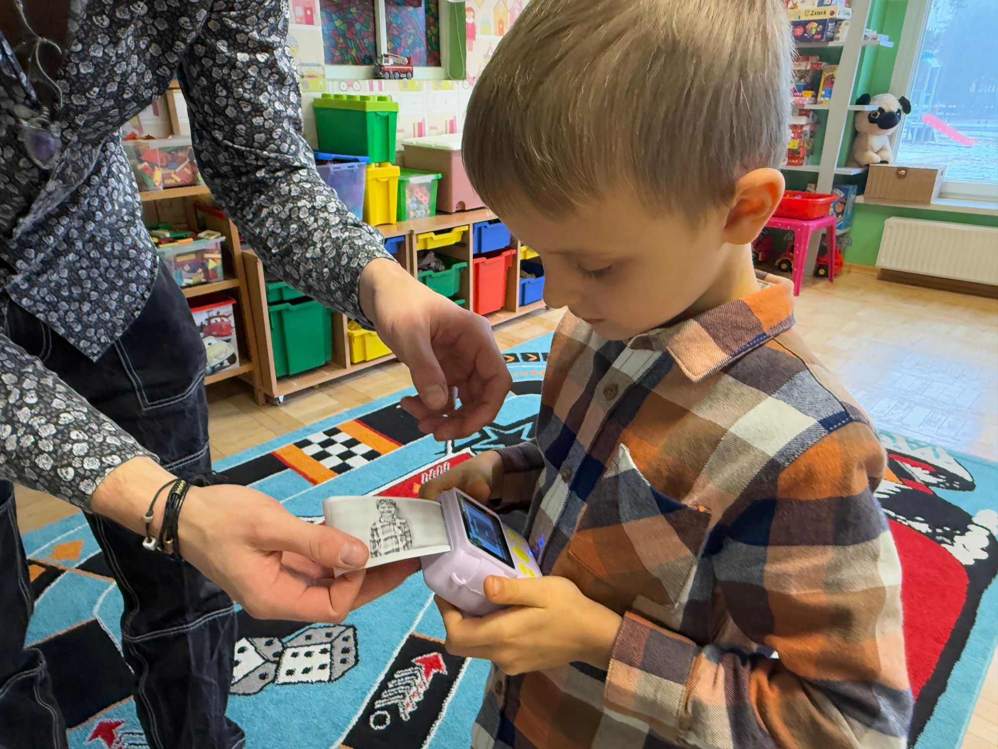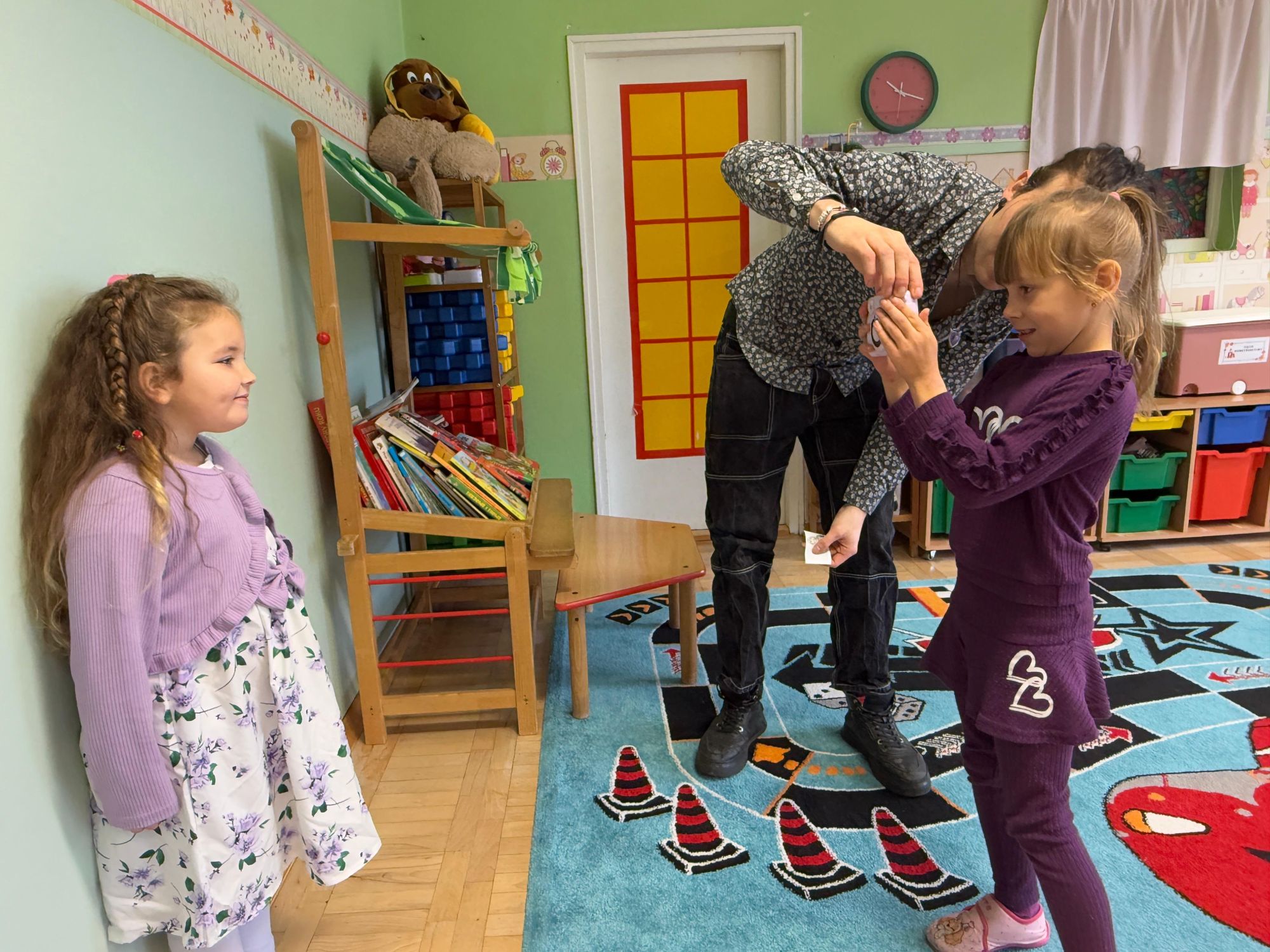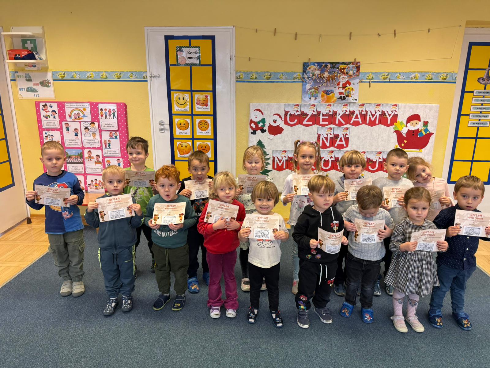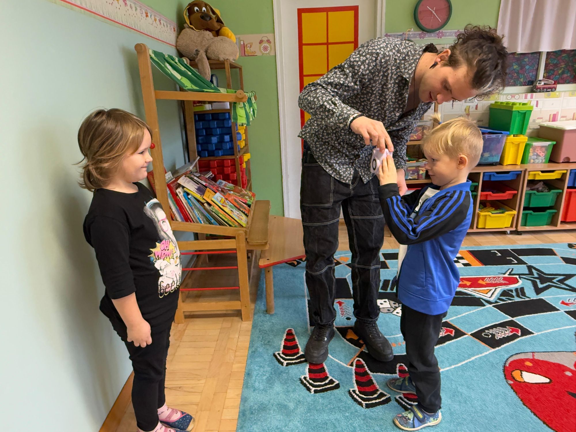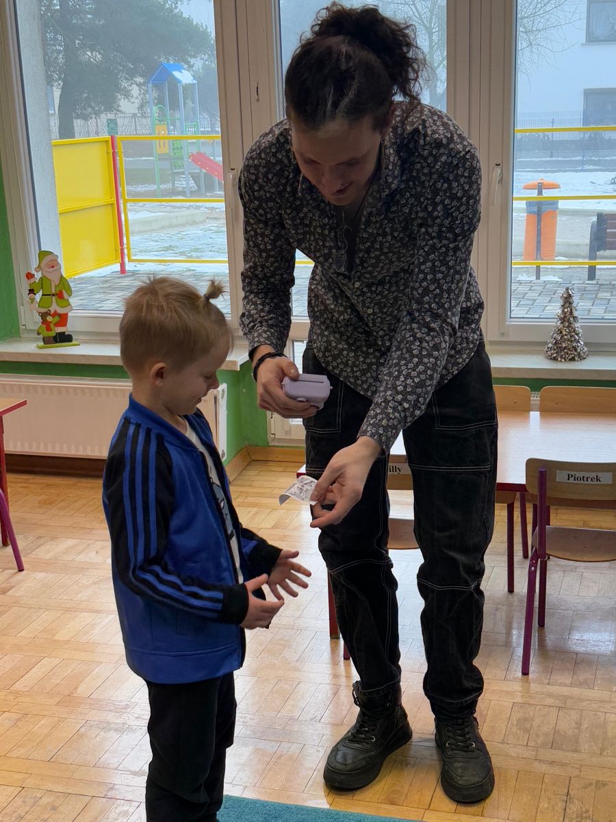 Podczas zajęć dzieci poznały historię aparatu fotograficznego, od dawnych, dużych kamer po nowoczesne cyfrowe aparaty. Dowiedziały się również, jak zrobić ładne i dobrze wyglądające zdjęcie, gdzie stanąć, jak ustawić światło, jak się uśmiechnąć. Następnie wychowankowie w parach wykonywały zdjęcia portretowe, ucząc się współpracy. Mogły dotknąć prawdziwego sprzętu fotograficznego i zobaczyć, jak działa. Największą atrakcją było to, że każde dziecko stanęło również przed obiektywem fotografa. W wyniku tego powstały piękne, profesjonalne portrety dzieci! Na koniec zajęć każdy otrzymał swój portret, który samodzielnie wkleił do przygotowanego dyplomu fotografa małego odkrywcy. To była wspaniała chwila. Wszystkie przedszkolaki z dumą prezentowały swoje dyplomy i zdjęcia! Dzień z fotografią nie tylko dostarczył wiele radości, ale także rozwinął kreatywność, ciekawość świata i umiejętność obserwacji. Jesteśmy pewni, że będzie to wspomnienie, które pozostanie z naszymi przedszkolakami na długo.
