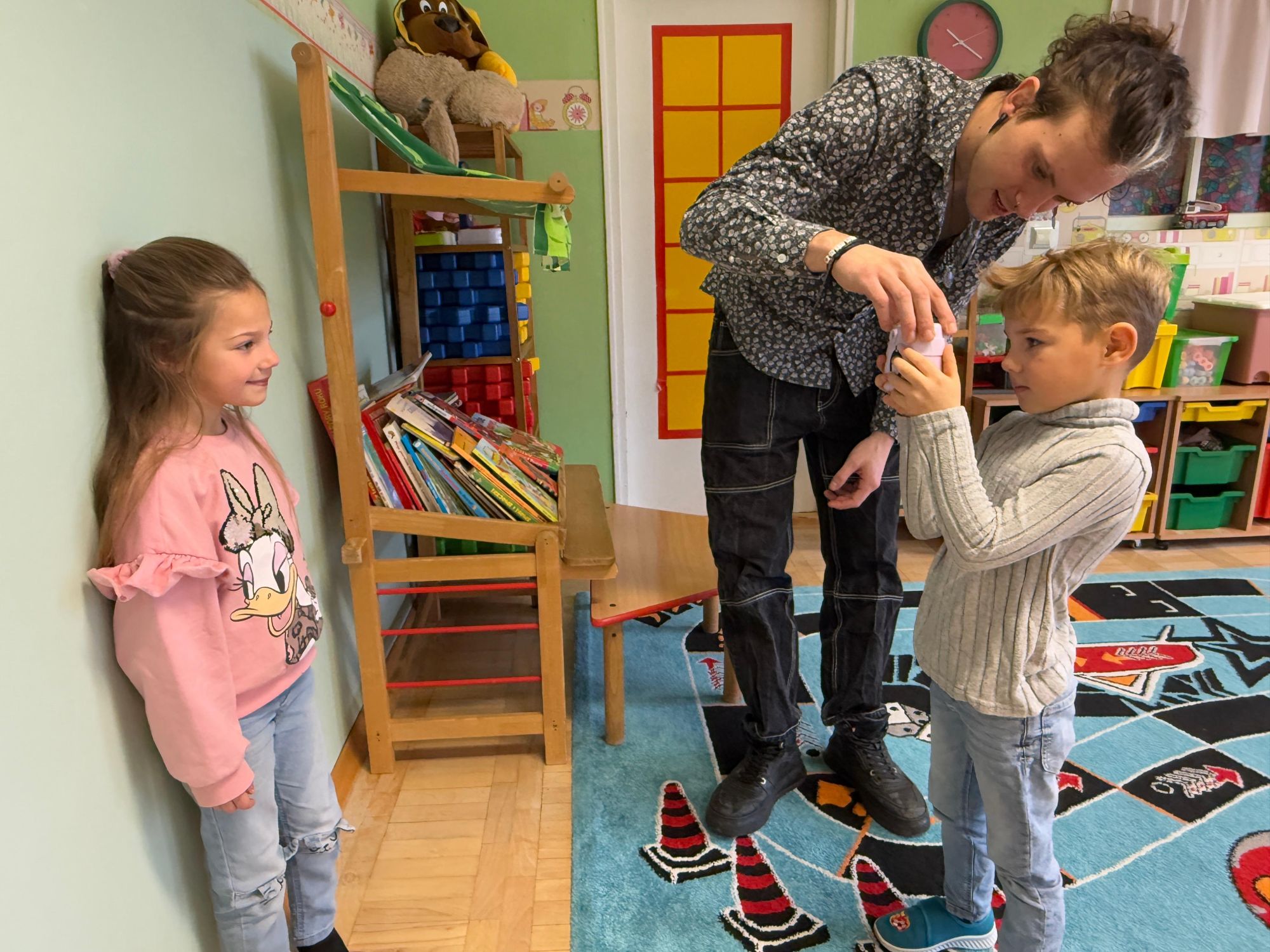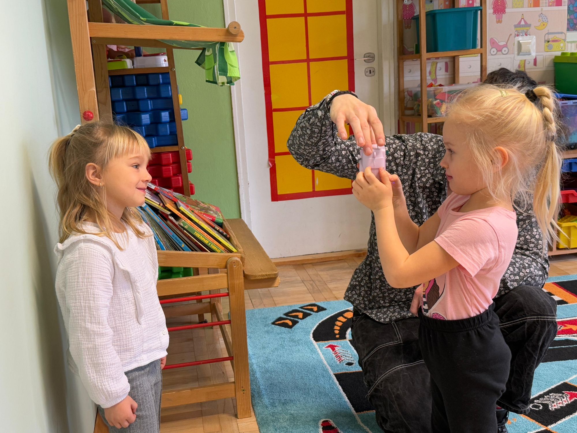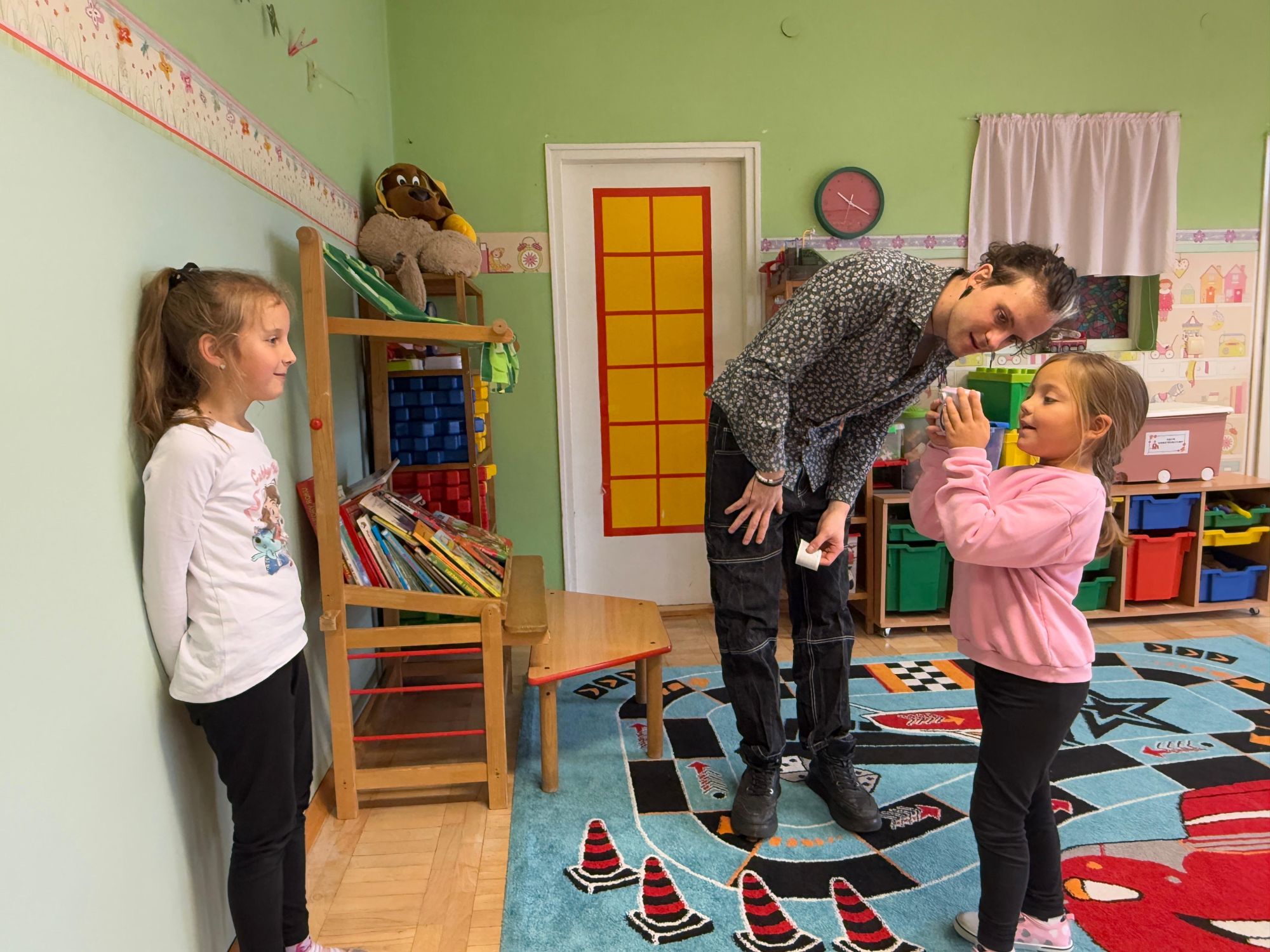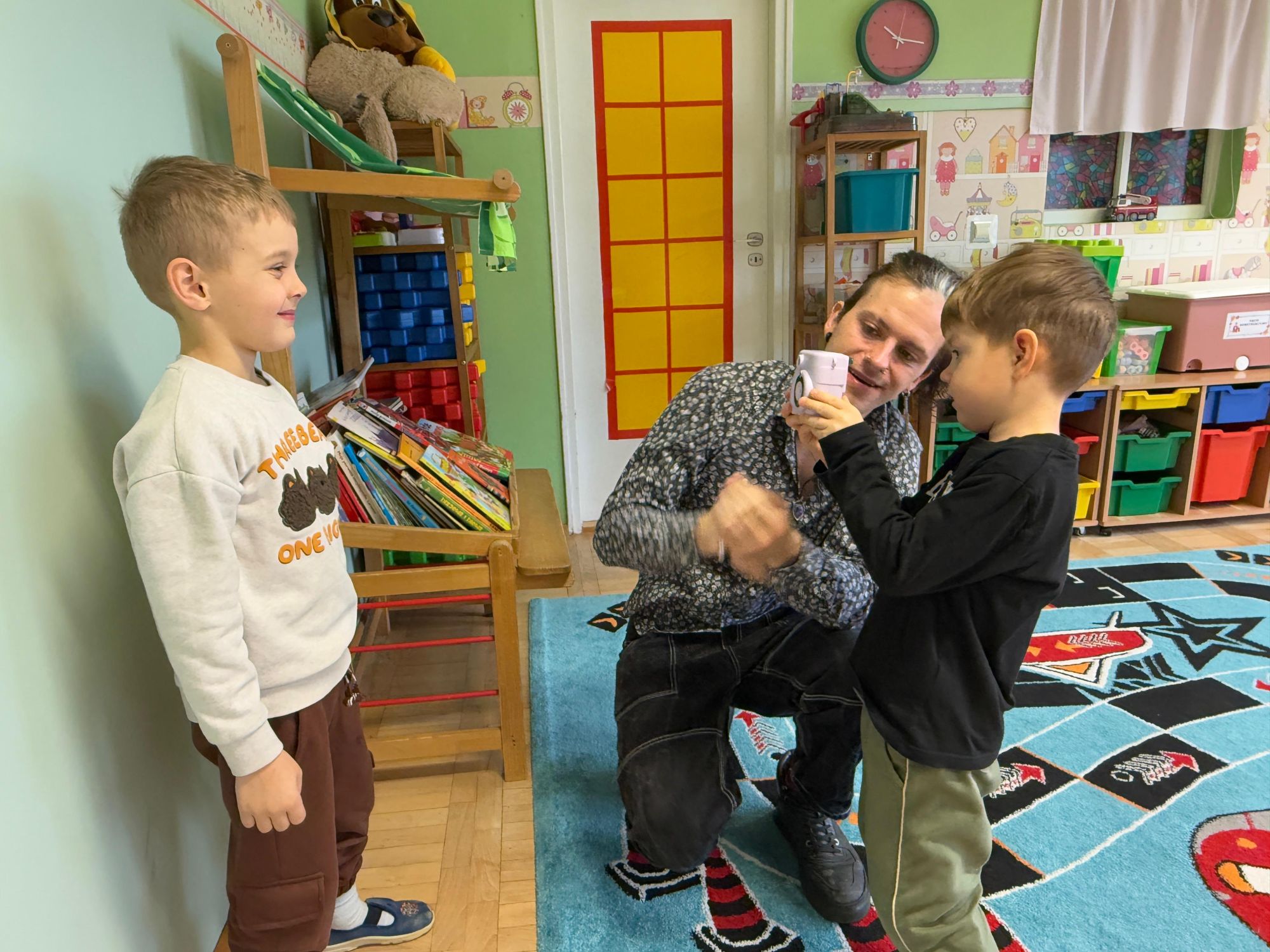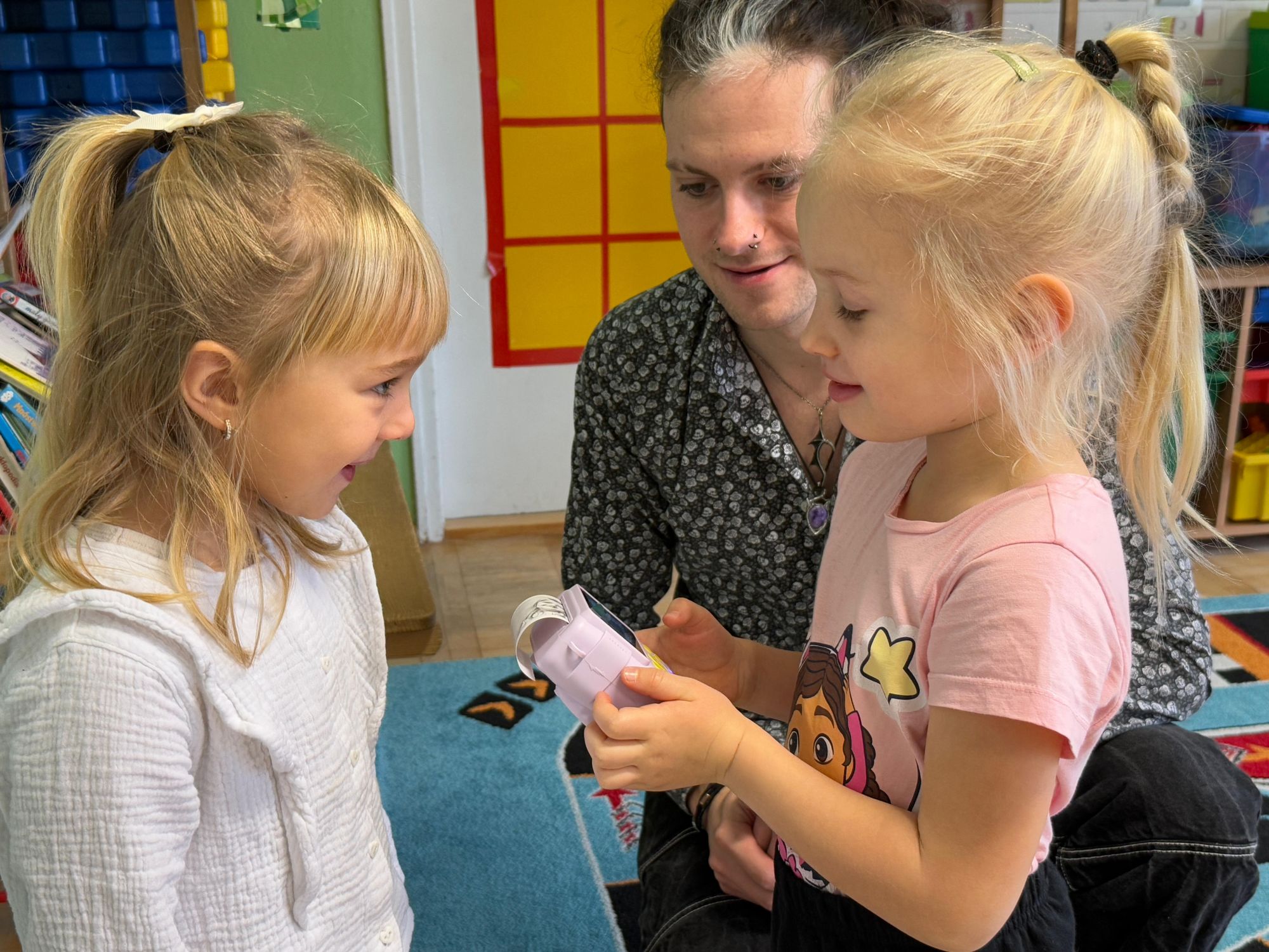 Podczas zajęć dzieci poznały historię aparatu fotograficznego, od dawnych, dużych kamer po nowoczesne cyfrowe aparaty. Dowiedziały się również, jak zrobić ładne i dobrze wyglądające zdjęcie, gdzie stanąć, jak ustawić światło, jak się uśmiechnąć. Następnie wychowankowie w parach wykonywały zdjęcia portretowe, ucząc się współpracy. Mogły dotknąć prawdziwego sprzętu fotograficznego i zobaczyć, jak działa. Największą atrakcją było to, że każde dziecko stanęło również przed obiektywem fotografa. W wyniku tego powstały piękne, profesjonalne portrety dzieci! Na koniec zajęć każdy otrzymał swój portret, który samodzielnie wkleił do przygotowanego dyplomu fotografa małego odkrywcy. To była wspaniała chwila. Wszystkie przedszkolaki z dumą prezentowały swoje dyplomy i zdjęcia! Dzień z fotografią nie tylko dostarczył wiele radości, ale także rozwinął kreatywność, ciekawość świata i umiejętność obserwacji. Jesteśmy pewni, że będzie to wspomnienie, które pozostanie z naszymi przedszkolakami na długo.