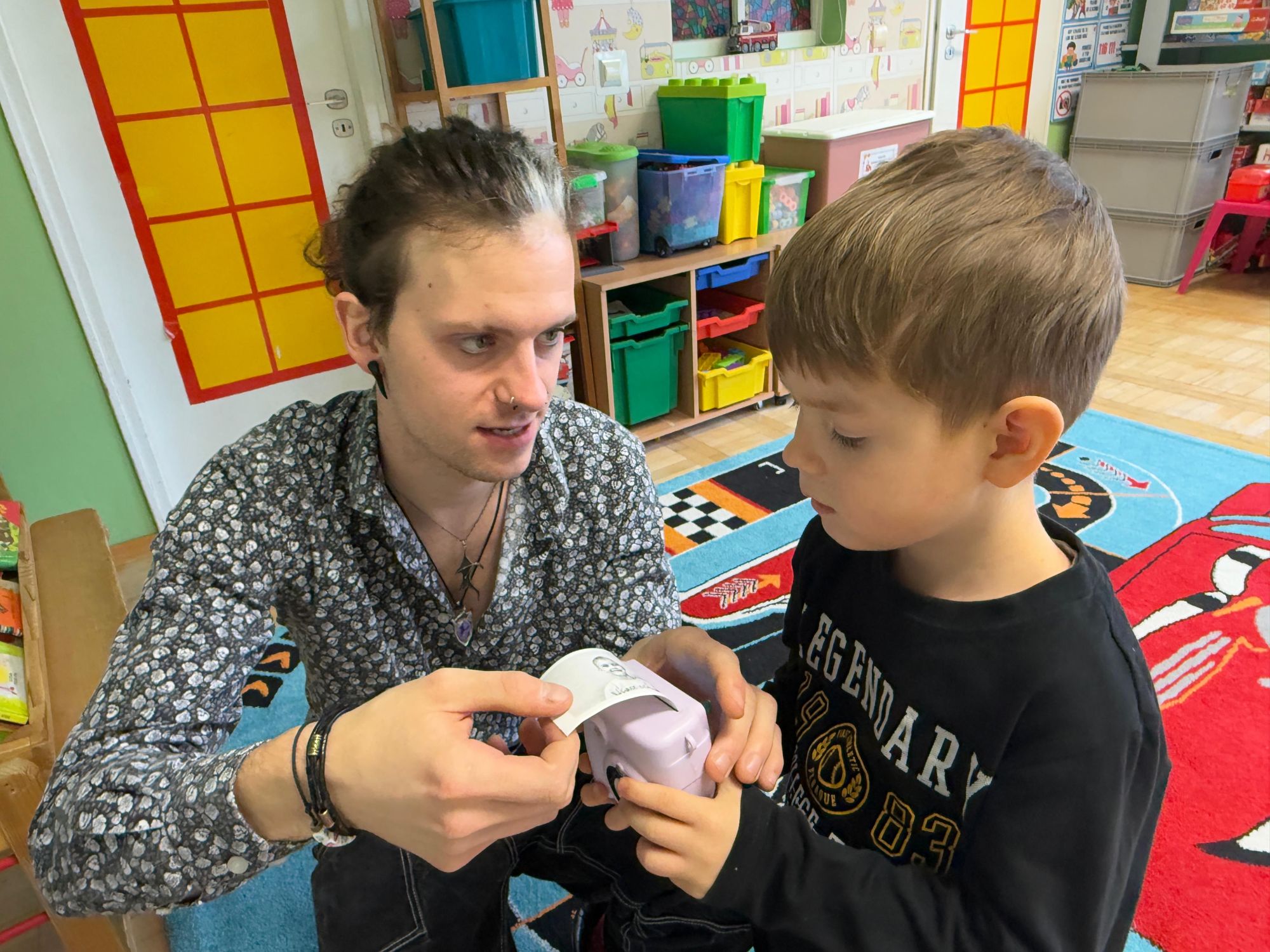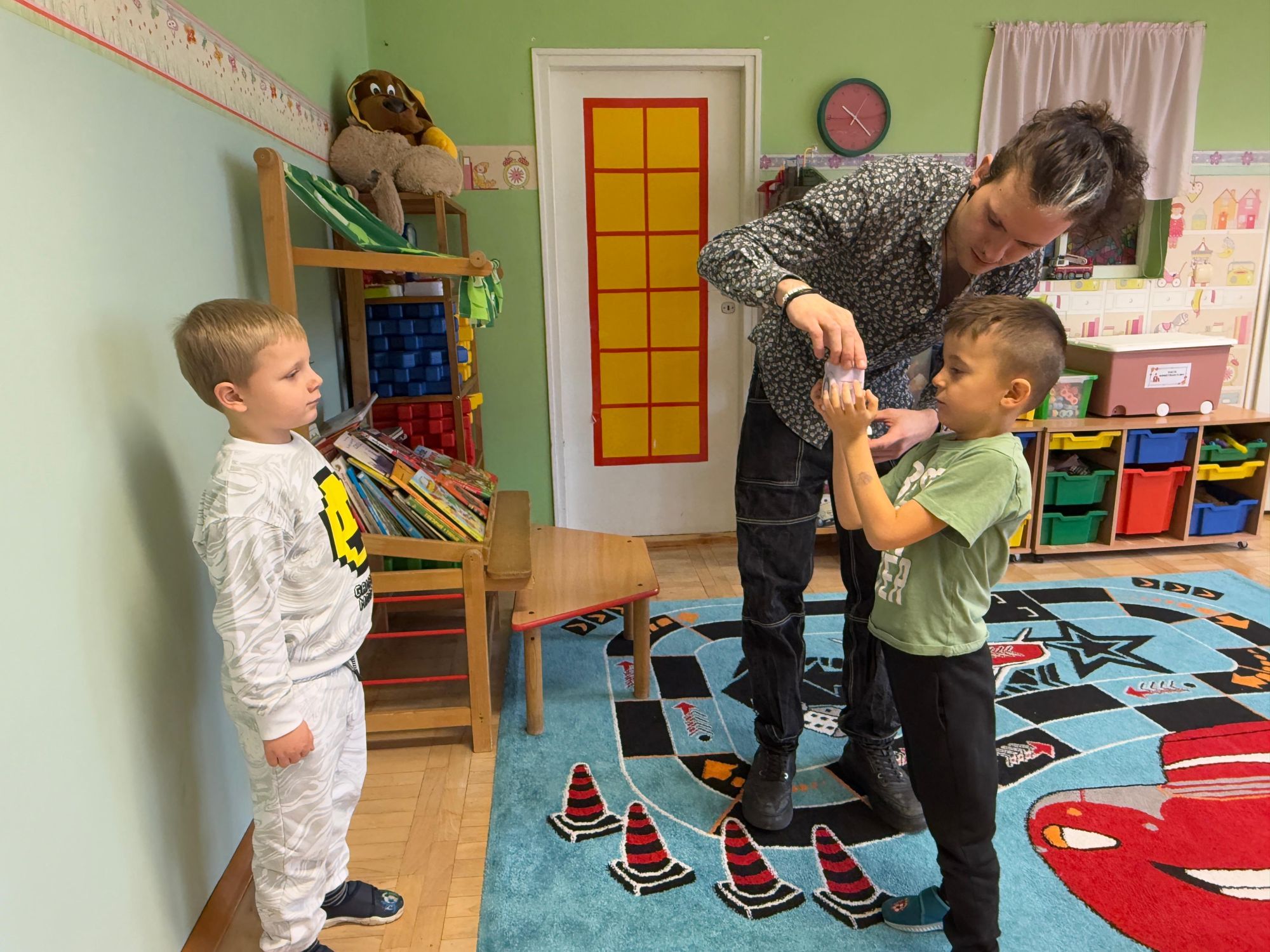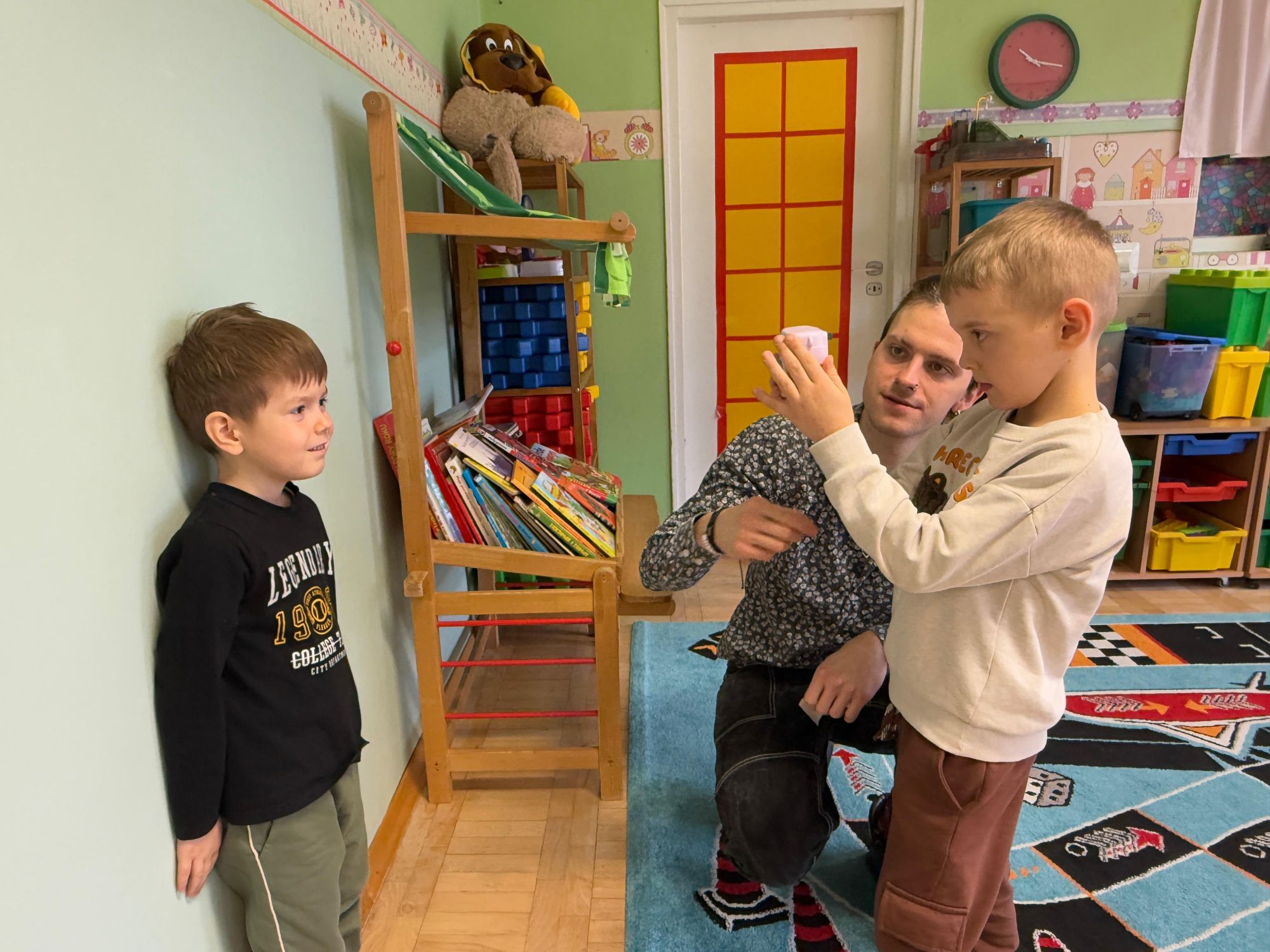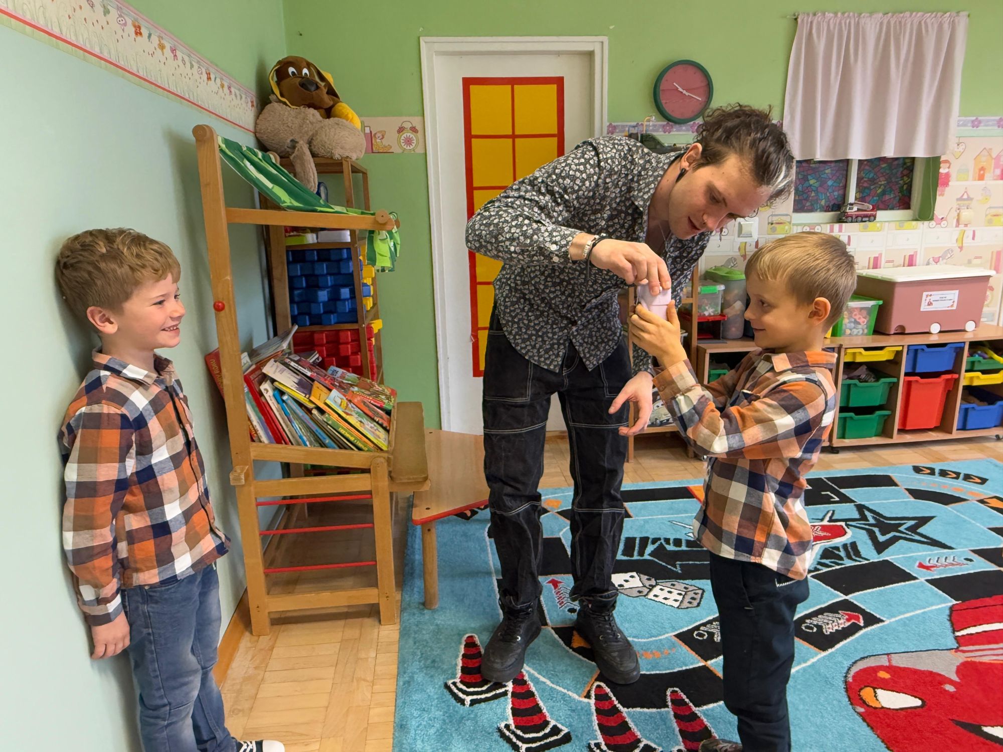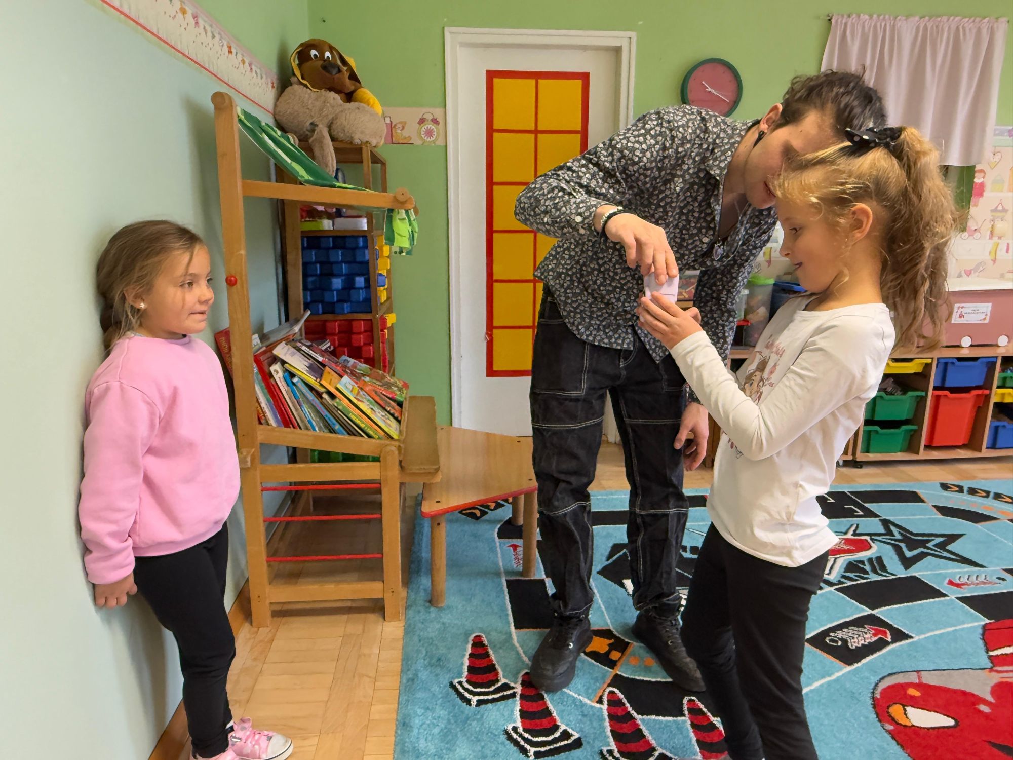 Podczas zajęć dzieci poznały historię aparatu fotograficznego, od dawnych, dużych kamer po nowoczesne cyfrowe aparaty. Dowiedziały się również, jak zrobić ładne i dobrze wyglądające zdjęcie, gdzie stanąć, jak ustawić światło, jak się uśmiechnąć. Następnie wychowankowie w parach wykonywały zdjęcia portretowe, ucząc się współpracy. Mogły dotknąć prawdziwego sprzętu fotograficznego i zobaczyć, jak działa. Największą atrakcją było to, że każde dziecko stanęło również przed obiektywem fotografa. W wyniku tego powstały piękne, profesjonalne portrety dzieci! Na koniec zajęć każdy otrzymał swój portret, który samodzielnie wkleił do przygotowanego dyplomu fotografa małego odkrywcy. To była wspaniała chwila. Wszystkie przedszkolaki z dumą prezentowały swoje dyplomy i zdjęcia! Dzień z fotografią nie tylko dostarczył wiele radości, ale także rozwinął kreatywność, ciekawość świata i umiejętność obserwacji. Jesteśmy pewni, że będzie to wspomnienie, które pozostanie z naszymi przedszkolakami na długo.