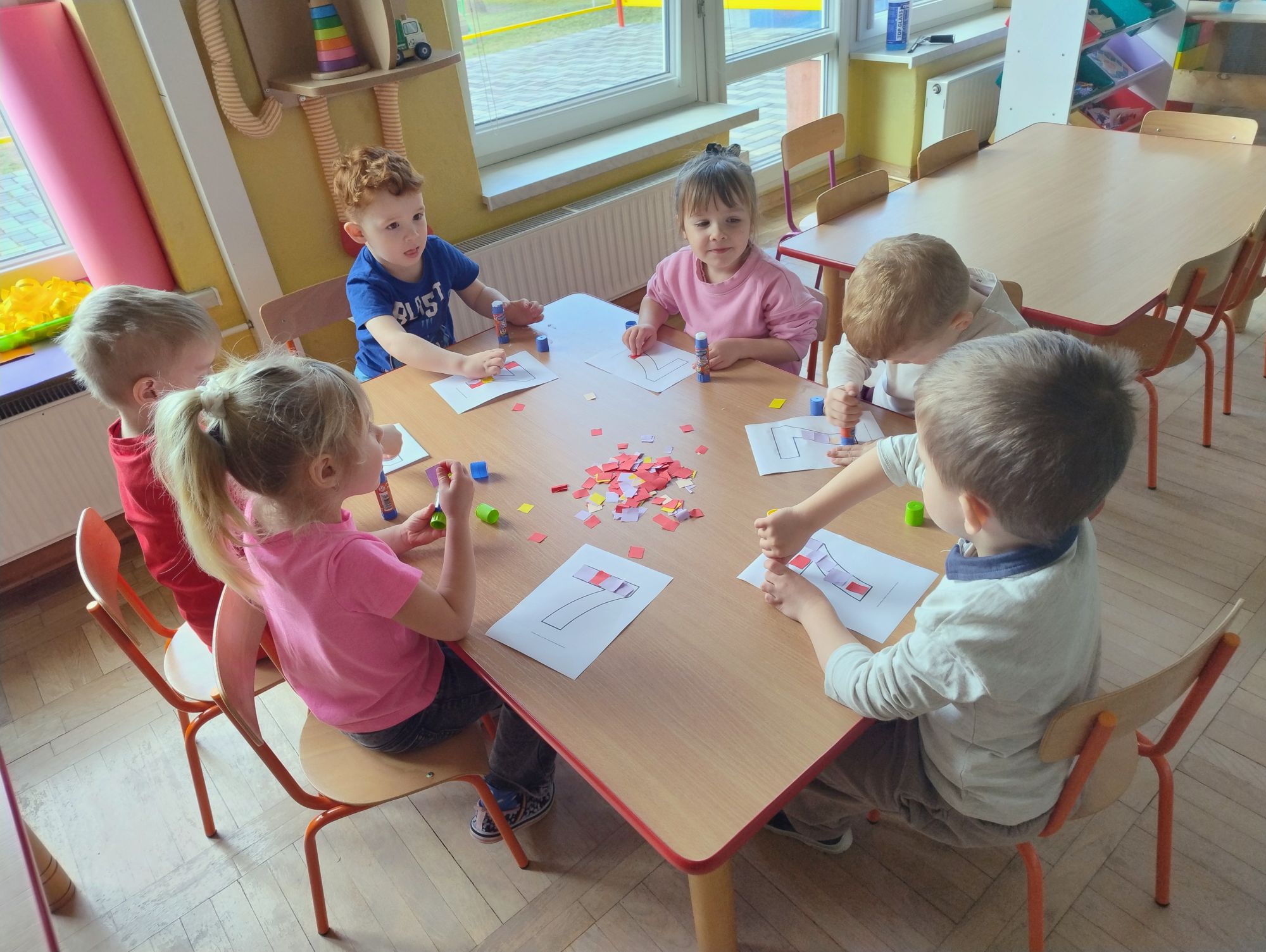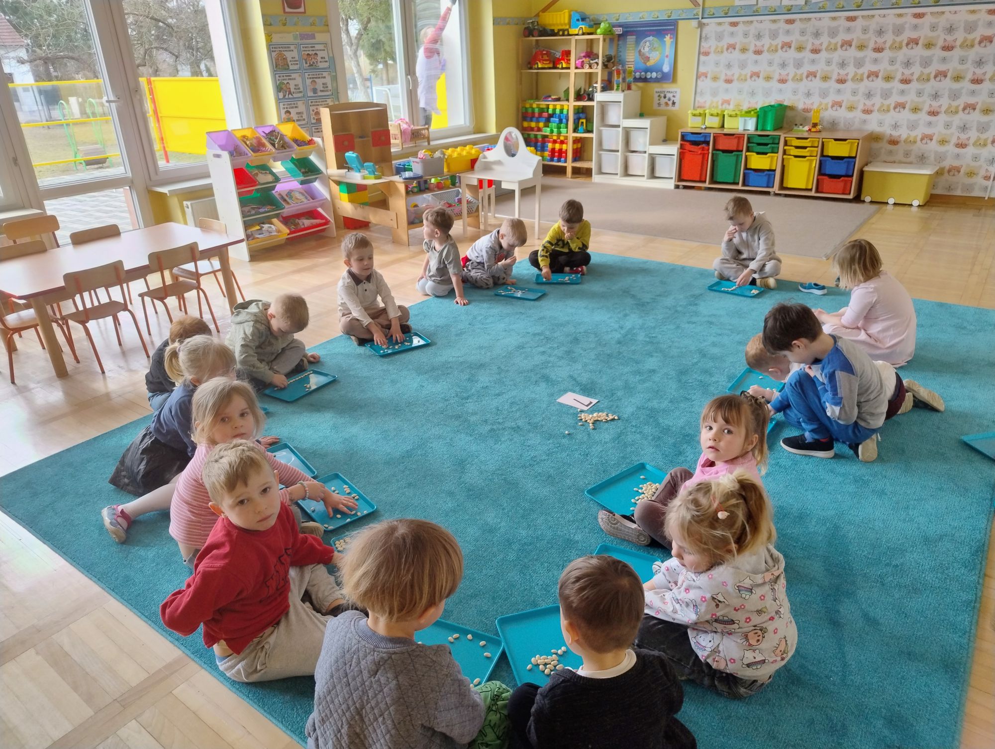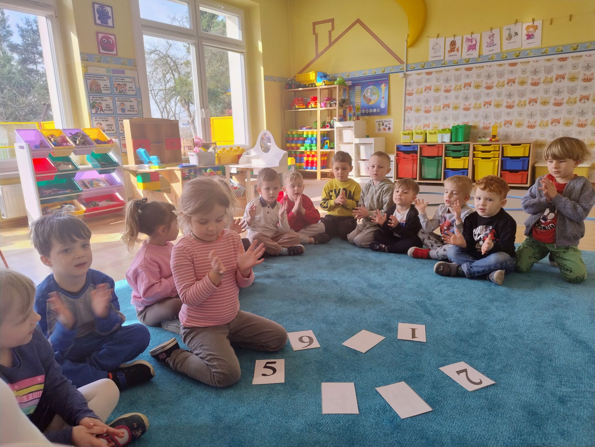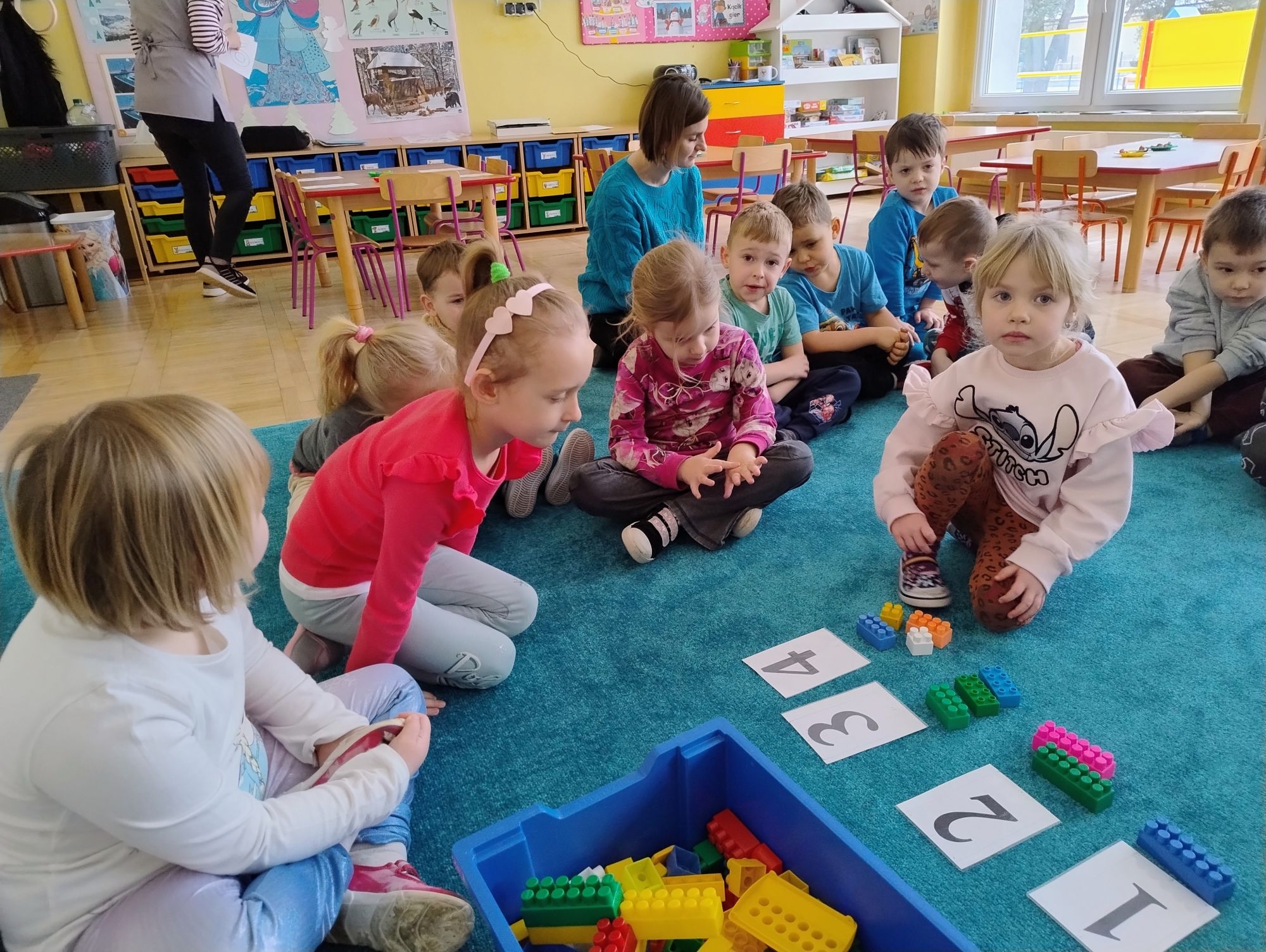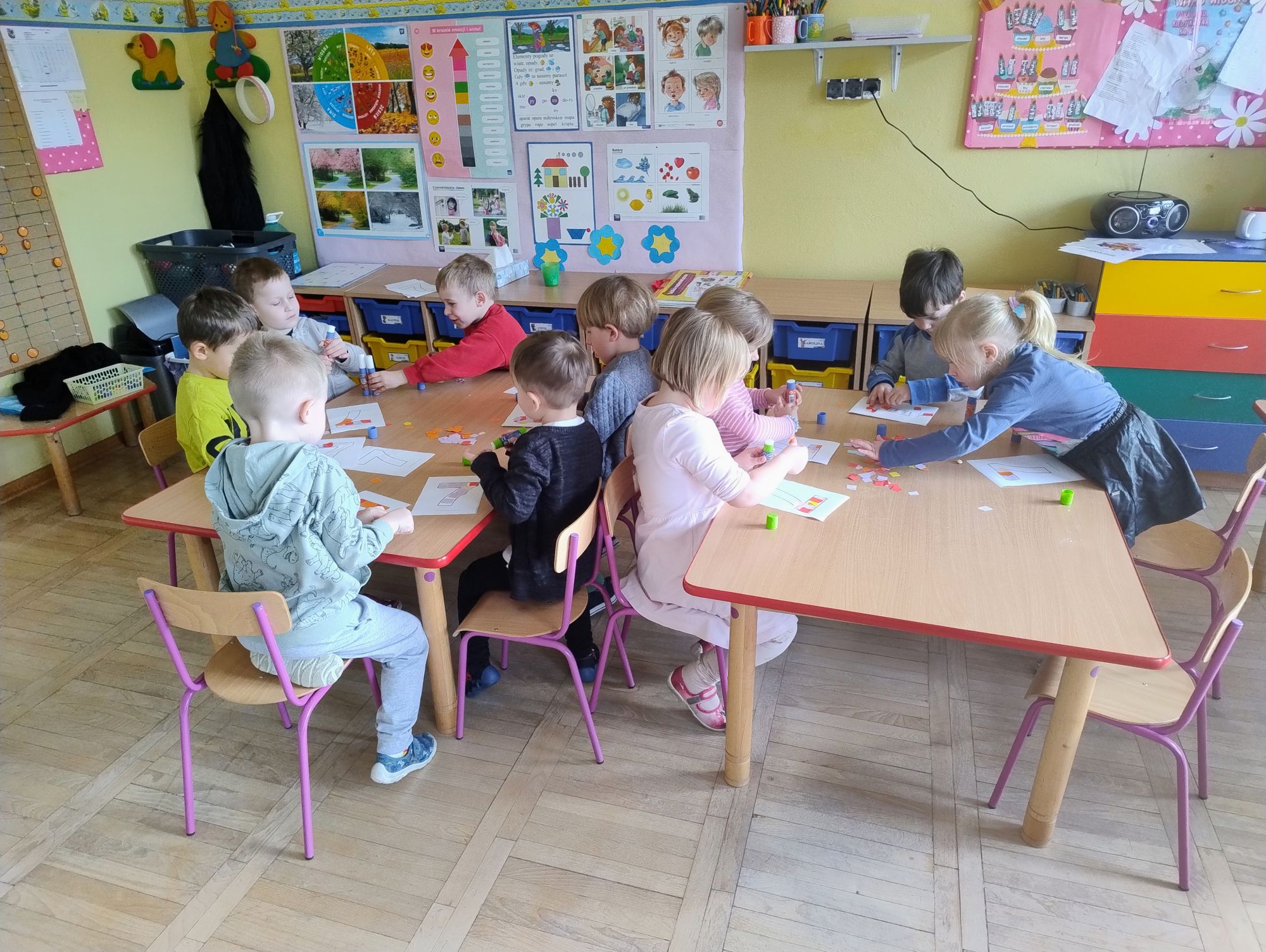 Przedszkolaki z młodszej grupy w ramach realizacji innowacji pedagogicznej "Wesoła matematyka" autorstwa Dominiki Gerlich uczestniczyły w zajęciach matematycznych, które wprowadziły maluszki w magiczny świat matematyki. Dzieci zdobywały wiedzę i umiejętnosci, poprzez aktywny udział w zabawach ruchowych, tworząc prace plastyczne, recytujac wyliczanki i śpiewając piosenki. Wszystkie te zadania pomogły im w nauce liczenia i poznawaniu cyfr. Różnorodne aktywności sprawiły, że maluszki chętnie angażowały sie w zadania i szybciej przyswajały nowe wiadomości. Z zaciekawieniem przeliczały różne przedmioty dopasowywując ich liczbę do odpowiedniej cyfry. Do zajęc posłużyły, m.in, kostka do gry, fasola, plastikowe korki. Dzieci z dużym zaangażowaniem układały kształty cyfr. Innowacja napisana przez wychowawcę, to forma nauki, która sprzyja lepszemu zapamiętywaniu, ale przede wszystkim daje radość i buduje pozytywne skojarzenia z matematyką od najmłodszych lat.