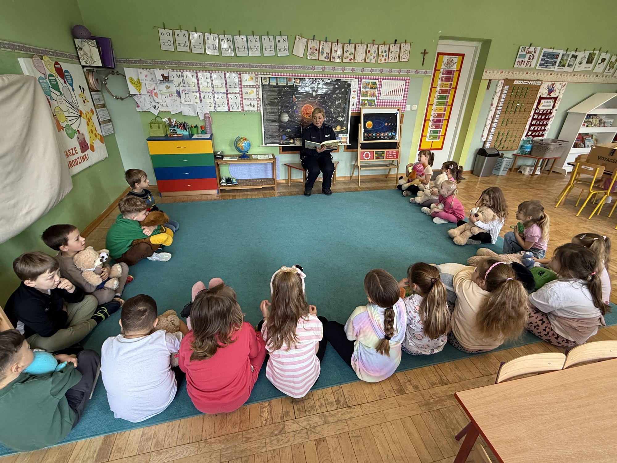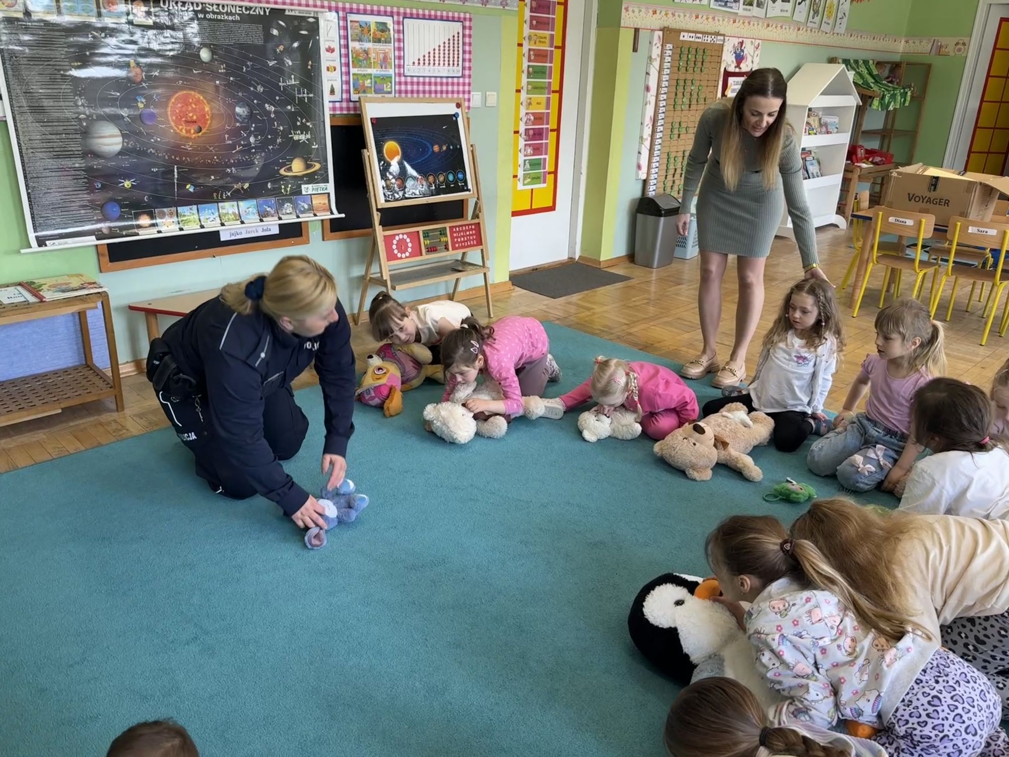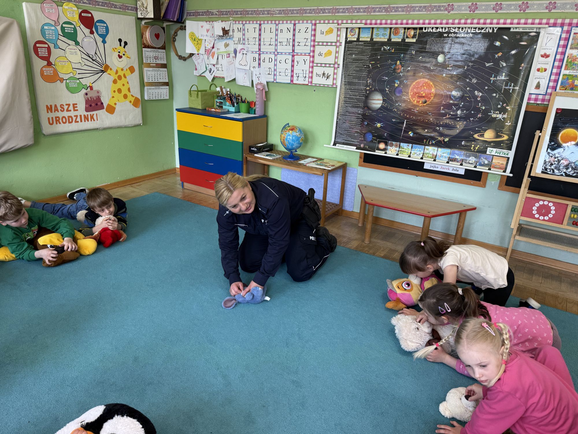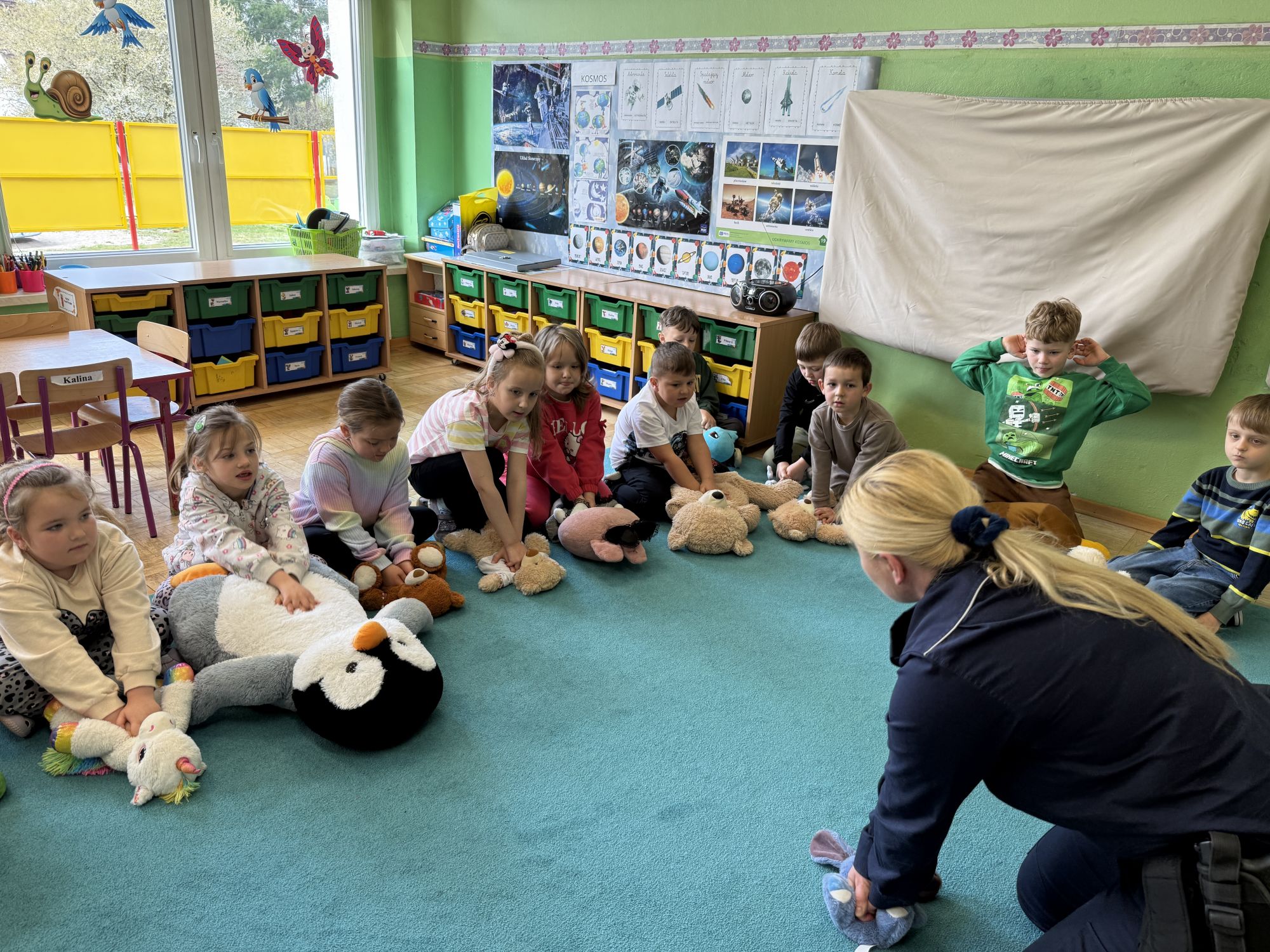 17 kwietnia nasze starszaki wzięły udział w programie edukacyjnym „Przedszkolak ratuje”, zainicjowanym przez Samorząd Województwa Opolskiego we współpracy z opolską Policją oraz Opolskim Centrum Edukacji. Celem programu jest nauczenie dzieci w wieku 5–6 lat, jak bezpiecznie reagować w sytuacjach zagrożenia. Zajęcia na terenie województwa opolskiego prowadzone są przez policjantów, ratowników medycznych oraz strażaków, którzy w przystępny sposób przekazują najmłodszym zasady bezpieczeństwa, uczą korzystania z numerów alarmowych oraz podstaw pierwszej pomocy – w tym ucisków klatki piersiowej. W naszym przedszkolu takie zajęcia przeprowadziła przedstawicielka Policji – mł. asp. Justyna Hamela. Spotkanie rozpoczęło się od wysłuchania książki Izabeli Michty „Łukasz ratuje Misia, czyli jak udzielać pierwszej pomocy”. Opowiadanie było punktem wyjścia do rozmów oraz działań praktycznych. Przedszkolaki uczyły się, jak reagować w sytuacjach zagrożenia życia – ćwiczyły udzielanie pierwszej pomocy na swoich ulubionych pluszakach oraz utrwalały znajomość numeru alarmowego 112. Na zakończenie zajęć każde dziecko otrzymało od naszego gościa odblaskowy worek oraz pamiątkowy medal. Było to niezwykle wartościowe spotkanie, które w atrakcyjny sposób połączyło zabawę z nauką. Zdobyta wiedza i umiejętności mogą w przyszłości pomóc uratować ludzkie życie.