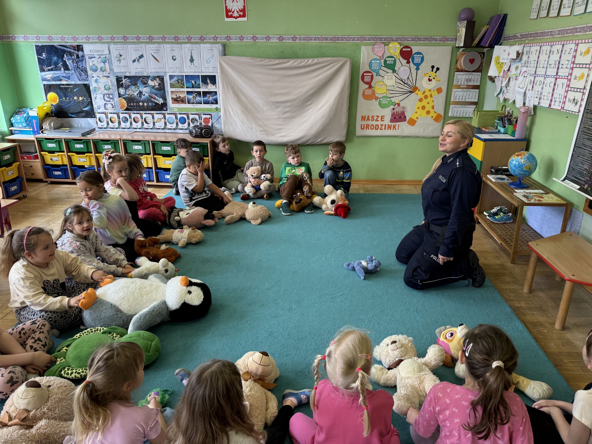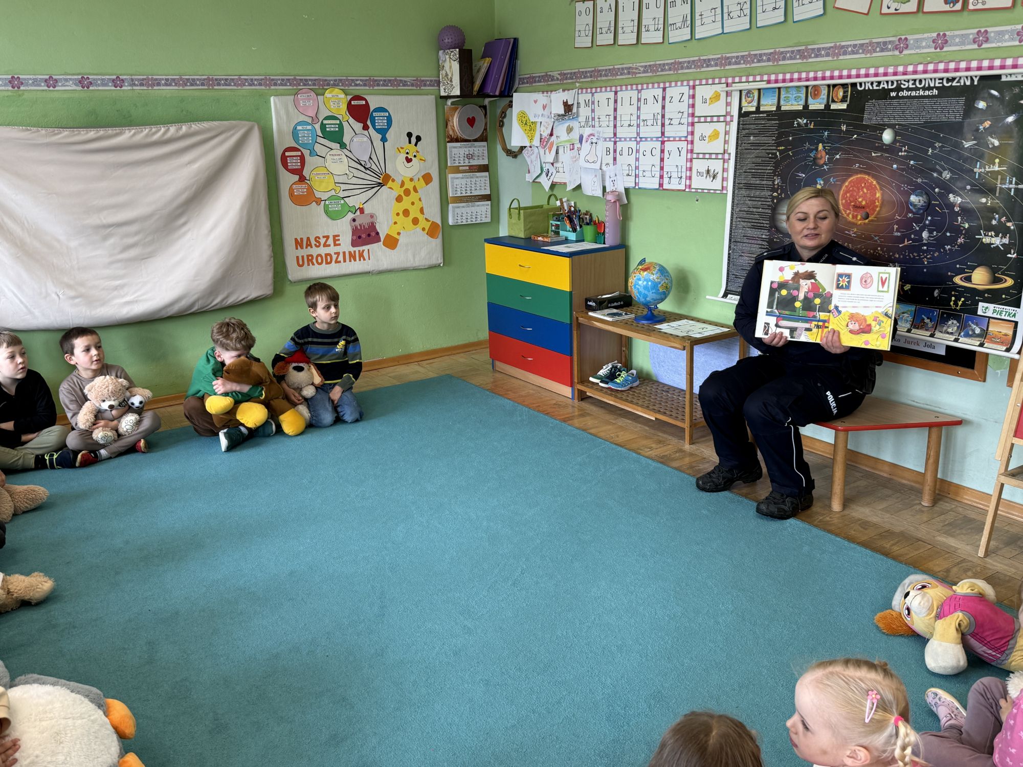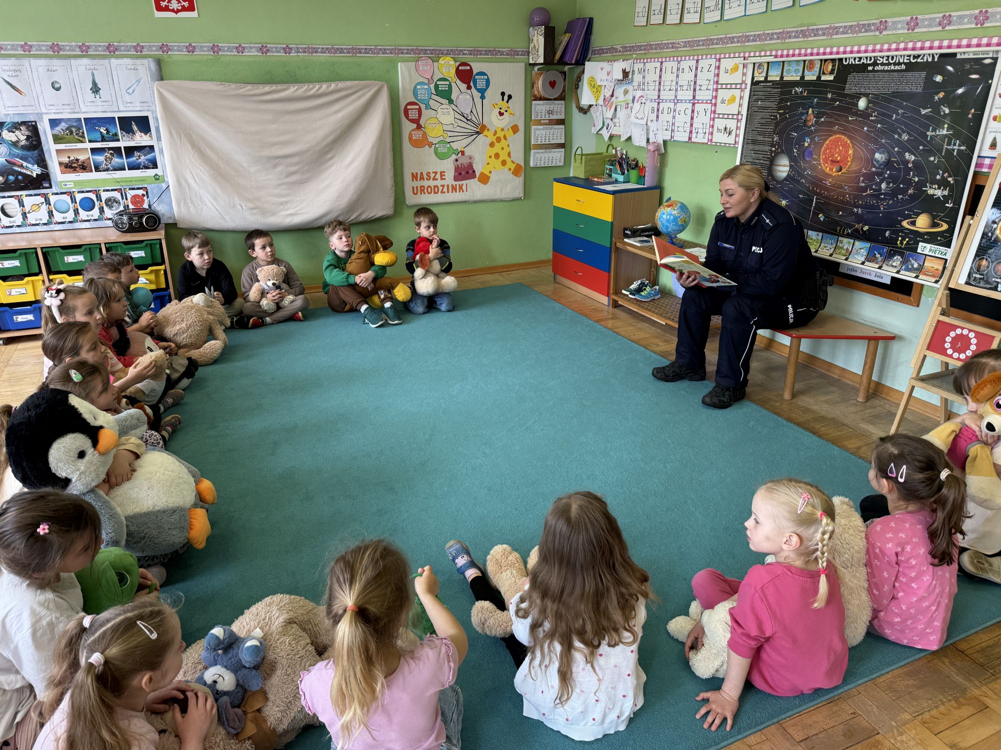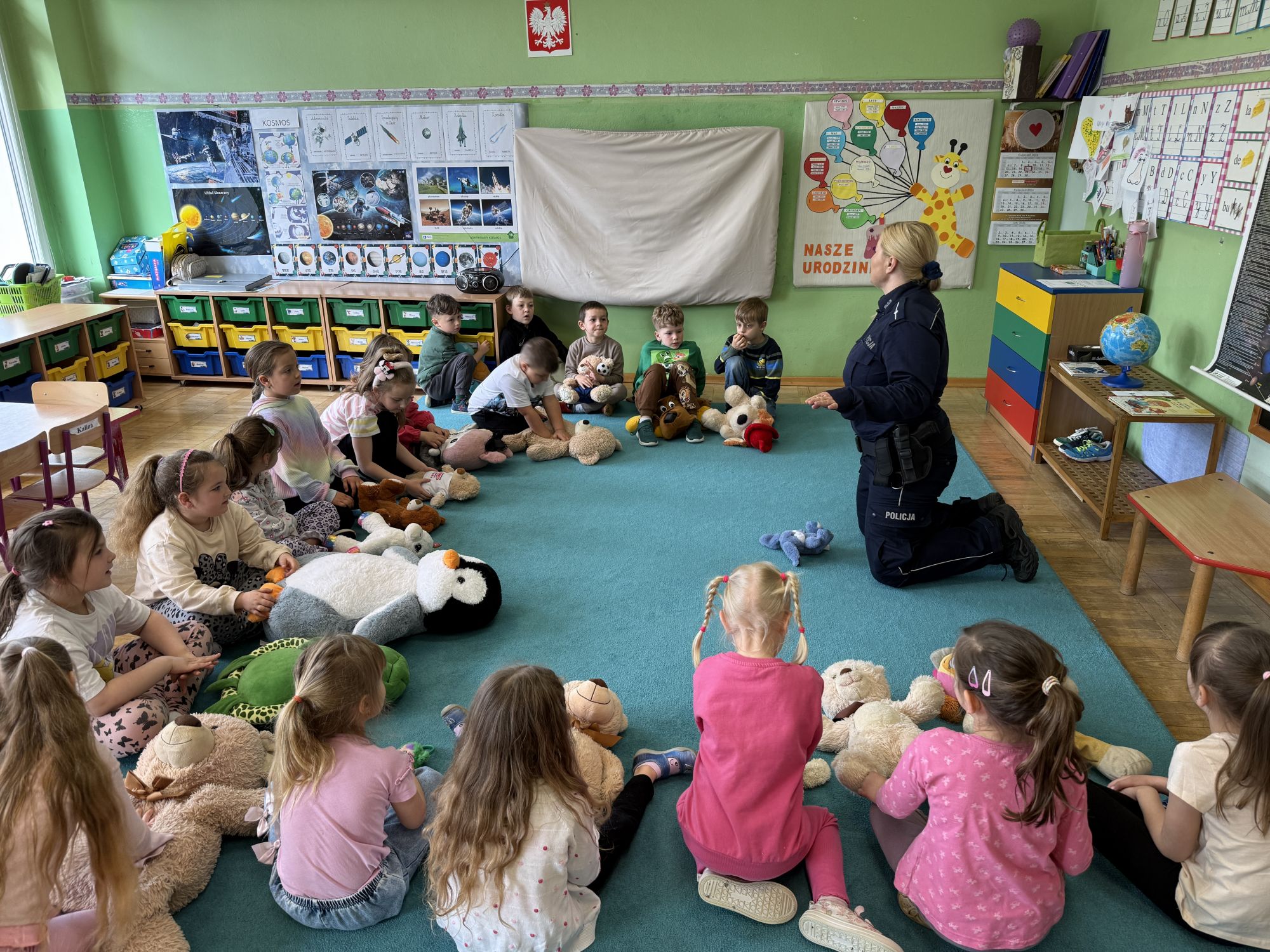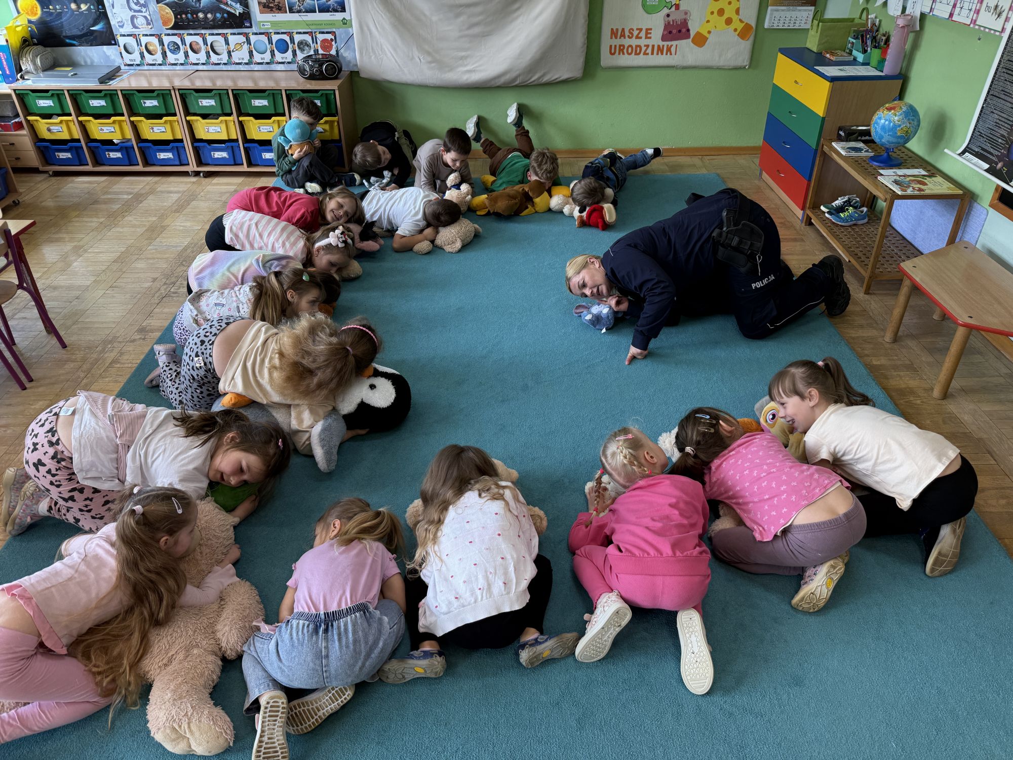 17 kwietnia nasze starszaki wzięły udział w programie edukacyjnym „Przedszkolak ratuje”, zainicjowanym przez Samorząd Województwa Opolskiego we współpracy z opolską Policją oraz Opolskim Centrum Edukacji. Celem programu jest nauczenie dzieci w wieku 5–6 lat, jak bezpiecznie reagować w sytuacjach zagrożenia. Zajęcia na terenie województwa opolskiego prowadzone są przez policjantów, ratowników medycznych oraz strażaków, którzy w przystępny sposób przekazują najmłodszym zasady bezpieczeństwa, uczą korzystania z numerów alarmowych oraz podstaw pierwszej pomocy – w tym ucisków klatki piersiowej. W naszym przedszkolu takie zajęcia przeprowadziła przedstawicielka Policji – mł. asp. Justyna Hamela. Spotkanie rozpoczęło się od wysłuchania książki Izabeli Michty „Łukasz ratuje Misia, czyli jak udzielać pierwszej pomocy”. Opowiadanie było punktem wyjścia do rozmów oraz działań praktycznych. Przedszkolaki uczyły się, jak reagować w sytuacjach zagrożenia życia – ćwiczyły udzielanie pierwszej pomocy na swoich ulubionych pluszakach oraz utrwalały znajomość numeru alarmowego 112. Na zakończenie zajęć każde dziecko otrzymało od naszego gościa odblaskowy worek oraz pamiątkowy medal. Było to niezwykle wartościowe spotkanie, które w atrakcyjny sposób połączyło zabawę z nauką. Zdobyta wiedza i umiejętności mogą w przyszłości pomóc uratować ludzkie życie.