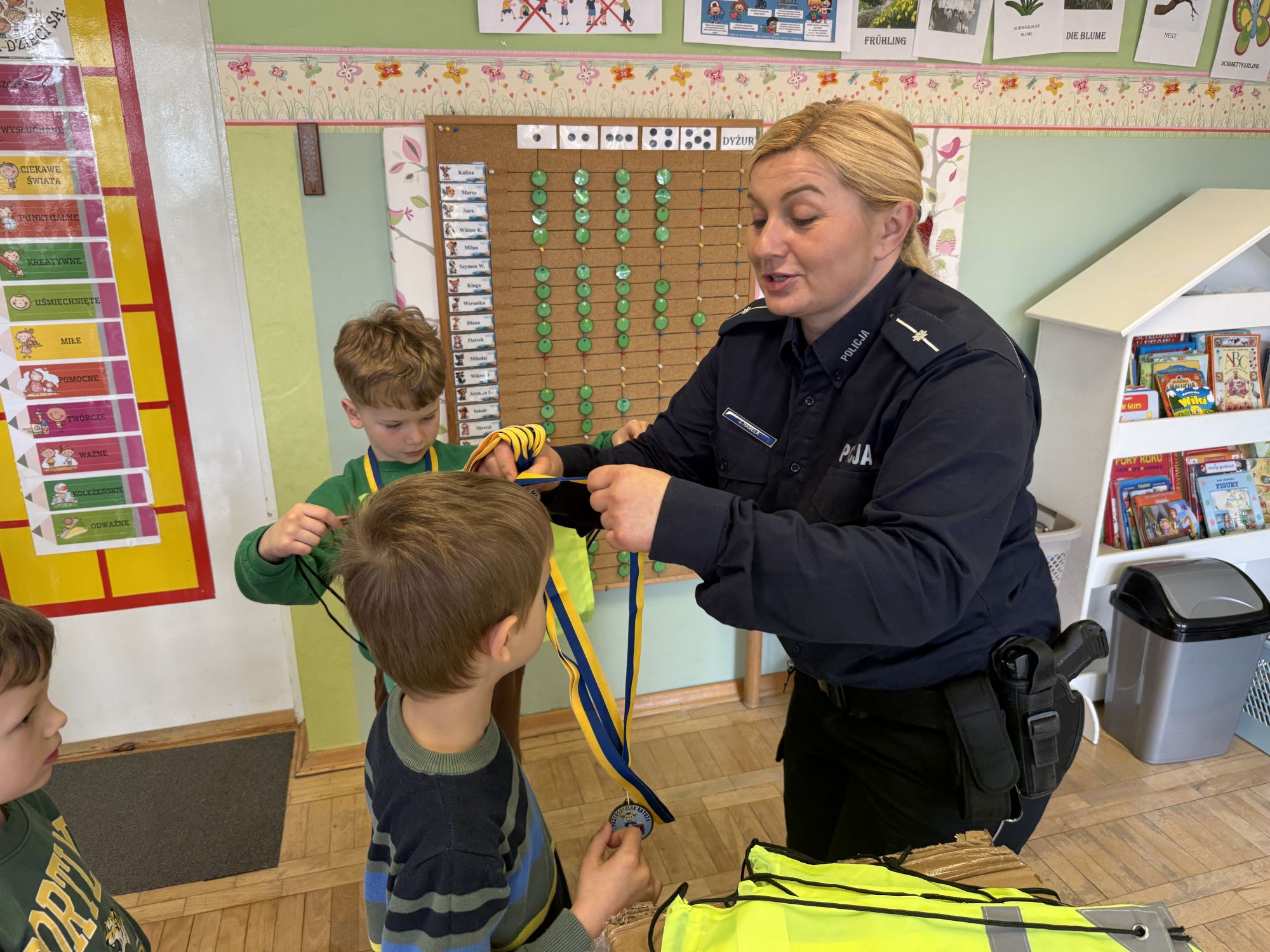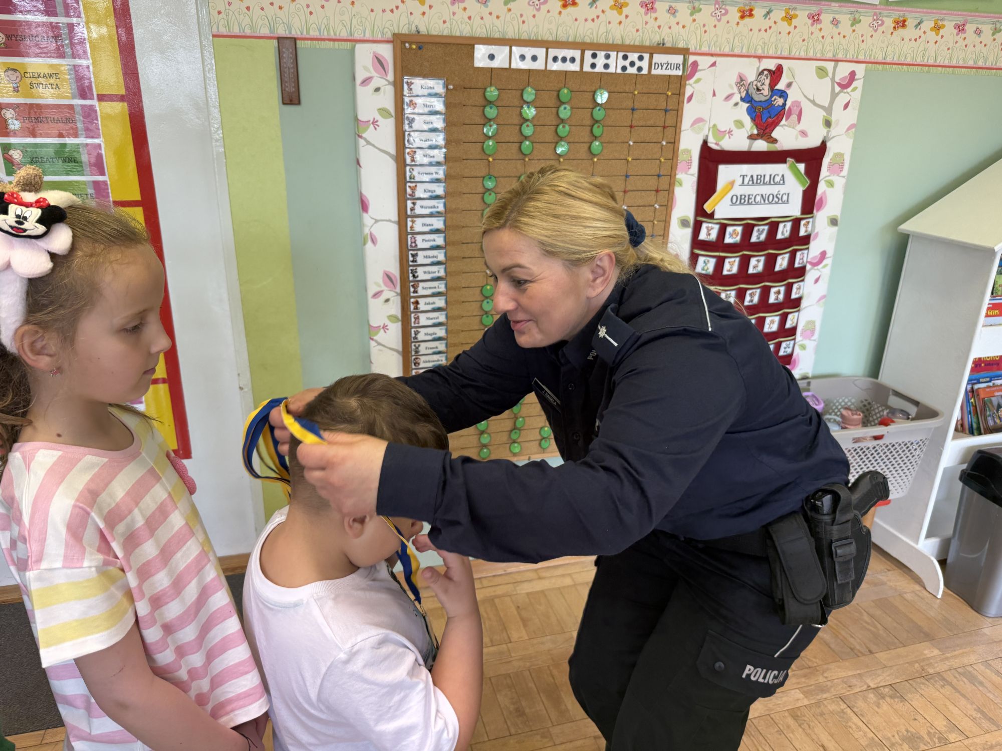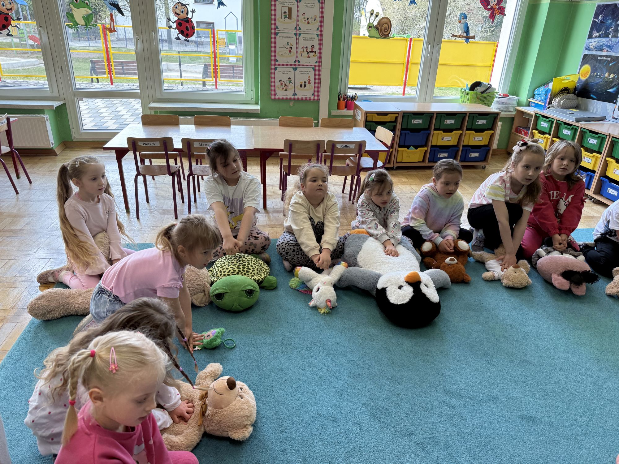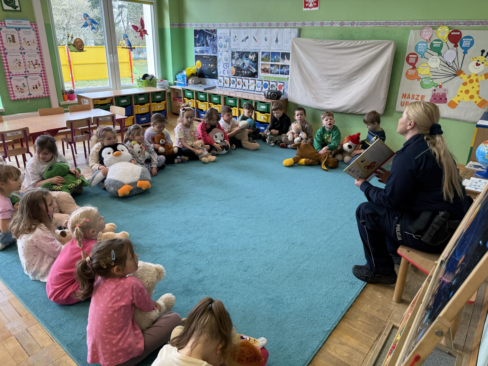 17 kwietnia nasze starszaki wzięły udział w programie edukacyjnym „Przedszkolak ratuje”, zainicjowanym przez Samorząd Województwa Opolskiego we współpracy z opolską Policją oraz Opolskim Centrum Edukacji. Celem programu jest nauczenie dzieci w wieku 5–6 lat, jak bezpiecznie reagować w sytuacjach zagrożenia. Zajęcia na terenie województwa opolskiego prowadzone są przez policjantów, ratowników medycznych oraz strażaków, którzy w przystępny sposób przekazują najmłodszym zasady bezpieczeństwa, uczą korzystania z numerów alarmowych oraz podstaw pierwszej pomocy – w tym ucisków klatki piersiowej. W naszym przedszkolu takie zajęcia przeprowadziła przedstawicielka Policji – mł. asp. Justyna Hamela. Spotkanie rozpoczęło się od wysłuchania książki Izabeli Michty „Łukasz ratuje Misia, czyli jak udzielać pierwszej pomocy”. Opowiadanie było punktem wyjścia do rozmów oraz działań praktycznych. Przedszkolaki uczyły się, jak reagować w sytuacjach zagrożenia życia – ćwiczyły udzielanie pierwszej pomocy na swoich ulubionych pluszakach oraz utrwalały znajomość numeru alarmowego 112. Na zakończenie zajęć każde dziecko otrzymało od naszego gościa odblaskowy worek oraz pamiątkowy medal. Było to niezwykle wartościowe spotkanie, które w atrakcyjny sposób połączyło zabawę z nauką. Zdobyta wiedza i umiejętności mogą w przyszłości pomóc uratować ludzkie życie.