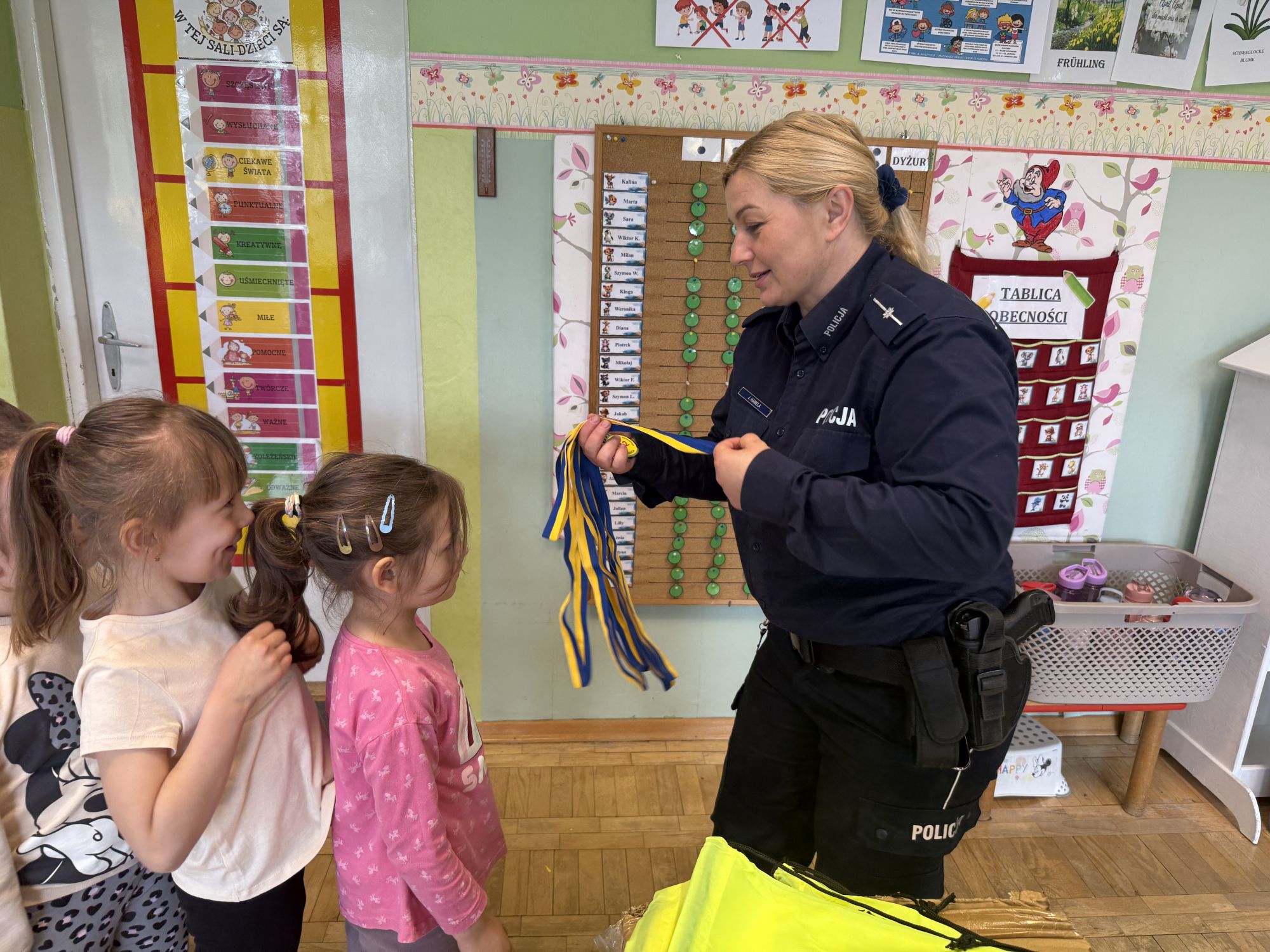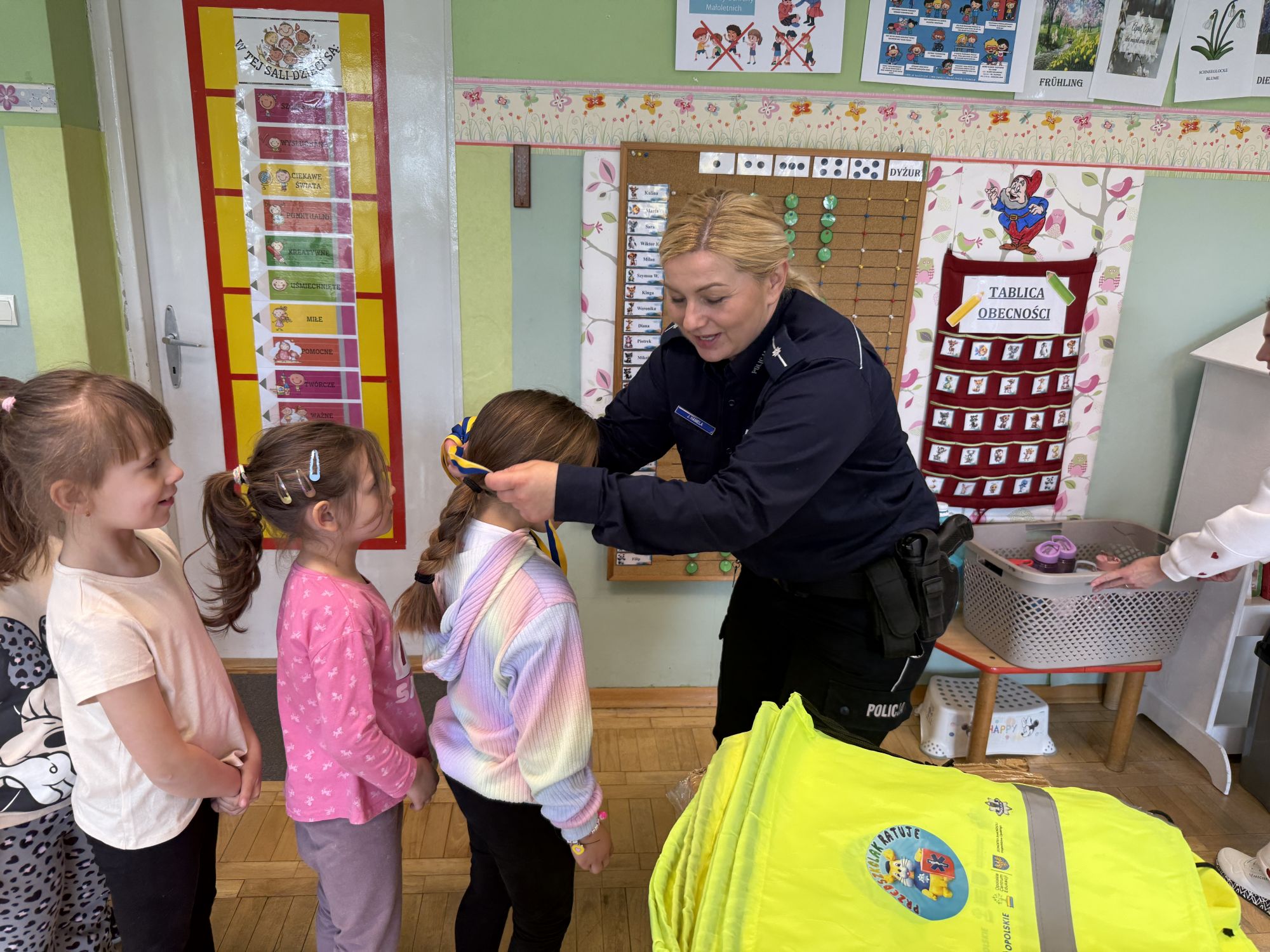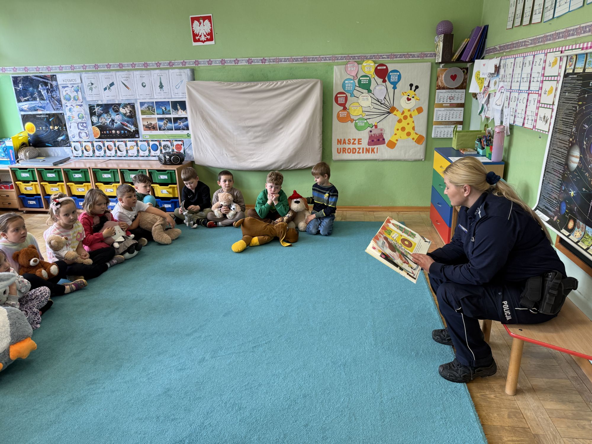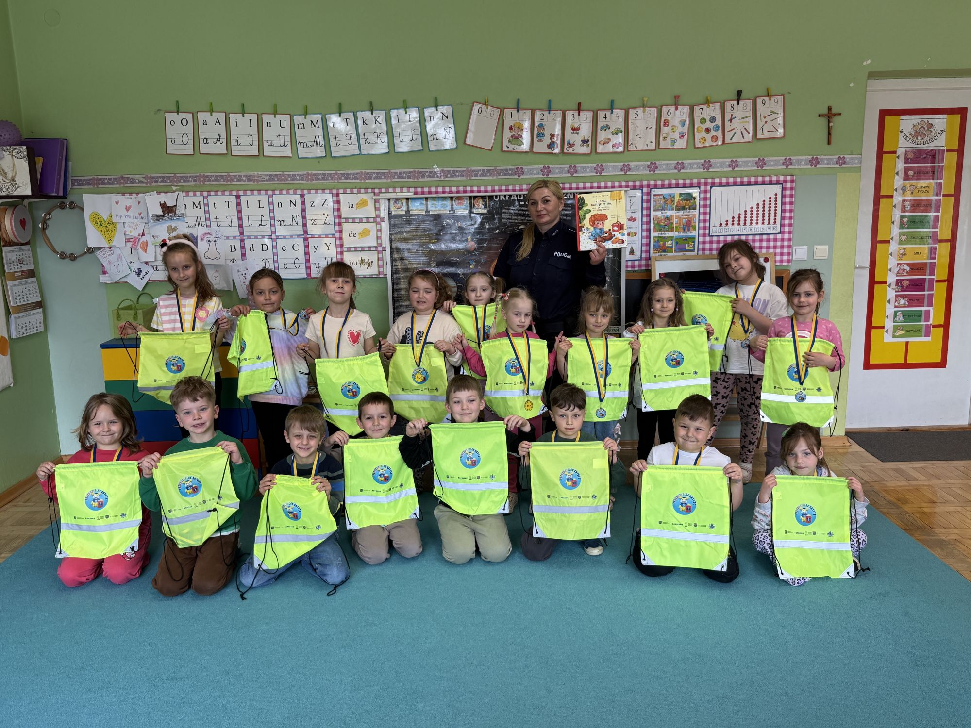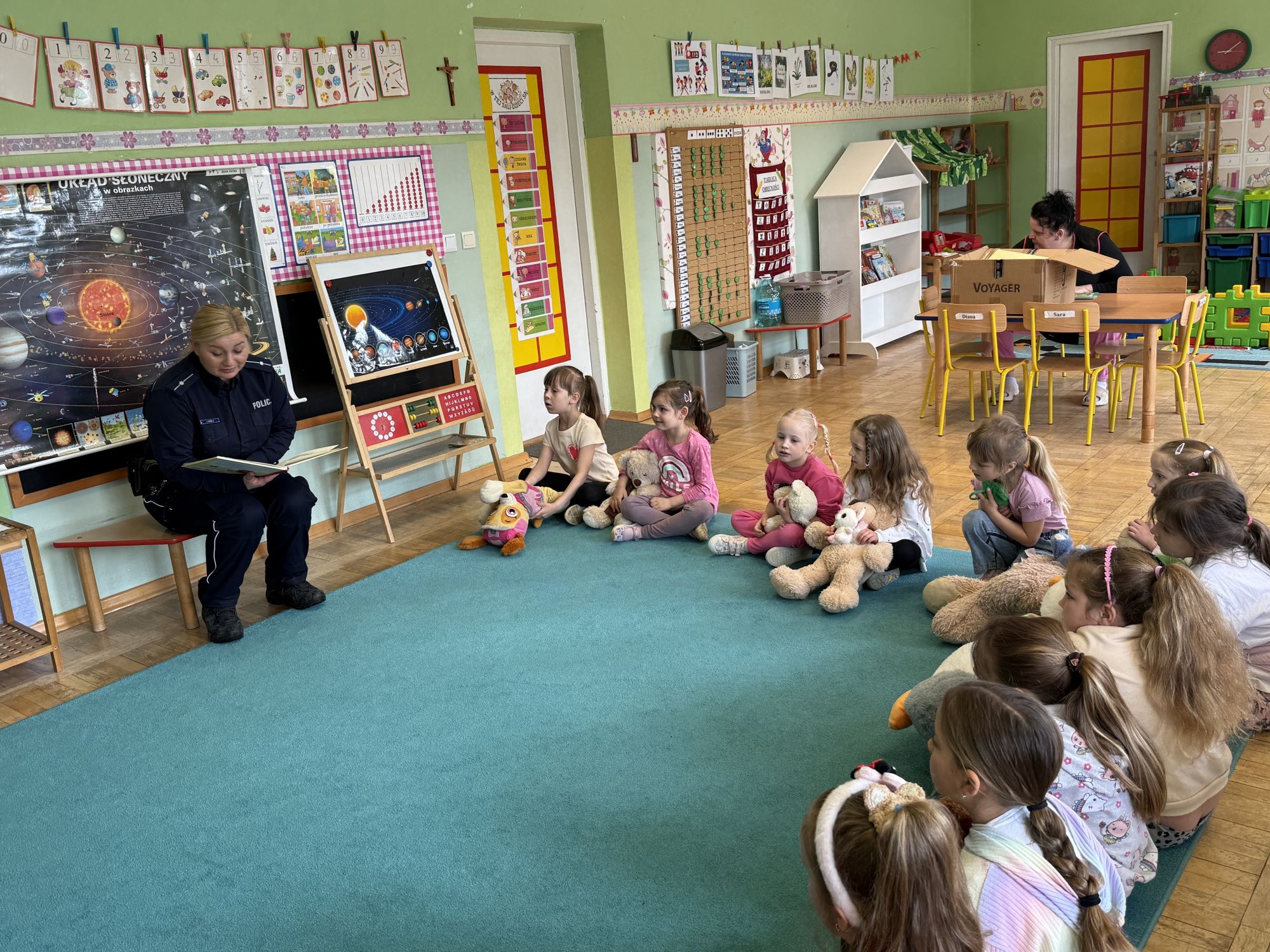 17 kwietnia nasze starszaki wzięły udział w programie edukacyjnym „Przedszkolak ratuje”, zainicjowanym przez Samorząd Województwa Opolskiego we współpracy z opolską Policją oraz Opolskim Centrum Edukacji. Celem programu jest nauczenie dzieci w wieku 5–6 lat, jak bezpiecznie reagować w sytuacjach zagrożenia. Zajęcia na terenie województwa opolskiego prowadzone są przez policjantów, ratowników medycznych oraz strażaków, którzy w przystępny sposób przekazują najmłodszym zasady bezpieczeństwa, uczą korzystania z numerów alarmowych oraz podstaw pierwszej pomocy – w tym ucisków klatki piersiowej. W naszym przedszkolu takie zajęcia przeprowadziła przedstawicielka Policji – mł. asp. Justyna Hamela. Spotkanie rozpoczęło się od wysłuchania książki Izabeli Michty „Łukasz ratuje Misia, czyli jak udzielać pierwszej pomocy”. Opowiadanie było punktem wyjścia do rozmów oraz działań praktycznych. Przedszkolaki uczyły się, jak reagować w sytuacjach zagrożenia życia – ćwiczyły udzielanie pierwszej pomocy na swoich ulubionych pluszakach oraz utrwalały znajomość numeru alarmowego 112. Na zakończenie zajęć każde dziecko otrzymało od naszego gościa odblaskowy worek oraz pamiątkowy medal. Było to niezwykle wartościowe spotkanie, które w atrakcyjny sposób połączyło zabawę z nauką. Zdobyta wiedza i umiejętności mogą w przyszłości pomóc uratować ludzkie życie.