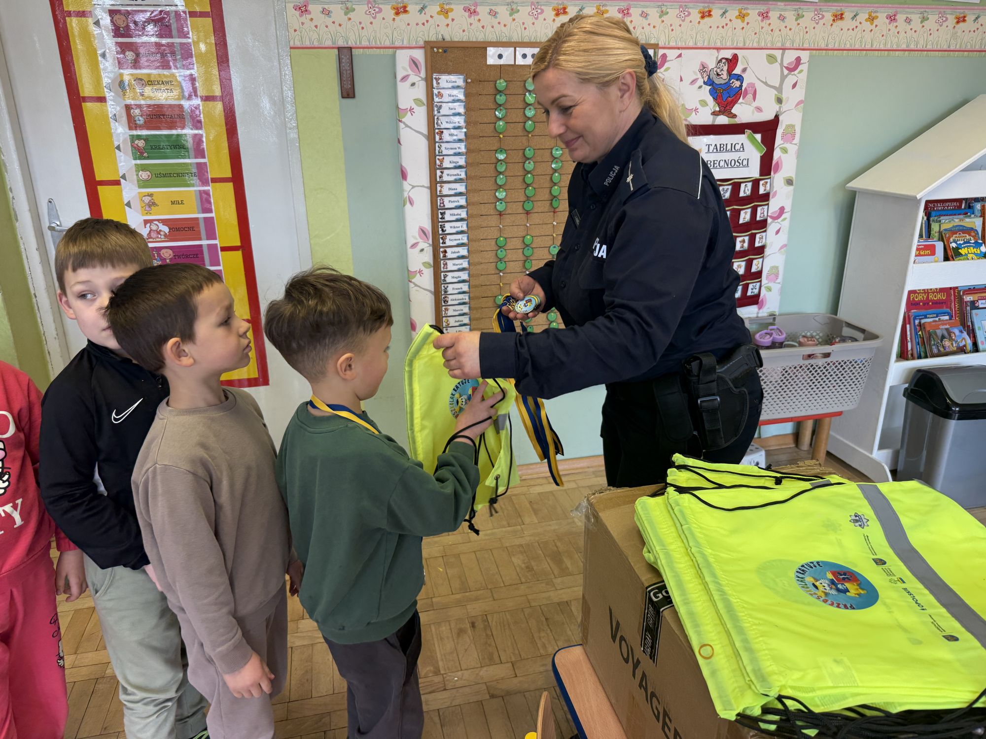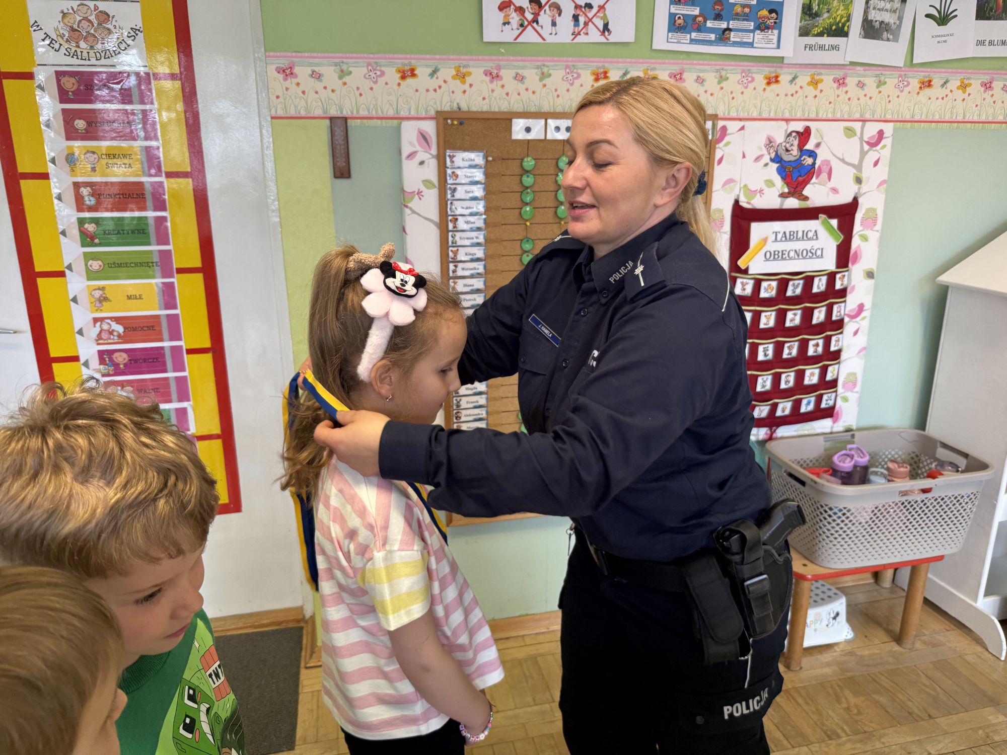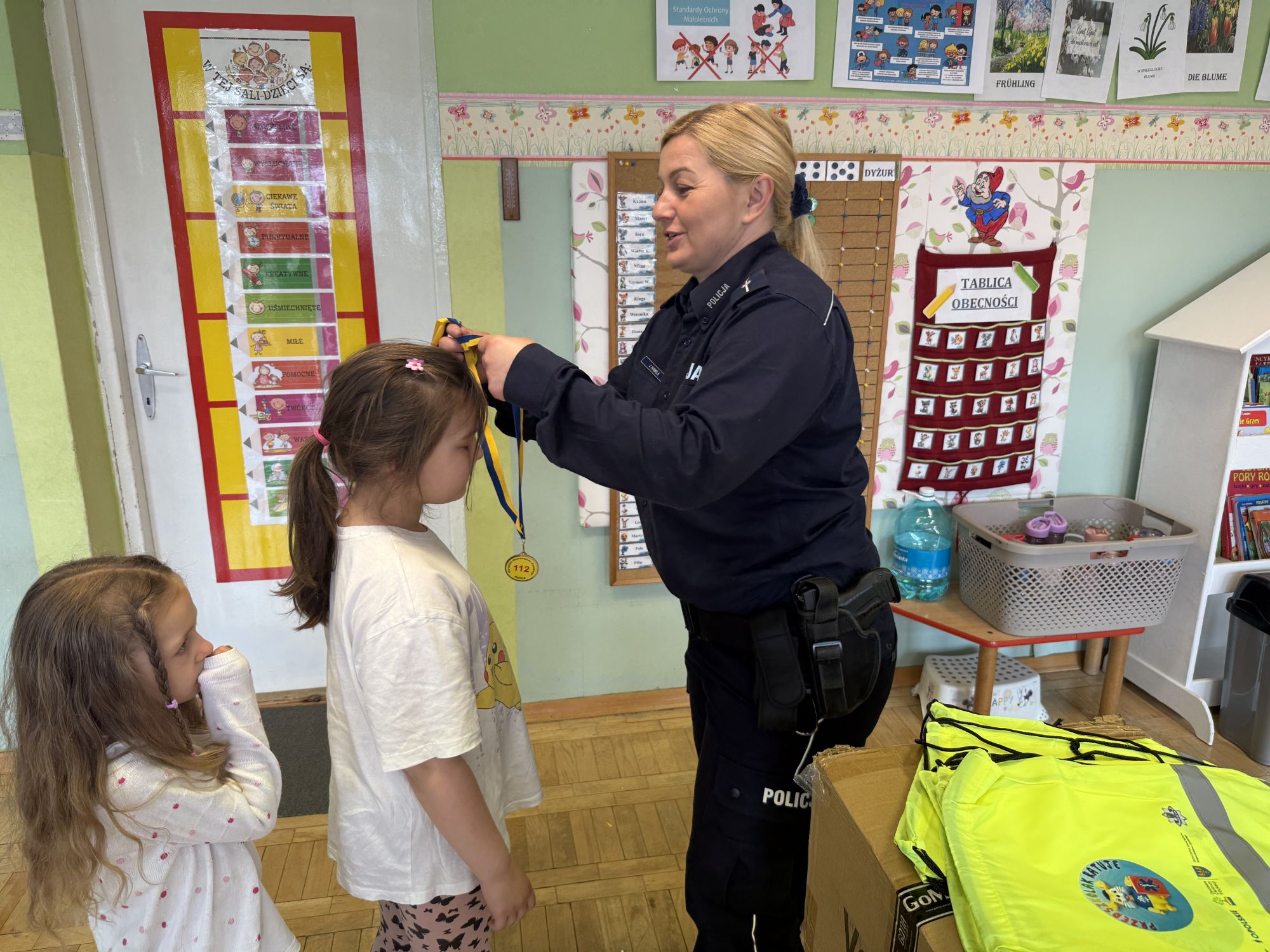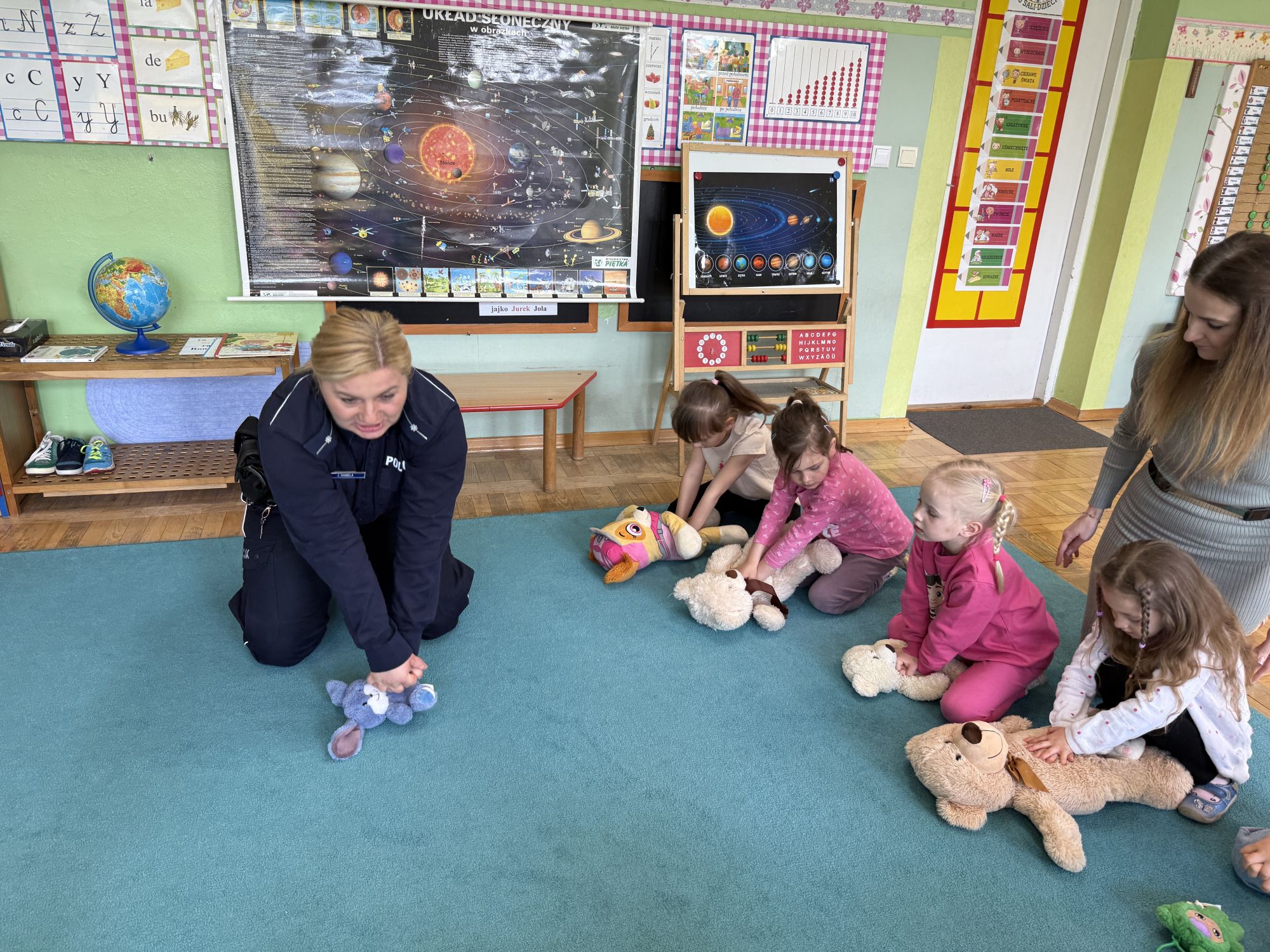 17 kwietnia nasze starszaki wzięły udział w programie edukacyjnym „Przedszkolak ratuje”, zainicjowanym przez Samorząd Województwa Opolskiego we współpracy z opolską Policją oraz Opolskim Centrum Edukacji. Celem programu jest nauczenie dzieci w wieku 5–6 lat, jak bezpiecznie reagować w sytuacjach zagrożenia. Zajęcia na terenie województwa opolskiego prowadzone są przez policjantów, ratowników medycznych oraz strażaków, którzy w przystępny sposób przekazują najmłodszym zasady bezpieczeństwa, uczą korzystania z numerów alarmowych oraz podstaw pierwszej pomocy – w tym ucisków klatki piersiowej. W naszym przedszkolu takie zajęcia przeprowadziła przedstawicielka Policji – mł. asp. Justyna Hamela. Spotkanie rozpoczęło się od wysłuchania książki Izabeli Michty „Łukasz ratuje Misia, czyli jak udzielać pierwszej pomocy”. Opowiadanie było punktem wyjścia do rozmów oraz działań praktycznych. Przedszkolaki uczyły się, jak reagować w sytuacjach zagrożenia życia – ćwiczyły udzielanie pierwszej pomocy na swoich ulubionych pluszakach oraz utrwalały znajomość numeru alarmowego 112. Na zakończenie zajęć każde dziecko otrzymało od naszego gościa odblaskowy worek oraz pamiątkowy medal. Było to niezwykle wartościowe spotkanie, które w atrakcyjny sposób połączyło zabawę z nauką. Zdobyta wiedza i umiejętności mogą w przyszłości pomóc uratować ludzkie życie.