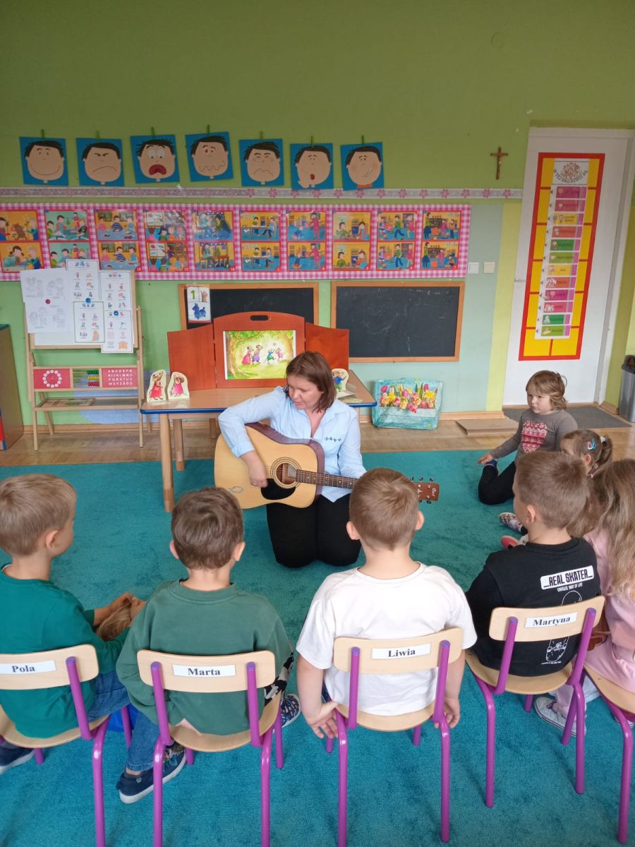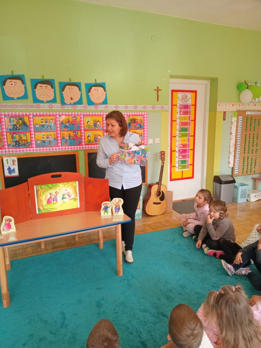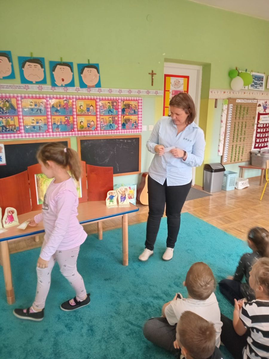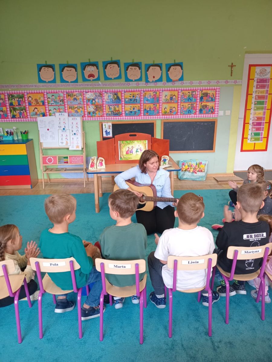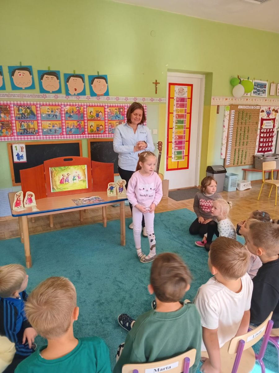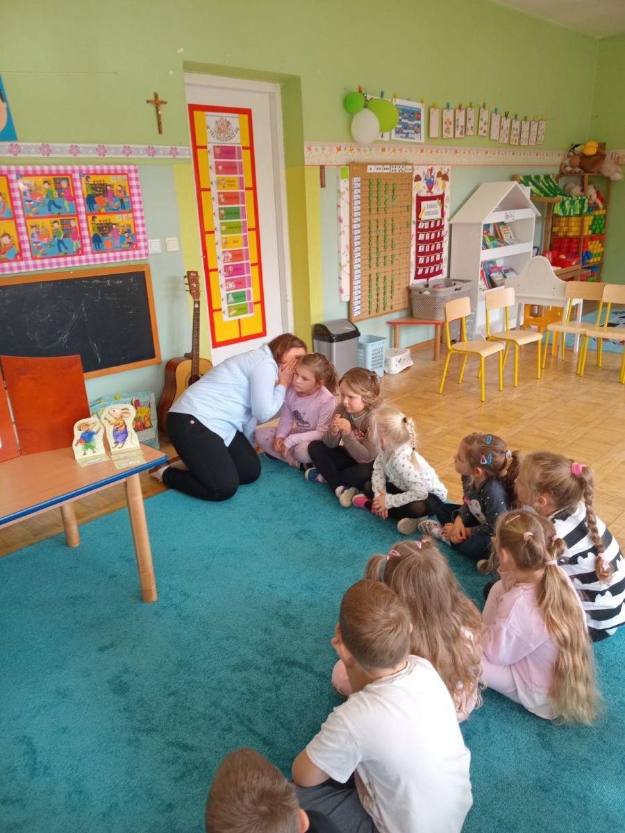 Nasze wszechstronne oddziaływania wspierają specjaliści, m.in. biblioterapeutka, Pani Anna Kępkowska. Drugiego października odwiedziła nas z bajką "Jak Nowatorscy przestali rozmawiać". Dzieci z zaciekawieniem wysłuchały opowiadania i z dużym entuzjazmem zaczęły rozmawiać o sytuacji głównych bohaterów. Zgodnie ustaliły, że żadne nawet najnowocześniejsze sprzęty domowe nie zastąpią rozmowy i współpracy. Po dyskusji przedszkolaki wzięły udział w zabawach rozwijających kompetencje społeczno-emocjonalne i komunikacyjne. Z łatwością rozwiązywały zagadki i dzieliły się swoimi doświadczeniami. Ciekawym akcentem na koniec spotkania była piosenka, której słowa "bo nikt nie ma z nas tego, co mamy razem" zaśpiewaliśmy razem przy melodii zagranej przez Panią Anię na gitarze.
