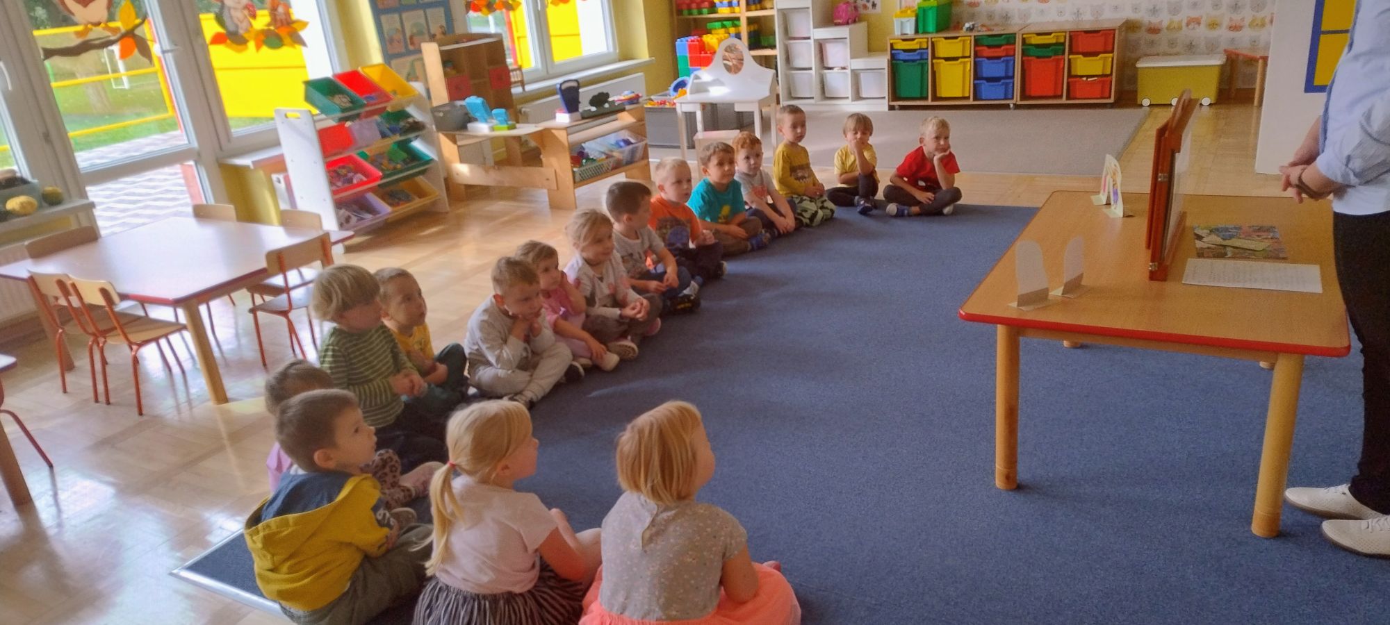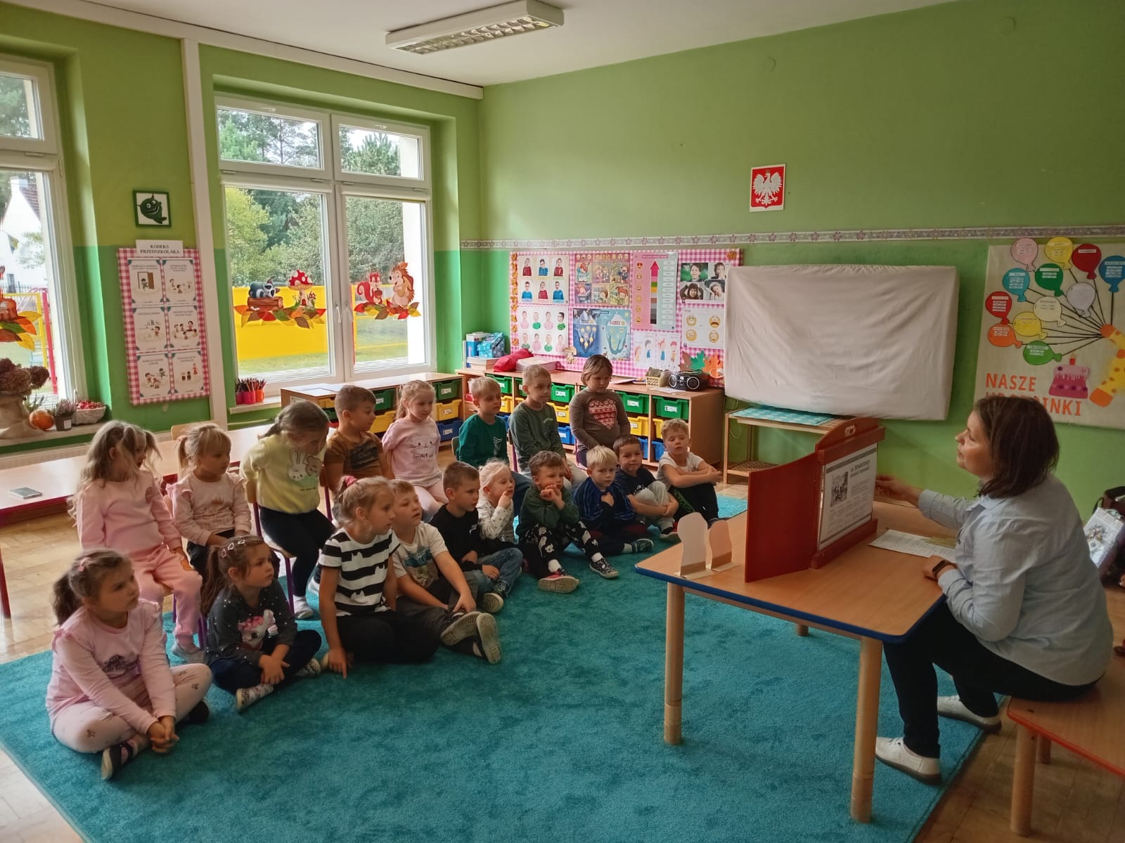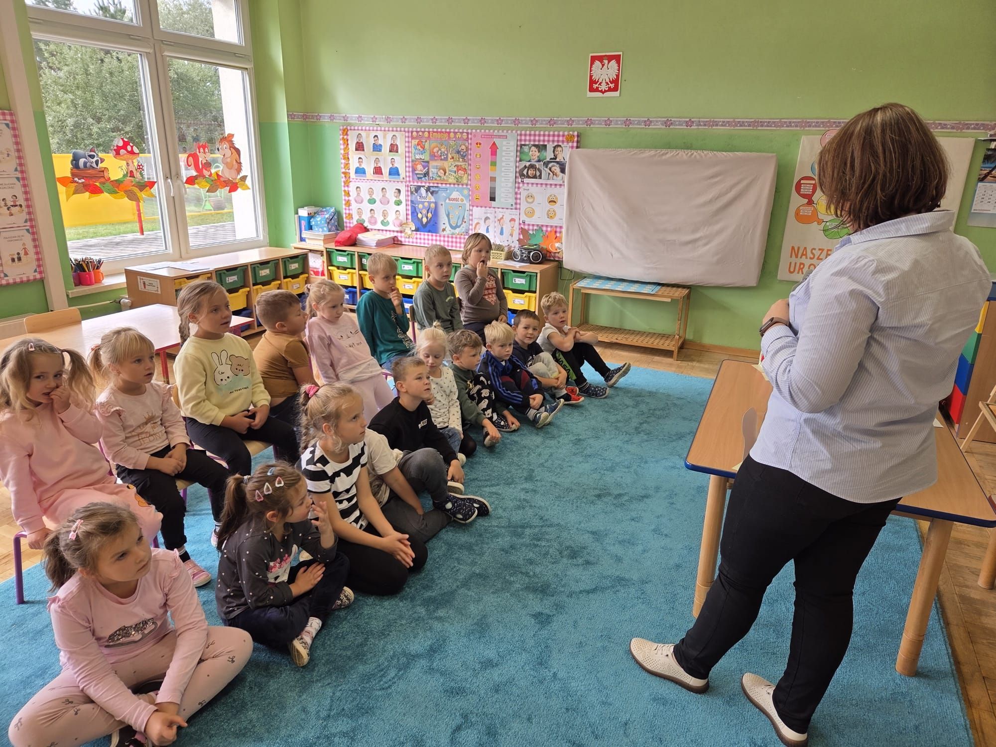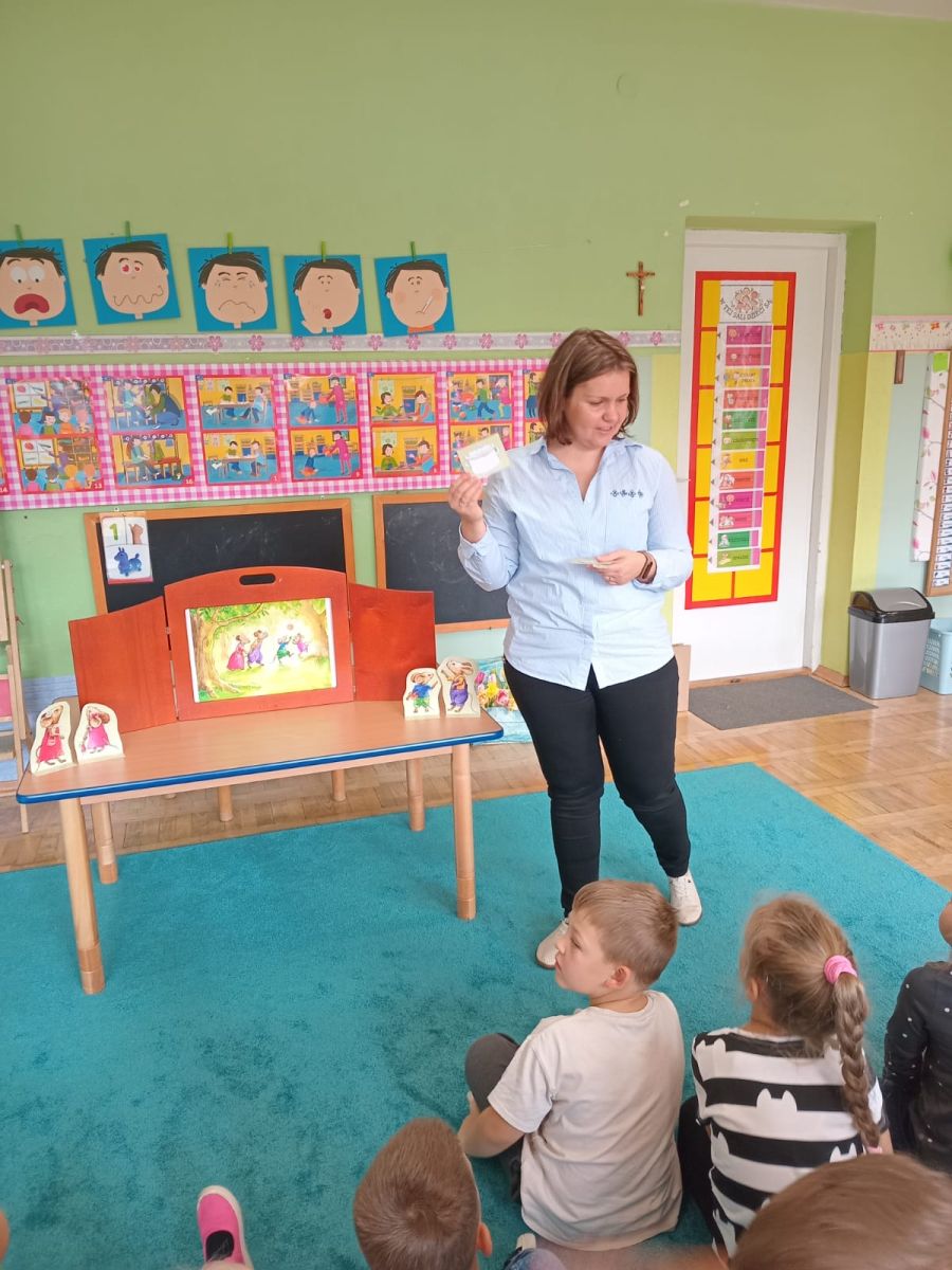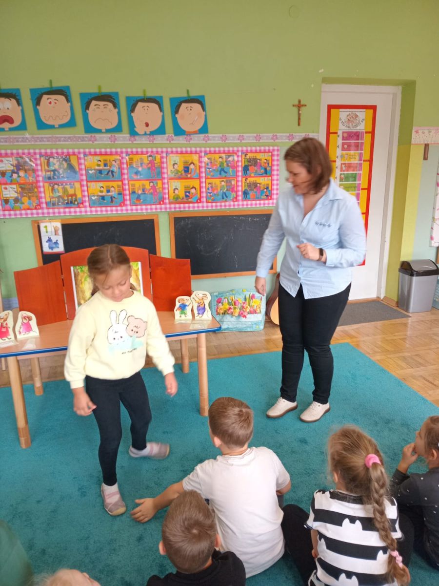 Nasze wszechstronne oddziaływania wspierają specjaliści, m.in. biblioterapeutka, Pani Anna Kępkowska. Drugiego października odwiedziła nas z bajką "Jak Nowatorscy przestali rozmawiać". Dzieci z zaciekawieniem wysłuchały opowiadania i z dużym entuzjazmem zaczęły rozmawiać o sytuacji głównych bohaterów. Zgodnie ustaliły, że żadne nawet najnowocześniejsze sprzęty domowe nie zastąpią rozmowy i współpracy. Po dyskusji przedszkolaki wzięły udział w zabawach rozwijających kompetencje społeczno-emocjonalne i komunikacyjne. Z łatwością rozwiązywały zagadki i dzieliły się swoimi doświadczeniami. Ciekawym akcentem na koniec spotkania była piosenka, której słowa "bo nikt nie ma z nas tego, co mamy razem" zaśpiewaliśmy razem przy melodii zagranej przez Panią Anię na gitarze.