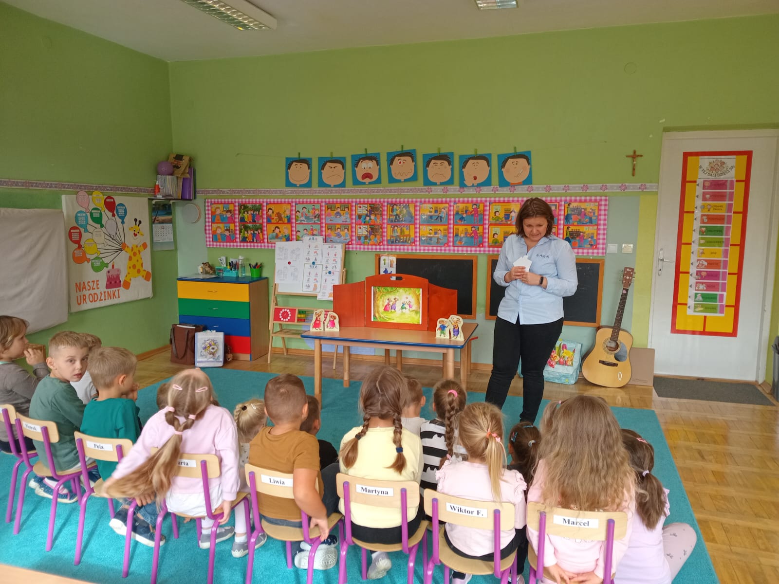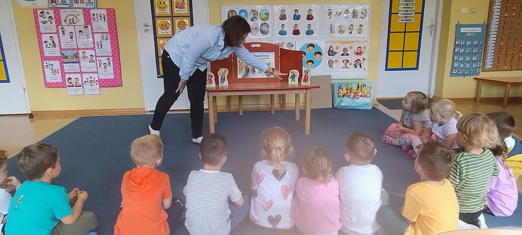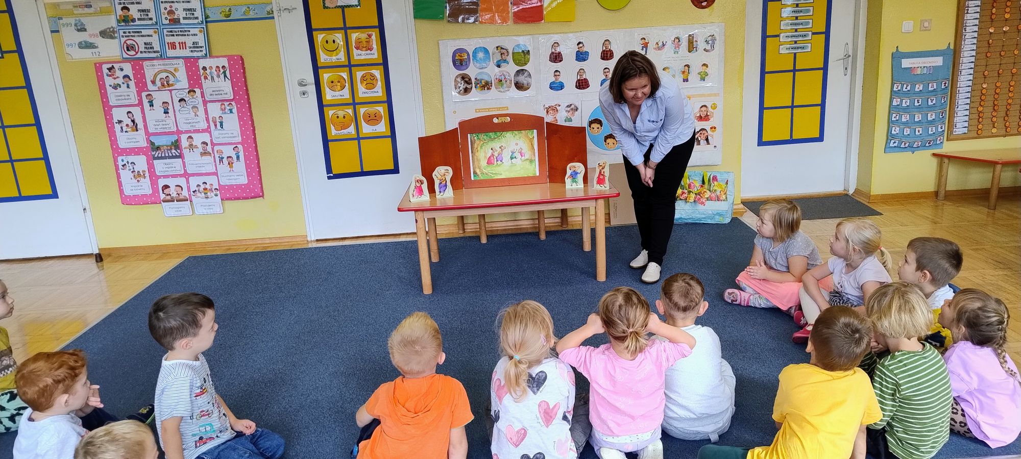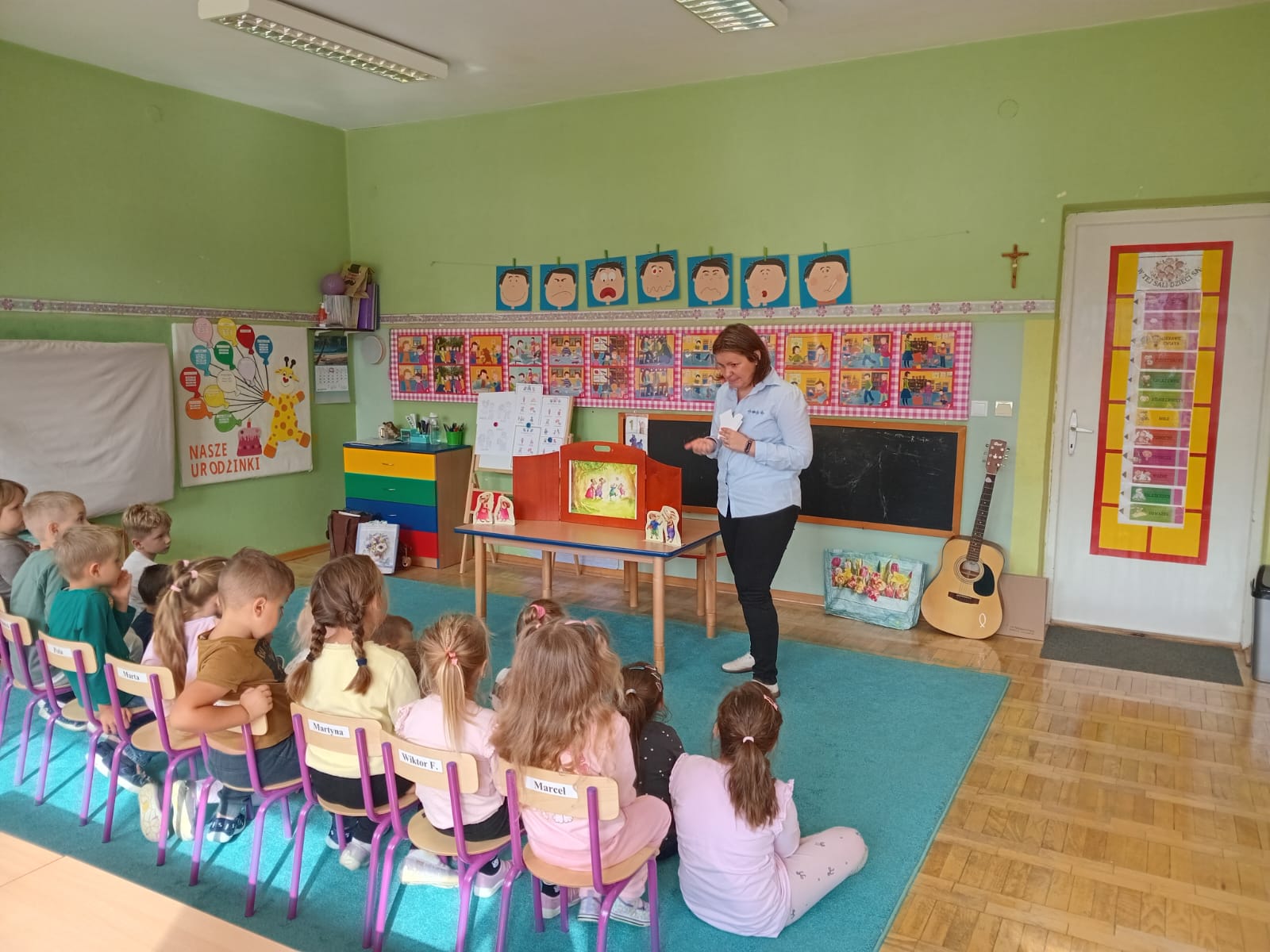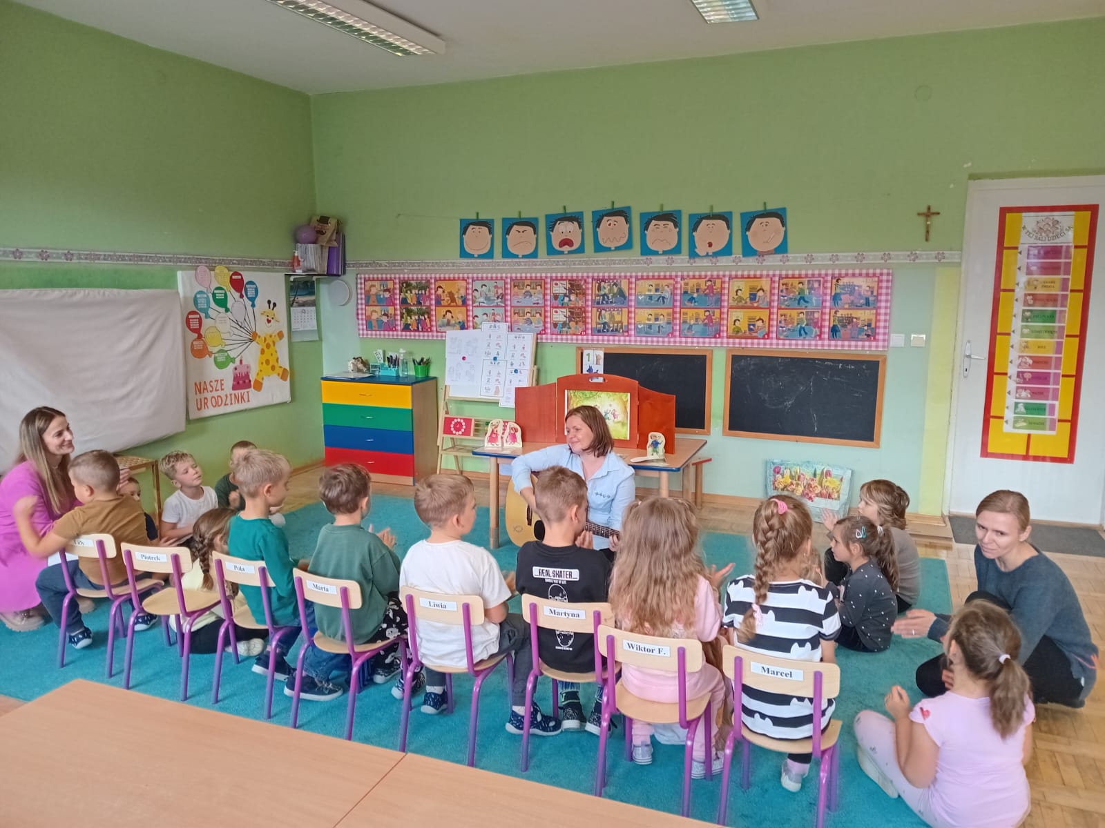 Nasze wszechstronne oddziaływania wspierają specjaliści, m.in. biblioterapeutka, Pani Anna Kępkowska. Drugiego października odwiedziła nas z bajką "Jak Nowatorscy przestali rozmawiać". Dzieci z zaciekawieniem wysłuchały opowiadania i z dużym entuzjazmem zaczęły rozmawiać o sytuacji głównych bohaterów. Zgodnie ustaliły, że żadne nawet najnowocześniejsze sprzęty domowe nie zastąpią rozmowy i współpracy. Po dyskusji przedszkolaki wzięły udział w zabawach rozwijających kompetencje społeczno-emocjonalne i komunikacyjne. Z łatwością rozwiązywały zagadki i dzieliły się swoimi doświadczeniami. Ciekawym akcentem na koniec spotkania była piosenka, której słowa "bo nikt nie ma z nas tego, co mamy razem" zaśpiewaliśmy razem przy melodii zagranej przez Panią Anię na gitarze.