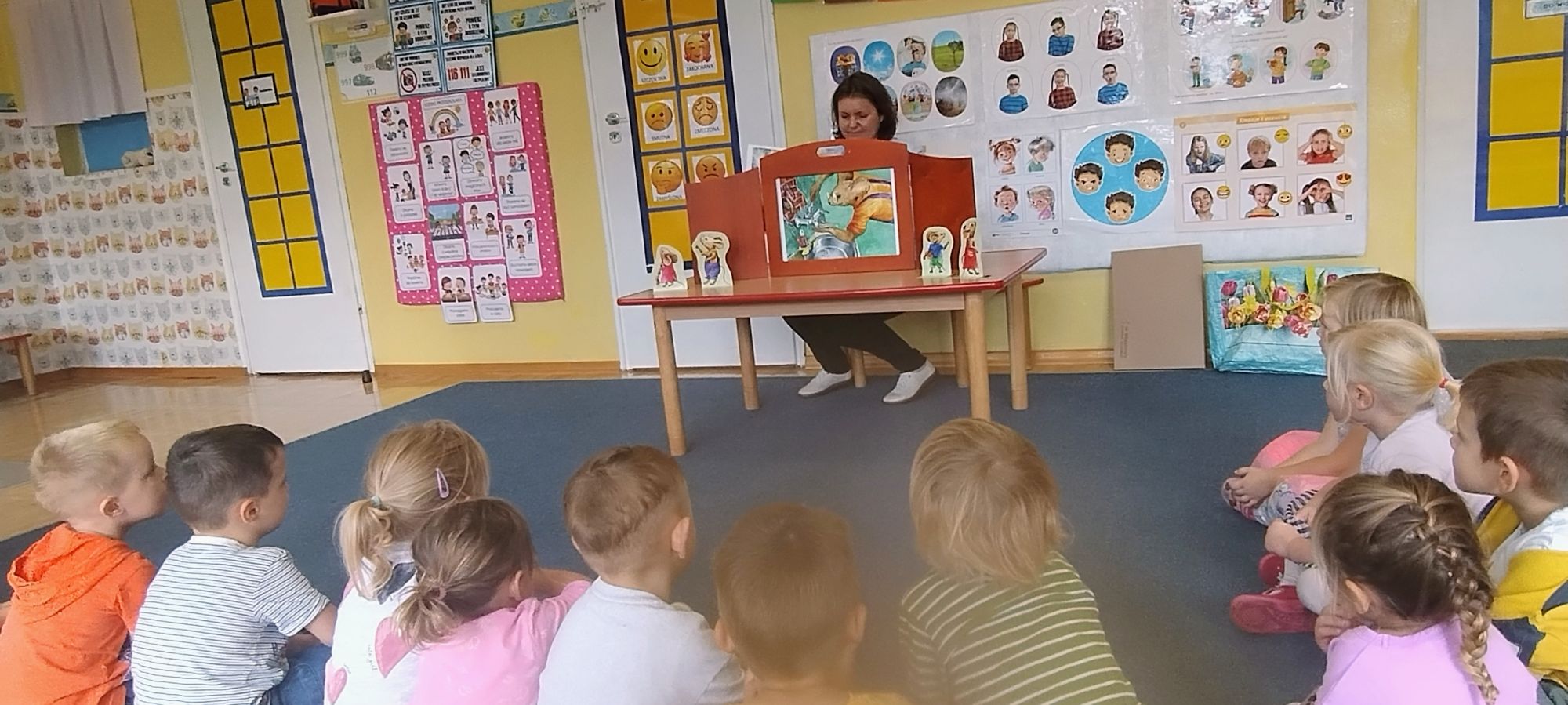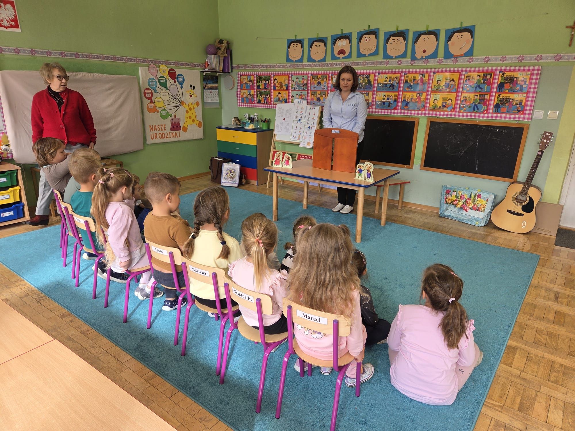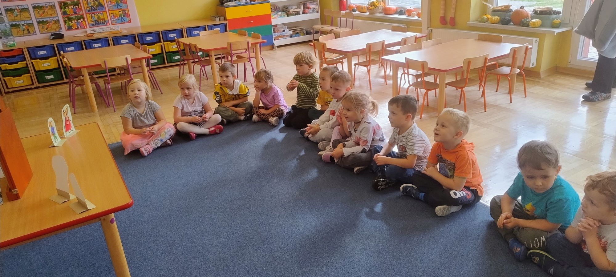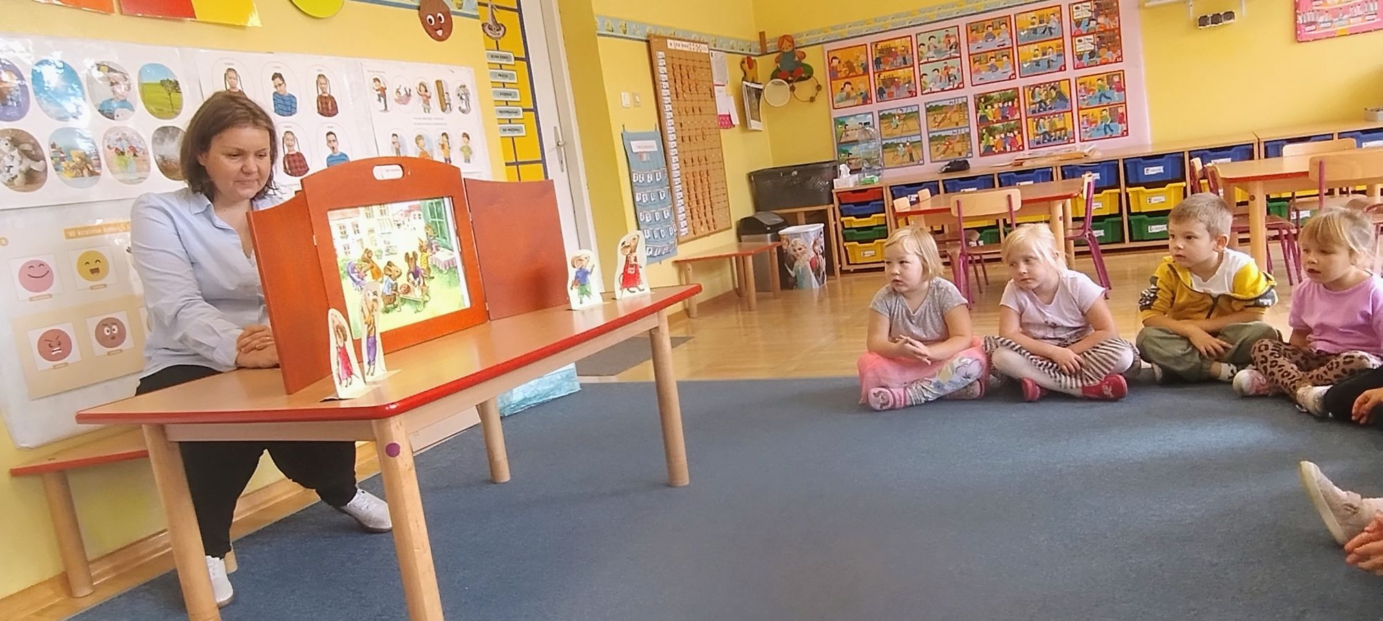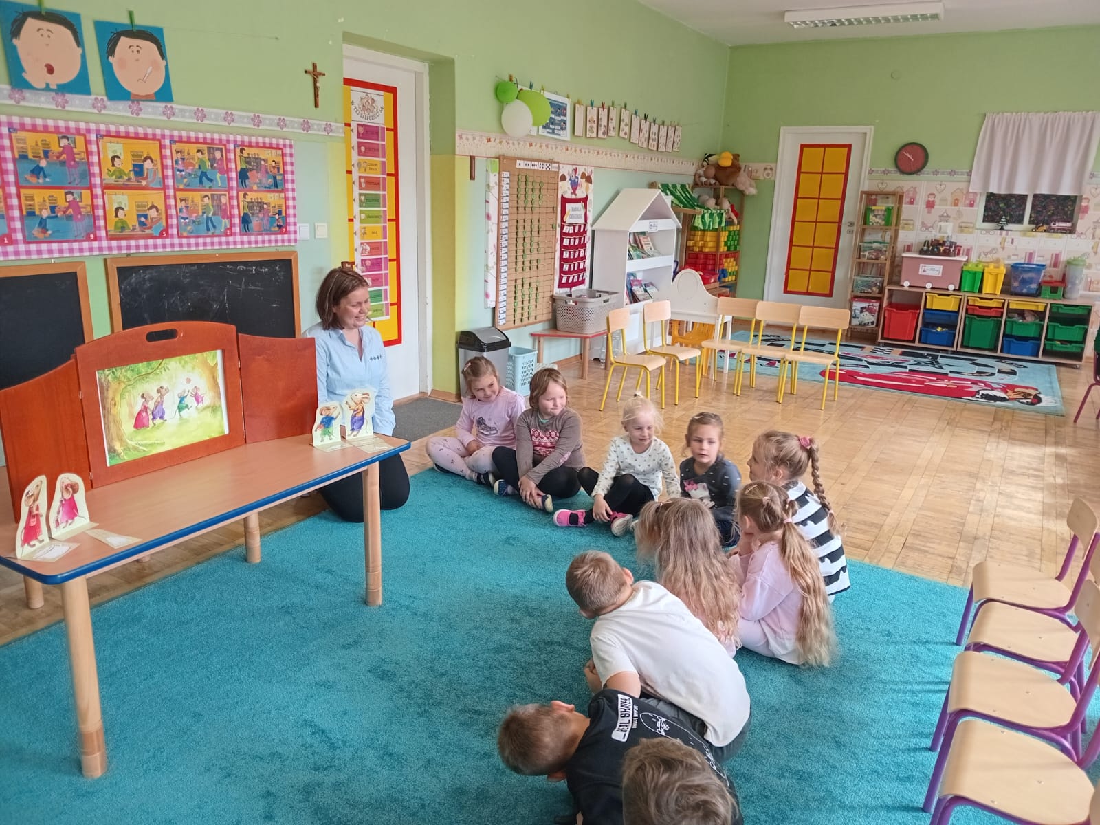 Nasze wszechstronne oddziaływania wspierają specjaliści, m.in. biblioterapeutka, Pani Anna Kępkowska. Drugiego października odwiedziła nas z bajką "Jak Nowatorscy przestali rozmawiać". Dzieci z zaciekawieniem wysłuchały opowiadania i z dużym entuzjazmem zaczęły rozmawiać o sytuacji głównych bohaterów. Zgodnie ustaliły, że żadne nawet najnowocześniejsze sprzęty domowe nie zastąpią rozmowy i współpracy. Po dyskusji przedszkolaki wzięły udział w zabawach rozwijających kompetencje społeczno-emocjonalne i komunikacyjne. Z łatwością rozwiązywały zagadki i dzieliły się swoimi doświadczeniami. Ciekawym akcentem na koniec spotkania była piosenka, której słowa "bo nikt nie ma z nas tego, co mamy razem" zaśpiewaliśmy razem przy melodii zagranej przez Panią Anię na gitarze.