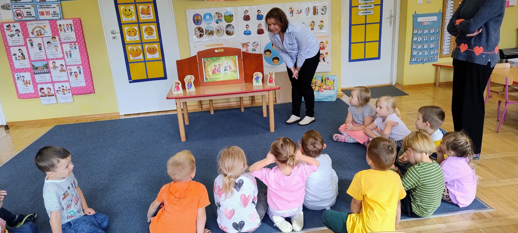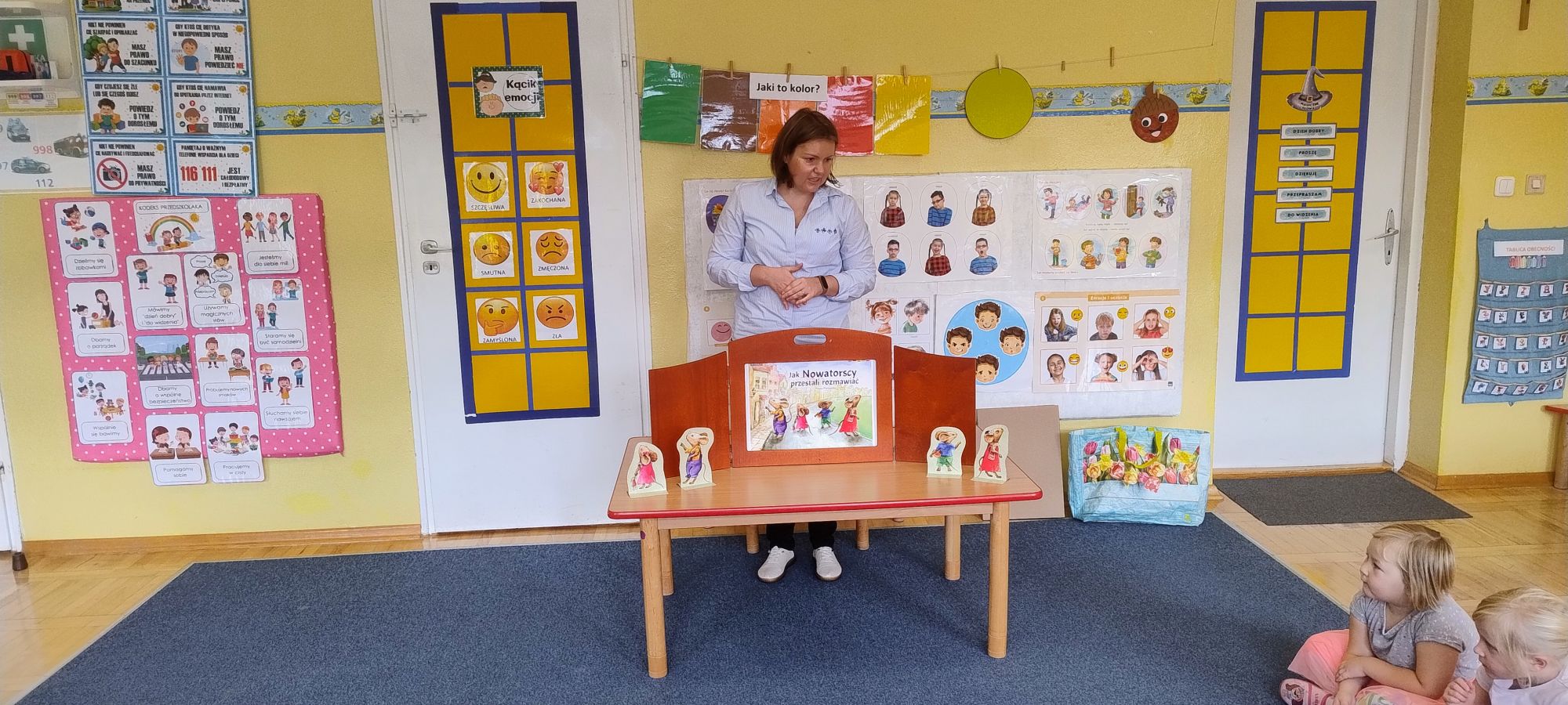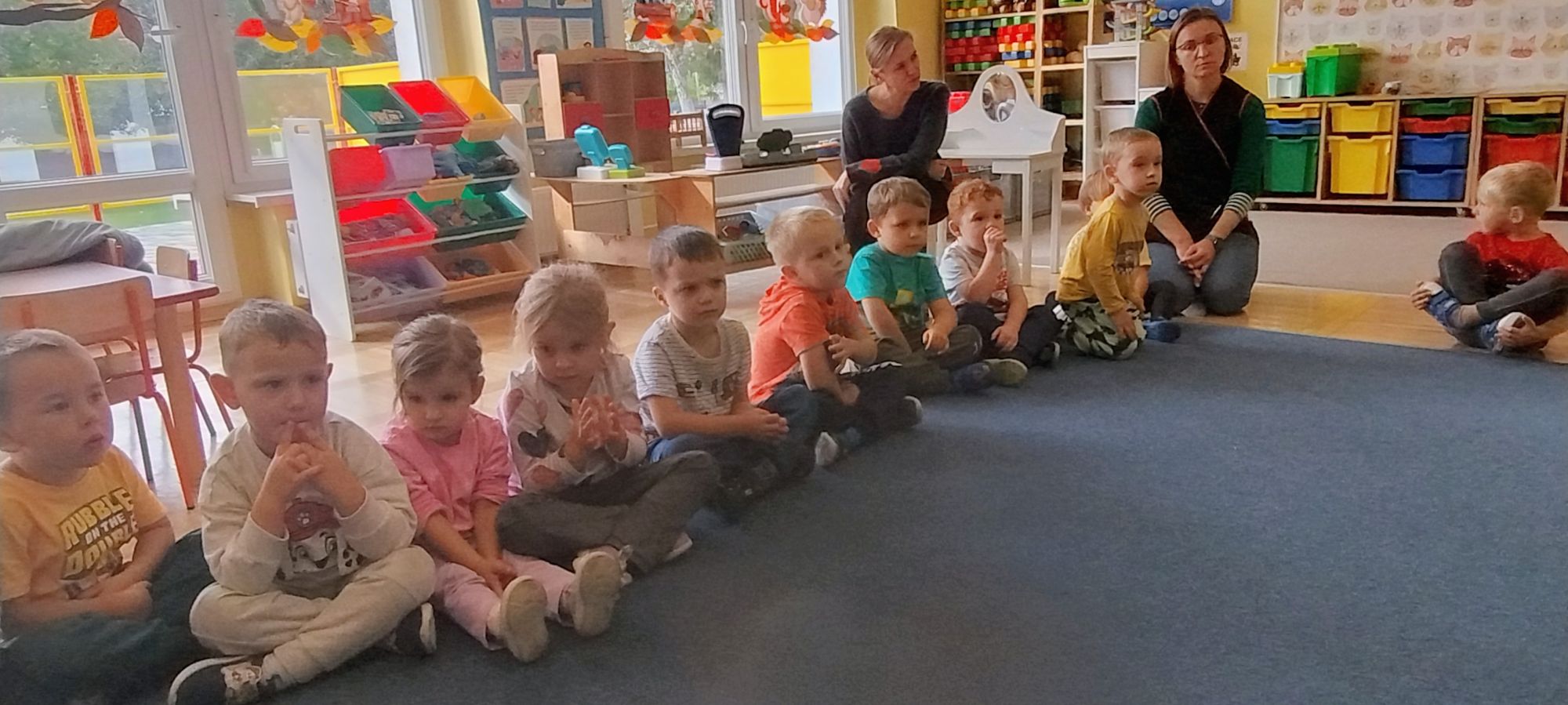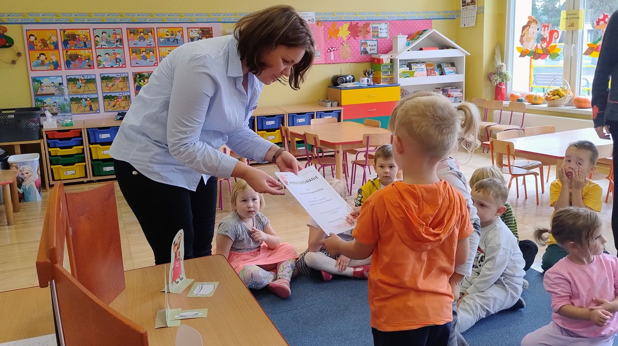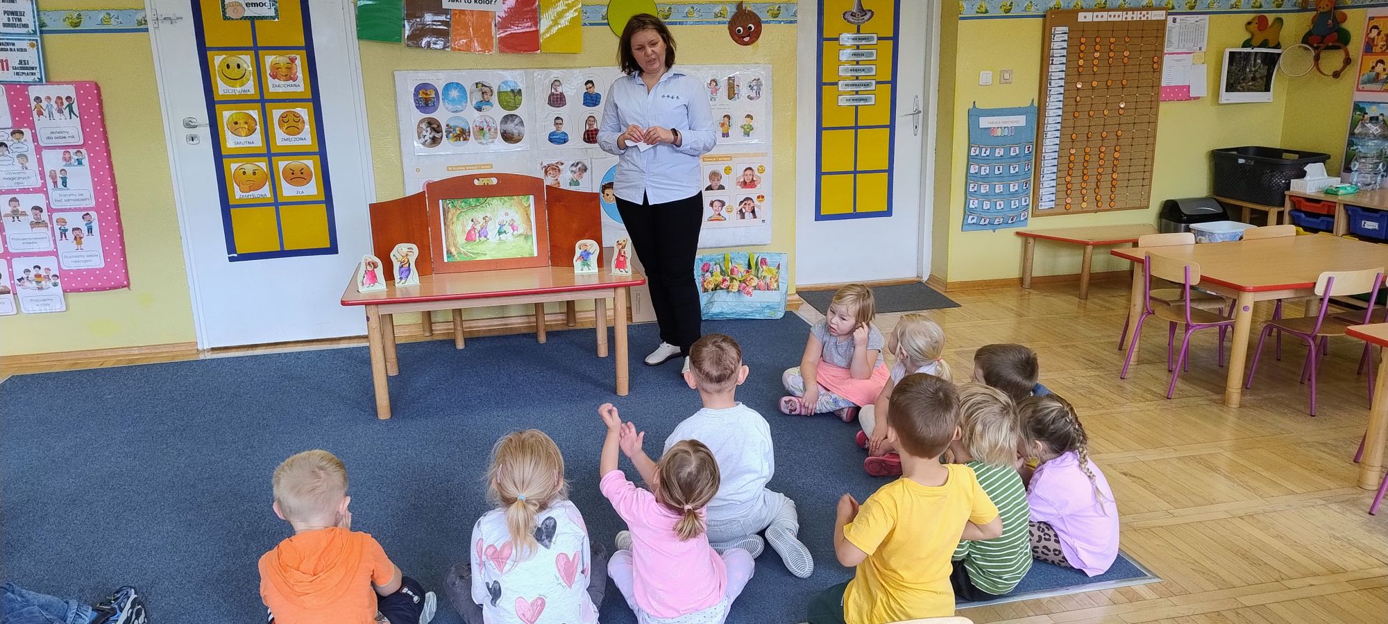 Nasze wszechstronne oddziaływania wspierają specjaliści, m.in. biblioterapeutka, Pani Anna Kępkowska. Drugiego października odwiedziła nas z bajką "Jak Nowatorscy przestali rozmawiać". Dzieci z zaciekawieniem wysłuchały opowiadania i z dużym entuzjazmem zaczęły rozmawiać o sytuacji głównych bohaterów. Zgodnie ustaliły, że żadne nawet najnowocześniejsze sprzęty domowe nie zastąpią rozmowy i współpracy. Po dyskusji przedszkolaki wzięły udział w zabawach rozwijających kompetencje społeczno-emocjonalne i komunikacyjne. Z łatwością rozwiązywały zagadki i dzieliły się swoimi doświadczeniami. Ciekawym akcentem na koniec spotkania była piosenka, której słowa "bo nikt nie ma z nas tego, co mamy razem" zaśpiewaliśmy razem przy melodii zagranej przez Panią Anię na gitarze.