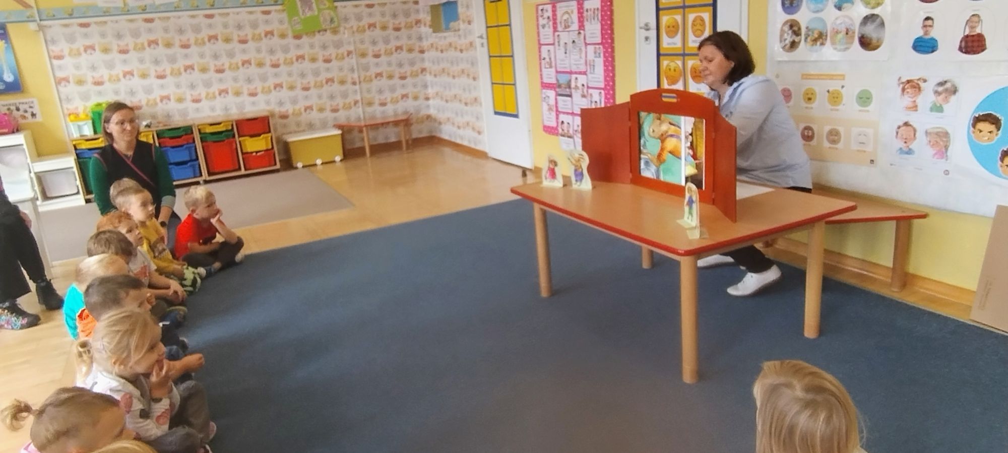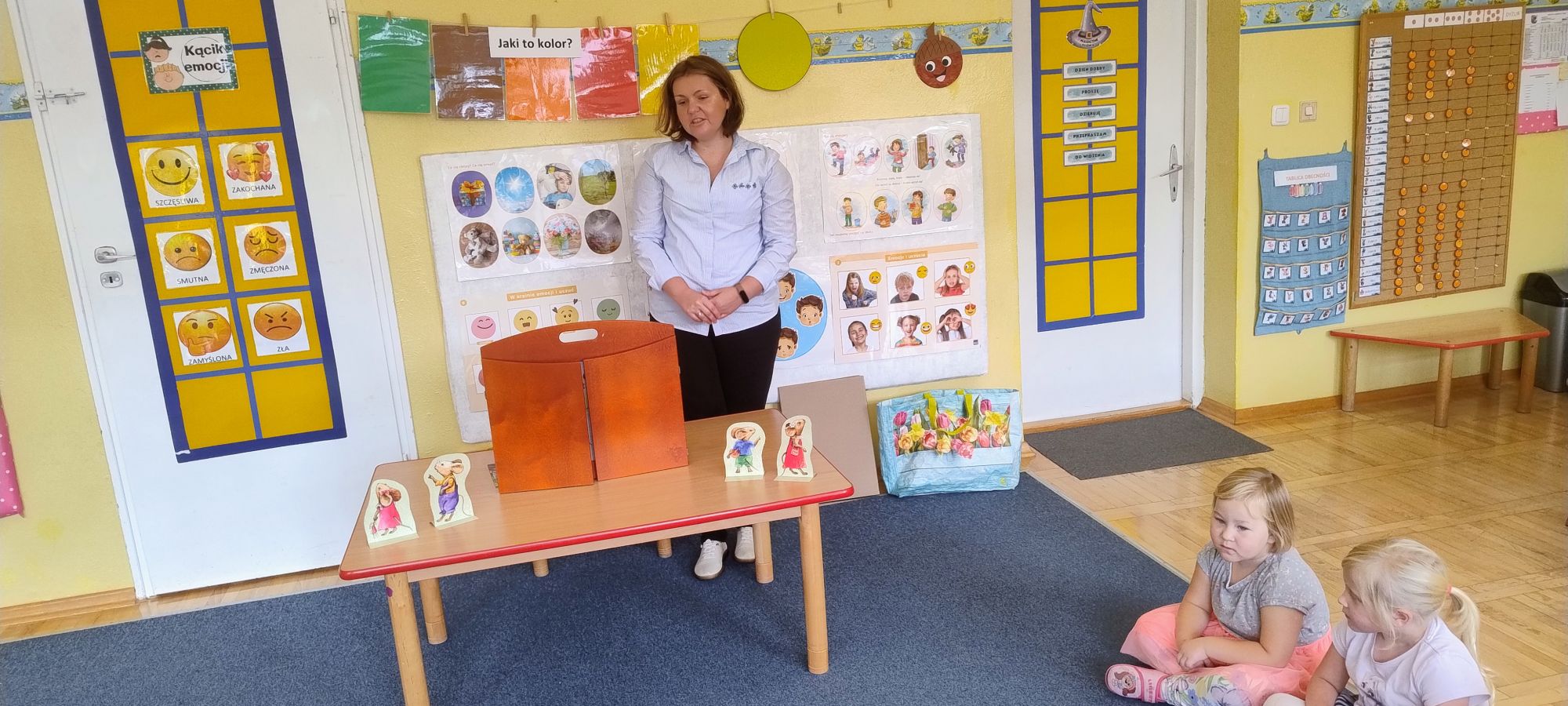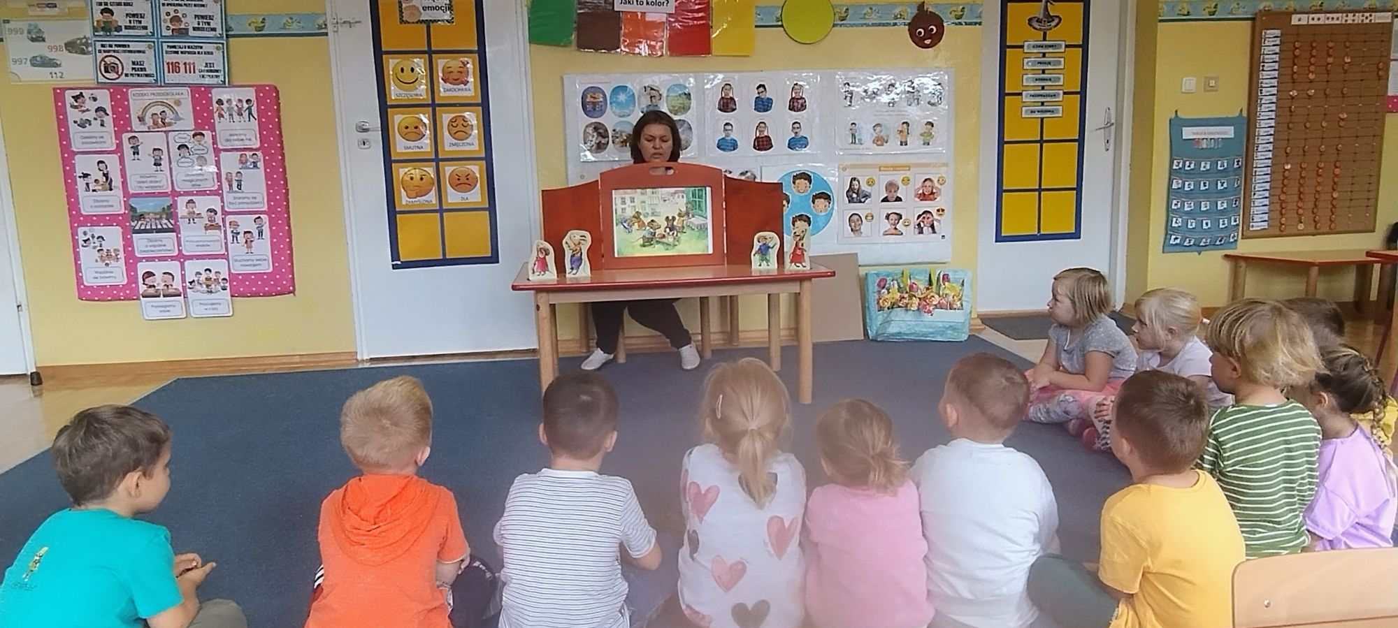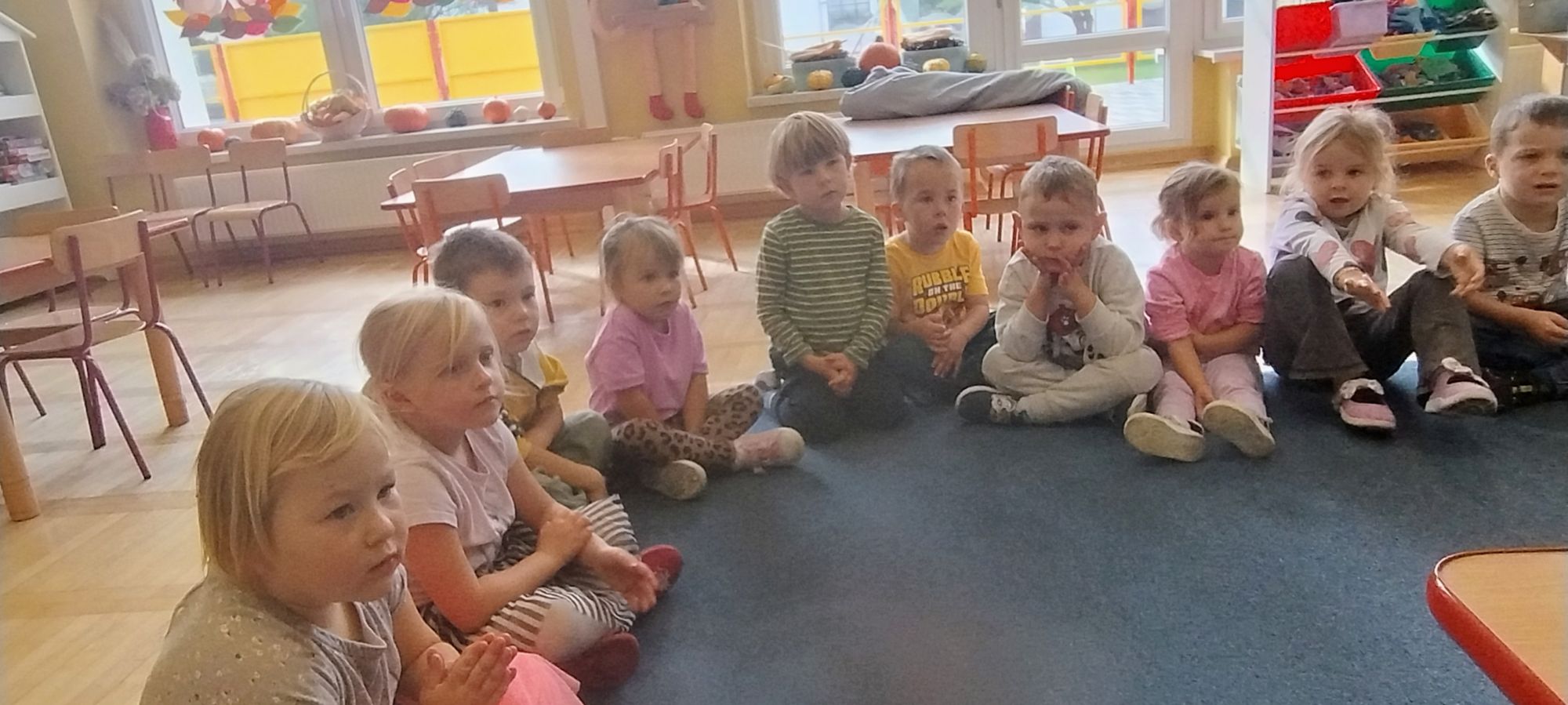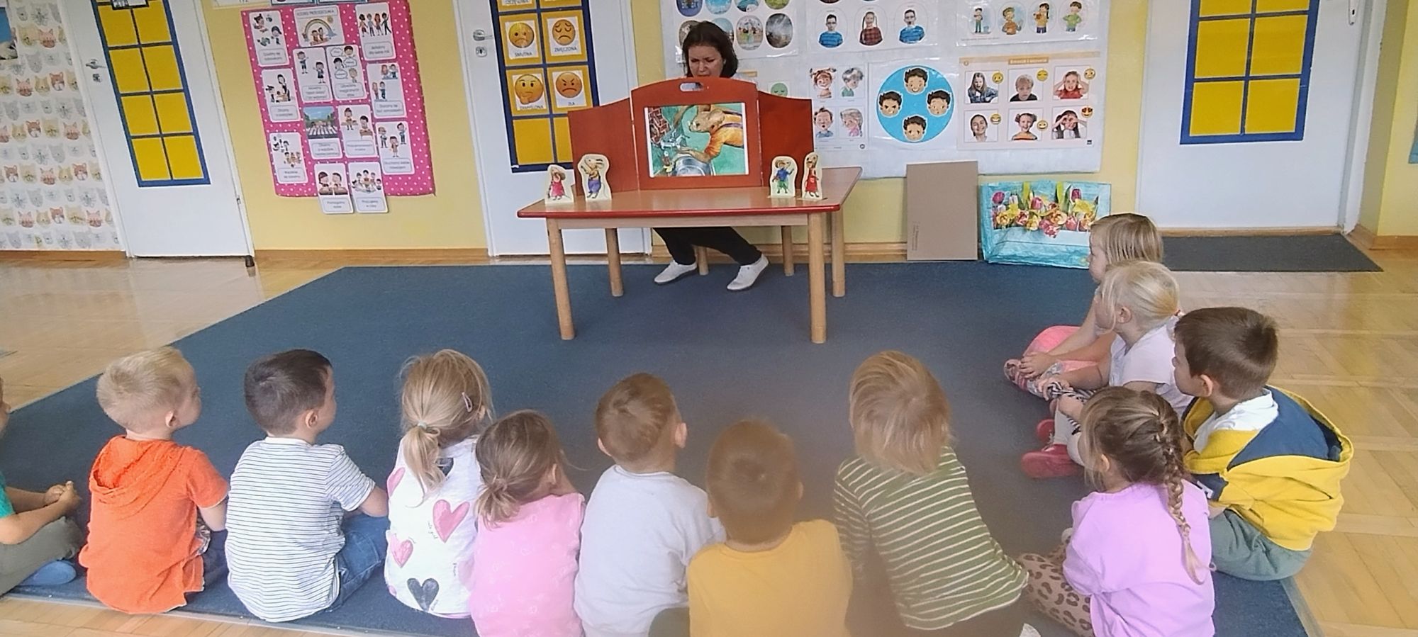 Nasze wszechstronne oddziaływania wspierają specjaliści, m.in. biblioterapeutka, Pani Anna Kępkowska. Drugiego października odwiedziła nas z bajką "Jak Nowatorscy przestali rozmawiać". Dzieci z zaciekawieniem wysłuchały opowiadania i z dużym entuzjazmem zaczęły rozmawiać o sytuacji głównych bohaterów. Zgodnie ustaliły, że żadne nawet najnowocześniejsze sprzęty domowe nie zastąpią rozmowy i współpracy. Po dyskusji przedszkolaki wzięły udział w zabawach rozwijających kompetencje społeczno-emocjonalne i komunikacyjne. Z łatwością rozwiązywały zagadki i dzieliły się swoimi doświadczeniami. Ciekawym akcentem na koniec spotkania była piosenka, której słowa "bo nikt nie ma z nas tego, co mamy razem" zaśpiewaliśmy razem przy melodii zagranej przez Panią Anię na gitarze.