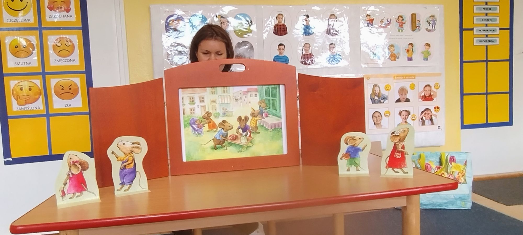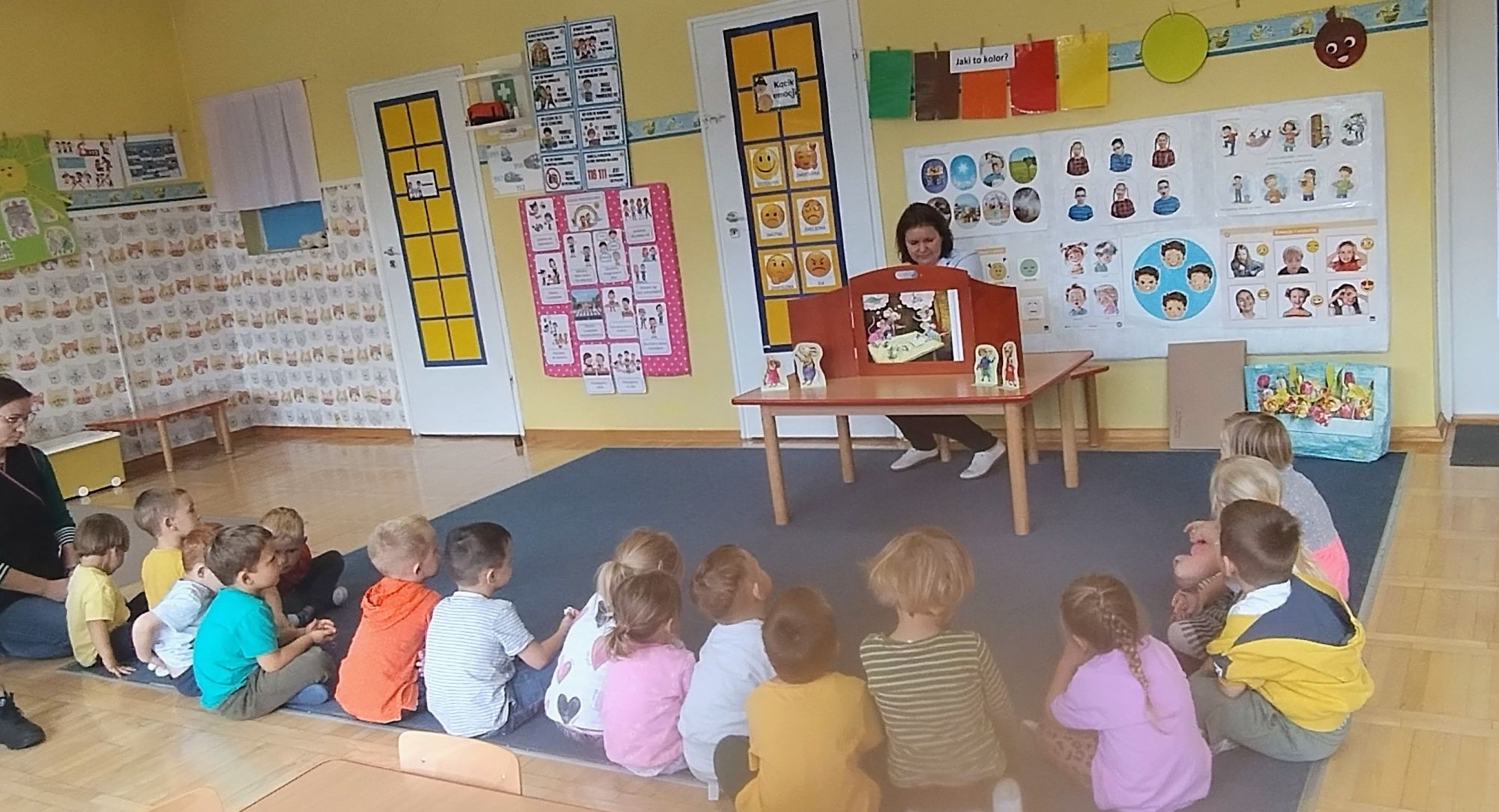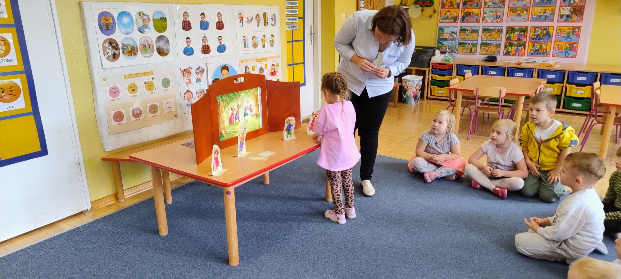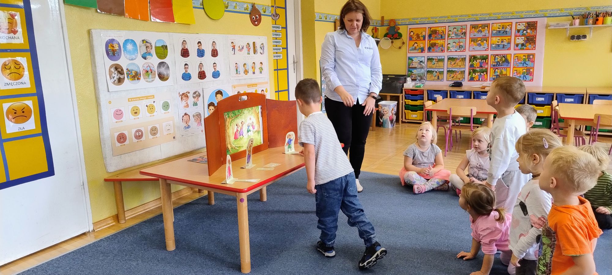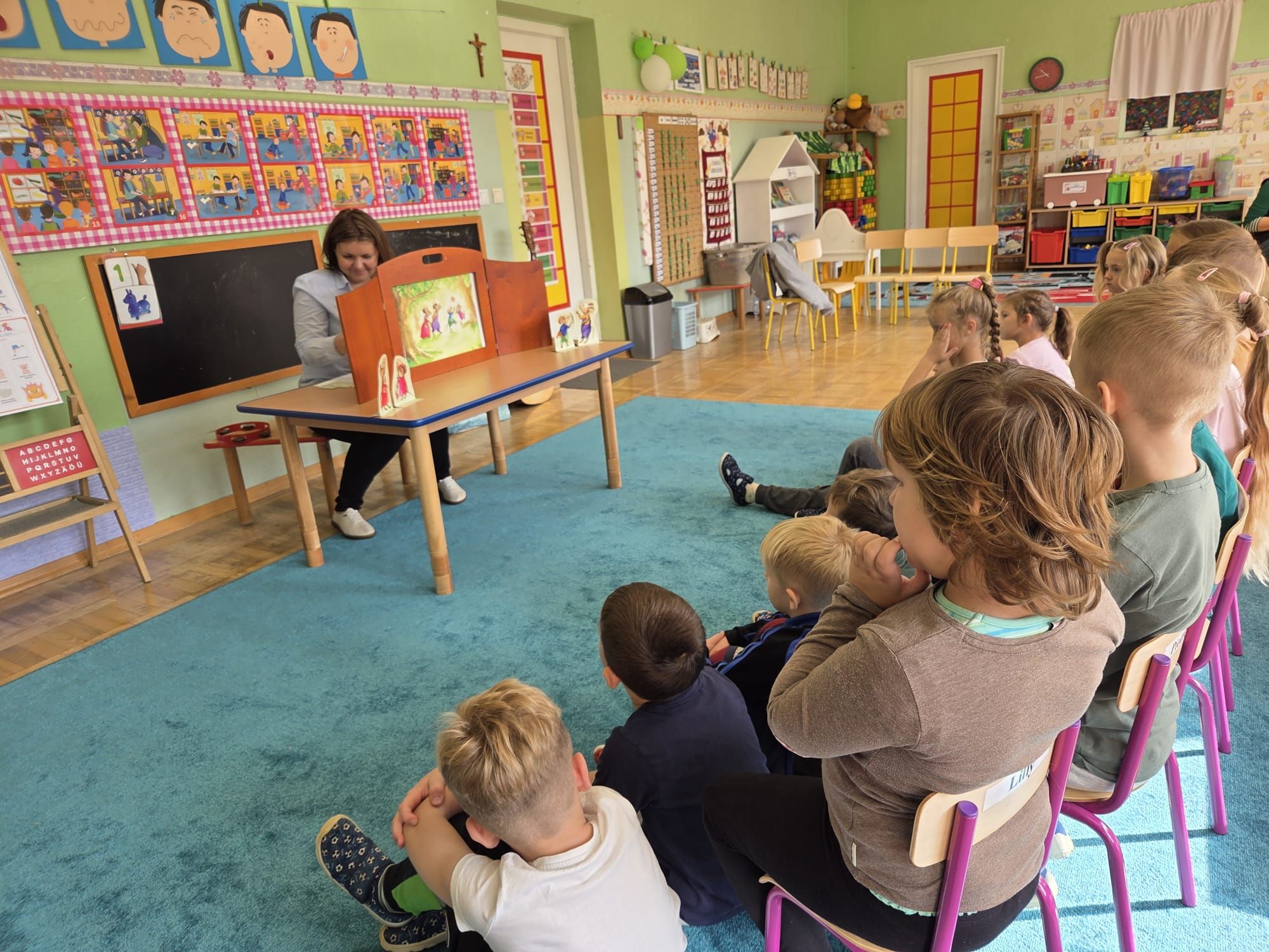 Nasze wszechstronne oddziaływania wspierają specjaliści, m.in. biblioterapeutka, Pani Anna Kępkowska. Drugiego października odwiedziła nas z bajką "Jak Nowatorscy przestali rozmawiać". Dzieci z zaciekawieniem wysłuchały opowiadania i z dużym entuzjazmem zaczęły rozmawiać o sytuacji głównych bohaterów. Zgodnie ustaliły, że żadne nawet najnowocześniejsze sprzęty domowe nie zastąpią rozmowy i współpracy. Po dyskusji przedszkolaki wzięły udział w zabawach rozwijających kompetencje społeczno-emocjonalne i komunikacyjne. Z łatwością rozwiązywały zagadki i dzieliły się swoimi doświadczeniami. Ciekawym akcentem na koniec spotkania była piosenka, której słowa "bo nikt nie ma z nas tego, co mamy razem" zaśpiewaliśmy razem przy melodii zagranej przez Panią Anię na gitarze.